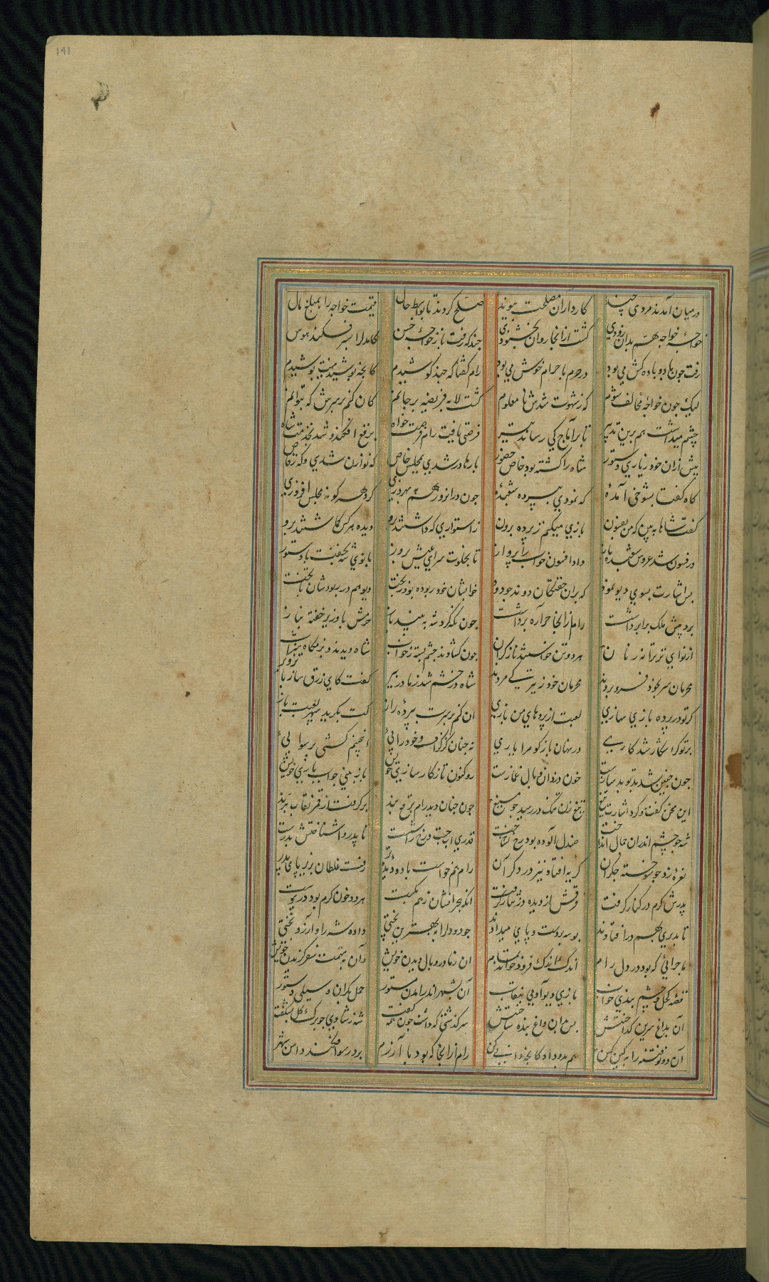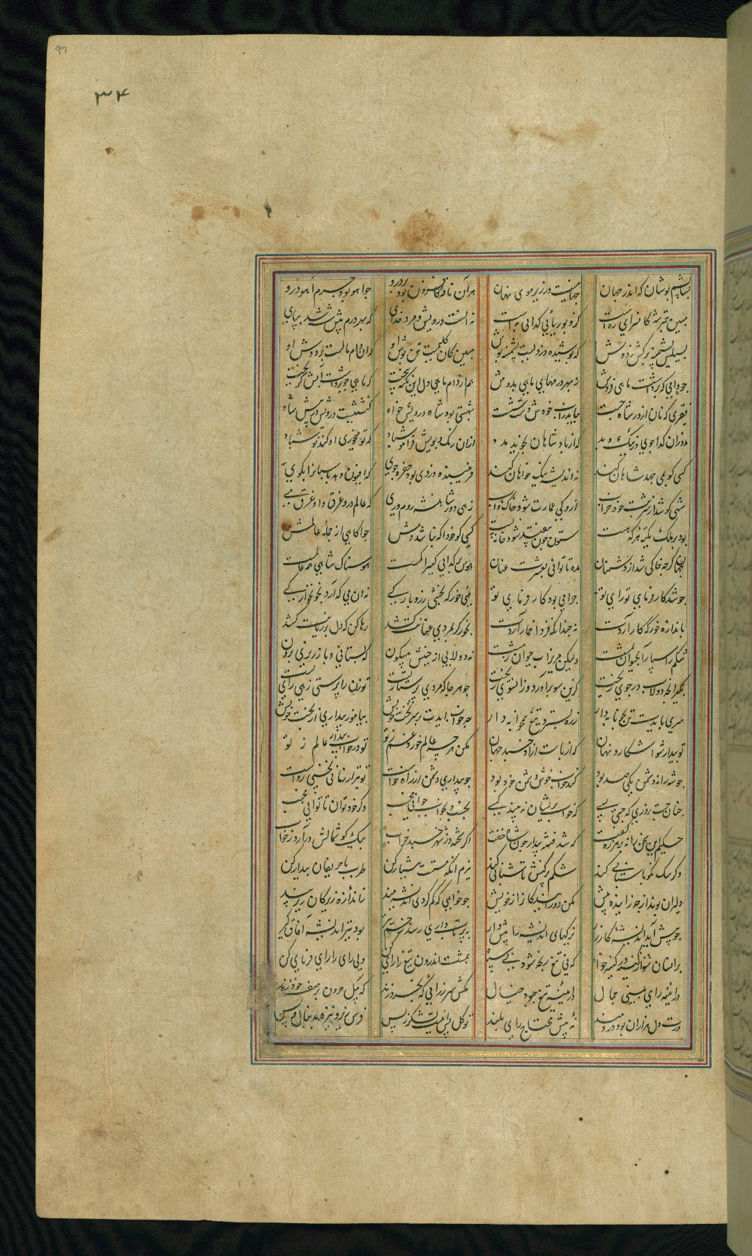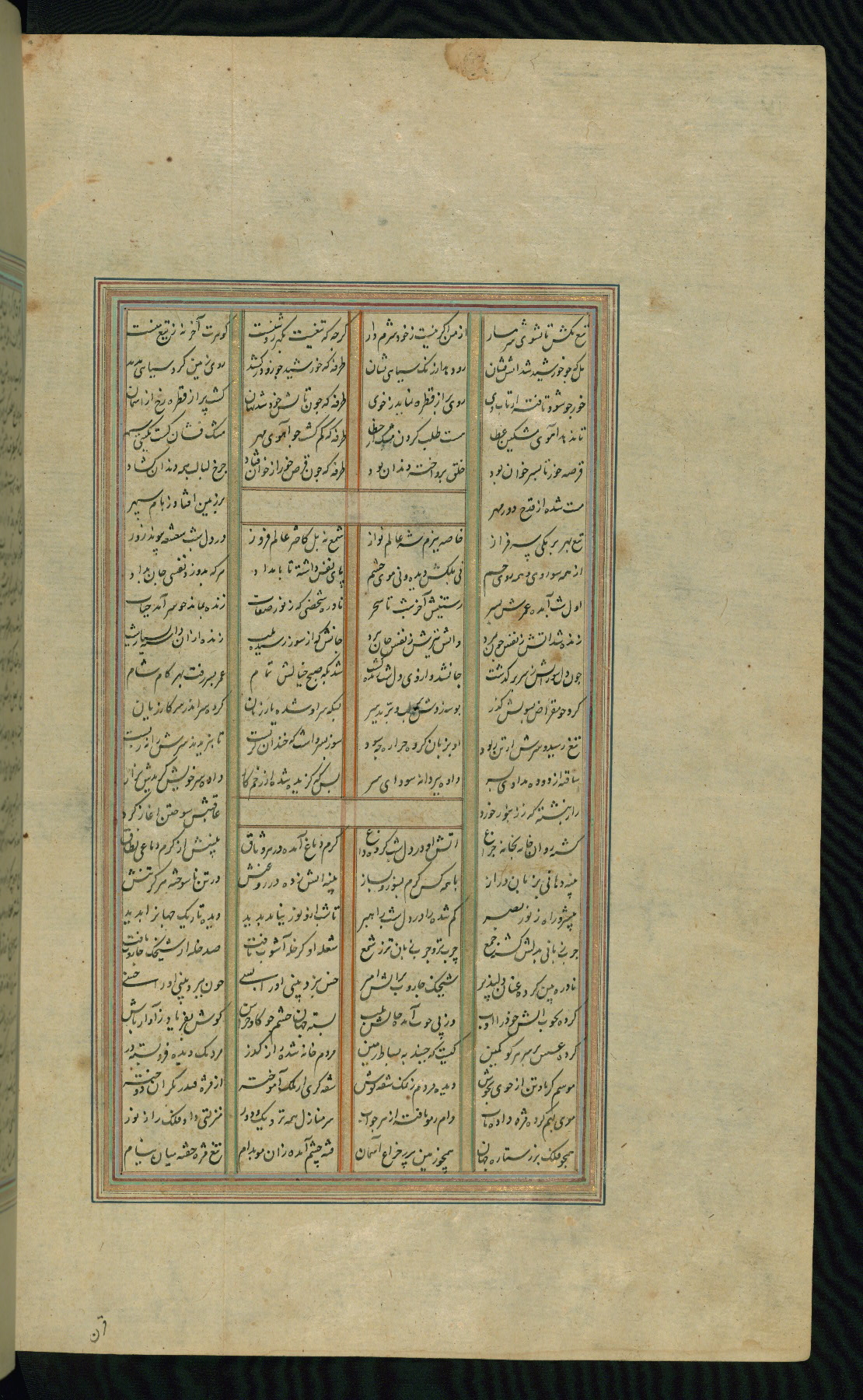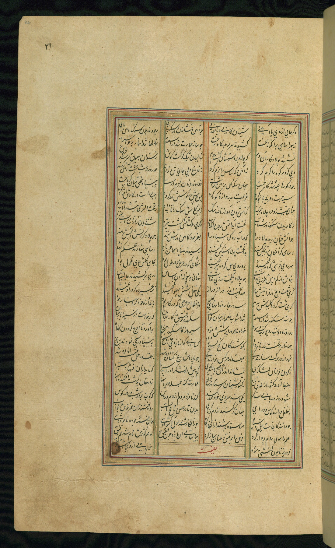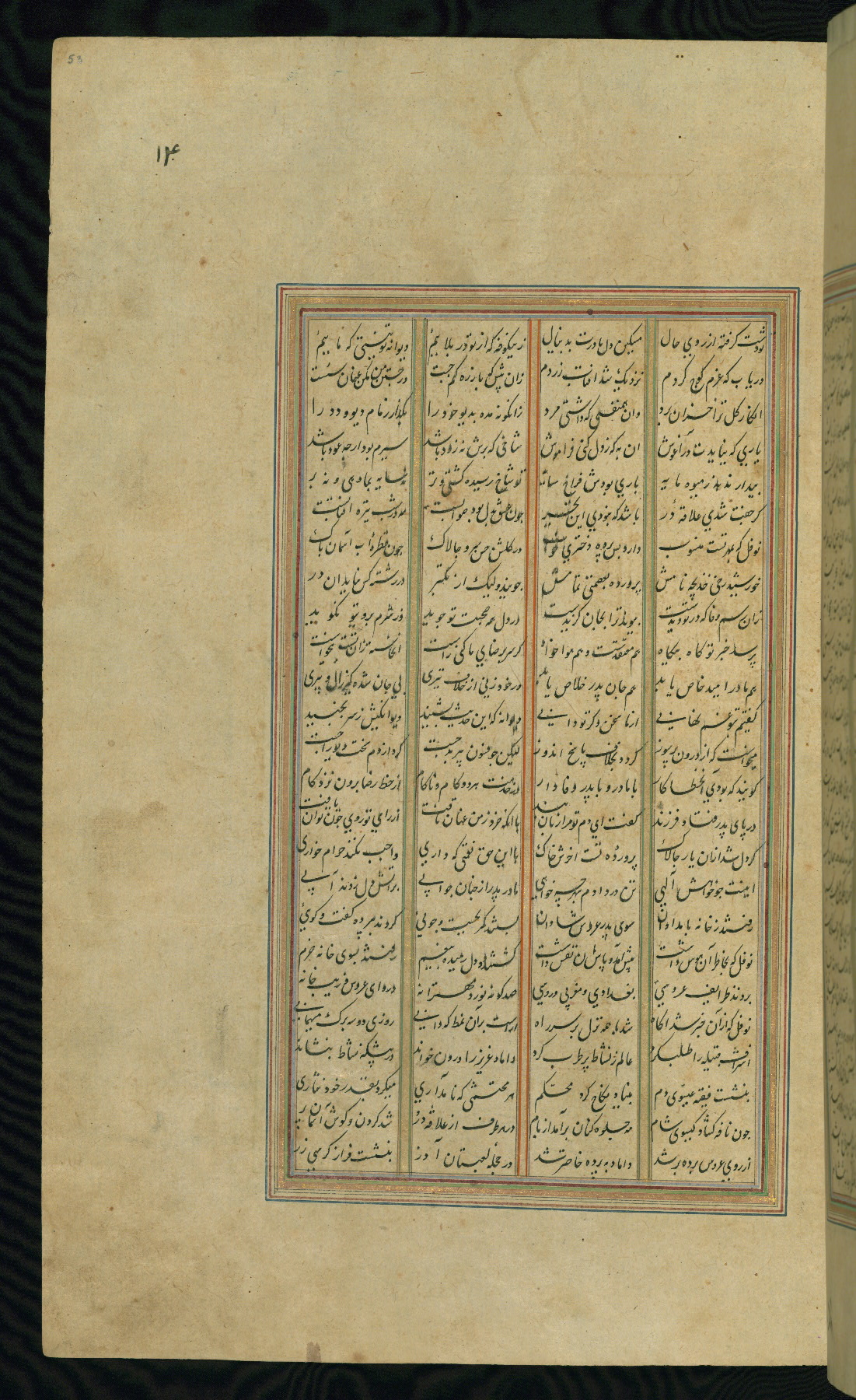 This illuminated and illustrated manuscript contains the Khamsah (quintet) and two historical poems (masnavi), Qirān-i saʿdayn and Nuh sipihr, by Amīr Khusraw Dihlavī (d. 725 AH / 1325 CE). The codex is dated 1017 AH / 1609 CE and was produced in Safavid Iran. All texts are written in black nastaʿlīq script with chapter headings in red. The manuscript opens with an illuminated and illustrated frontispiece of a hunting and court scene in the early Safavid style (fols. 1b-2a). The first text is Khamsah-i Dihlavī (fols. 2b-192a), which is introduced by an illuminated incipit and titlepiece with the title of the first poem of the quintet and the author's name. The second text is Qirān-i saʿdayn, a historical poem (masnavi) about the meeting of Sultan Muʿizz al-Dīn Kayqubād and his father, Nāṣir al-Din Bughrā Khān, on the banks of the Sarjū in Oudh. It is also introduced with an illuminated incipit and titlepiece (fol. 193b). The third text is Nuh sipihr, a historical poem (masnavi) describing the glories of Sultan Quṭb al-Dīn Mubārak Shāh Khaljī’s time, introduced with an illuminated incipit and headpiece (fol. 223b). The dark brown leather binding is original to the manuscript.