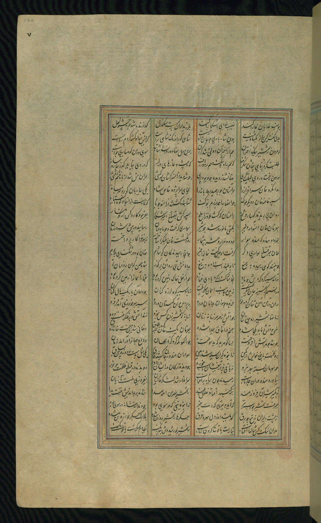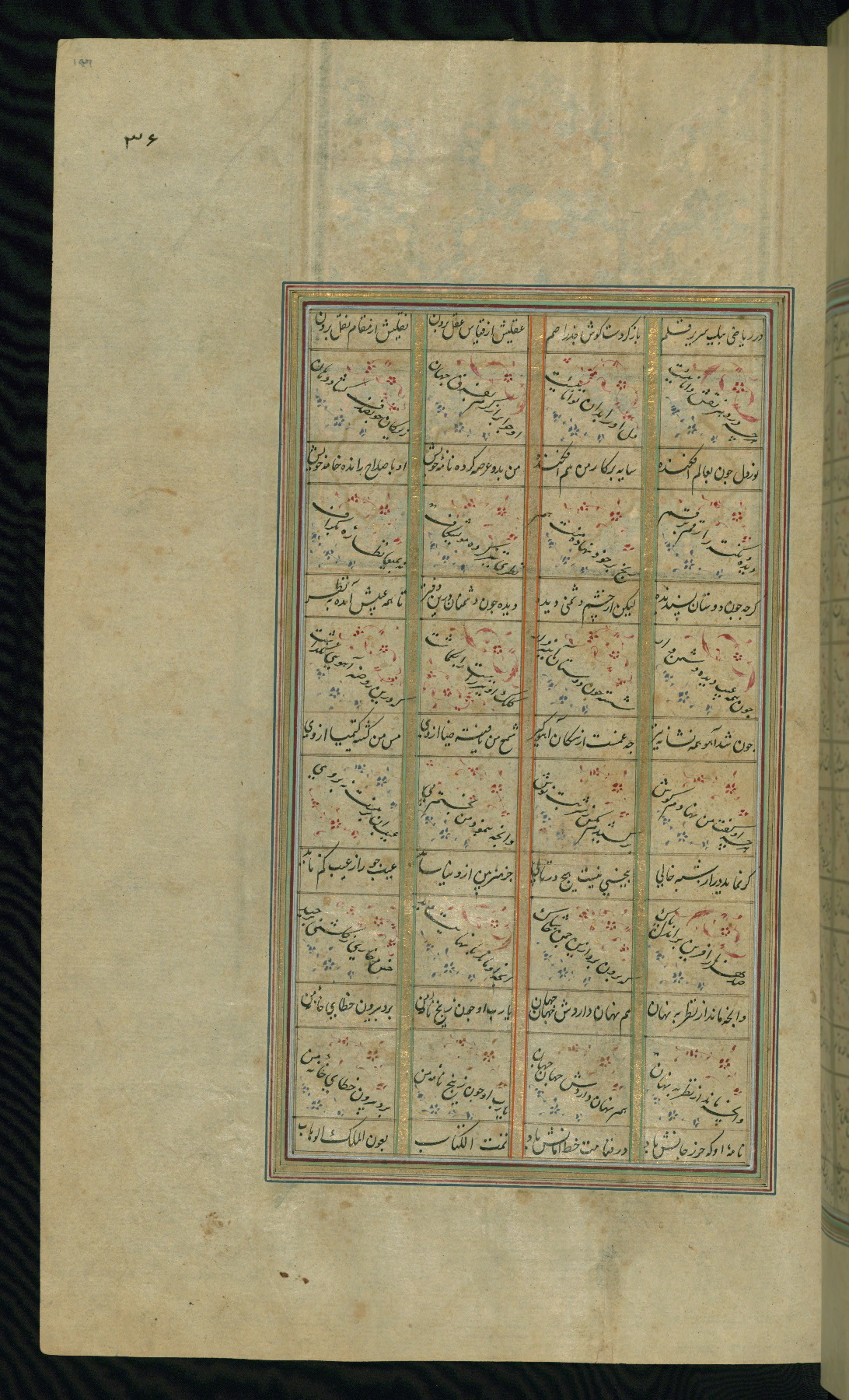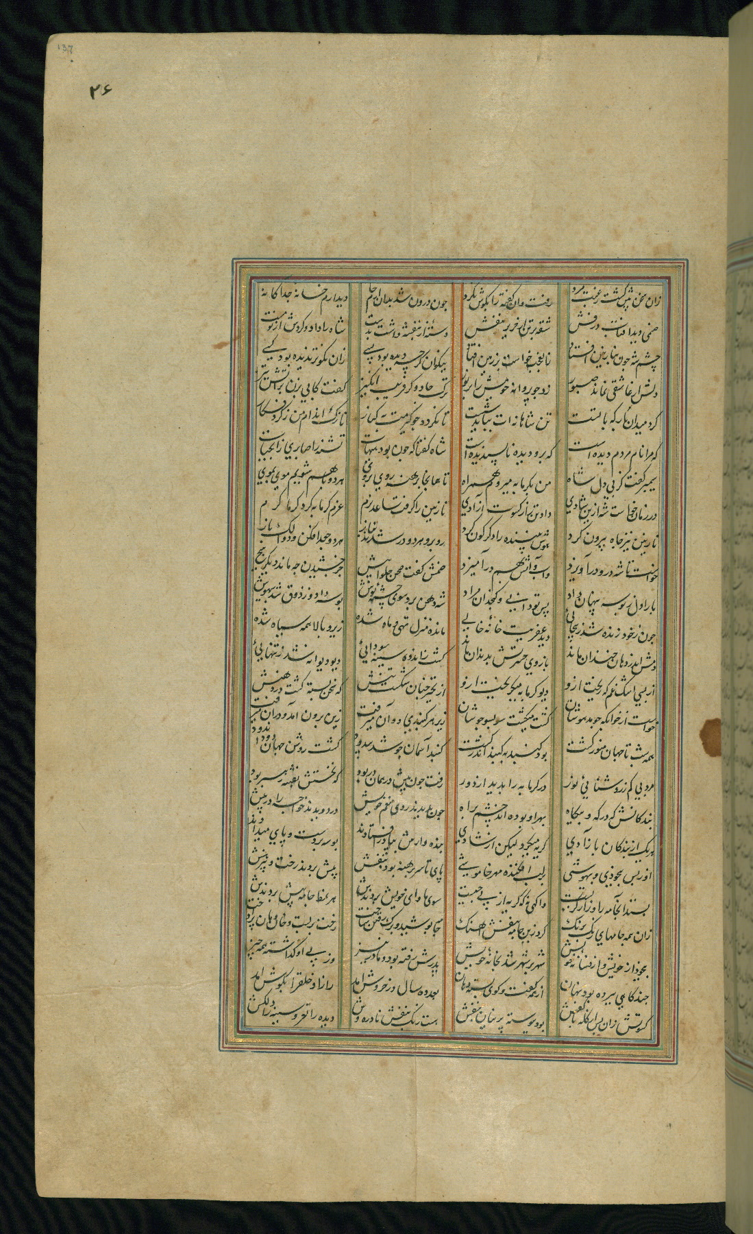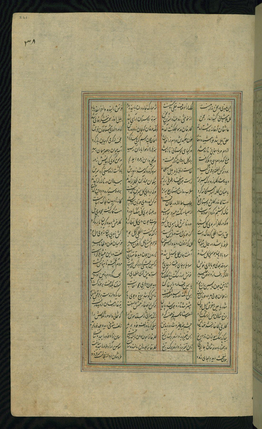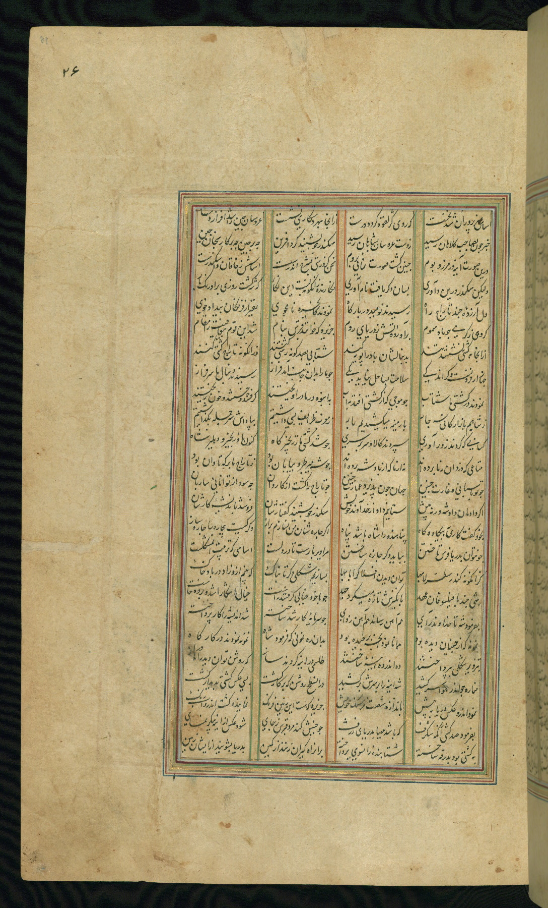 This illuminated and illustrated manuscript contains the Khamsah (quintet) and two historical poems (masnavi), Qirān-i saʿdayn and Nuh sipihr, by Amīr Khusraw Dihlavī (d. 725 AH / 1325 CE). The codex is dated 1017 AH / 1609 CE and was produced in Safavid Iran. All texts are written in black nastaʿlīq script with chapter headings in red. The manuscript opens with an illuminated and illustrated frontispiece of a hunting and court scene in the early Safavid style (fols. 1b-2a). The first text is Khamsah-i Dihlavī (fols. 2b-192a), which is introduced by an illuminated incipit and titlepiece with the title of the first poem of the quintet and the author's name. The second text is Qirān-i saʿdayn, a historical poem (masnavi) about the meeting of Sultan Muʿizz al-Dīn Kayqubād and his father, Nāṣir al-Din Bughrā Khān, on the banks of the Sarjū in Oudh. It is also introduced with an illuminated incipit and titlepiece (fol. 193b). The third text is Nuh sipihr, a historical poem (masnavi) describing the glories of Sultan Quṭb al-Dīn Mubārak Shāh Khaljī’s time, introduced with an illuminated incipit and headpiece (fol. 223b). The dark brown leather binding is original to the manuscript.
