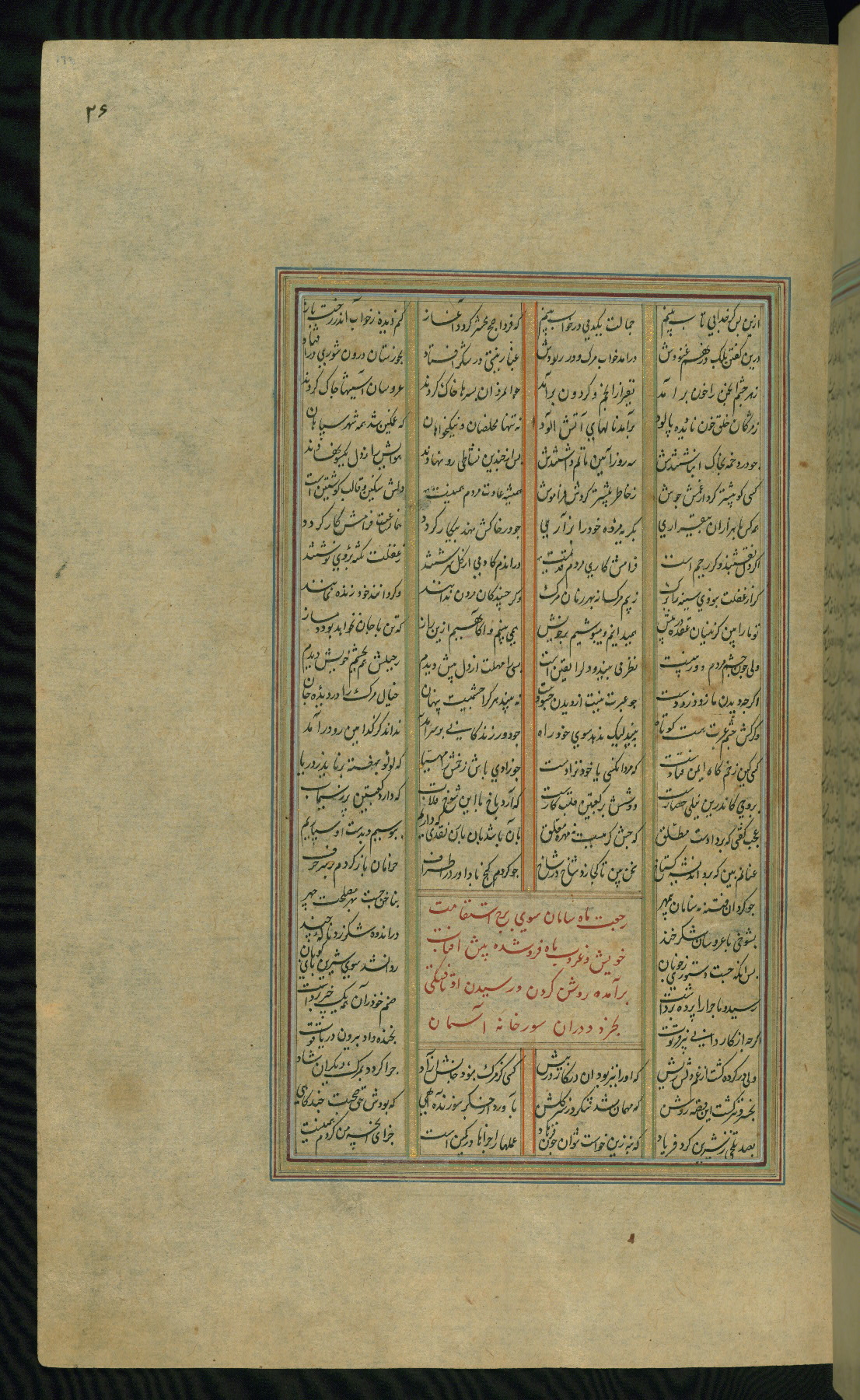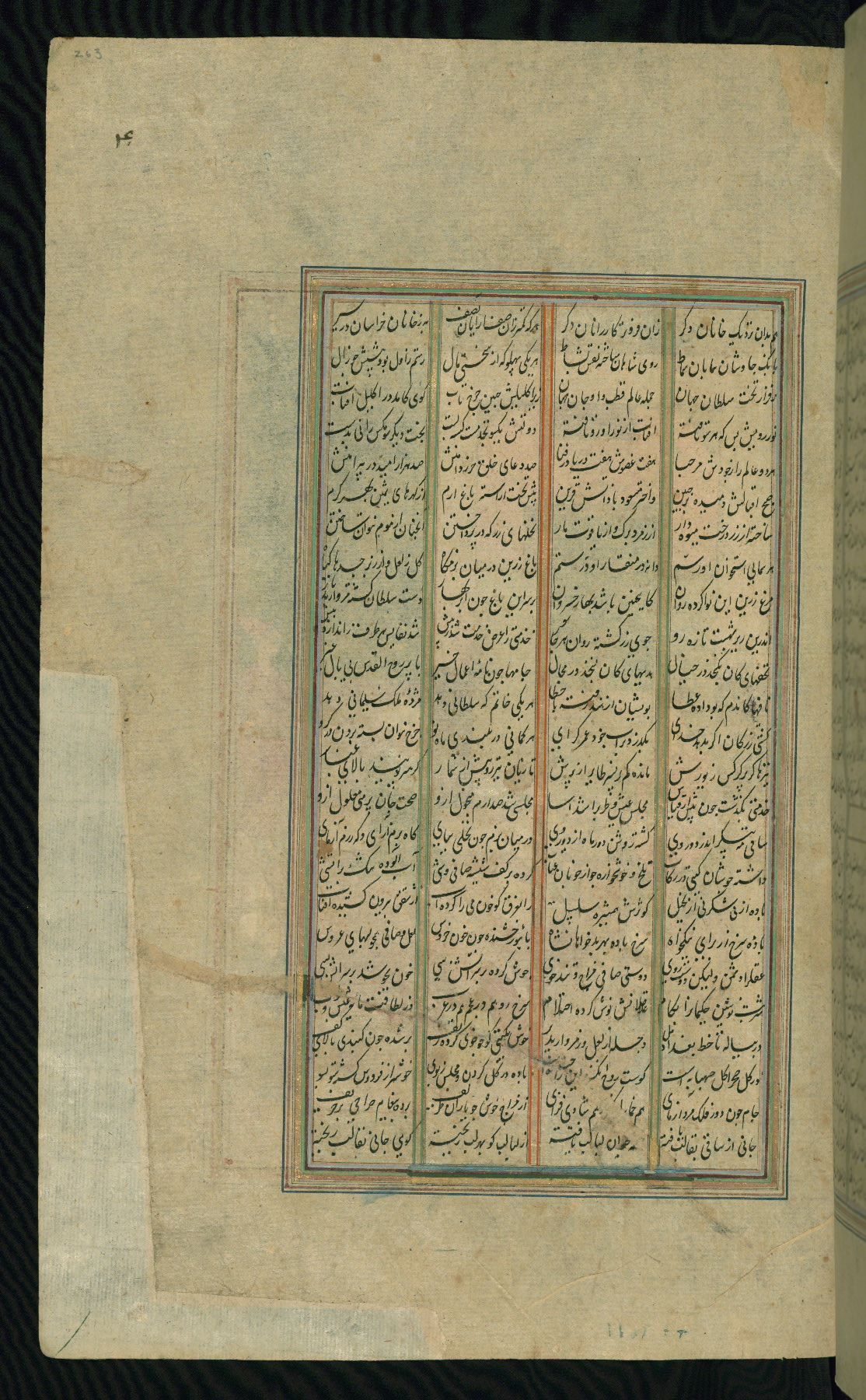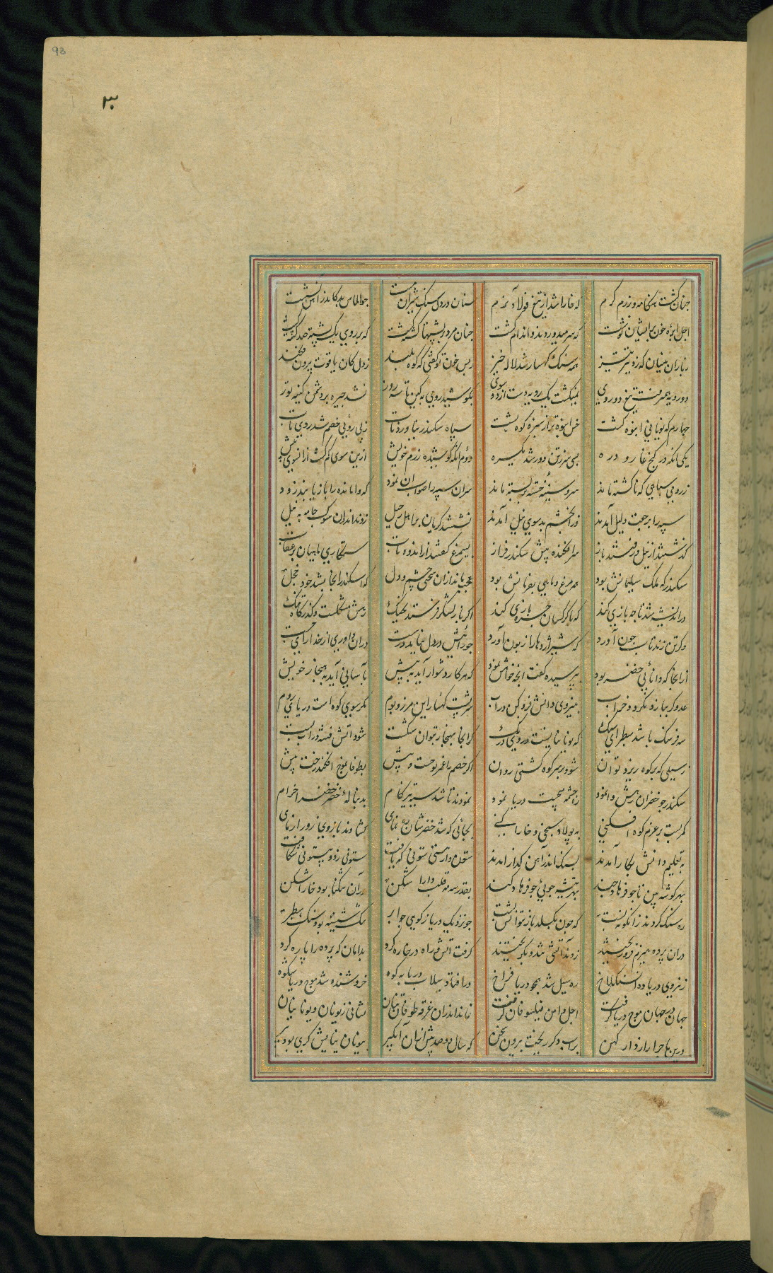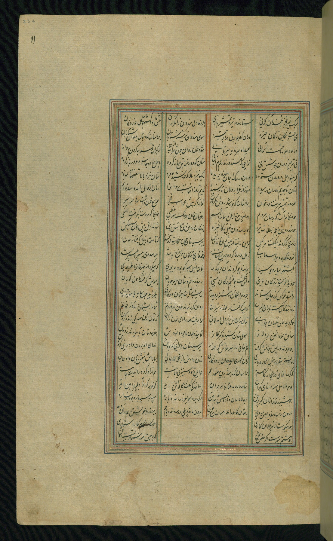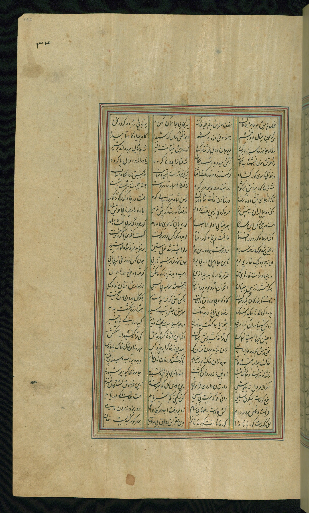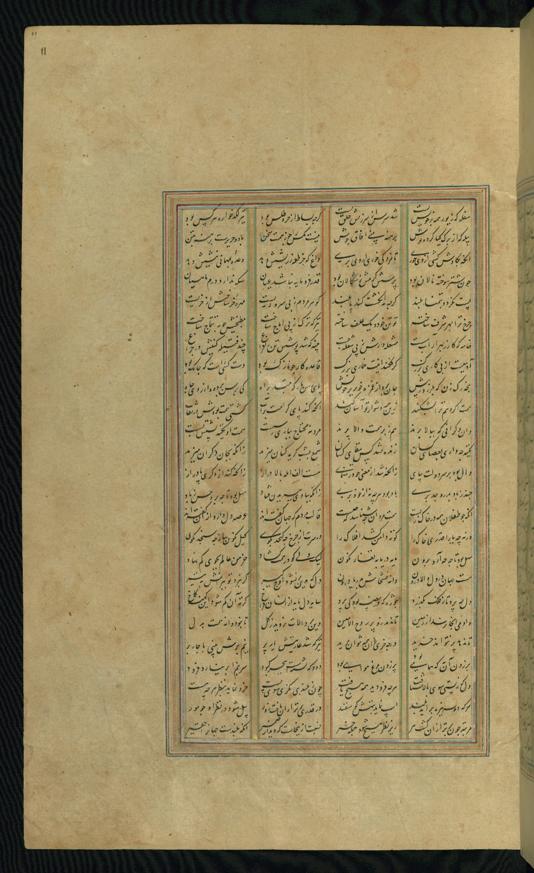 This illuminated and illustrated manuscript contains the Khamsah (quintet) and two historical poems (masnavi), Qirān-i saʿdayn and Nuh sipihr, by Amīr Khusraw Dihlavī (d. 725 AH / 1325 CE). The codex is dated 1017 AH / 1609 CE and was produced in Safavid Iran. All texts are written in black nastaʿlīq script with chapter headings in red. The manuscript opens with an illuminated and illustrated frontispiece of a hunting and court scene in the early Safavid style (fols. 1b-2a). The first text is Khamsah-i Dihlavī (fols. 2b-192a), which is introduced by an illuminated incipit and titlepiece with the title of the first poem of the quintet and the author's name. The second text is Qirān-i saʿdayn, a historical poem (masnavi) about the meeting of Sultan Muʿizz al-Dīn Kayqubād and his father, Nāṣir al-Din Bughrā Khān, on the banks of the Sarjū in Oudh. It is also introduced with an illuminated incipit and titlepiece (fol. 193b). The third text is Nuh sipihr, a historical poem (masnavi) describing the glories of Sultan Quṭb al-Dīn Mubārak Shāh Khaljī’s time, introduced with an illuminated incipit and headpiece (fol. 223b). The dark brown leather binding is original to the manuscript.