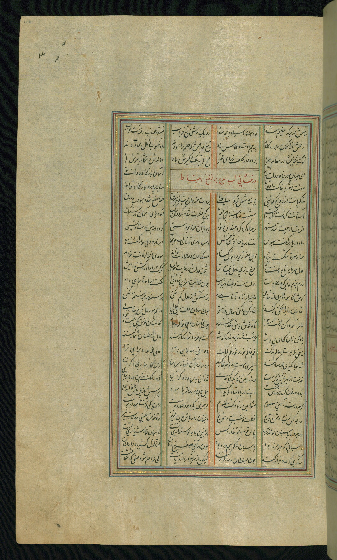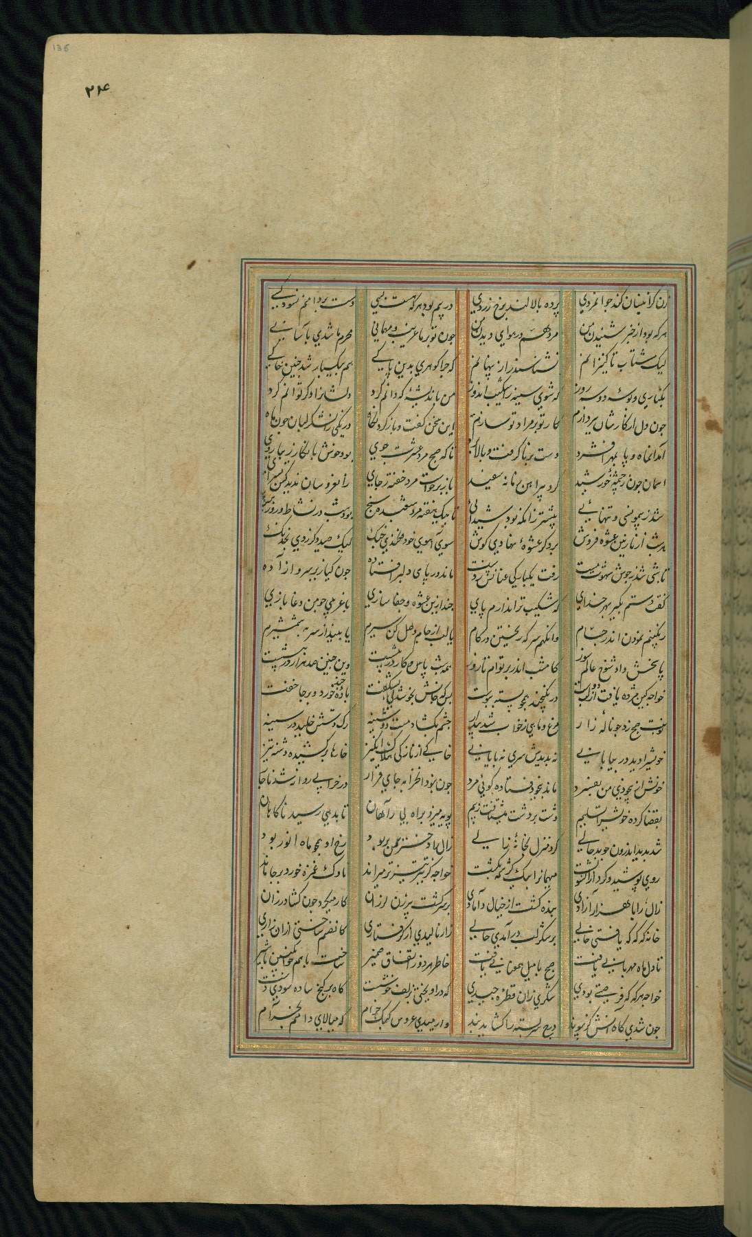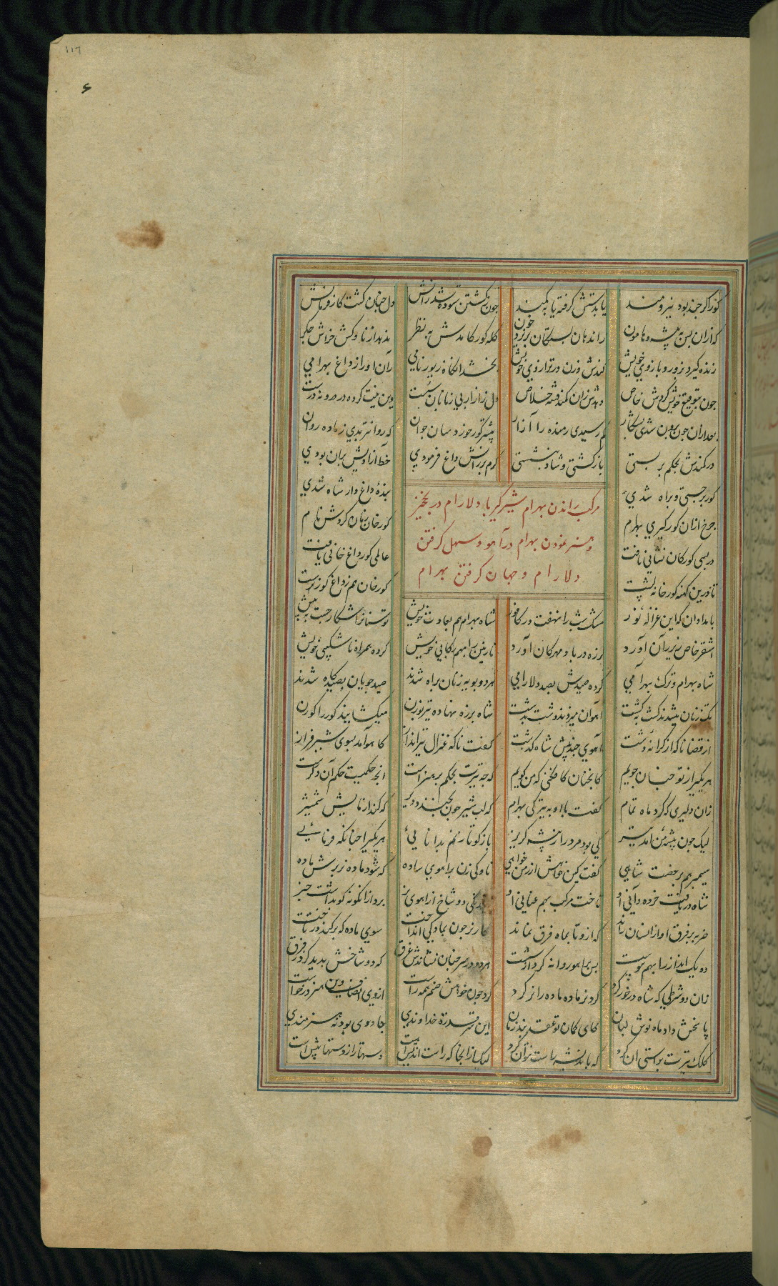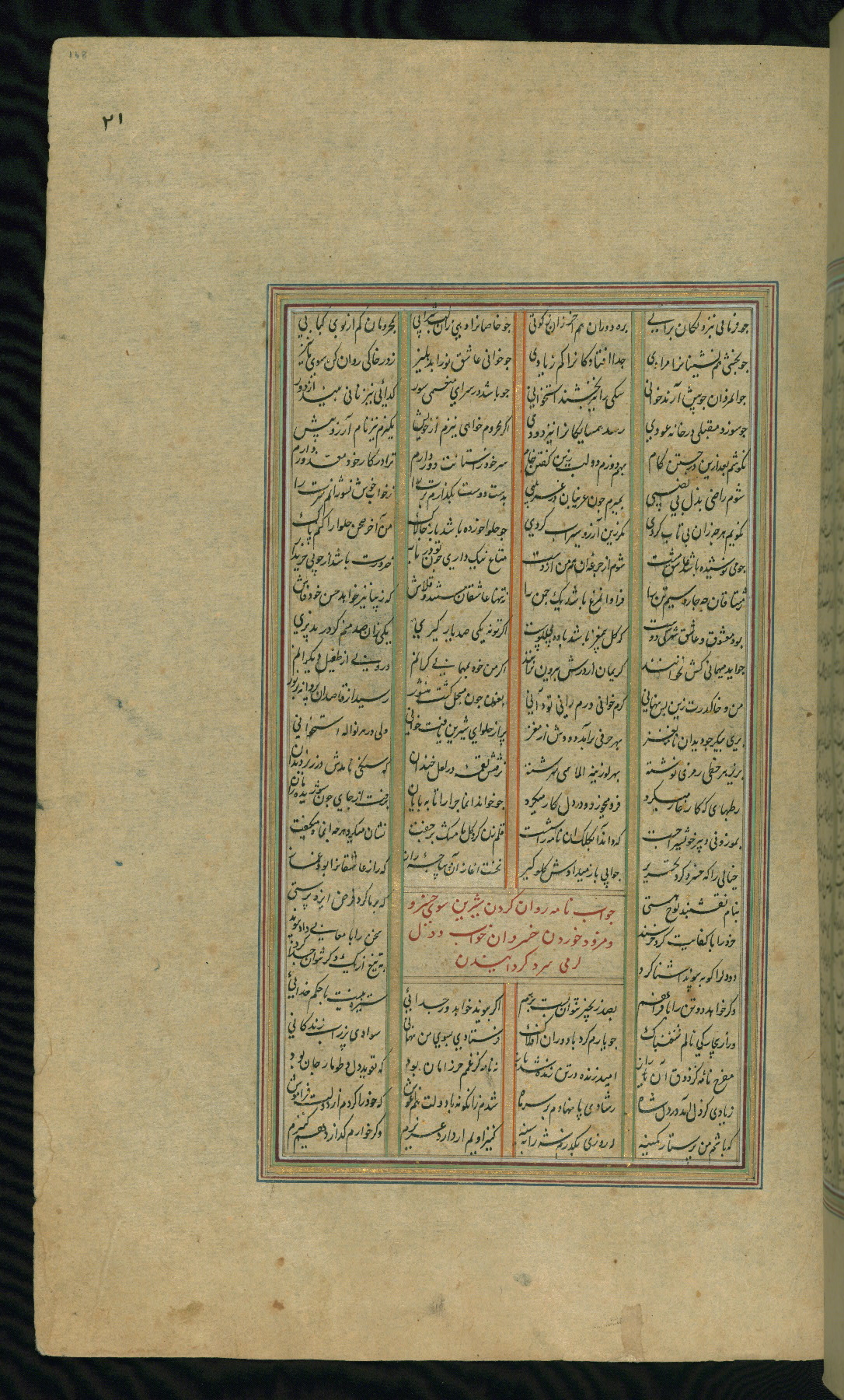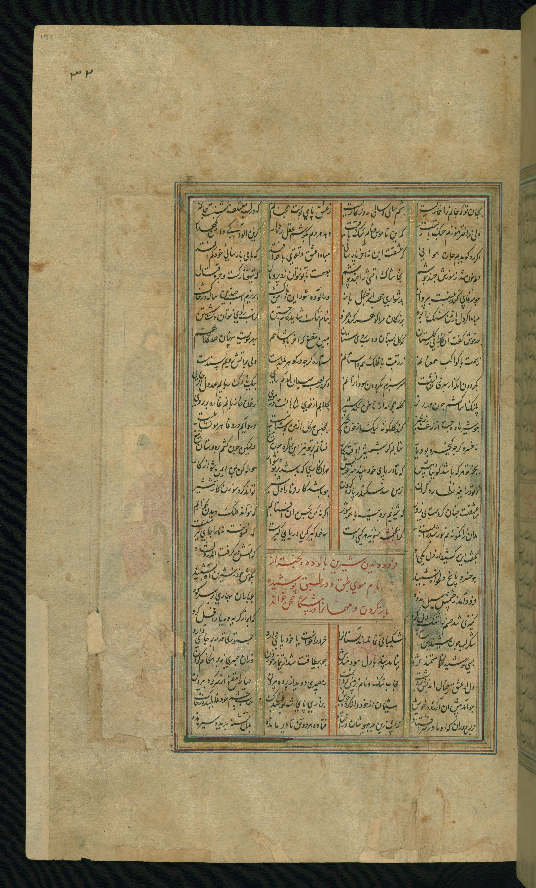This illuminated and illustrated manuscript contains the Khamsah (quintet) and two historical poems (masnavi), Qirān-i saʿdayn and Nuh sipihr, by Amīr Khusraw Dihlavī (d. 725 AH / 1325 CE). The codex is dated 1017 AH / 1609 CE and was produced in Safavid Iran. All texts are written in black nastaʿlīq script with chapter headings in red. The manuscript opens with an illuminated and illustrated frontispiece of a hunting and court scene in the early Safavid style (fols. 1b-2a). The first text is Khamsah-i Dihlavī (fols. 2b-192a), which is introduced by an illuminated incipit and titlepiece with the title of the first poem of the quintet and the author's name. The second text is Qirān-i saʿdayn, a historical poem (masnavi) about the meeting of Sultan Muʿizz al-Dīn Kayqubād and his father, Nāṣir al-Din Bughrā Khān, on the banks of the Sarjū in Oudh. It is also introduced with an illuminated incipit and titlepiece (fol. 193b). The third text is Nuh sipihr, a historical poem (masnavi) describing the glories of Sultan Quṭb al-Dīn Mubārak Shāh Khaljī’s time, introduced with an illuminated incipit and headpiece (fol. 223b). The dark brown leather binding is original to the manuscript.