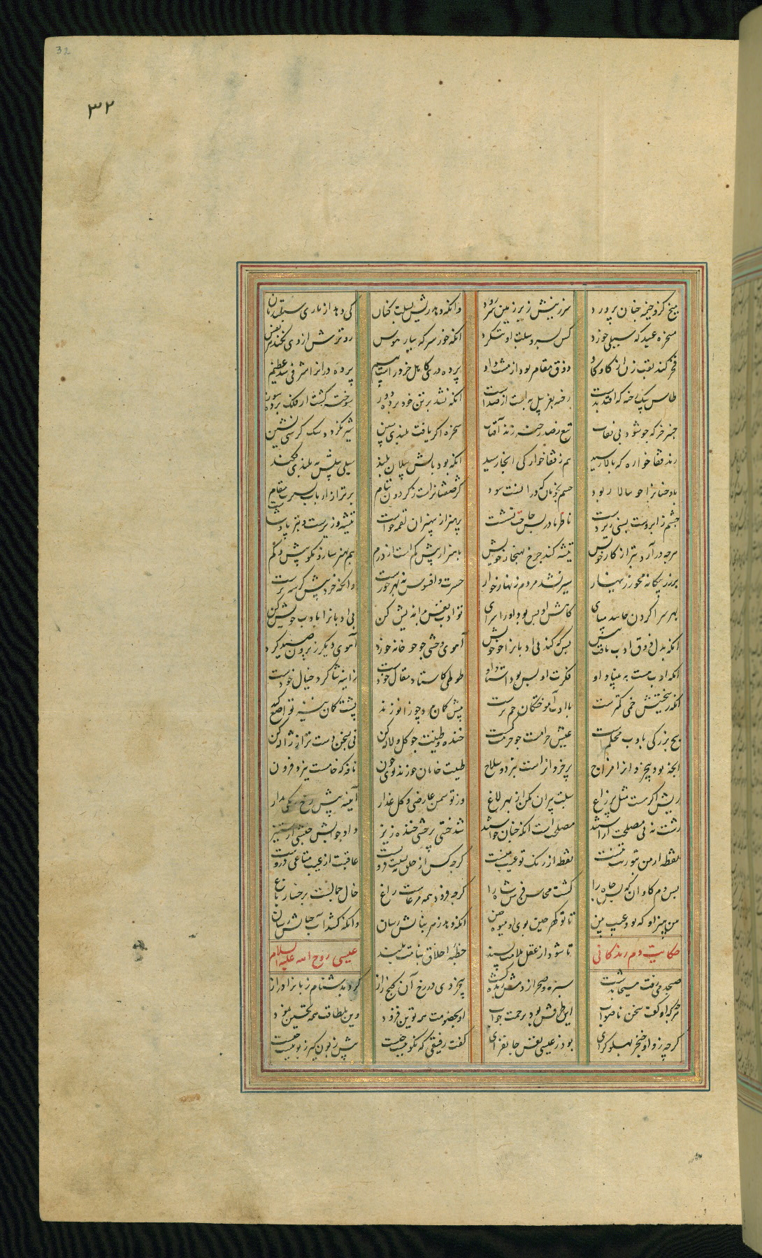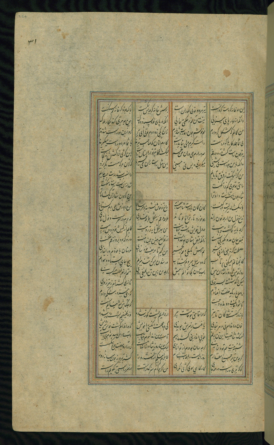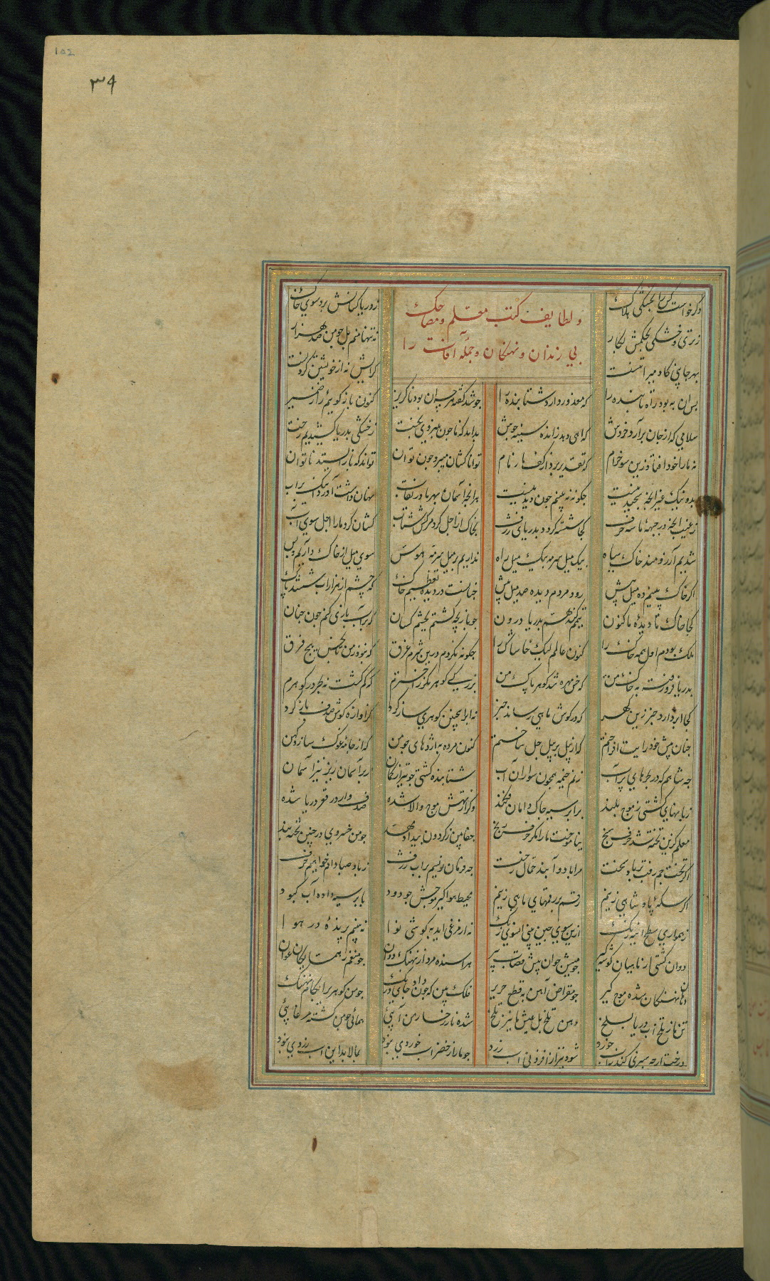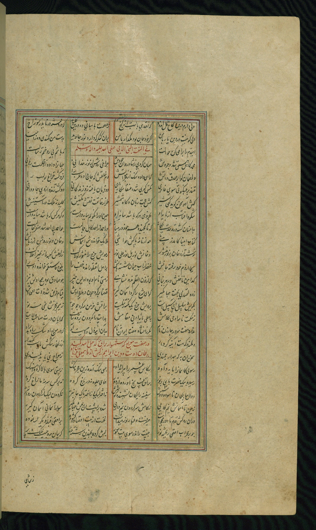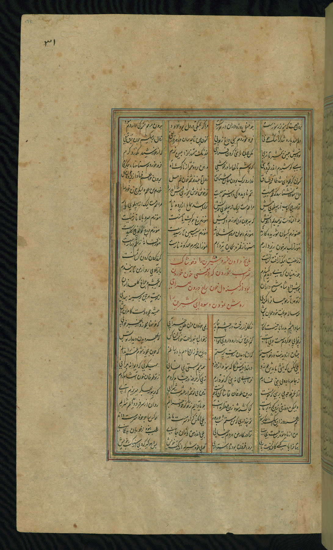 This illuminated and illustrated manuscript contains the Khamsah (quintet) and two historical poems (masnavi), Qirān-i saʿdayn and Nuh sipihr, by Amīr Khusraw Dihlavī (d. 725 AH / 1325 CE). The codex is dated 1017 AH / 1609 CE and was produced in Safavid Iran. All texts are written in black nastaʿlīq script with chapter headings in red. The manuscript opens with an illuminated and illustrated frontispiece of a hunting and court scene in the early Safavid style (fols. 1b-2a). The first text is Khamsah-i Dihlavī (fols. 2b-192a), which is introduced by an illuminated incipit and titlepiece with the title of the first poem of the quintet and the author's name. The second text is Qirān-i saʿdayn, a historical poem (masnavi) about the meeting of Sultan Muʿizz al-Dīn Kayqubād and his father, Nāṣir al-Din Bughrā Khān, on the banks of the Sarjū in Oudh. It is also introduced with an illuminated incipit and titlepiece (fol. 193b). The third text is Nuh sipihr, a historical poem (masnavi) describing the glories of Sultan Quṭb al-Dīn Mubārak Shāh Khaljī’s time, introduced with an illuminated incipit and headpiece (fol. 223b). The dark brown leather binding is original to the manuscript.
