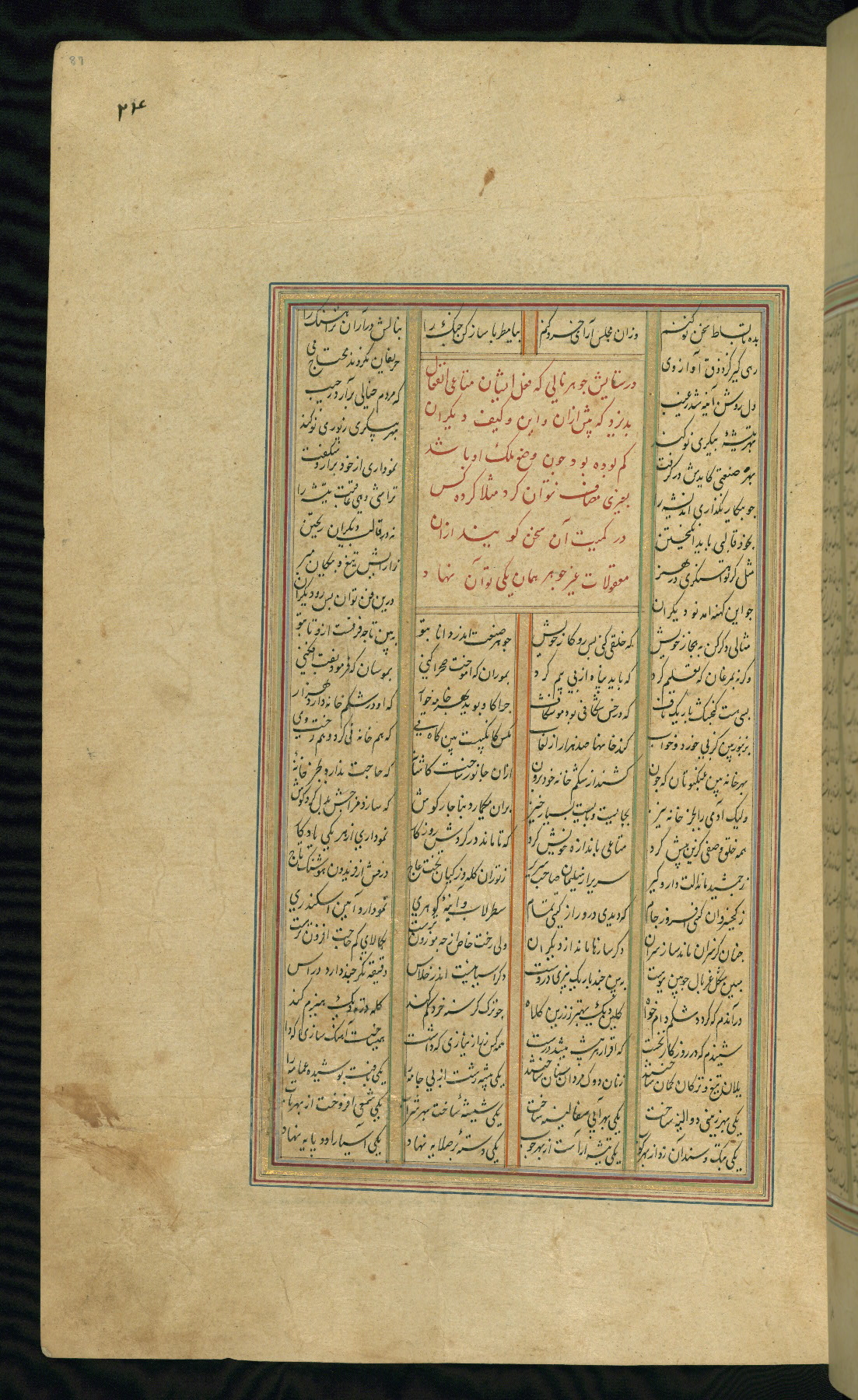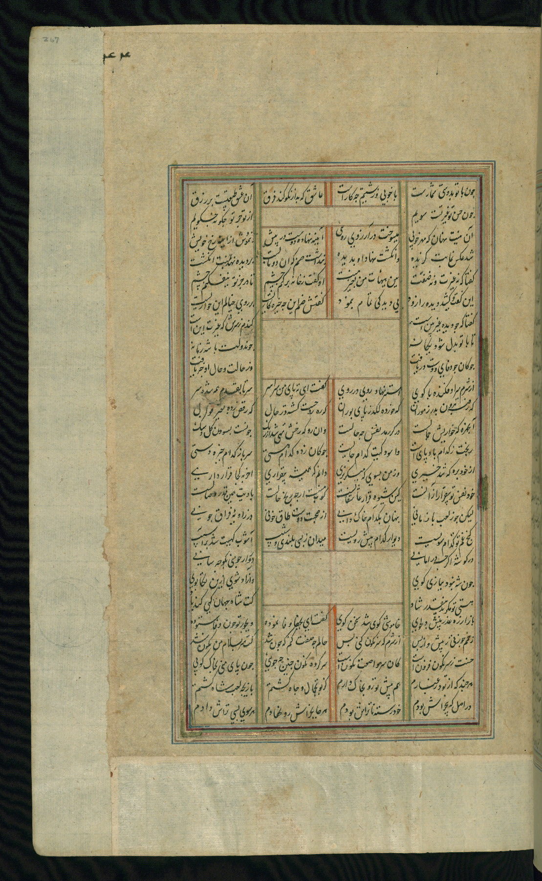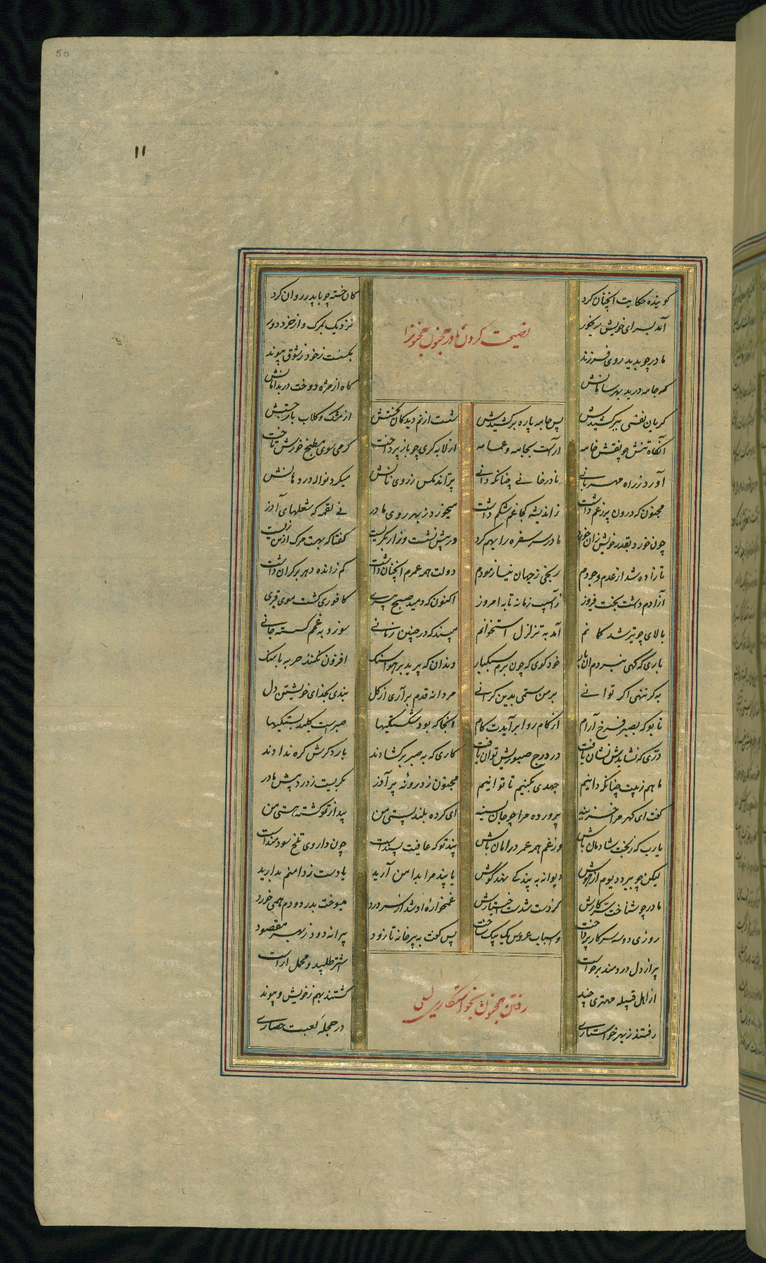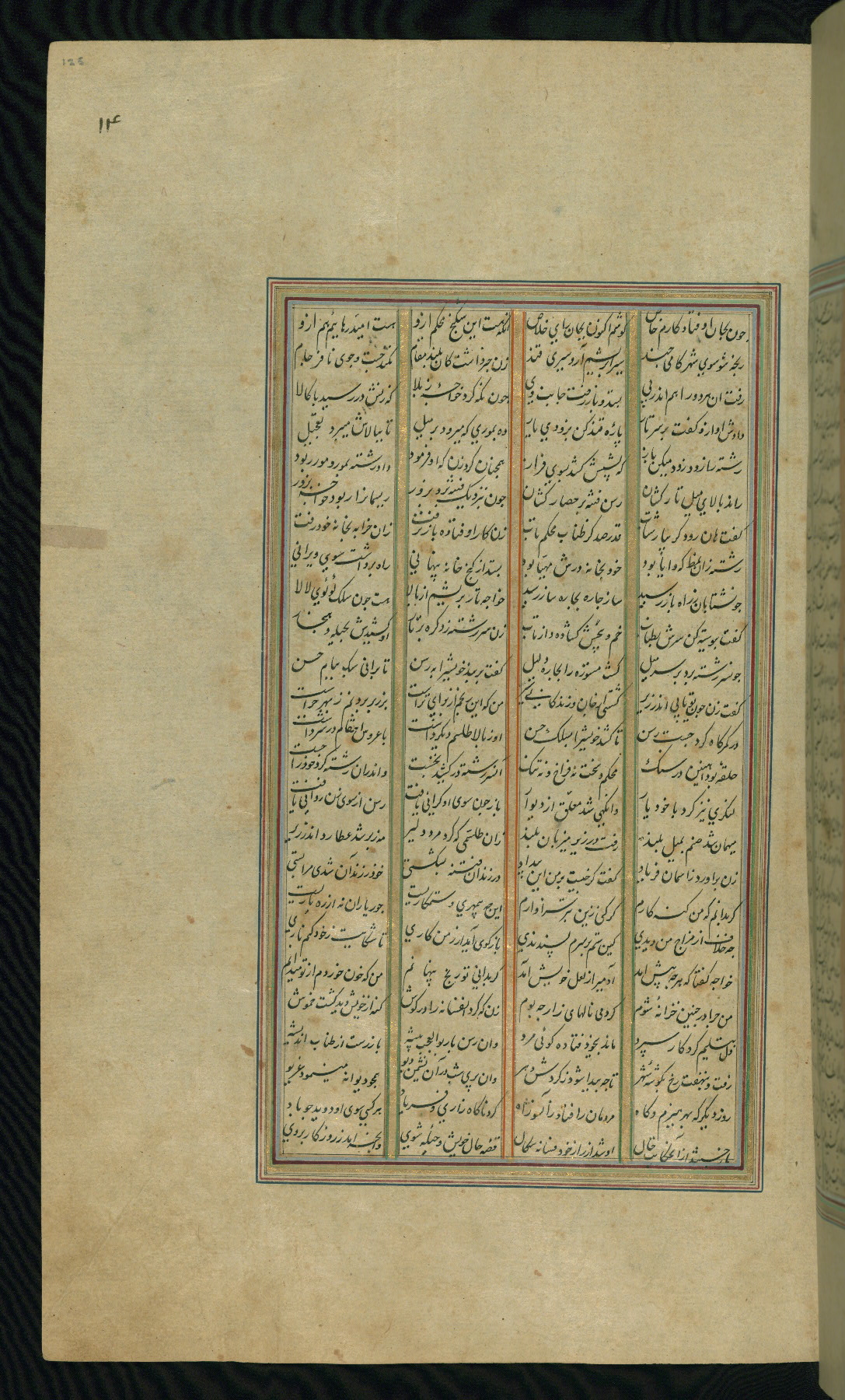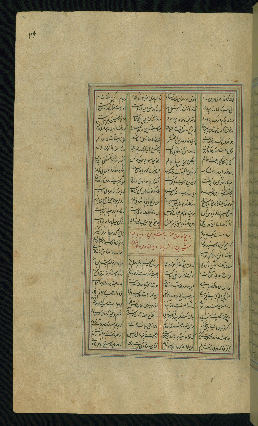 This illuminated and illustrated manuscript contains the Khamsah (quintet) and two historical poems (masnavi), Qirān-i saʿdayn and Nuh sipihr, by Amīr Khusraw Dihlavī (d. 725 AH / 1325 CE). The codex is dated 1017 AH / 1609 CE and was produced in Safavid Iran. All texts are written in black nastaʿlīq script with chapter headings in red. The manuscript opens with an illuminated and illustrated frontispiece of a hunting and court scene in the early Safavid style (fols. 1b-2a). The first text is Khamsah-i Dihlavī (fols. 2b-192a), which is introduced by an illuminated incipit and titlepiece with the title of the first poem of the quintet and the author's name. The second text is Qirān-i saʿdayn, a historical poem (masnavi) about the meeting of Sultan Muʿizz al-Dīn Kayqubād and his father, Nāṣir al-Din Bughrā Khān, on the banks of the Sarjū in Oudh. It is also introduced with an illuminated incipit and titlepiece (fol. 193b). The third text is Nuh sipihr, a historical poem (masnavi) describing the glories of Sultan Quṭb al-Dīn Mubārak Shāh Khaljī’s time, introduced with an illuminated incipit and headpiece (fol. 223b). The dark brown leather binding is original to the manuscript.