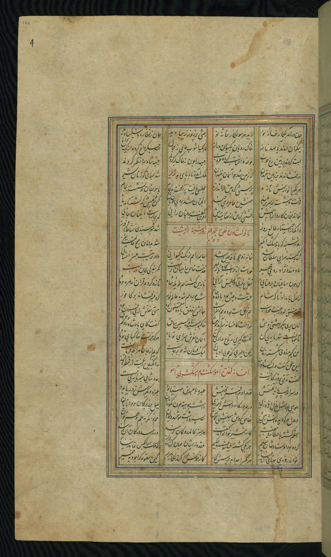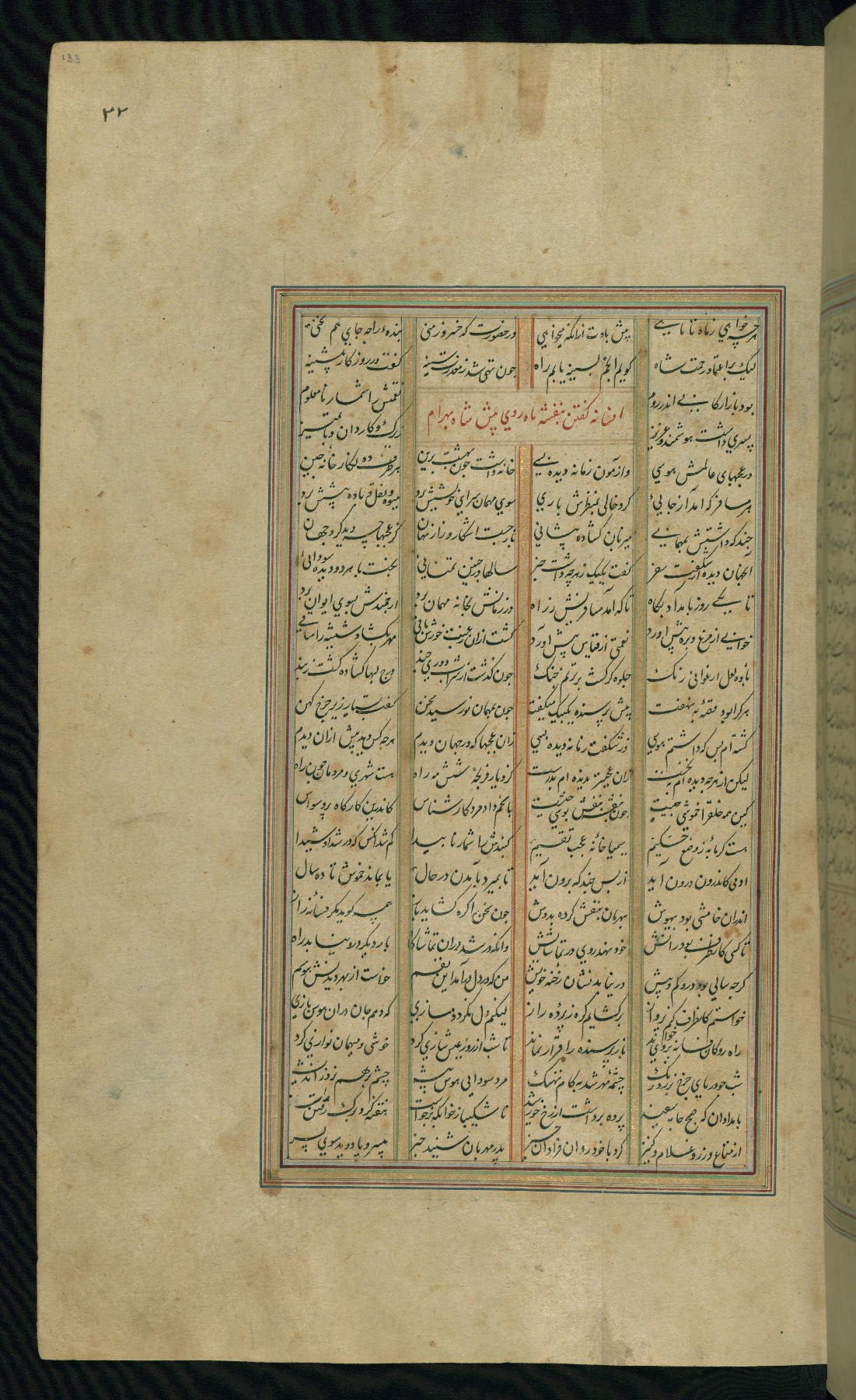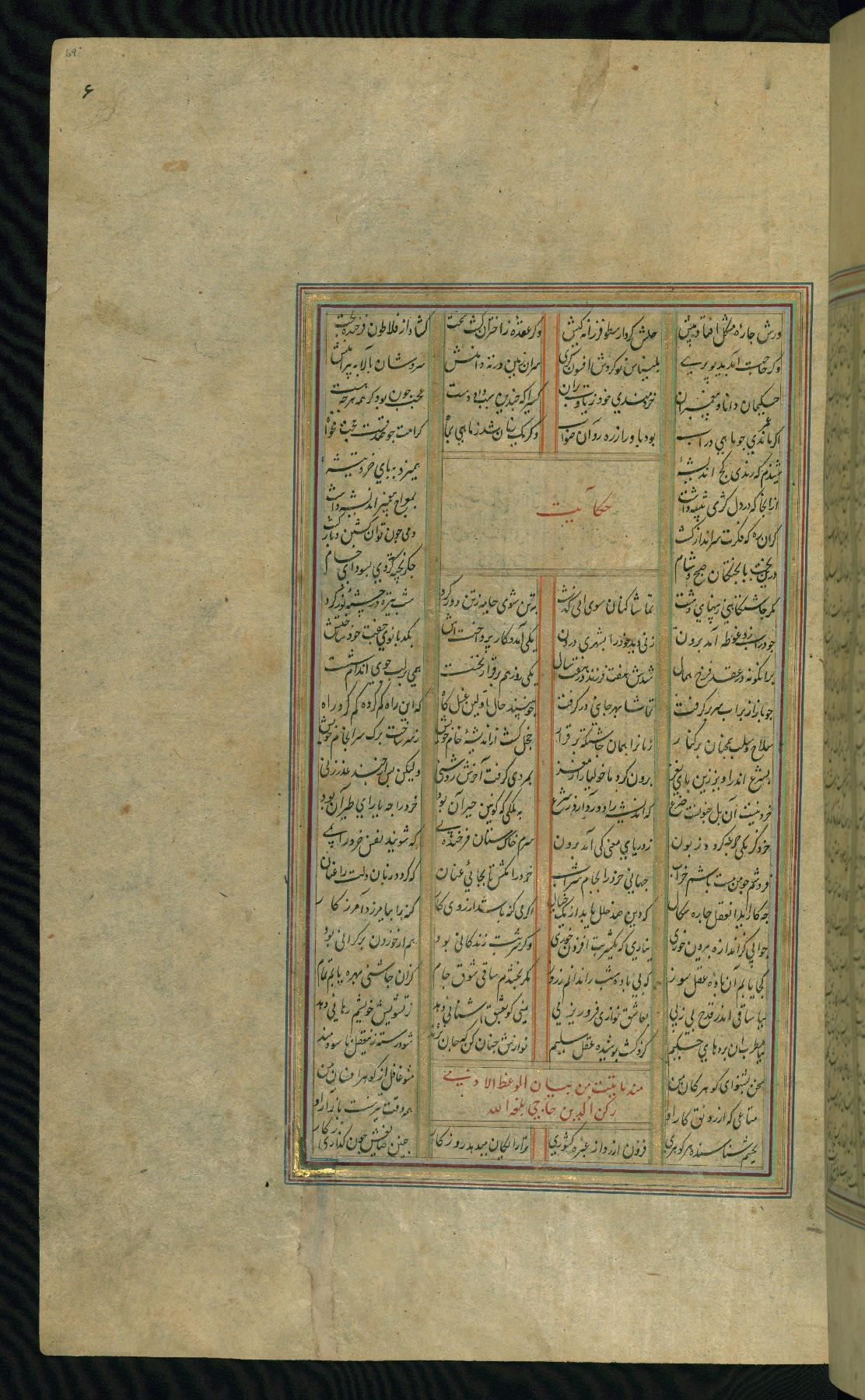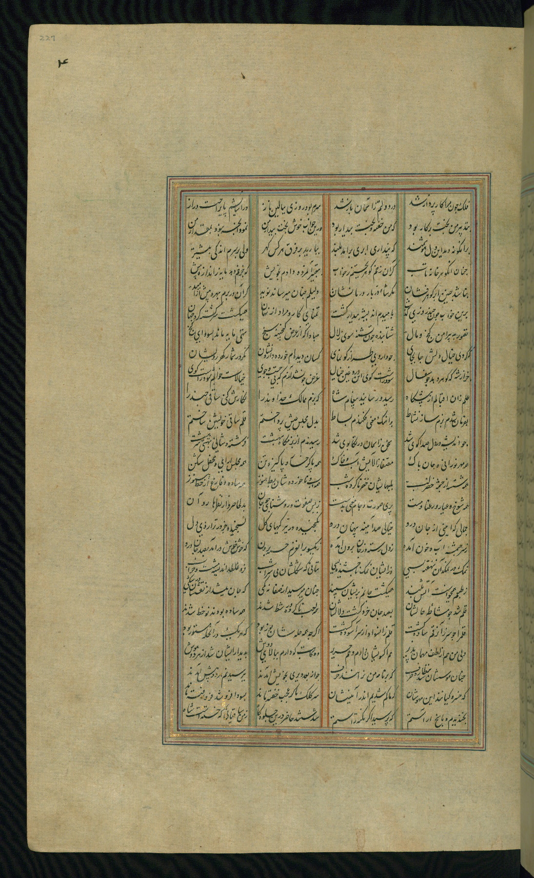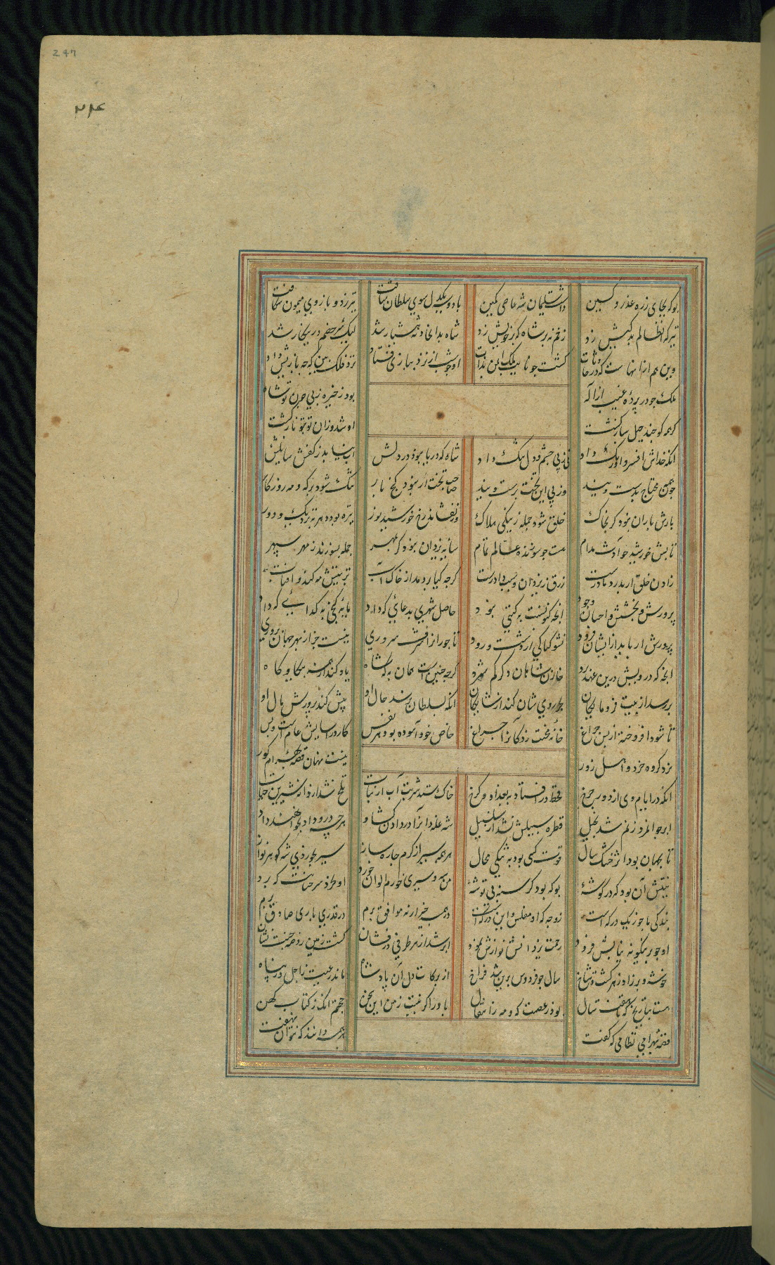 This illuminated and illustrated manuscript contains the Khamsah (quintet) and two historical poems (masnavi), Qirān-i saʿdayn and Nuh sipihr, by Amīr Khusraw Dihlavī (d. 725 AH / 1325 CE). The codex is dated 1017 AH / 1609 CE and was produced in Safavid Iran. All texts are written in black nastaʿlīq script with chapter headings in red. The manuscript opens with an illuminated and illustrated frontispiece of a hunting and court scene in the early Safavid style (fols. 1b-2a). The first text is Khamsah-i Dihlavī (fols. 2b-192a), which is introduced by an illuminated incipit and titlepiece with the title of the first poem of the quintet and the author's name. The second text is Qirān-i saʿdayn, a historical poem (masnavi) about the meeting of Sultan Muʿizz al-Dīn Kayqubād and his father, Nāṣir al-Din Bughrā Khān, on the banks of the Sarjū in Oudh. It is also introduced with an illuminated incipit and titlepiece (fol. 193b). The third text is Nuh sipihr, a historical poem (masnavi) describing the glories of Sultan Quṭb al-Dīn Mubārak Shāh Khaljī’s time, introduced with an illuminated incipit and headpiece (fol. 223b). The dark brown leather binding is original to the manuscript.
