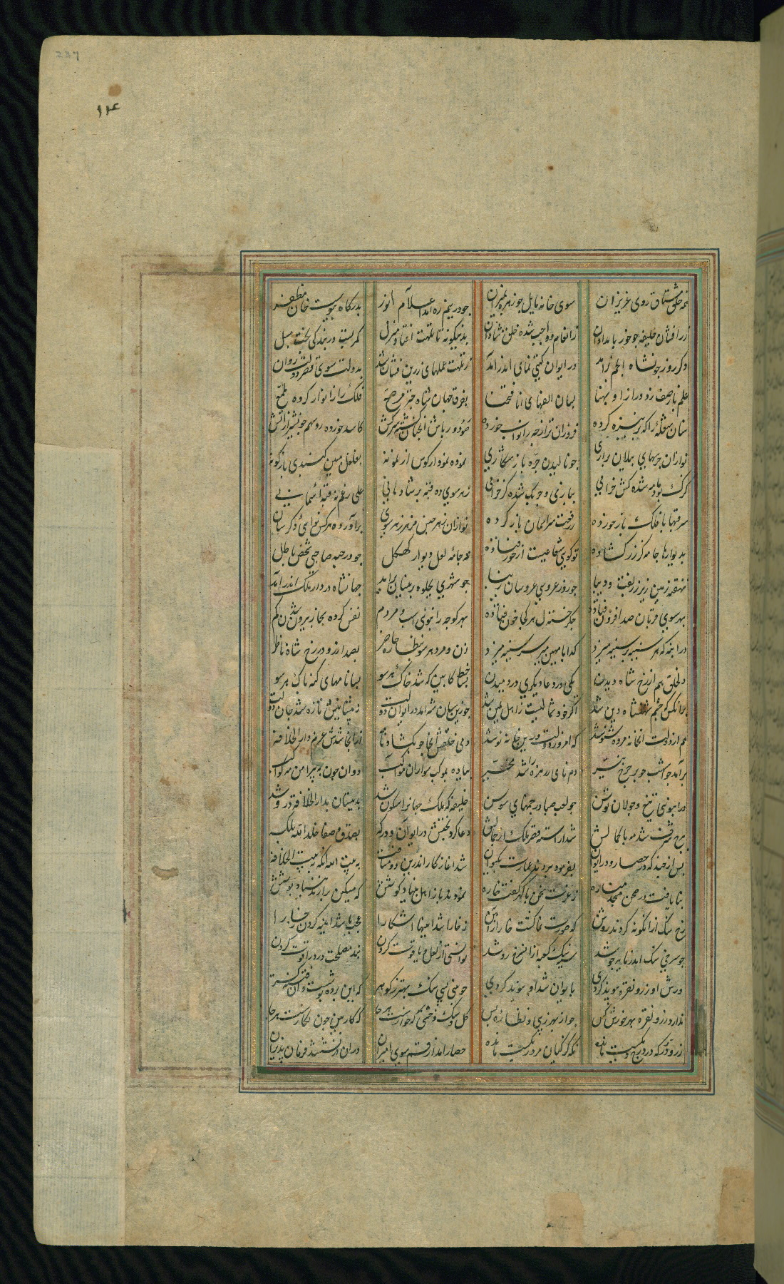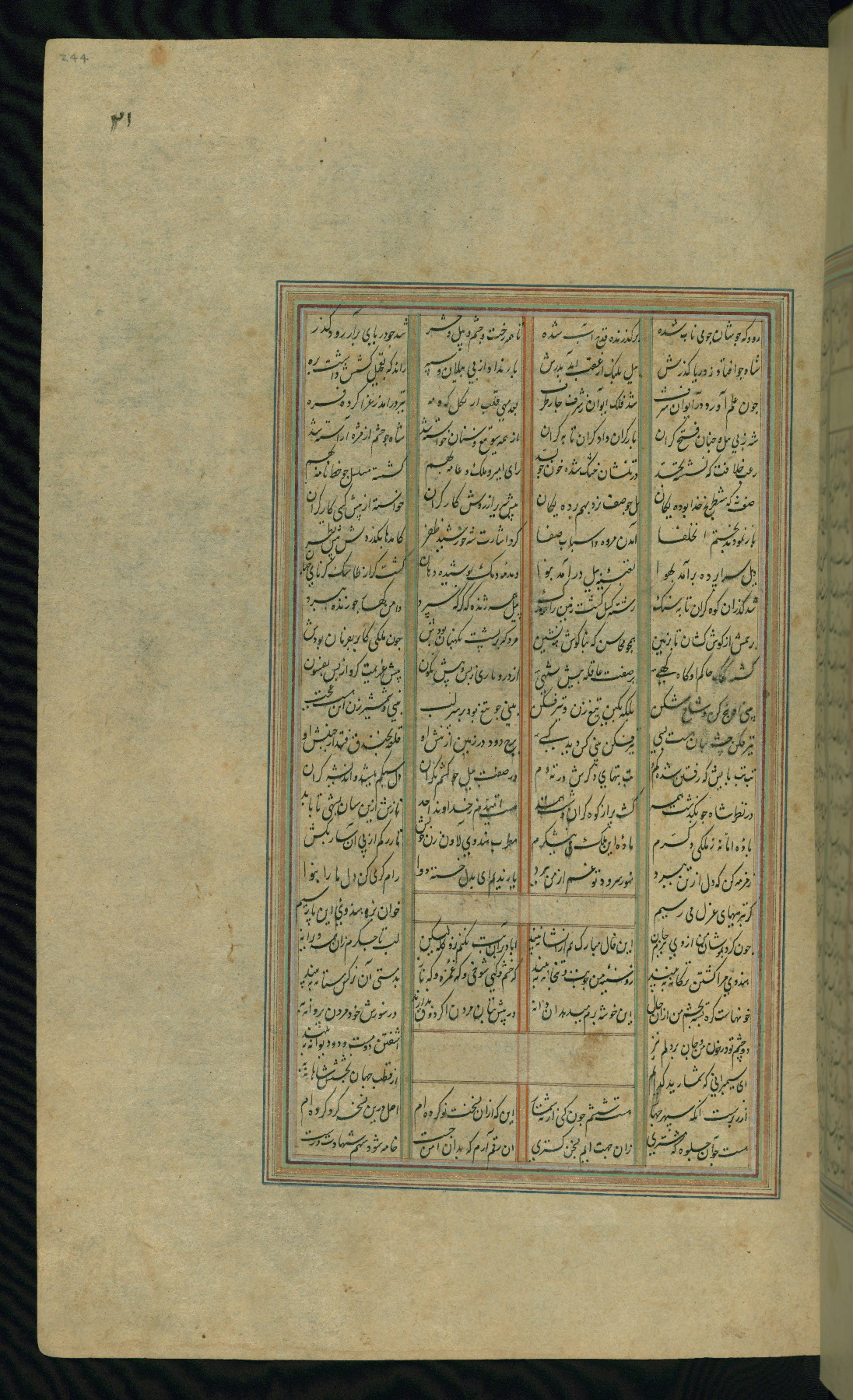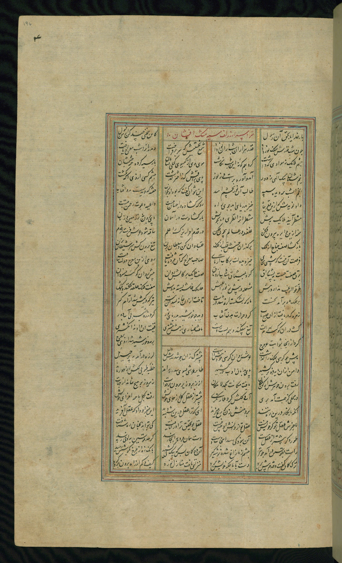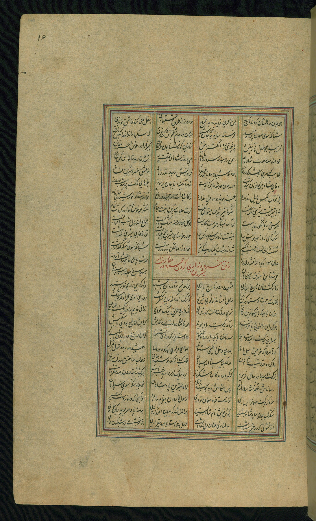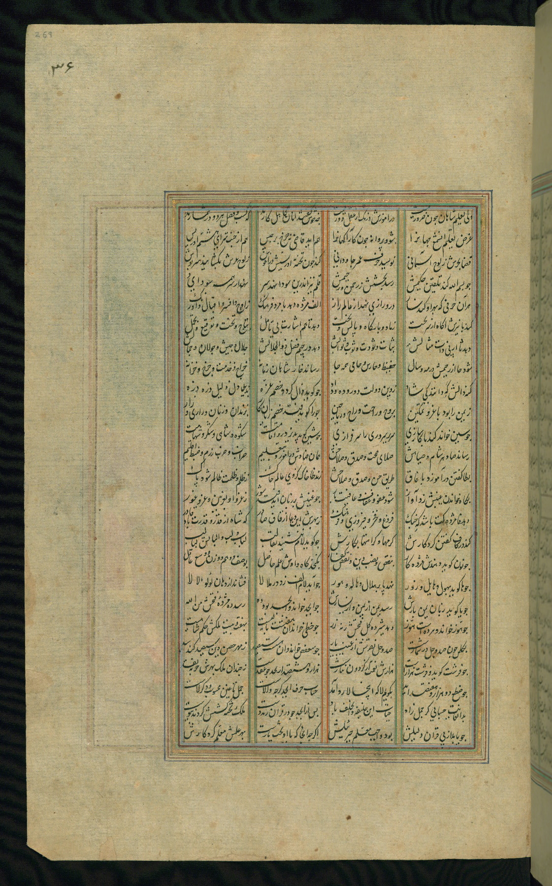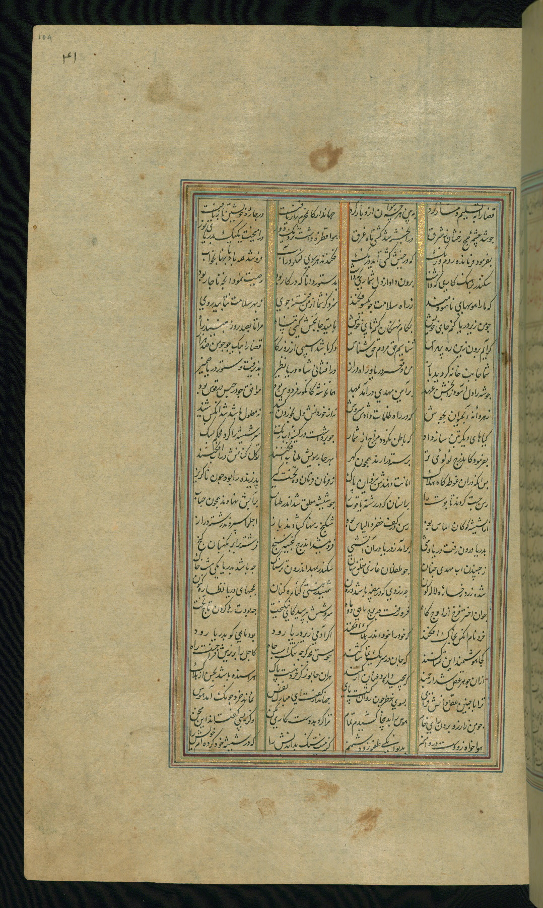 This illuminated and illustrated manuscript contains the Khamsah (quintet) and two historical poems (masnavi), Qirān-i saʿdayn and Nuh sipihr, by Amīr Khusraw Dihlavī (d. 725 AH / 1325 CE). The codex is dated 1017 AH / 1609 CE and was produced in Safavid Iran. All texts are written in black nastaʿlīq script with chapter headings in red. The manuscript opens with an illuminated and illustrated frontispiece of a hunting and court scene in the early Safavid style (fols. 1b-2a). The first text is Khamsah-i Dihlavī (fols. 2b-192a), which is introduced by an illuminated incipit and titlepiece with the title of the first poem of the quintet and the author's name. The second text is Qirān-i saʿdayn, a historical poem (masnavi) about the meeting of Sultan Muʿizz al-Dīn Kayqubād and his father, Nāṣir al-Din Bughrā Khān, on the banks of the Sarjū in Oudh. It is also introduced with an illuminated incipit and titlepiece (fol. 193b). The third text is Nuh sipihr, a historical poem (masnavi) describing the glories of Sultan Quṭb al-Dīn Mubārak Shāh Khaljī’s time, introduced with an illuminated incipit and headpiece (fol. 223b). The dark brown leather binding is original to the manuscript.