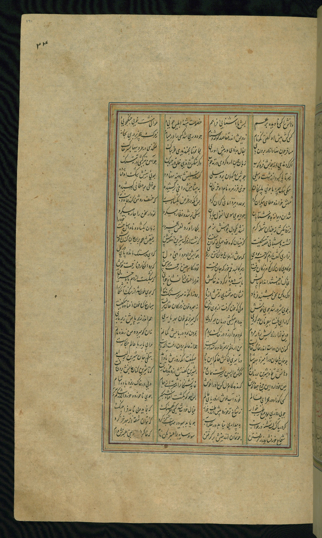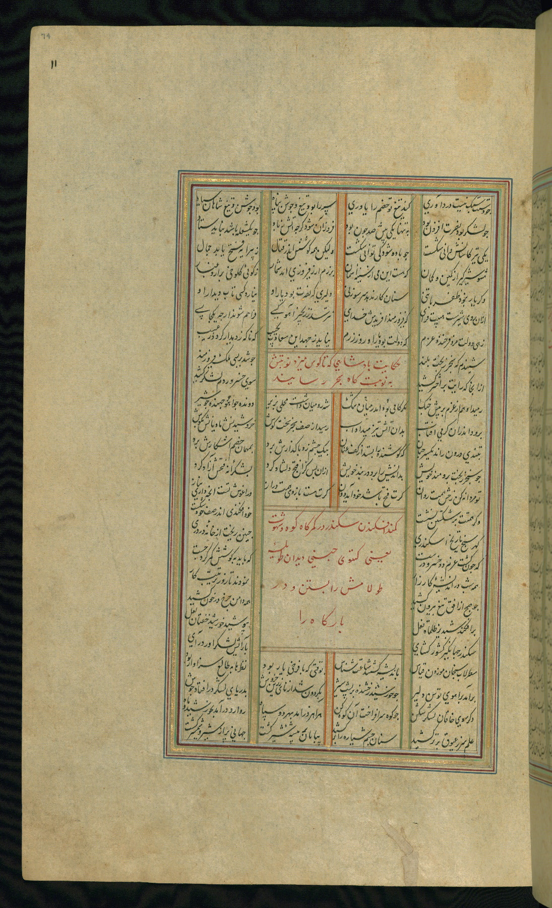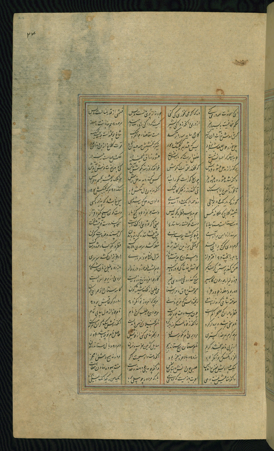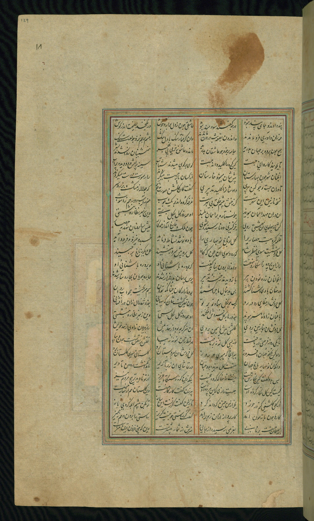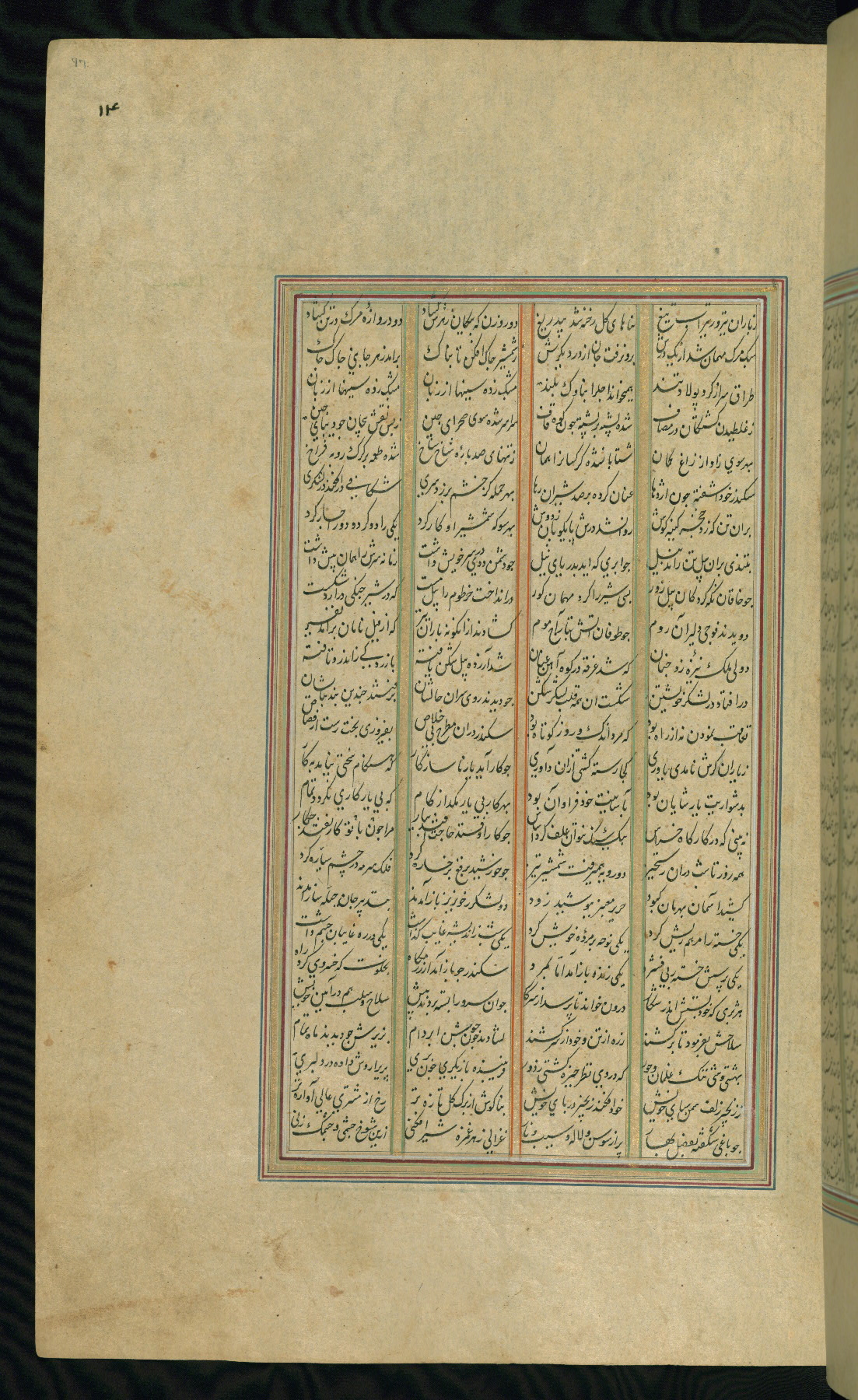 This illuminated and illustrated manuscript contains the Khamsah (quintet) and two historical poems (masnavi), Qirān-i saʿdayn and Nuh sipihr, by Amīr Khusraw Dihlavī (d. 725 AH / 1325 CE). The codex is dated 1017 AH / 1609 CE and was produced in Safavid Iran. All texts are written in black nastaʿlīq script with chapter headings in red. The manuscript opens with an illuminated and illustrated frontispiece of a hunting and court scene in the early Safavid style (fols. 1b-2a). The first text is Khamsah-i Dihlavī (fols. 2b-192a), which is introduced by an illuminated incipit and titlepiece with the title of the first poem of the quintet and the author's name. The second text is Qirān-i saʿdayn, a historical poem (masnavi) about the meeting of Sultan Muʿizz al-Dīn Kayqubād and his father, Nāṣir al-Din Bughrā Khān, on the banks of the Sarjū in Oudh. It is also introduced with an illuminated incipit and titlepiece (fol. 193b). The third text is Nuh sipihr, a historical poem (masnavi) describing the glories of Sultan Quṭb al-Dīn Mubārak Shāh Khaljī’s time, introduced with an illuminated incipit and headpiece (fol. 223b). The dark brown leather binding is original to the manuscript.