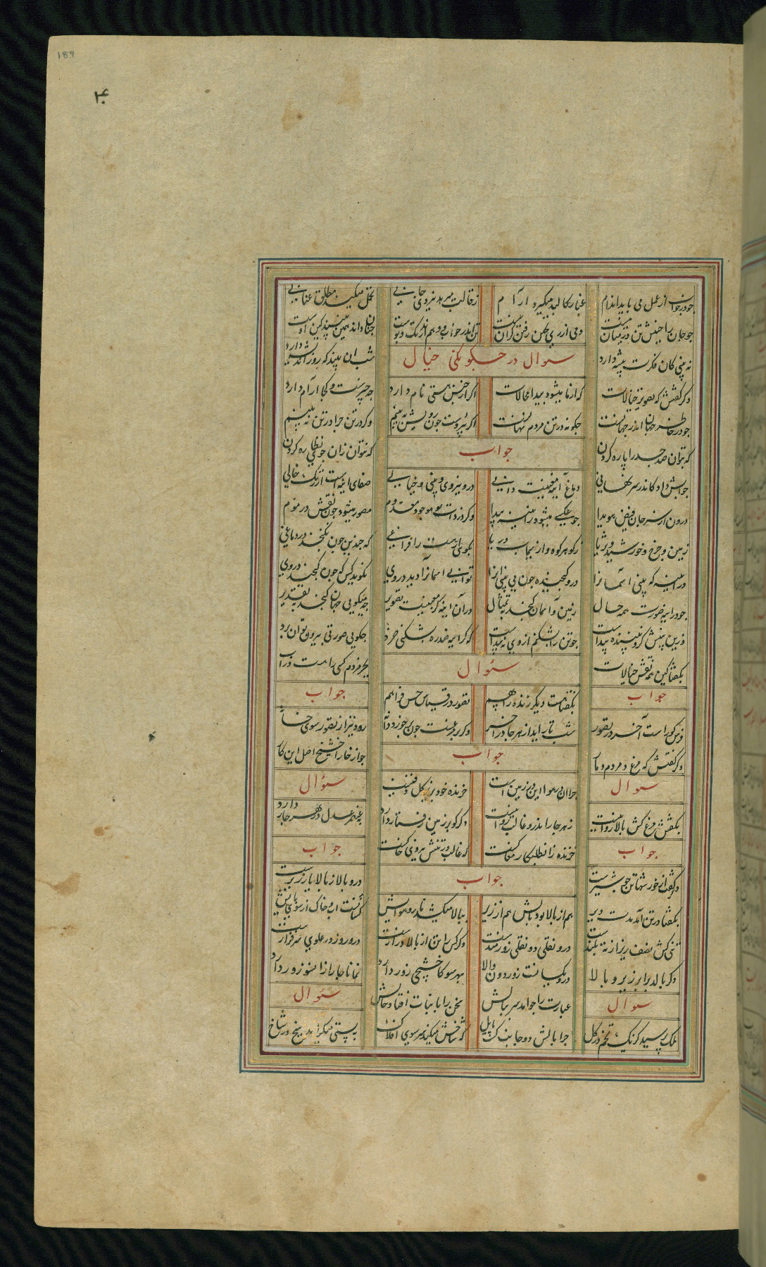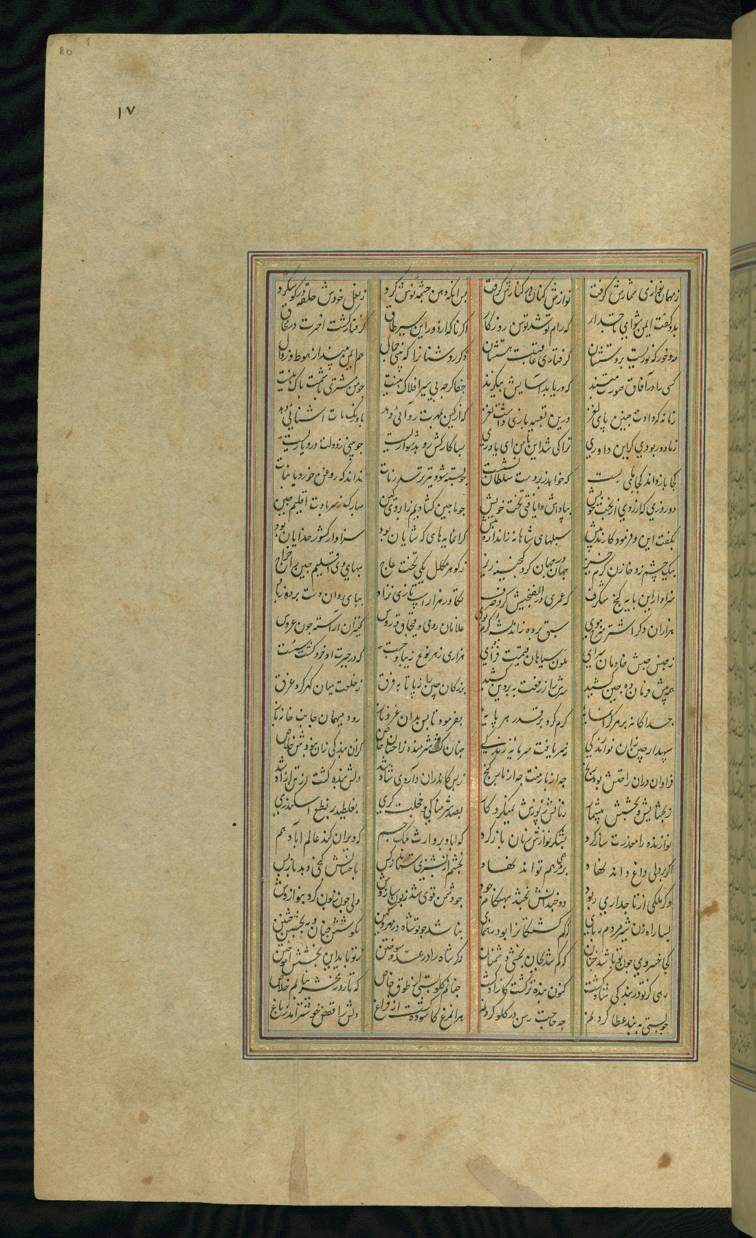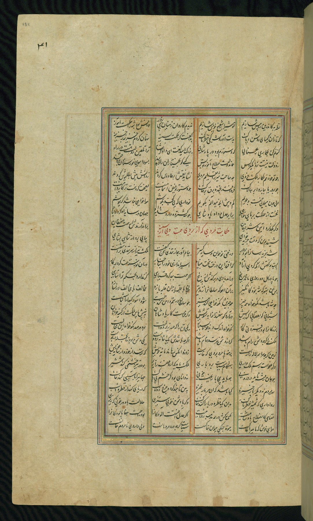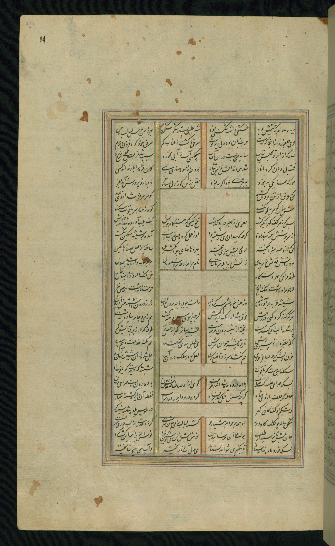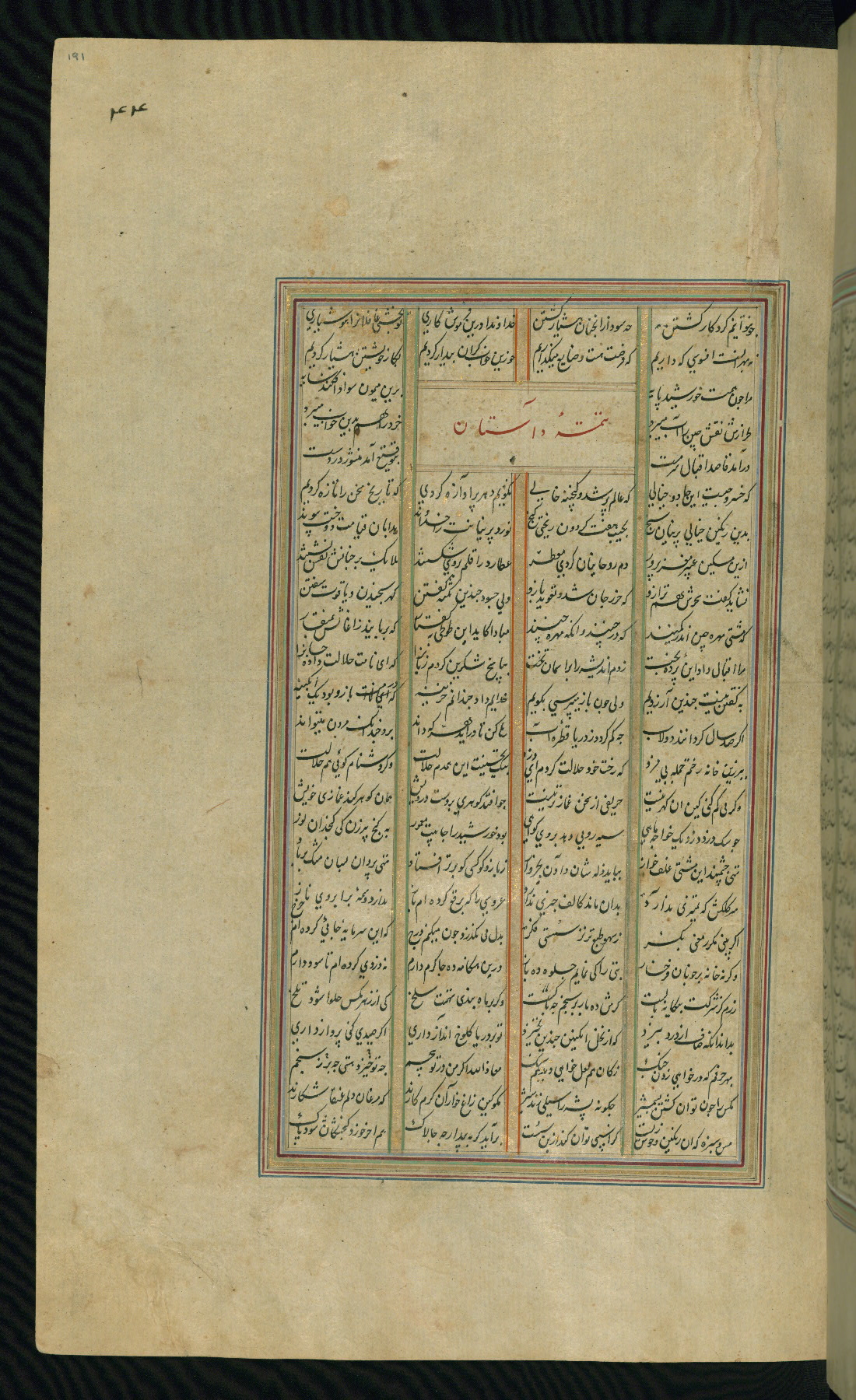 This illuminated and illustrated manuscript contains the Khamsah (quintet) and two historical poems (masnavi), Qirān-i saʿdayn and Nuh sipihr, by Amīr Khusraw Dihlavī (d. 725 AH / 1325 CE). The codex is dated 1017 AH / 1609 CE and was produced in Safavid Iran. All texts are written in black nastaʿlīq script with chapter headings in red. The manuscript opens with an illuminated and illustrated frontispiece of a hunting and court scene in the early Safavid style (fols. 1b-2a). The first text is Khamsah-i Dihlavī (fols. 2b-192a), which is introduced by an illuminated incipit and titlepiece with the title of the first poem of the quintet and the author's name. The second text is Qirān-i saʿdayn, a historical poem (masnavi) about the meeting of Sultan Muʿizz al-Dīn Kayqubād and his father, Nāṣir al-Din Bughrā Khān, on the banks of the Sarjū in Oudh. It is also introduced with an illuminated incipit and titlepiece (fol. 193b). The third text is Nuh sipihr, a historical poem (masnavi) describing the glories of Sultan Quṭb al-Dīn Mubārak Shāh Khaljī’s time, introduced with an illuminated incipit and headpiece (fol. 223b). The dark brown leather binding is original to the manuscript.