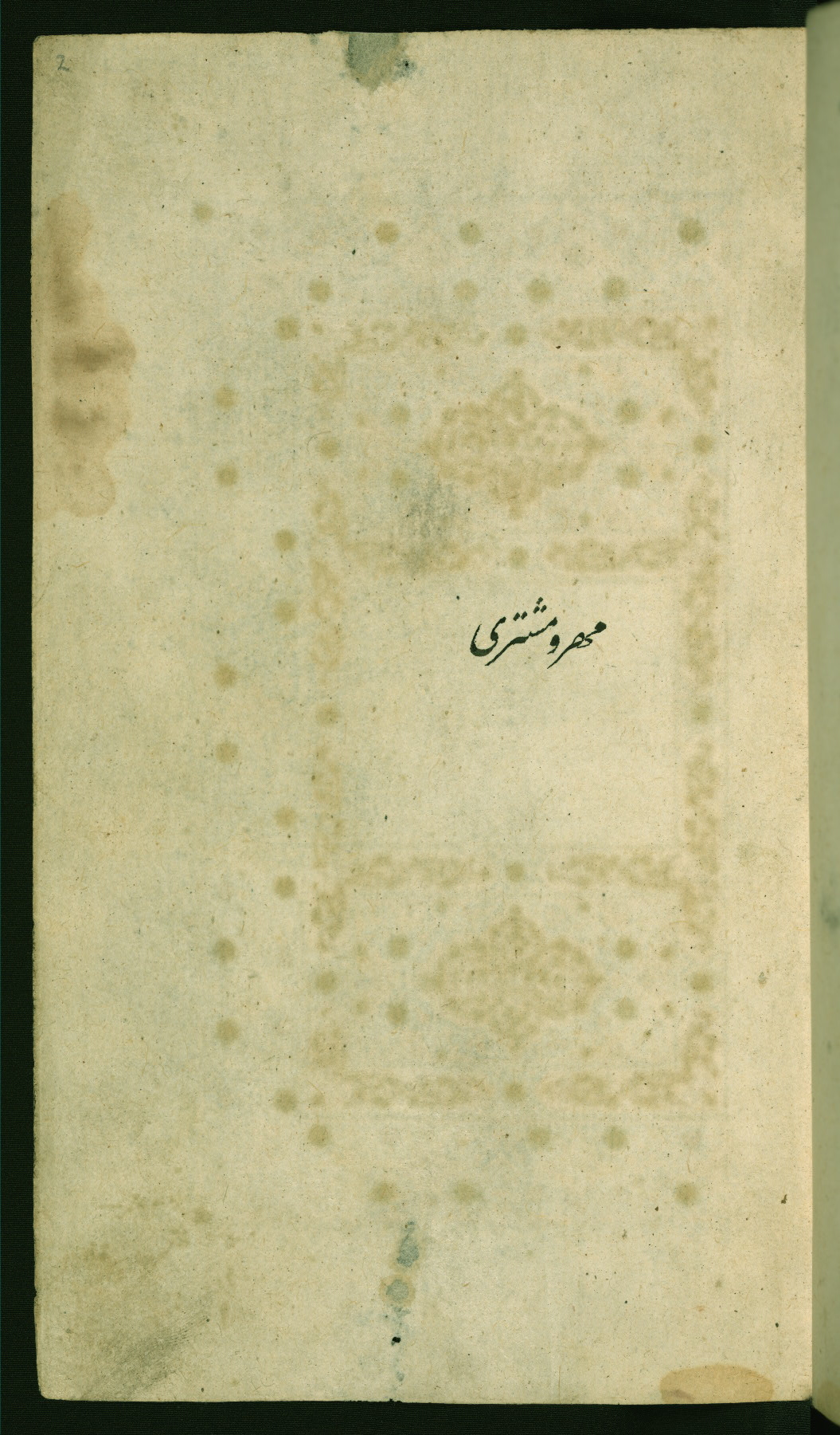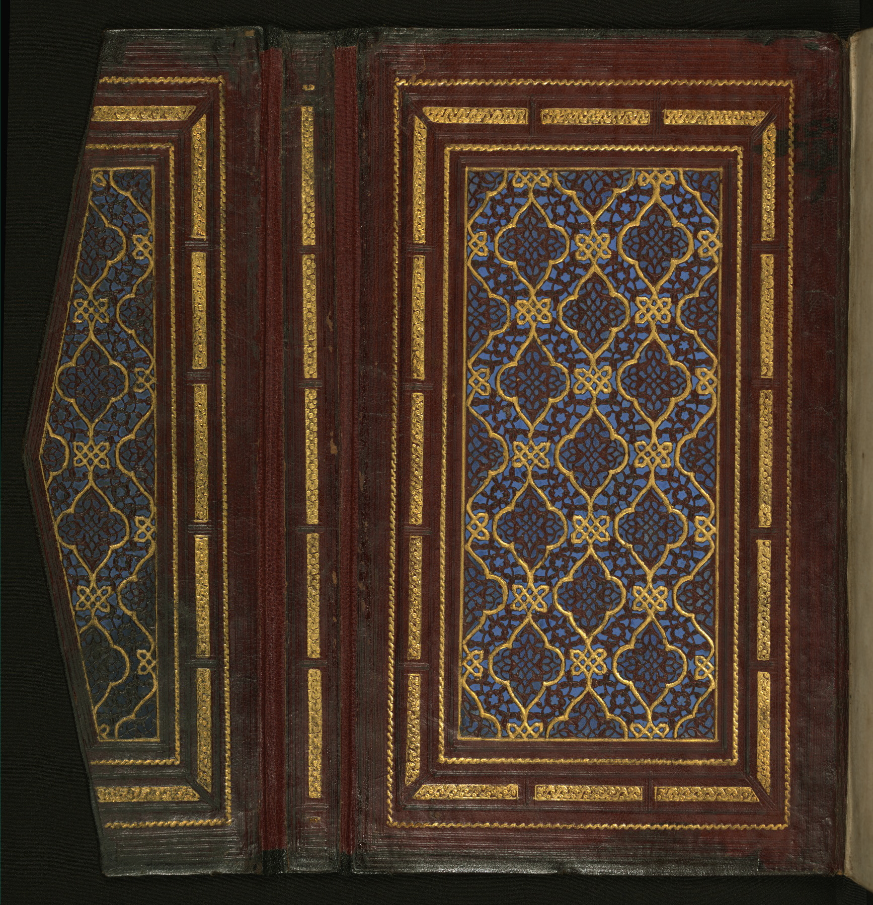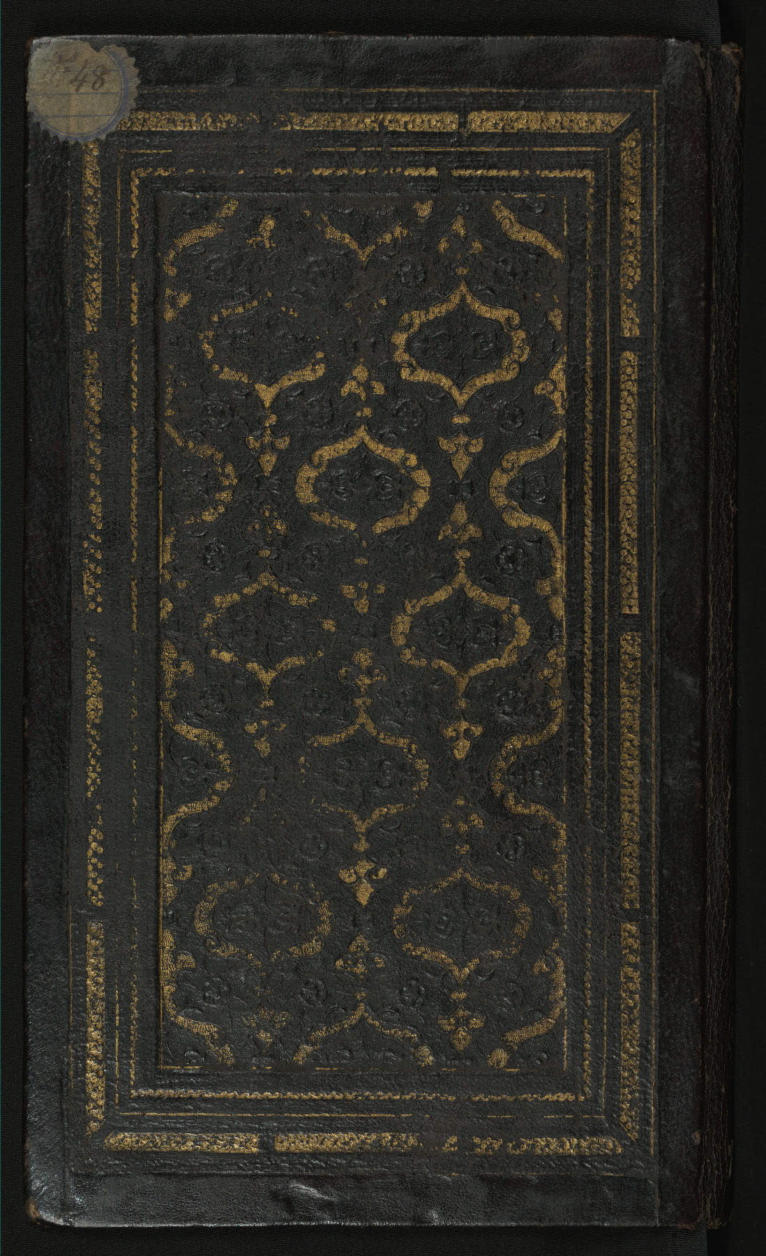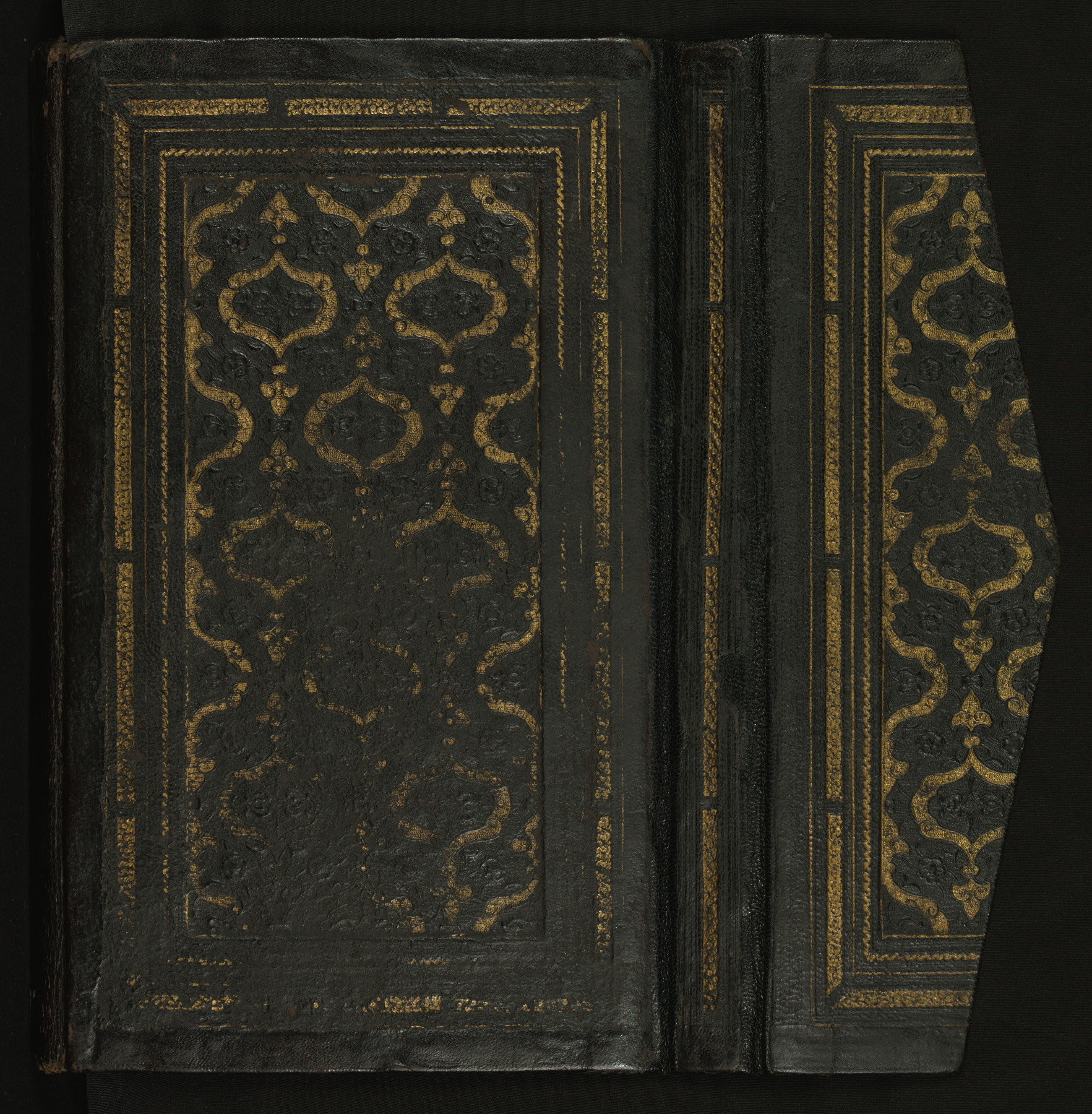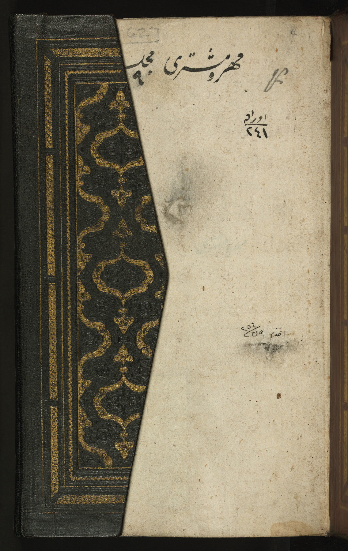 This manuscript is an illustrated copy of the well-known poem recounting the platonic love story between Mihr (the Sun), the son of Shāhpūr, and his vizier's son Mushtarī (Jupiter). The story of 90 chapters was composed by Muḥammad ibn Aḥmad ‘Aṣṣār Tabrīzī (d. 784 AH / 1382 CE). The present copy was written in nasta‘līq script by Murshid al-Kātib in 881 AH / 1476 CE. Considering the number of surviving manuscripts in which this calligrapher’s name is found, it seems he was particularly prolific. The present codex is illustrated with nine paintings. The gold-brushed leather binding with doublures of red leather decorated with filigree work is original to the manuscript.