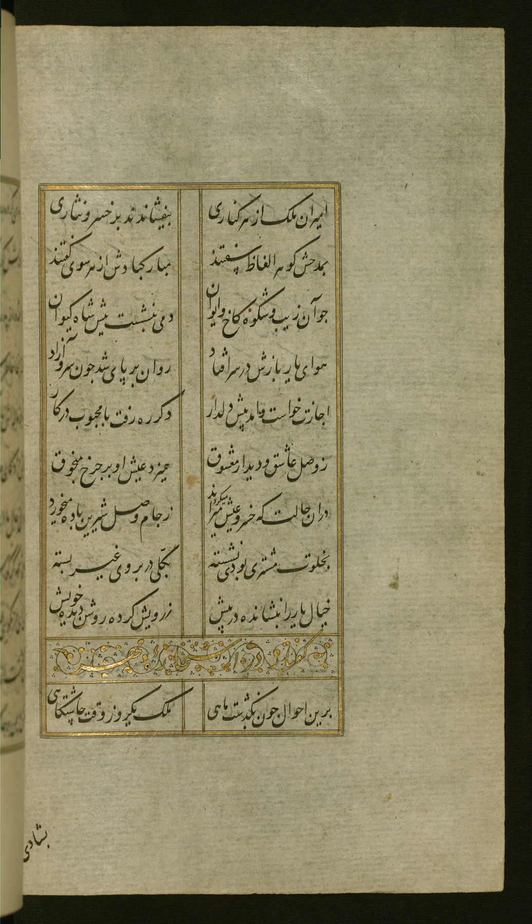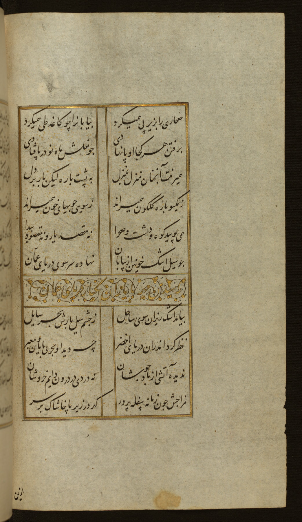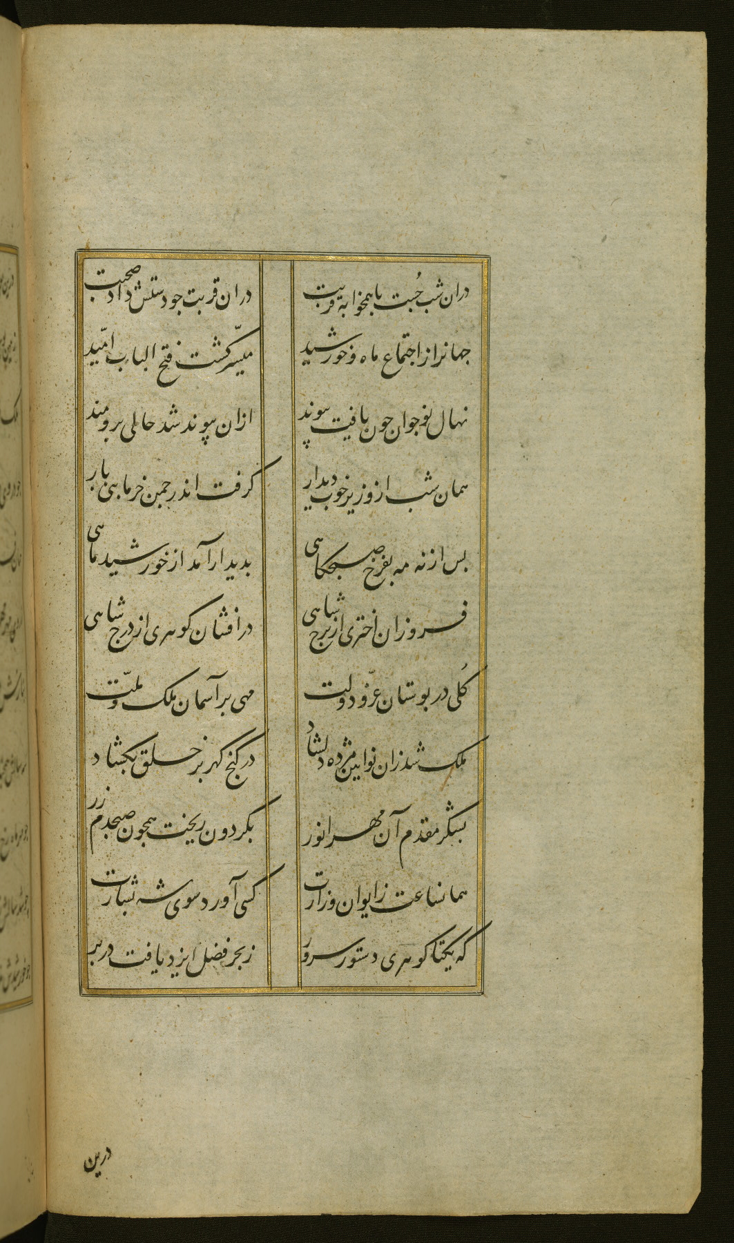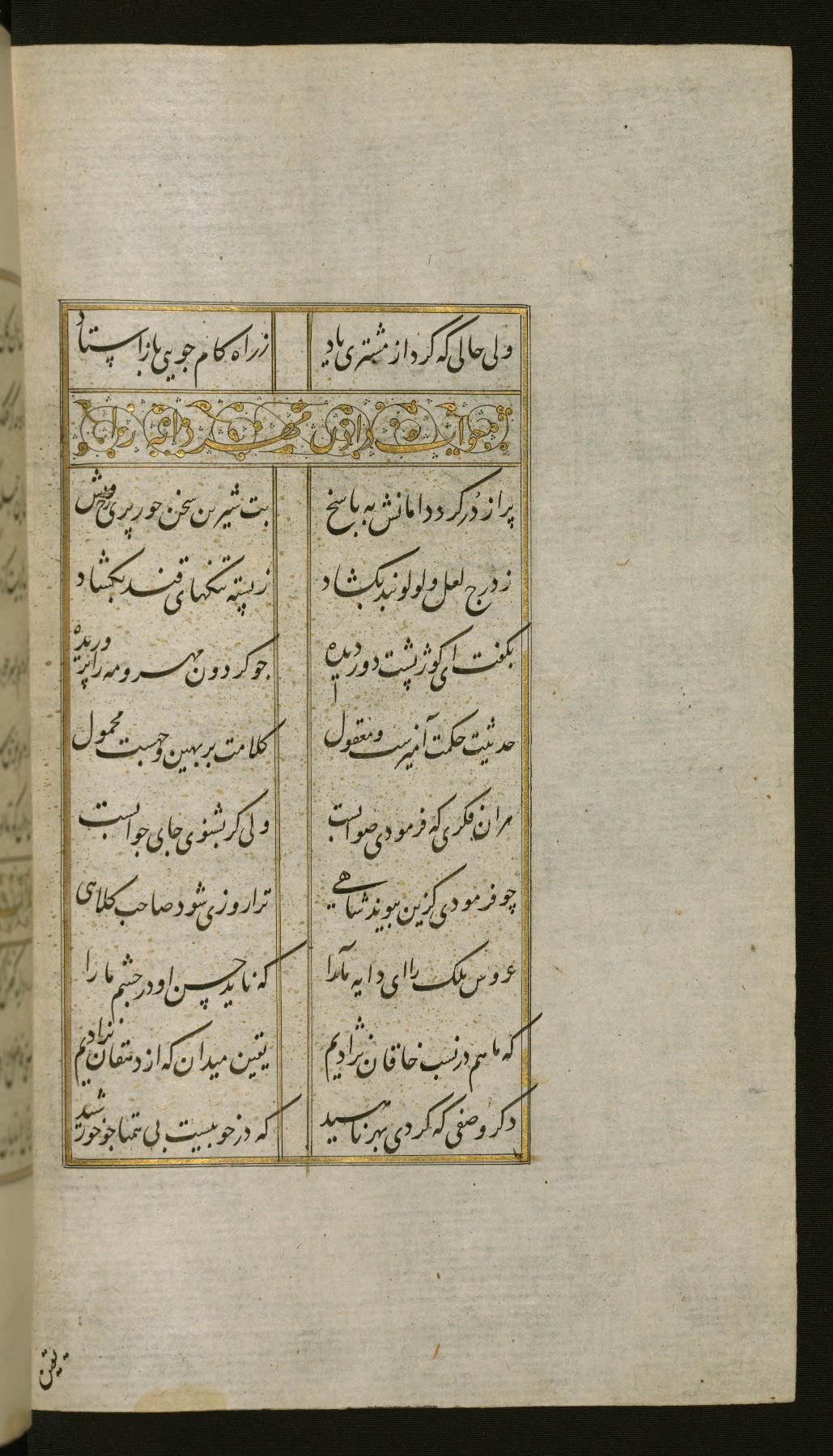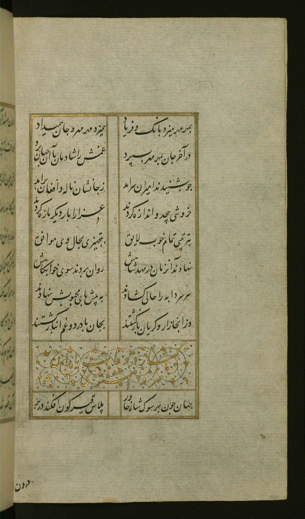 This manuscript is an illustrated copy of the well-known poem recounting the platonic love story between Mihr (the Sun), the son of Shāhpūr, and his vizier's son Mushtarī (Jupiter). The story of 90 chapters was composed by Muḥammad ibn Aḥmad ‘Aṣṣār Tabrīzī (d. 784 AH / 1382 CE). The present copy was written in nasta‘līq script by Murshid al-Kātib in 881 AH / 1476 CE. Considering the number of surviving manuscripts in which this calligrapher’s name is found, it seems he was particularly prolific. The present codex is illustrated with nine paintings. The gold-brushed leather binding with doublures of red leather decorated with filigree work is original to the manuscript.