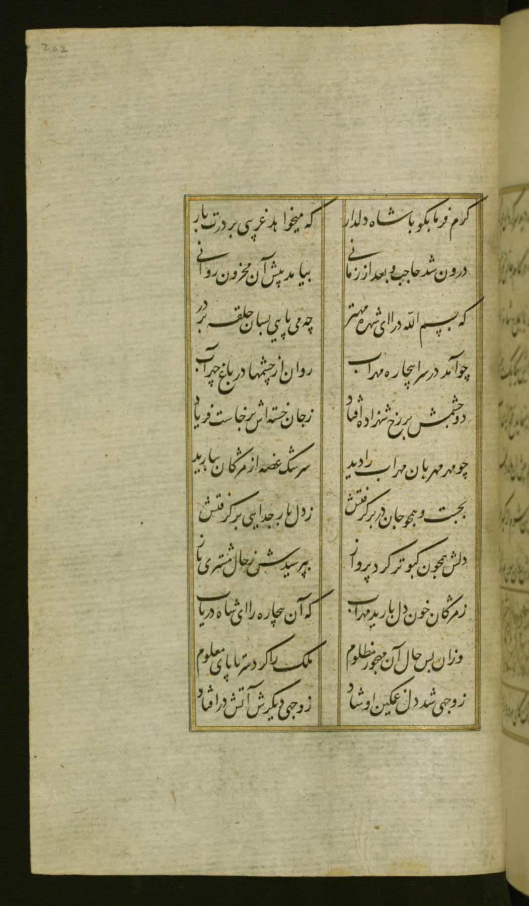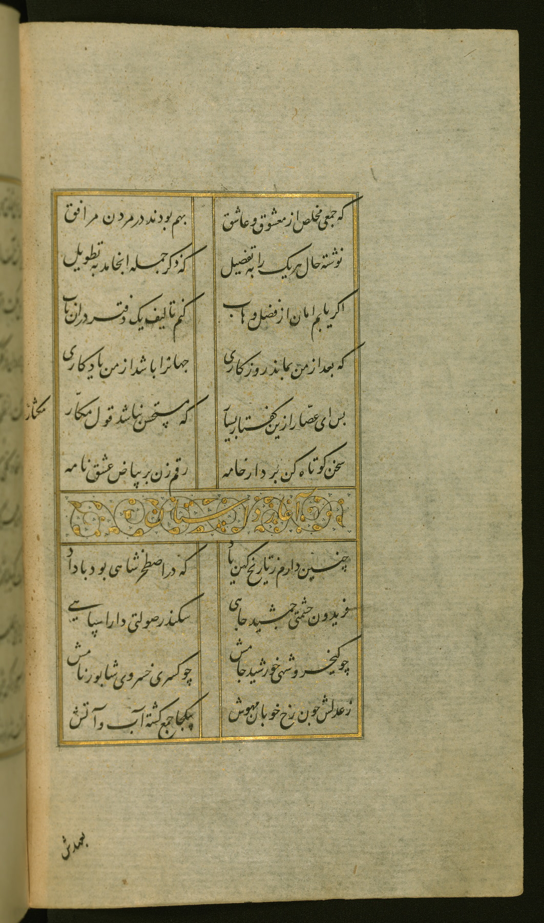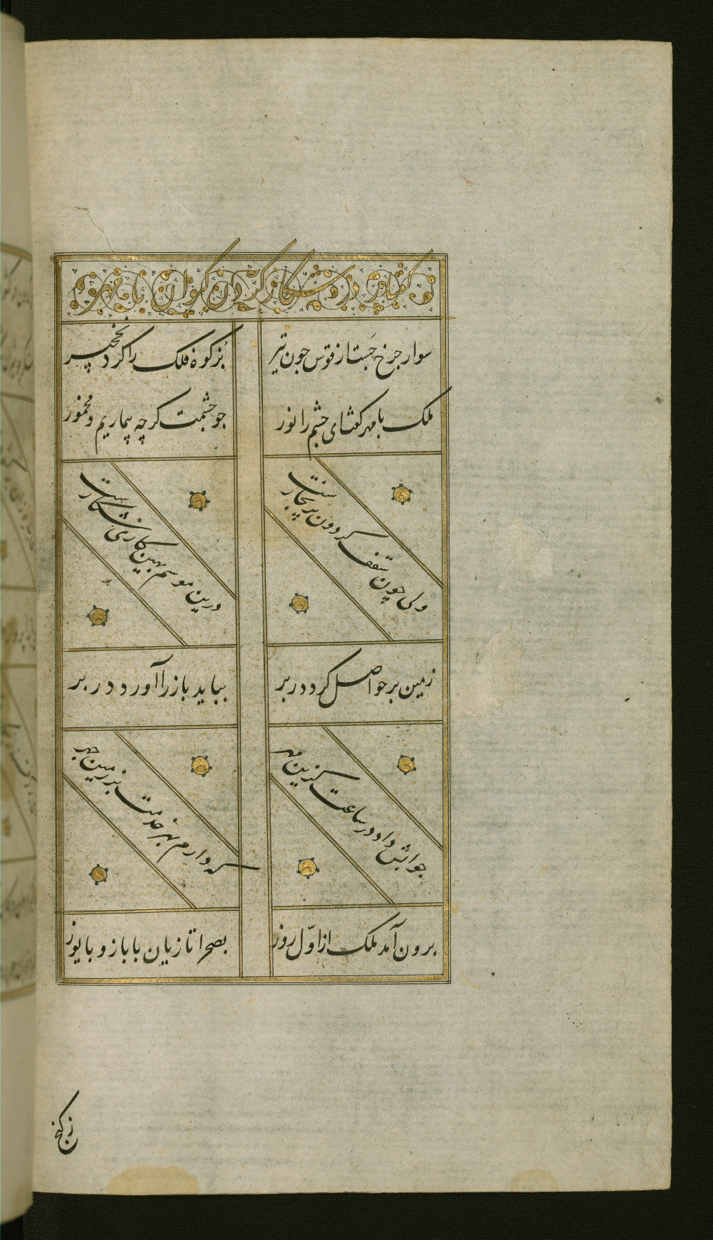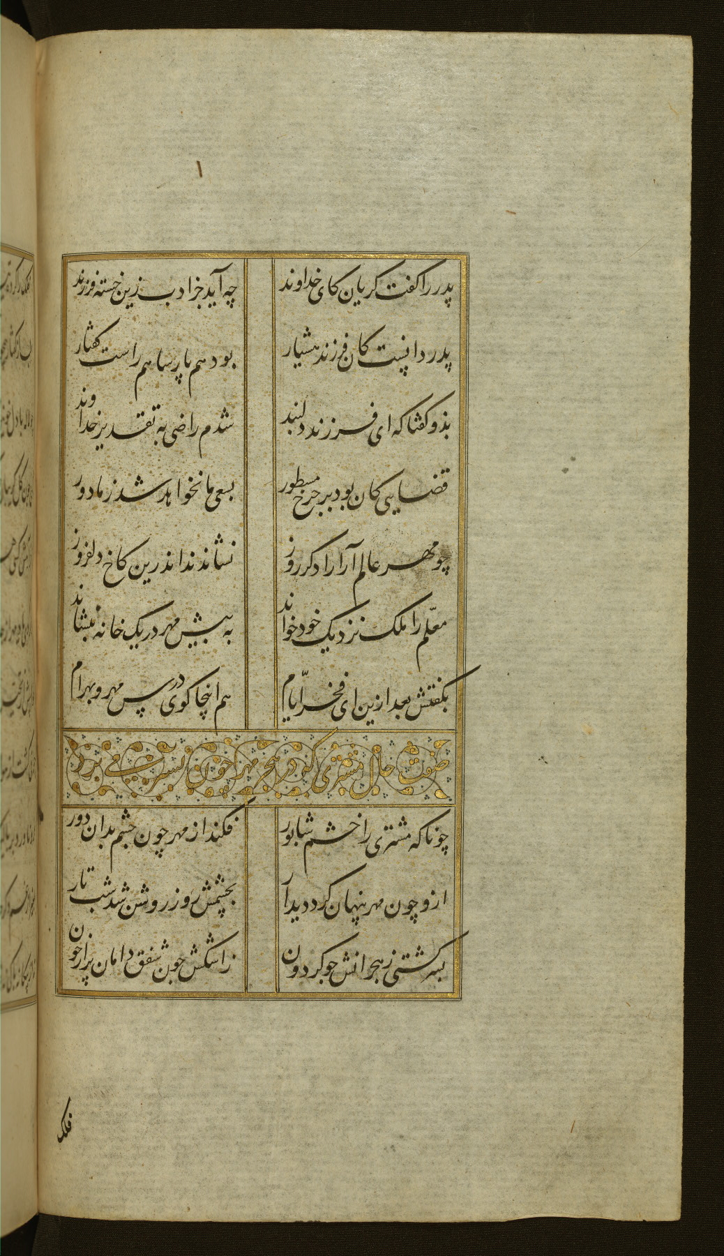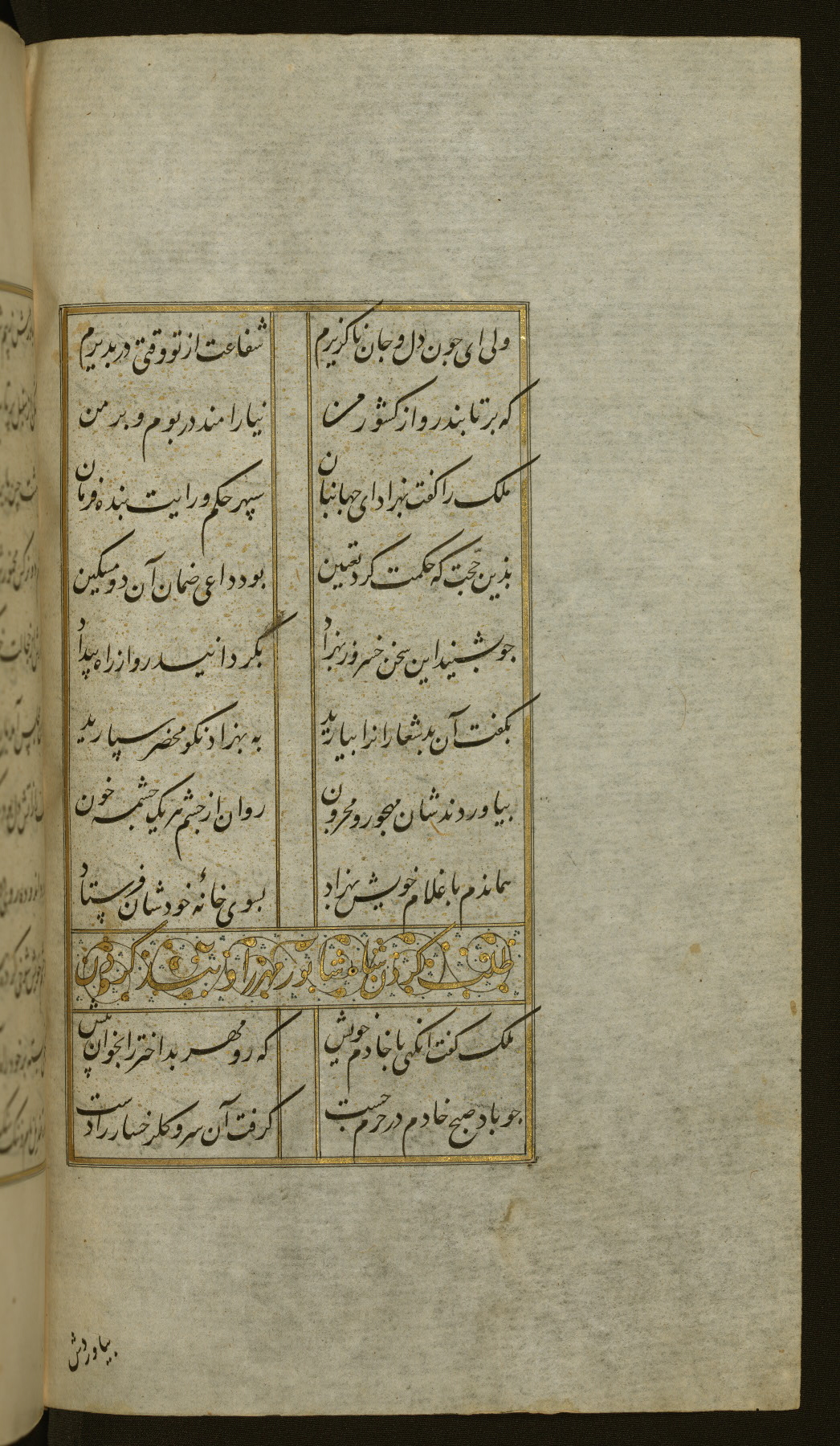 This manuscript is an illustrated copy of the well-known poem recounting the platonic love story between Mihr (the Sun), the son of Shāhpūr, and his vizier's son Mushtarī (Jupiter). The story of 90 chapters was composed by Muḥammad ibn Aḥmad ‘Aṣṣār Tabrīzī (d. 784 AH / 1382 CE). The present copy was written in nasta‘līq script by Murshid al-Kātib in 881 AH / 1476 CE. Considering the number of surviving manuscripts in which this calligrapher’s name is found, it seems he was particularly prolific. The present codex is illustrated with nine paintings. The gold-brushed leather binding with doublures of red leather decorated with filigree work is original to the manuscript.