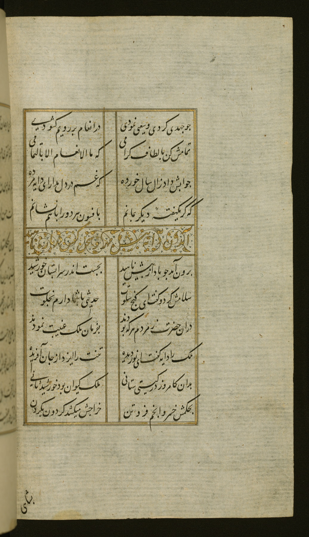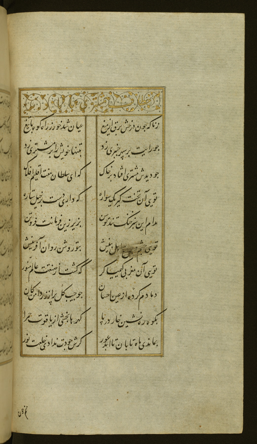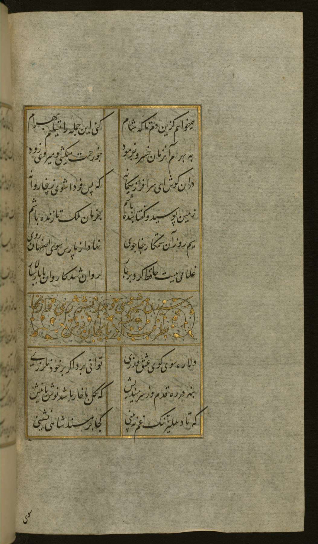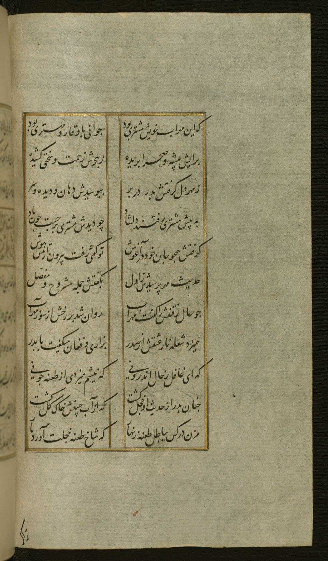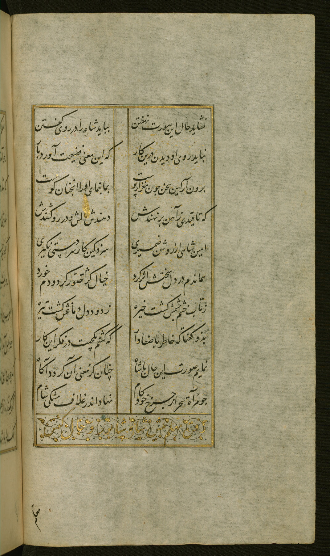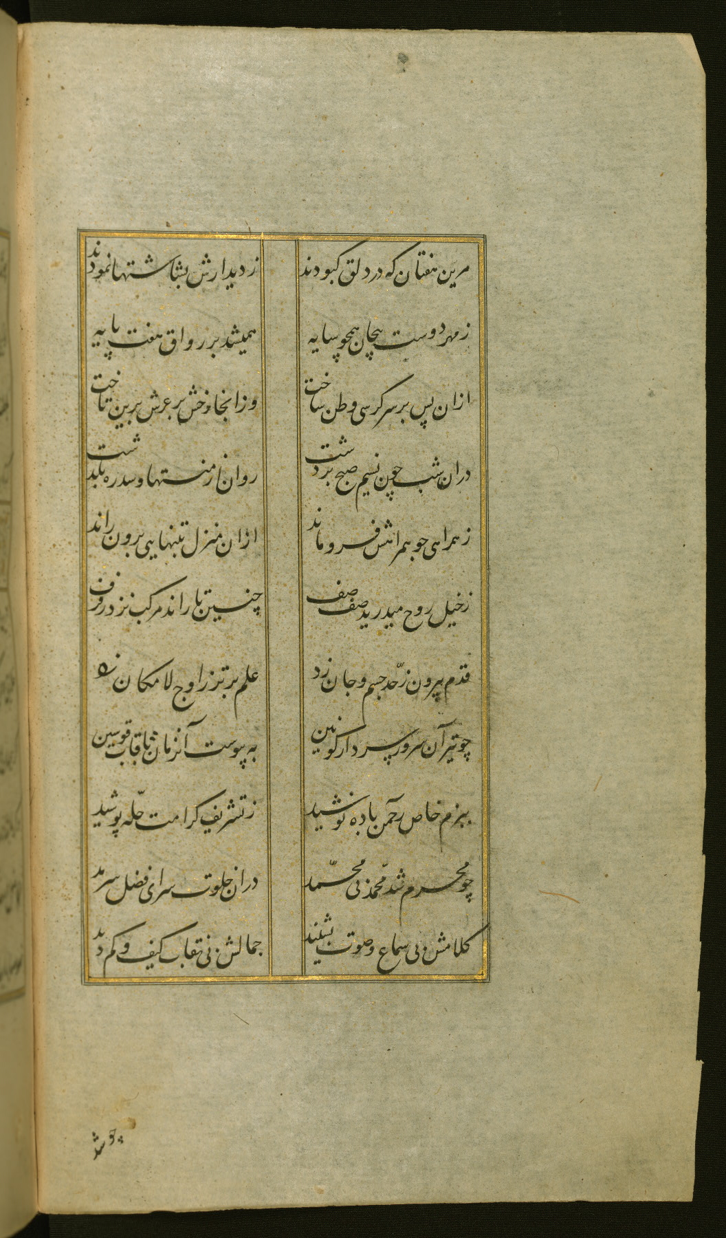This manuscript is an illustrated copy of the well-known poem recounting the platonic love story between Mihr (the Sun), the son of Shāhpūr, and his vizier's son Mushtarī (Jupiter). The story of 90 chapters was composed by Muḥammad ibn Aḥmad ‘Aṣṣār Tabrīzī (d. 784 AH / 1382 CE). The present copy was written in nasta‘līq script by Murshid al-Kātib in 881 AH / 1476 CE. Considering the number of surviving manuscripts in which this calligrapher’s name is found, it seems he was particularly prolific. The present codex is illustrated with nine paintings. The gold-brushed leather binding with doublures of red leather decorated with filigree work is original to the manuscript.