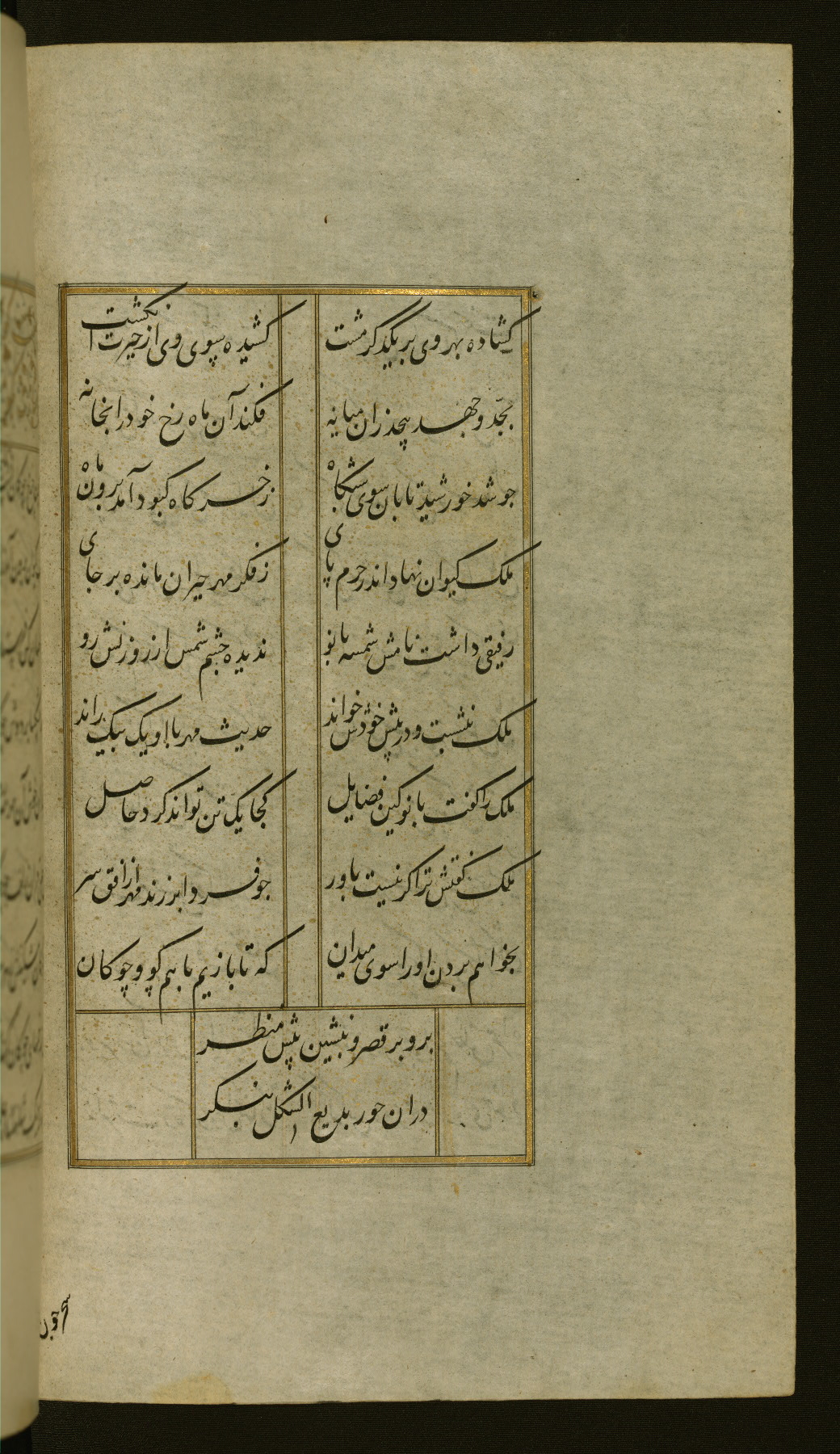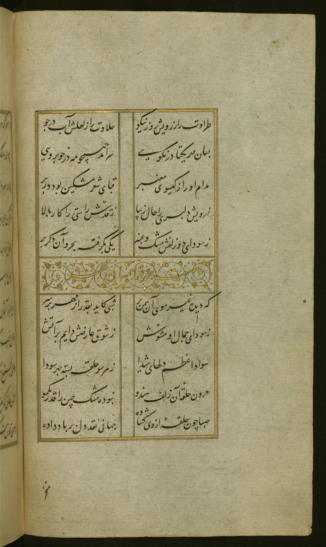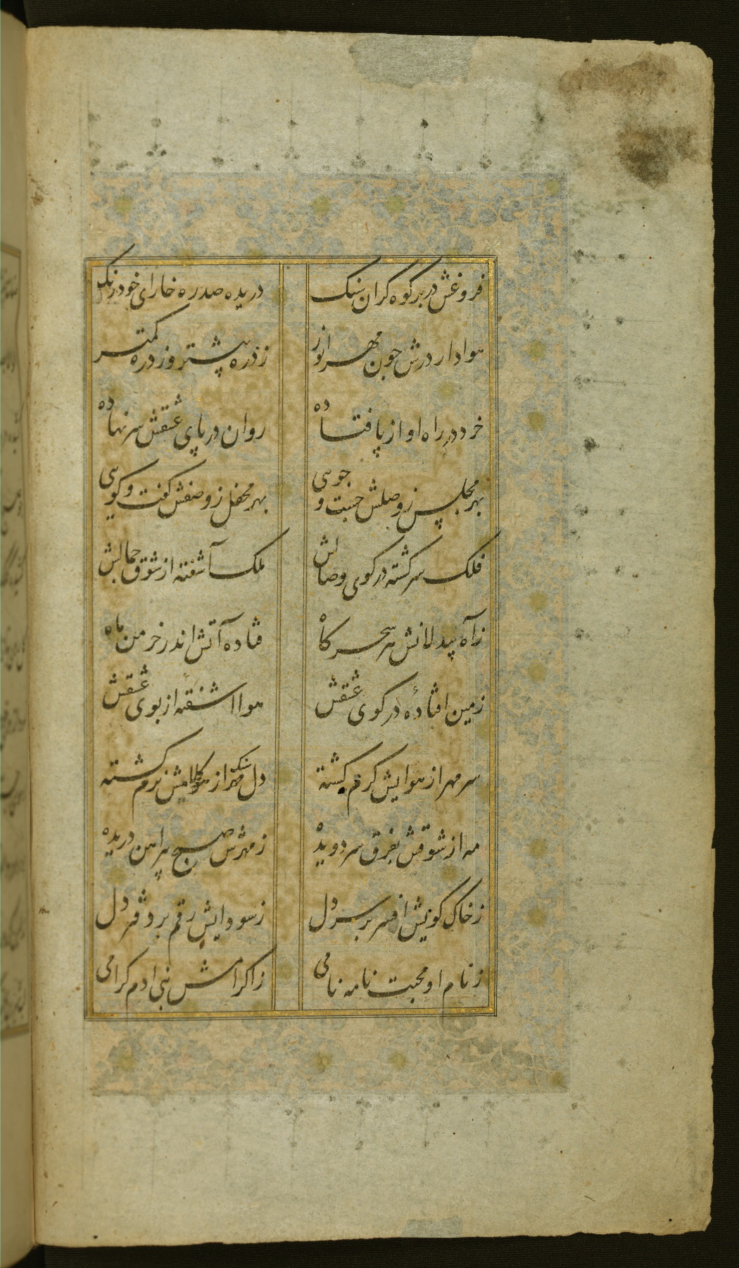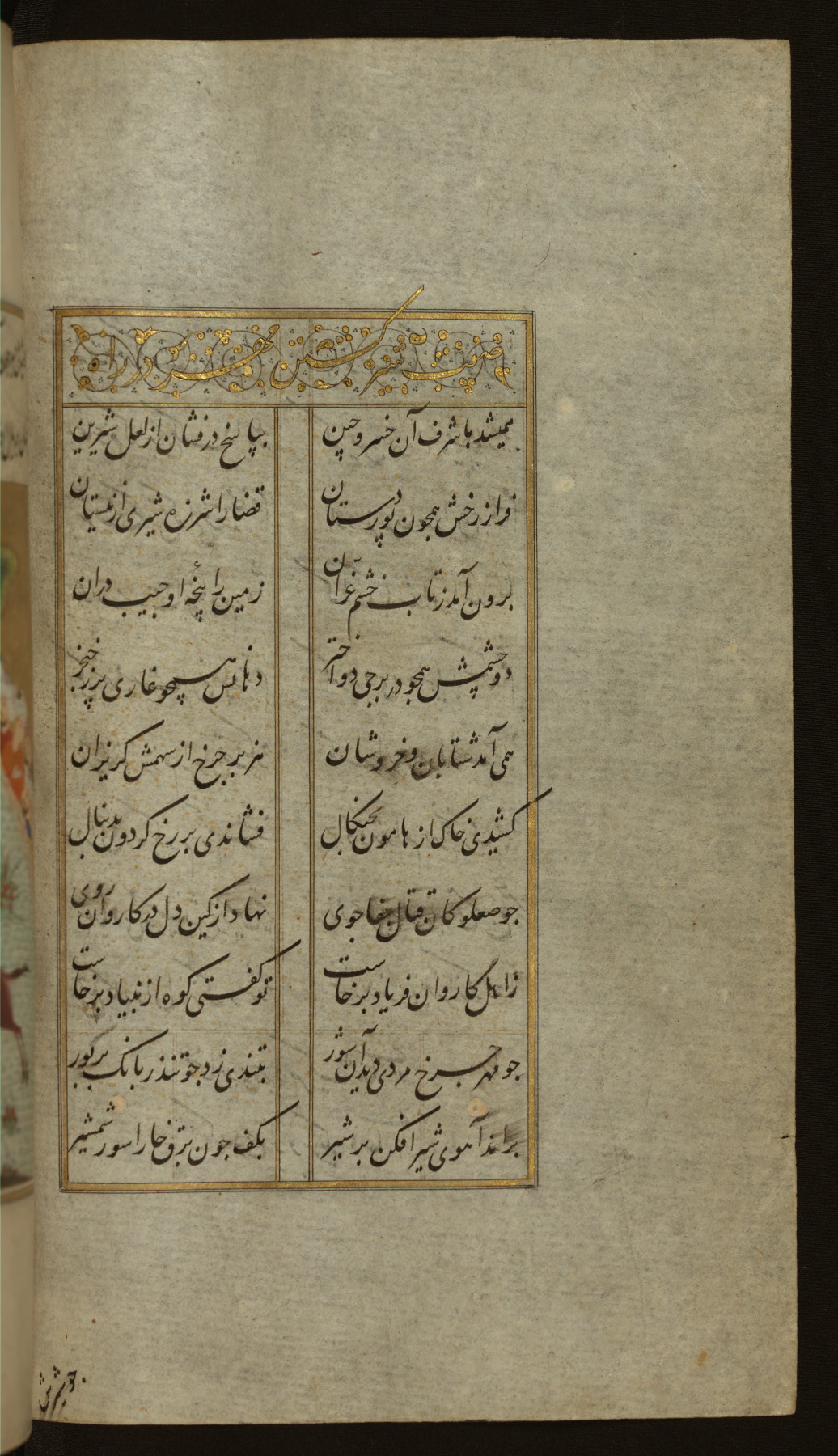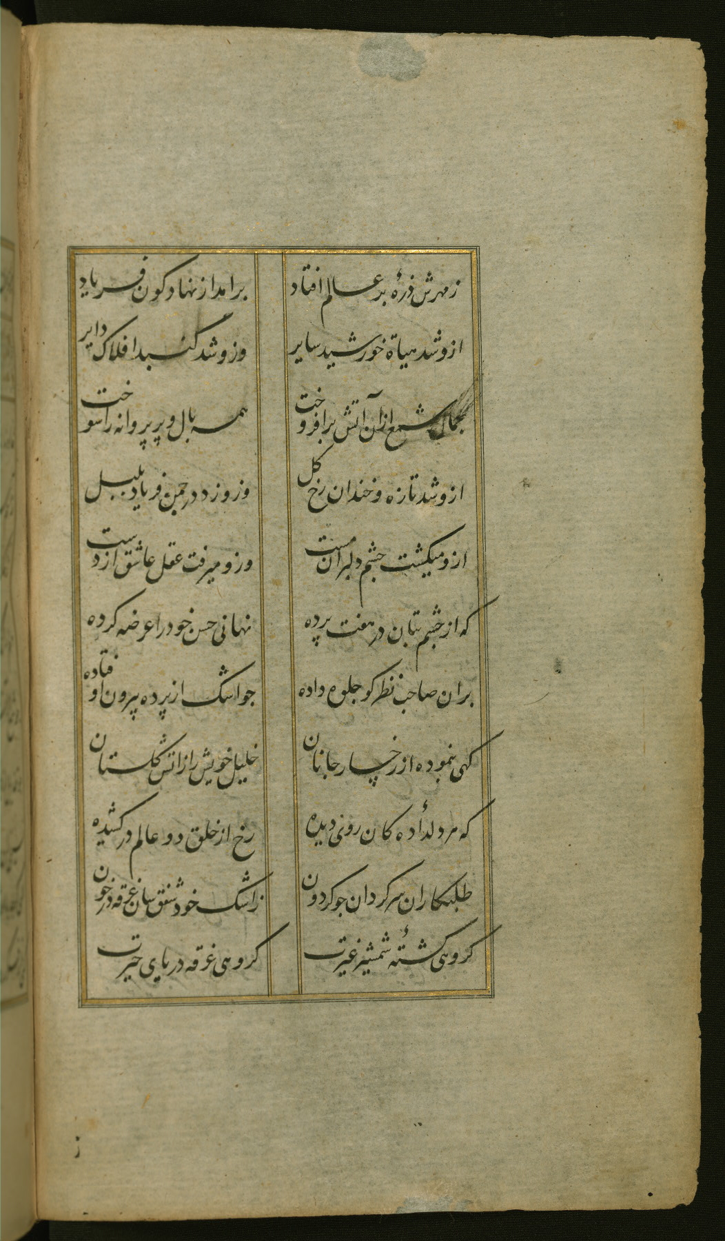 This manuscript is an illustrated copy of the well-known poem recounting the platonic love story between Mihr (the Sun), the son of Shāhpūr, and his vizier's son Mushtarī (Jupiter). The story of 90 chapters was composed by Muḥammad ibn Aḥmad ‘Aṣṣār Tabrīzī (d. 784 AH / 1382 CE). The present copy was written in nasta‘līq script by Murshid al-Kātib in 881 AH / 1476 CE. Considering the number of surviving manuscripts in which this calligrapher’s name is found, it seems he was particularly prolific. The present codex is illustrated with nine paintings. The gold-brushed leather binding with doublures of red leather decorated with filigree work is original to the manuscript.