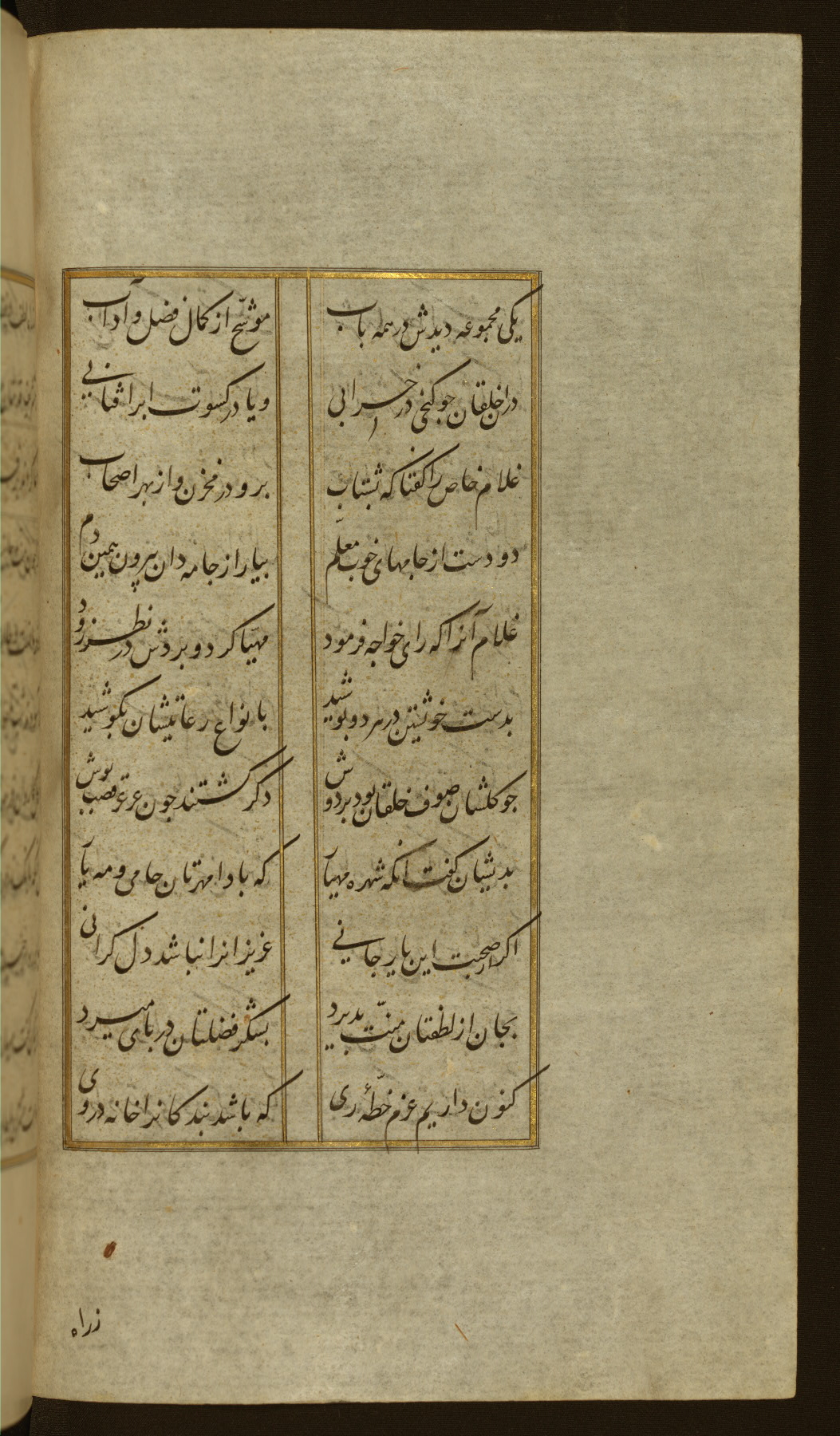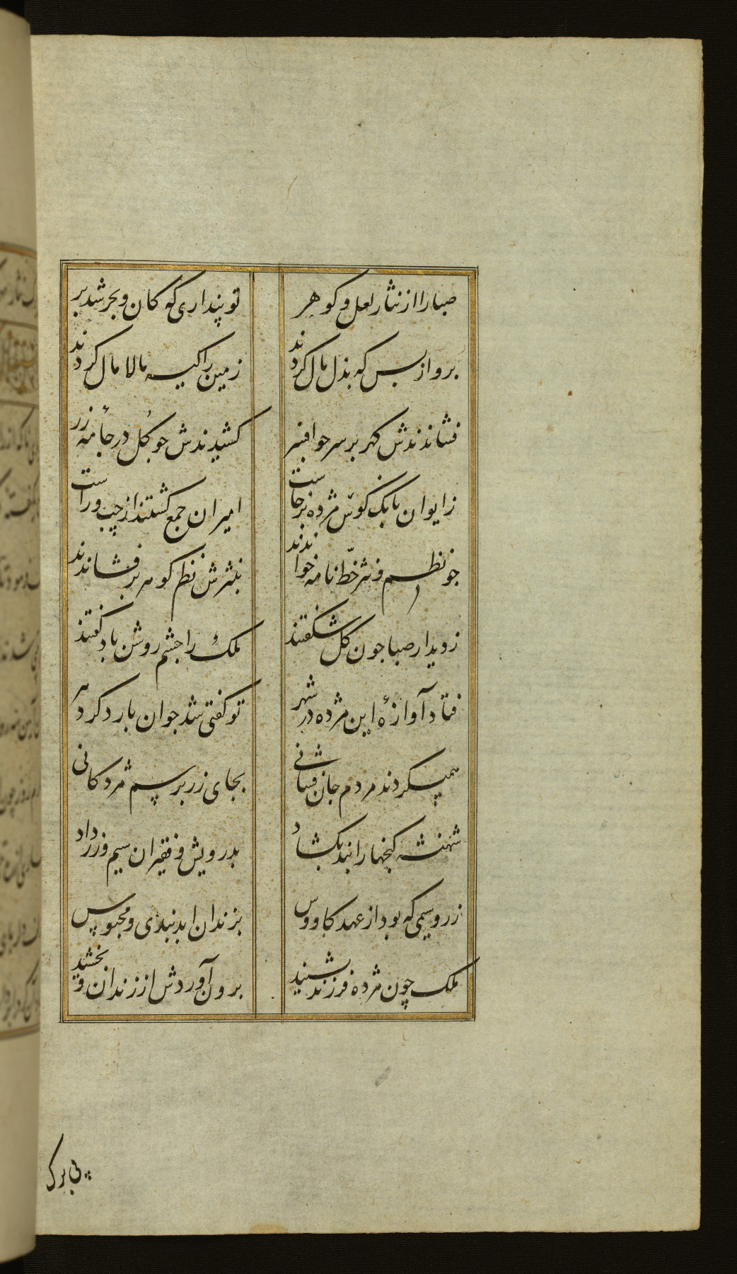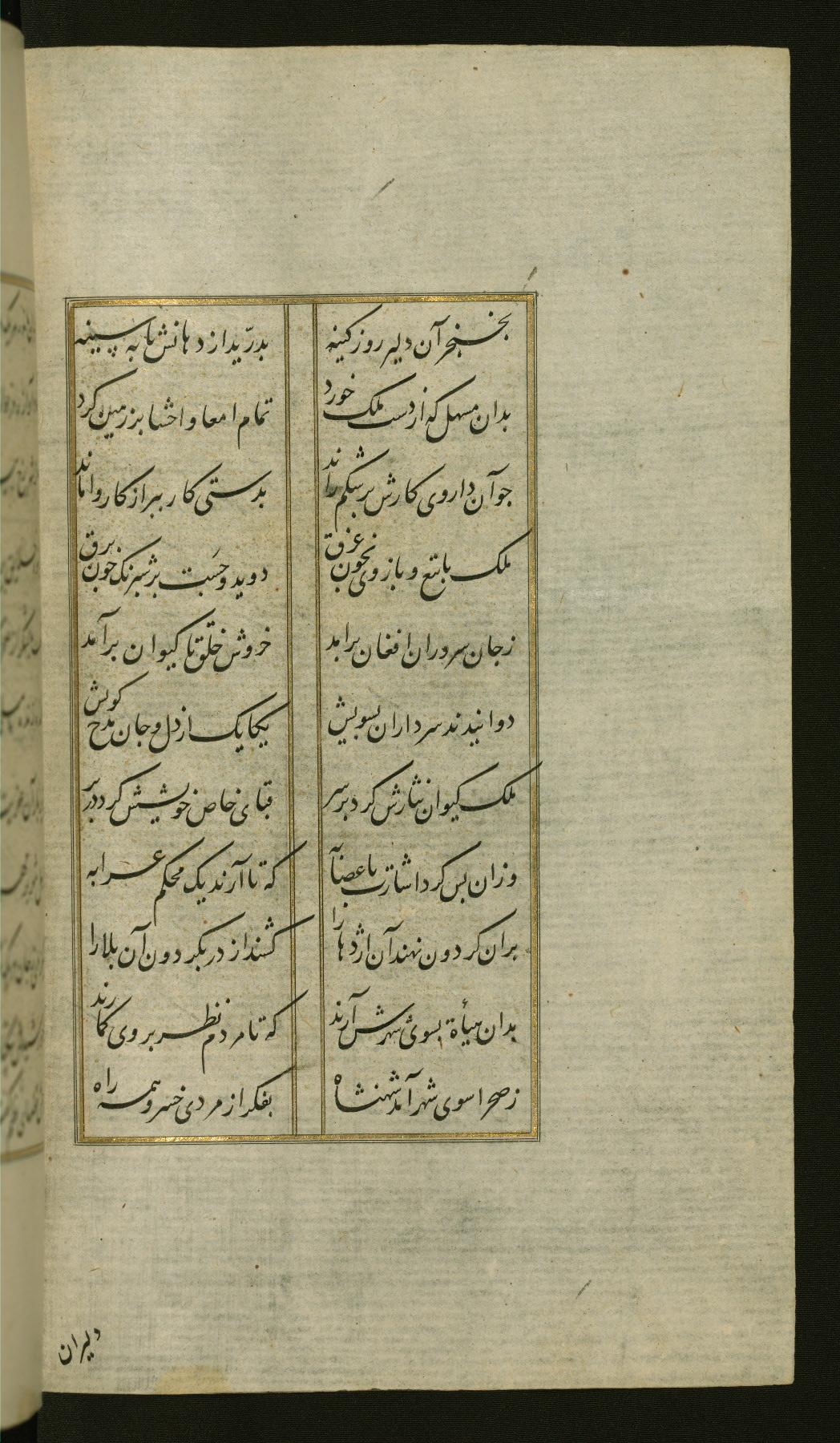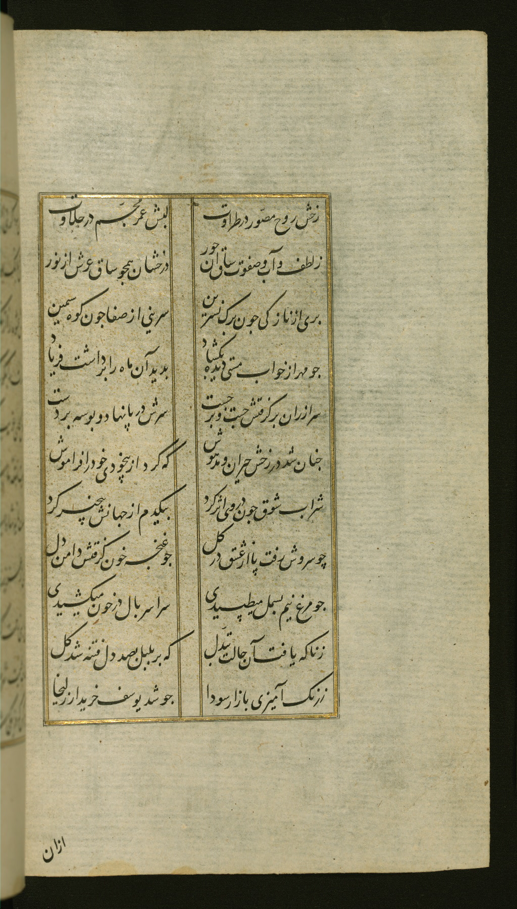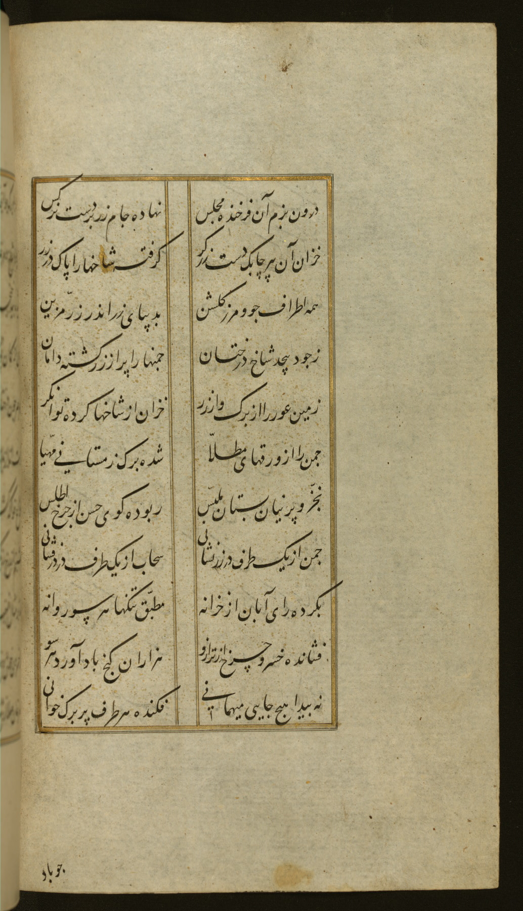 This manuscript is an illustrated copy of the well-known poem recounting the platonic love story between Mihr (the Sun), the son of Shāhpūr, and his vizier's son Mushtarī (Jupiter). The story of 90 chapters was composed by Muḥammad ibn Aḥmad ‘Aṣṣār Tabrīzī (d. 784 AH / 1382 CE). The present copy was written in nasta‘līq script by Murshid al-Kātib in 881 AH / 1476 CE. Considering the number of surviving manuscripts in which this calligrapher’s name is found, it seems he was particularly prolific. The present codex is illustrated with nine paintings. The gold-brushed leather binding with doublures of red leather decorated with filigree work is original to the manuscript.