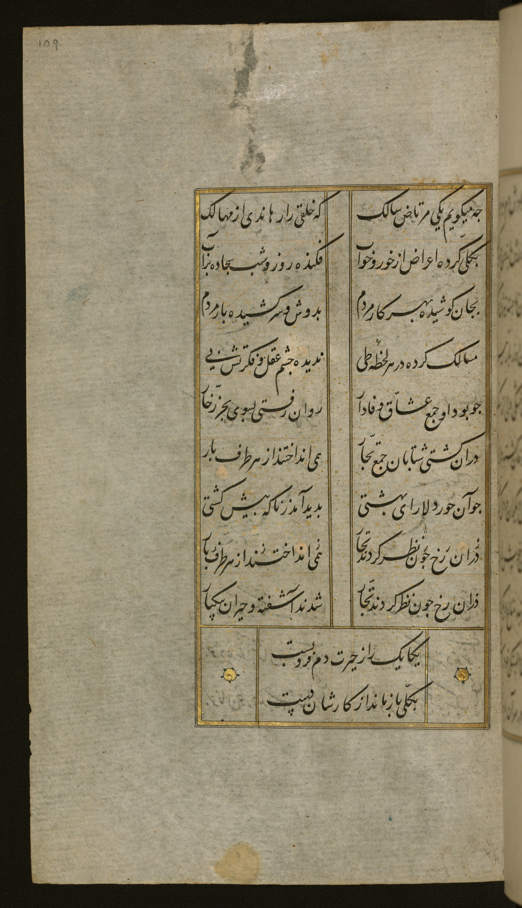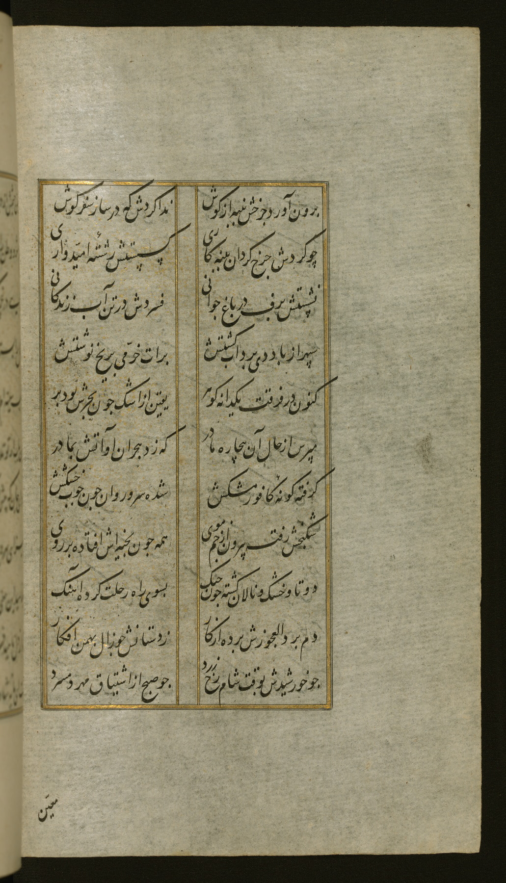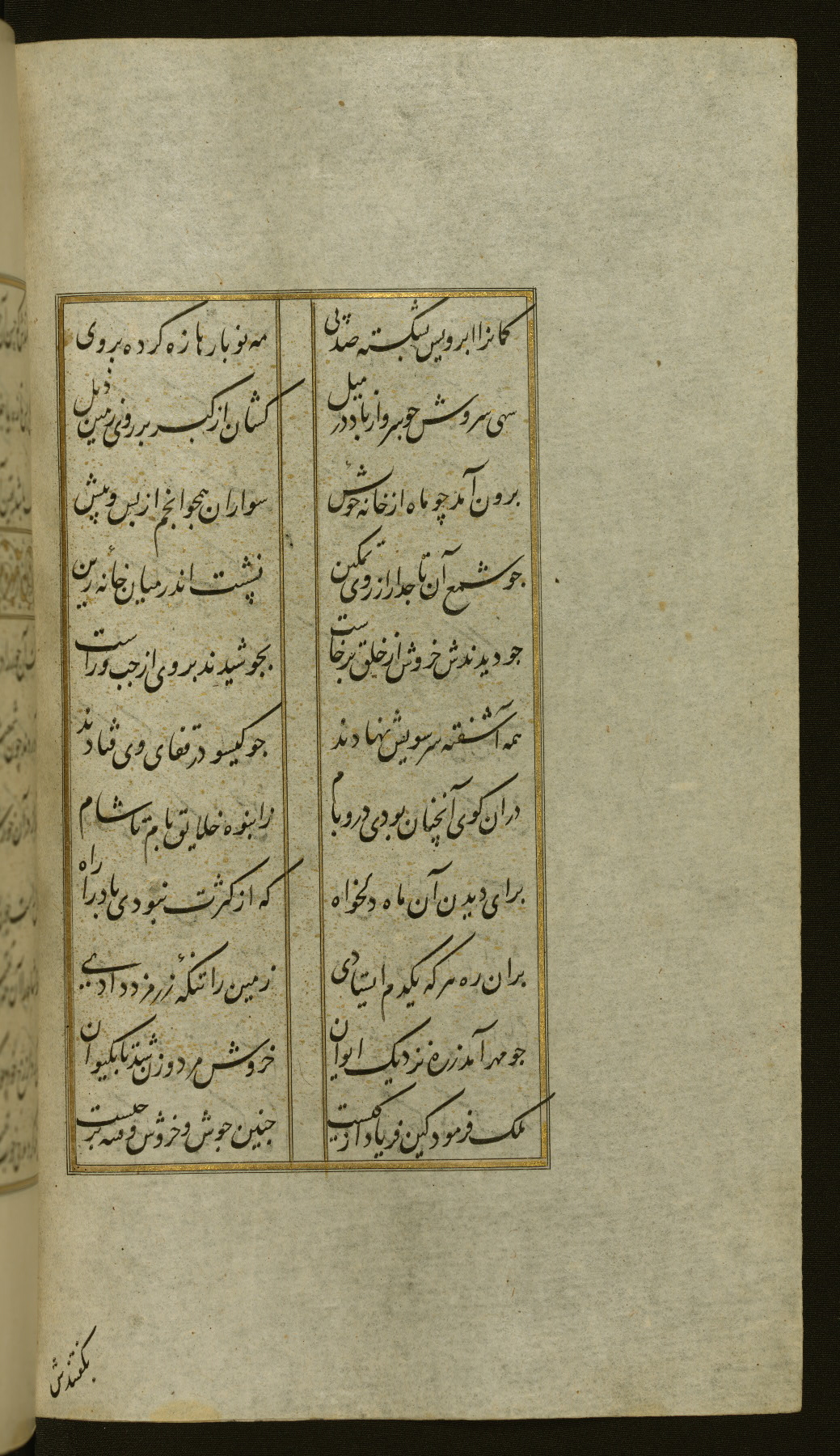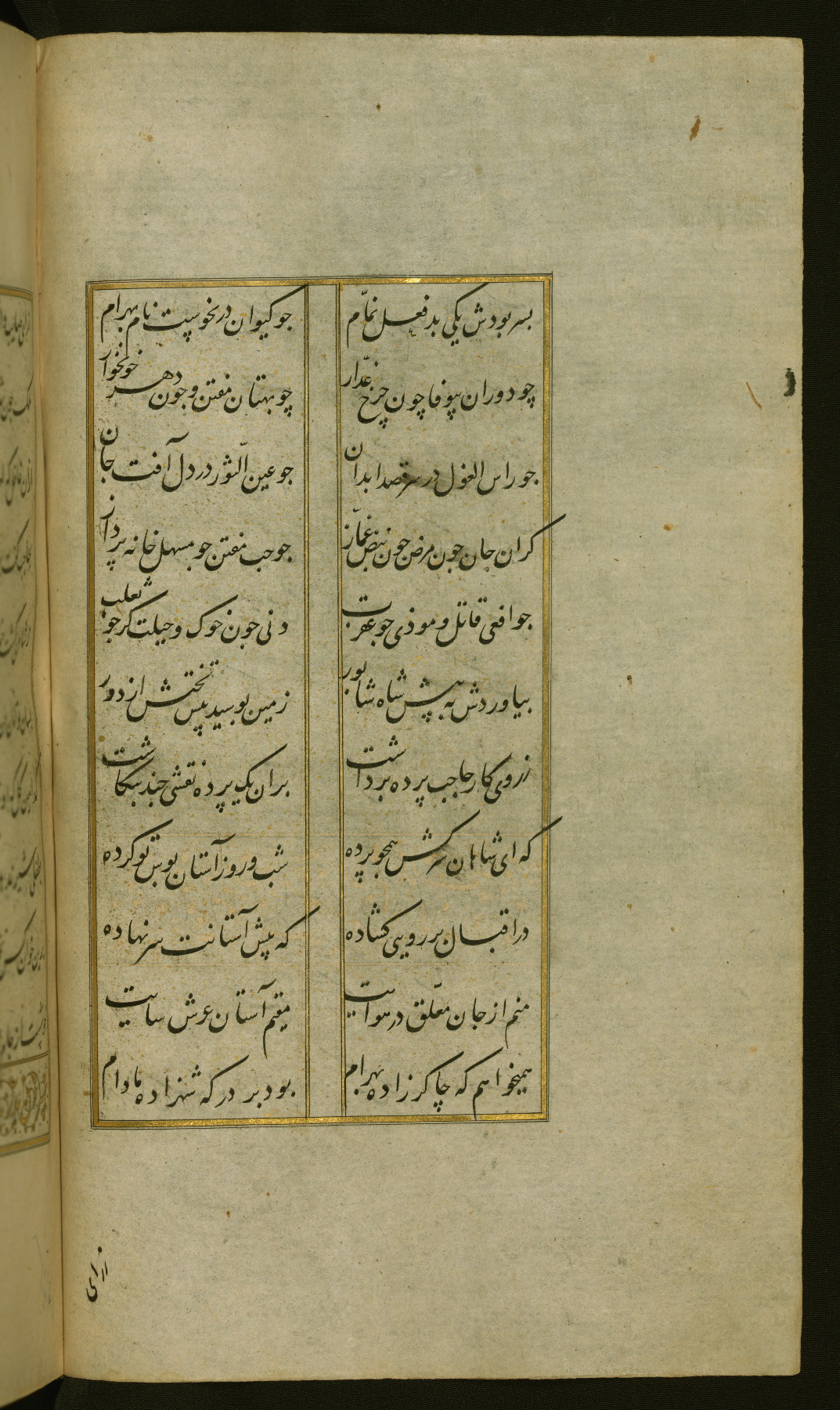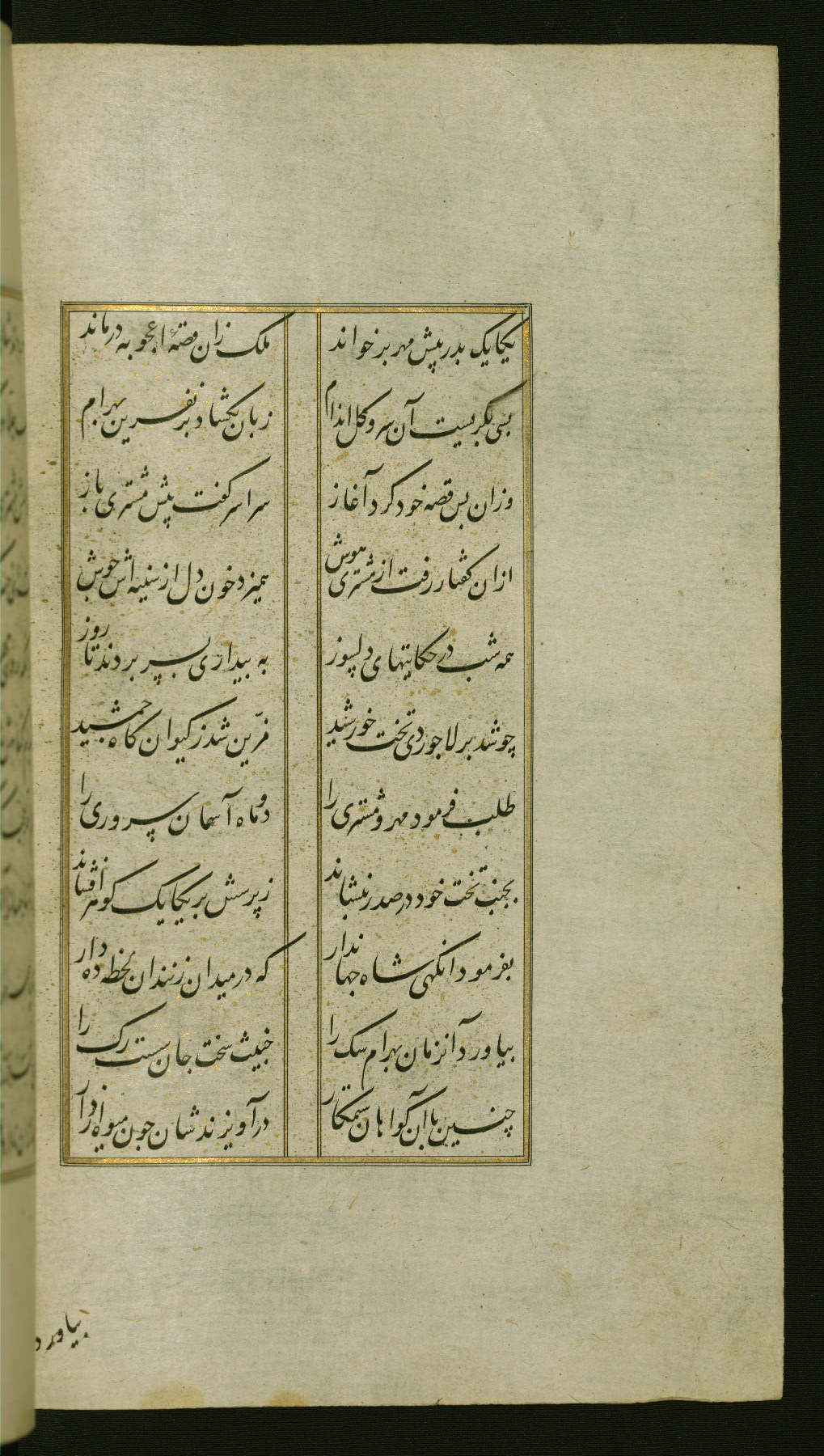 This manuscript is an illustrated copy of the well-known poem recounting the platonic love story between Mihr (the Sun), the son of Shāhpūr, and his vizier's son Mushtarī (Jupiter). The story of 90 chapters was composed by Muḥammad ibn Aḥmad ‘Aṣṣār Tabrīzī (d. 784 AH / 1382 CE). The present copy was written in nasta‘līq script by Murshid al-Kātib in 881 AH / 1476 CE. Considering the number of surviving manuscripts in which this calligrapher’s name is found, it seems he was particularly prolific. The present codex is illustrated with nine paintings. The gold-brushed leather binding with doublures of red leather decorated with filigree work is original to the manuscript.