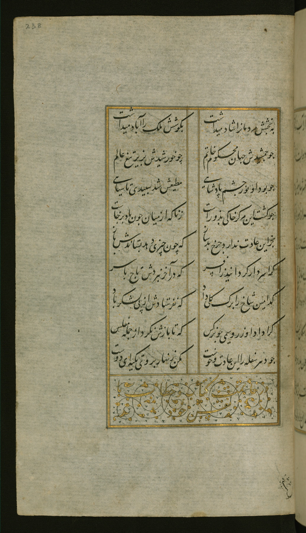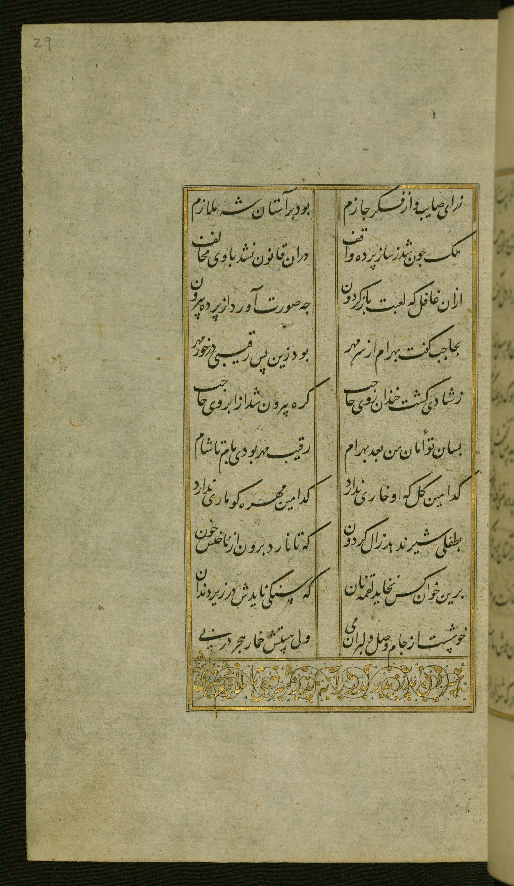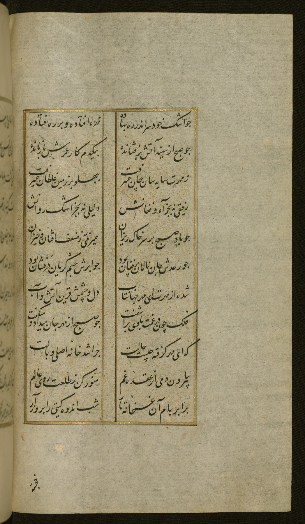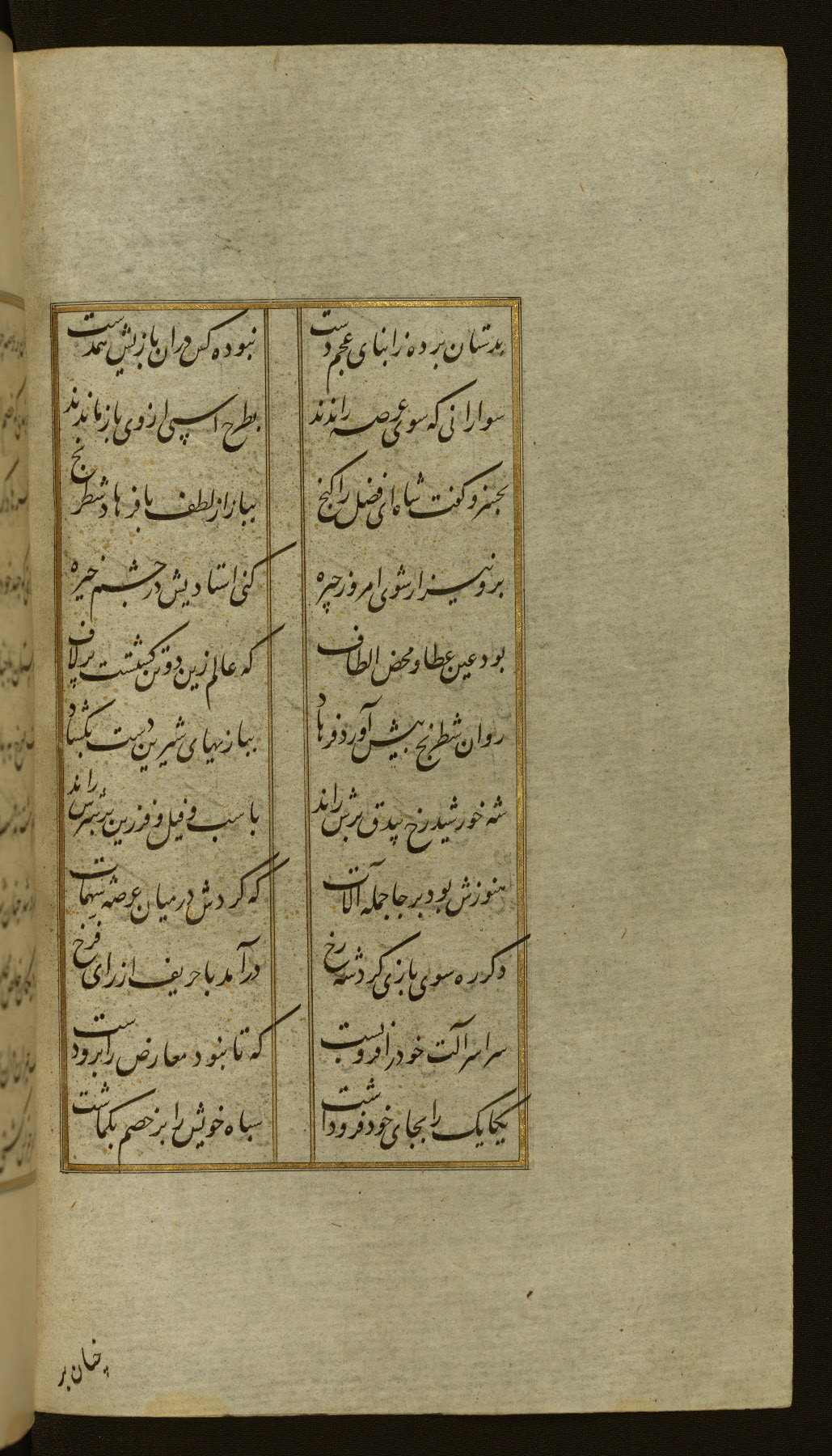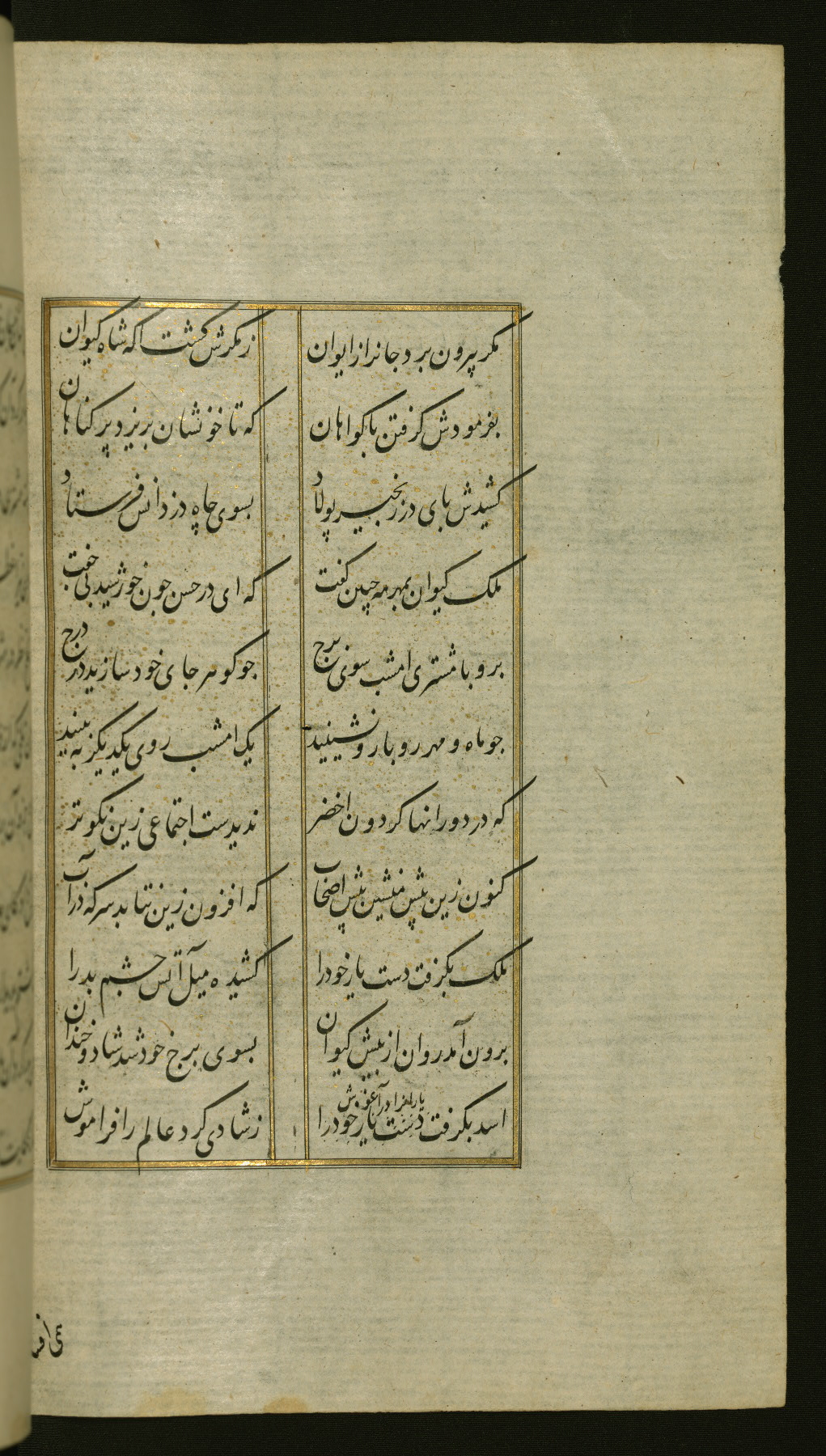 This manuscript is an illustrated copy of the well-known poem recounting the platonic love story between Mihr (the Sun), the son of Shāhpūr, and his vizier's son Mushtarī (Jupiter). The story of 90 chapters was composed by Muḥammad ibn Aḥmad ‘Aṣṣār Tabrīzī (d. 784 AH / 1382 CE). The present copy was written in nasta‘līq script by Murshid al-Kātib in 881 AH / 1476 CE. Considering the number of surviving manuscripts in which this calligrapher’s name is found, it seems he was particularly prolific. The present codex is illustrated with nine paintings. The gold-brushed leather binding with doublures of red leather decorated with filigree work is original to the manuscript.
