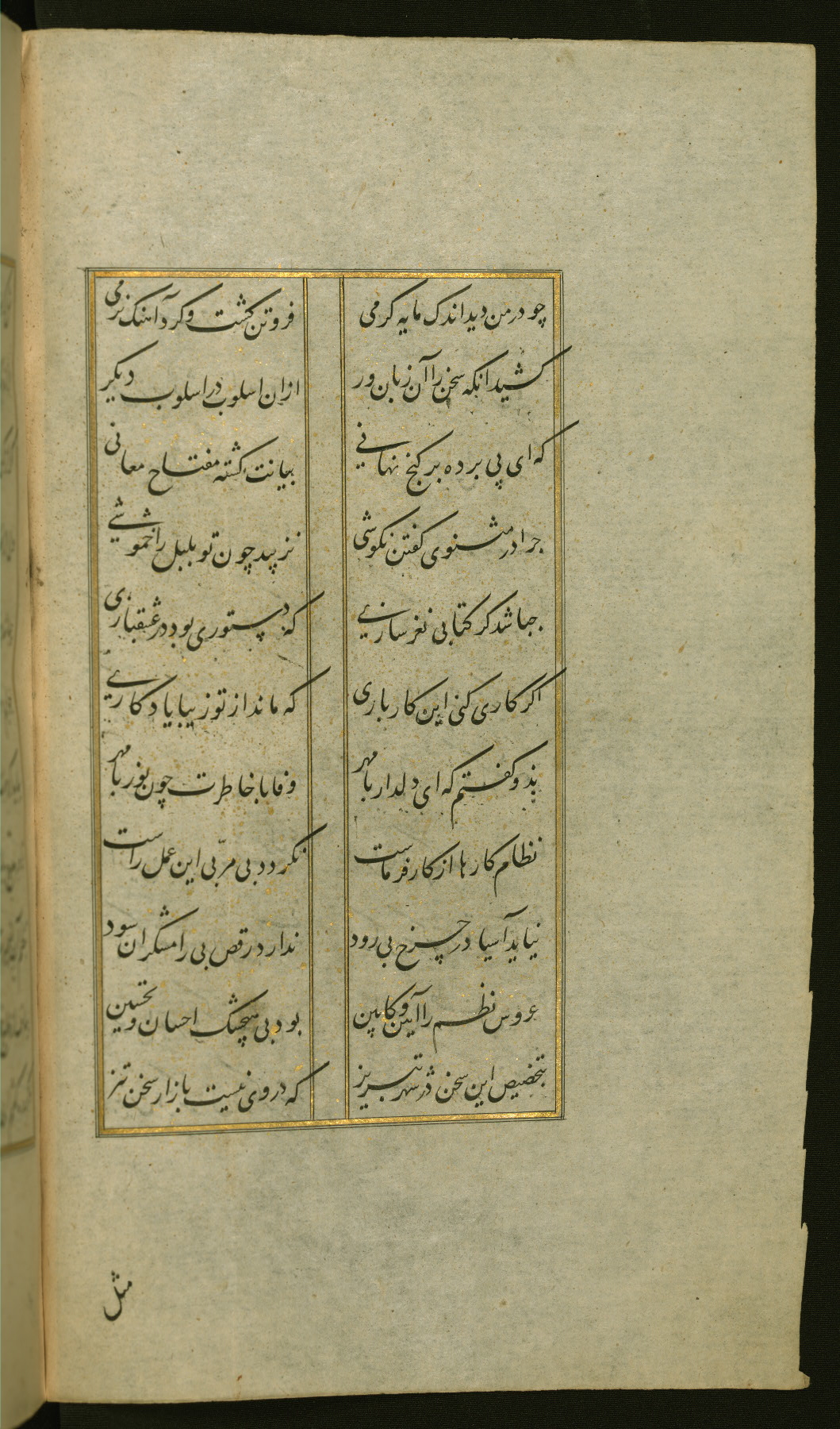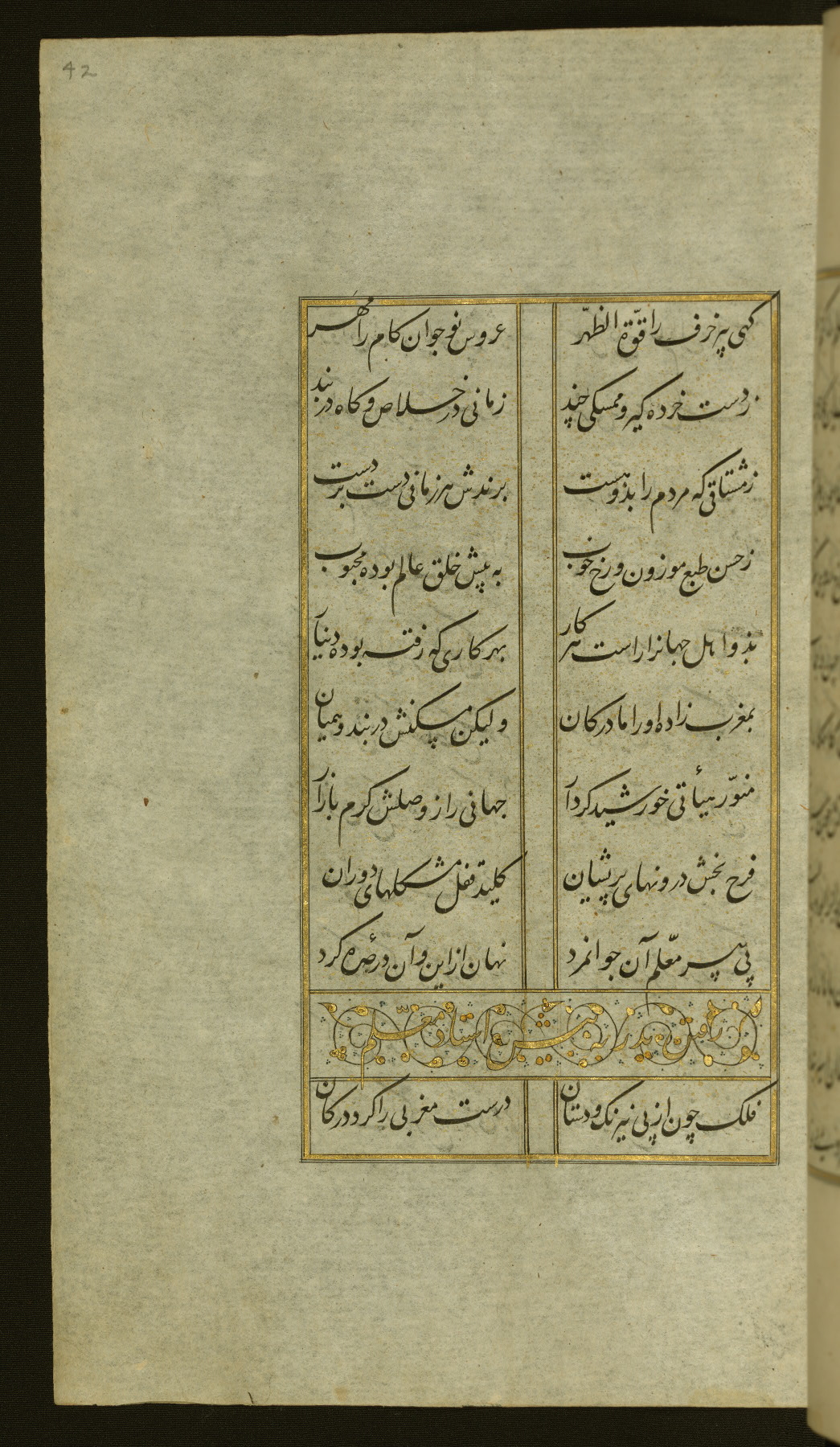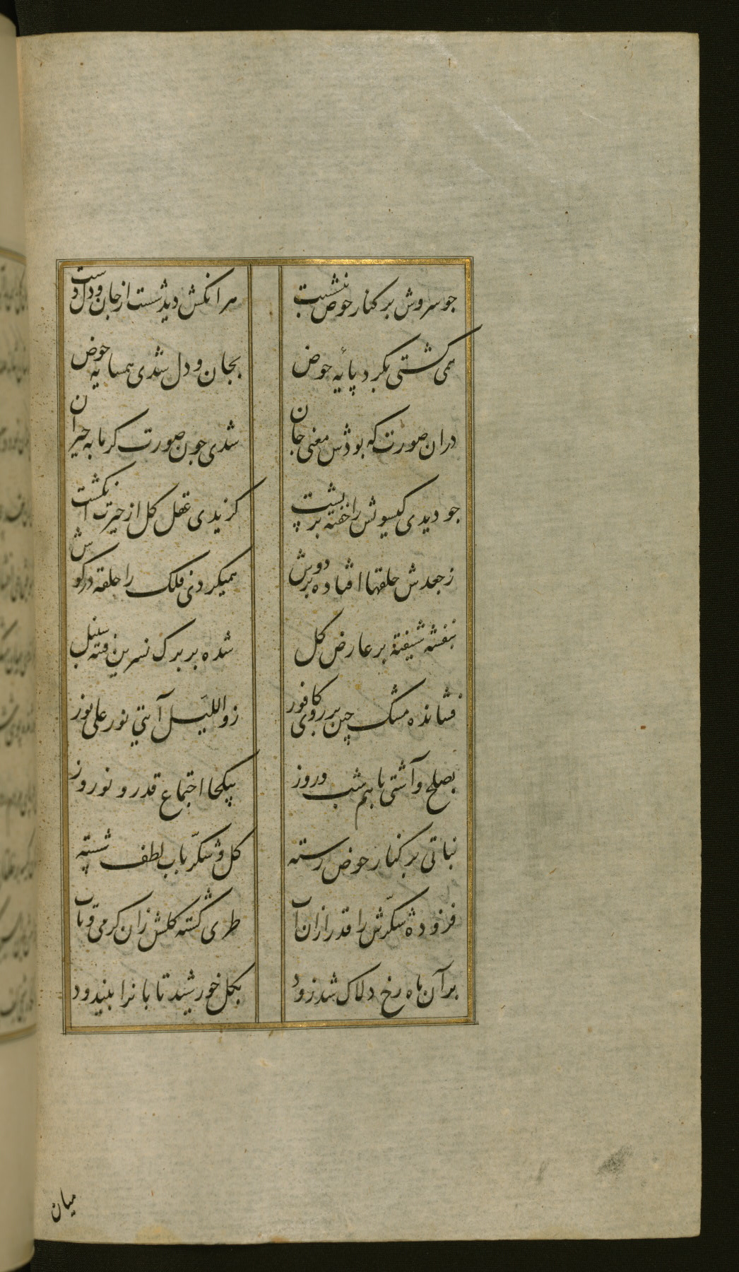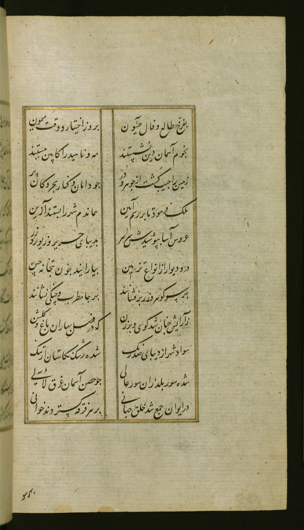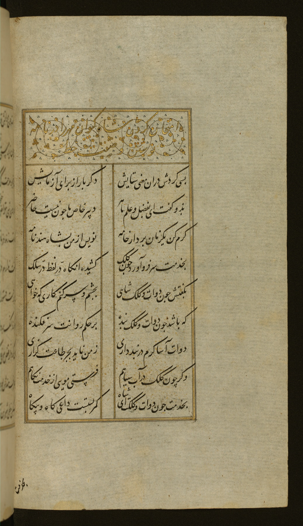 This manuscript is an illustrated copy of the well-known poem recounting the platonic love story between Mihr (the Sun), the son of Shāhpūr, and his vizier's son Mushtarī (Jupiter). The story of 90 chapters was composed by Muḥammad ibn Aḥmad ‘Aṣṣār Tabrīzī (d. 784 AH / 1382 CE). The present copy was written in nasta‘līq script by Murshid al-Kātib in 881 AH / 1476 CE. Considering the number of surviving manuscripts in which this calligrapher’s name is found, it seems he was particularly prolific. The present codex is illustrated with nine paintings. The gold-brushed leather binding with doublures of red leather decorated with filigree work is original to the manuscript.