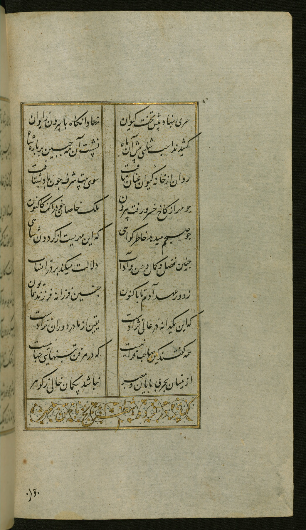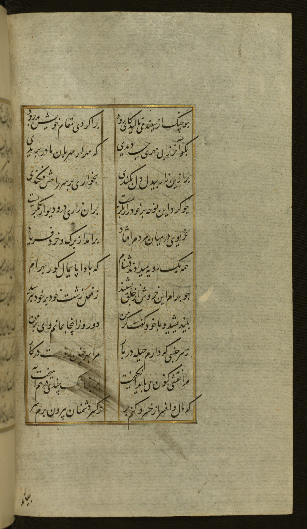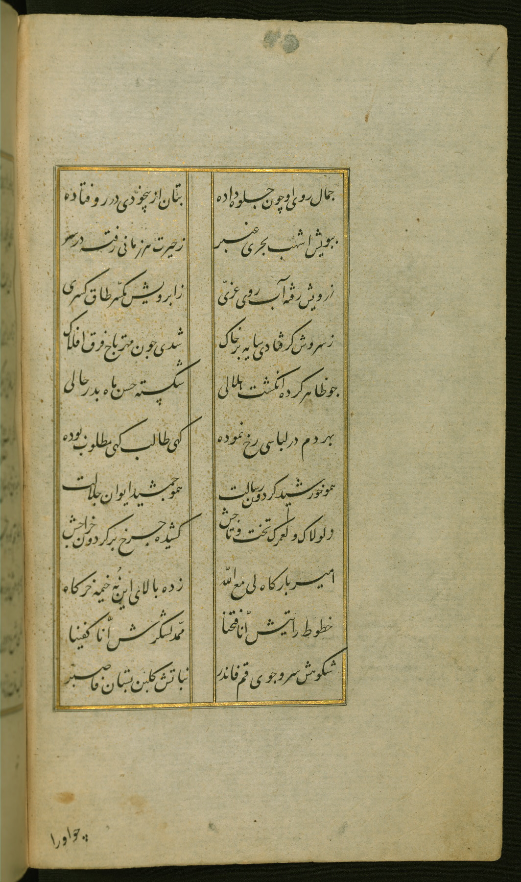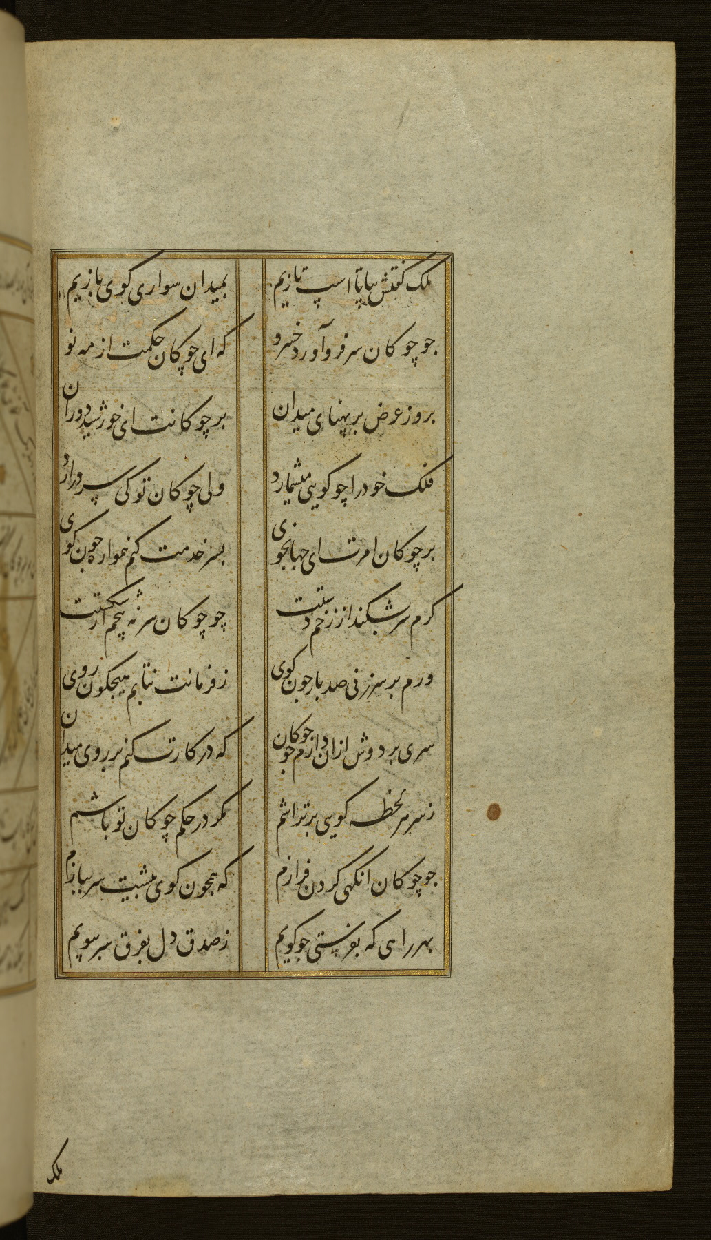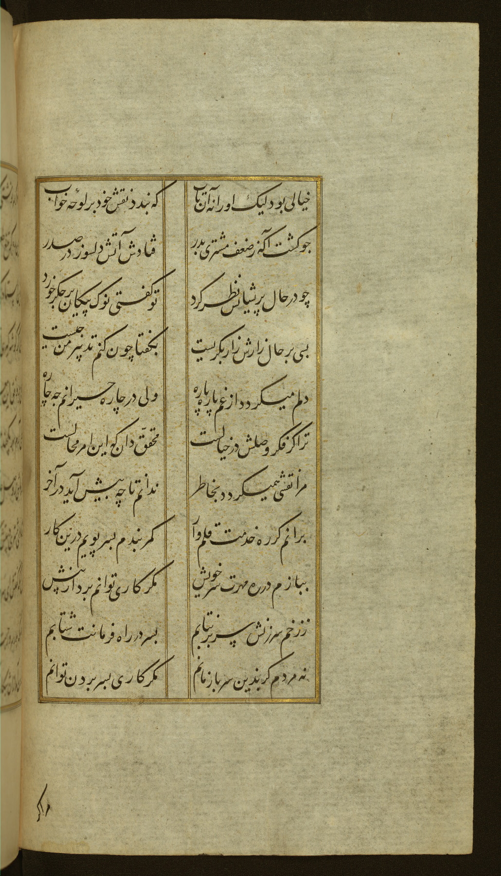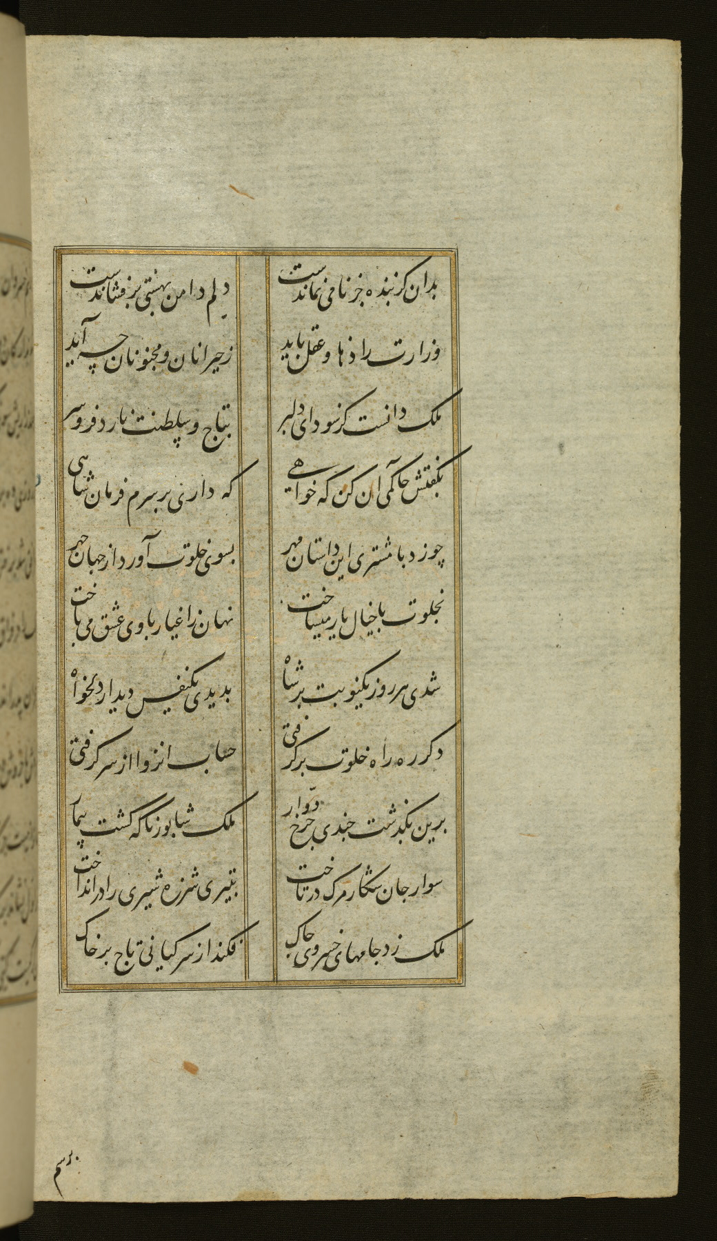 This manuscript is an illustrated copy of the well-known poem recounting the platonic love story between Mihr (the Sun), the son of Shāhpūr, and his vizier's son Mushtarī (Jupiter). The story of 90 chapters was composed by Muḥammad ibn Aḥmad ‘Aṣṣār Tabrīzī (d. 784 AH / 1382 CE). The present copy was written in nasta‘līq script by Murshid al-Kātib in 881 AH / 1476 CE. Considering the number of surviving manuscripts in which this calligrapher’s name is found, it seems he was particularly prolific. The present codex is illustrated with nine paintings. The gold-brushed leather binding with doublures of red leather decorated with filigree work is original to the manuscript.