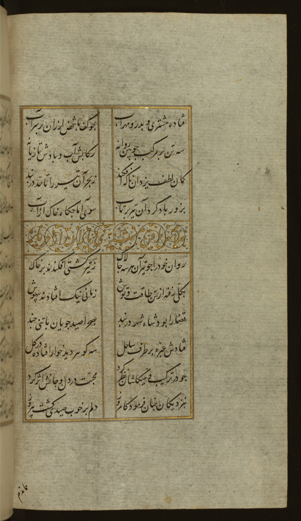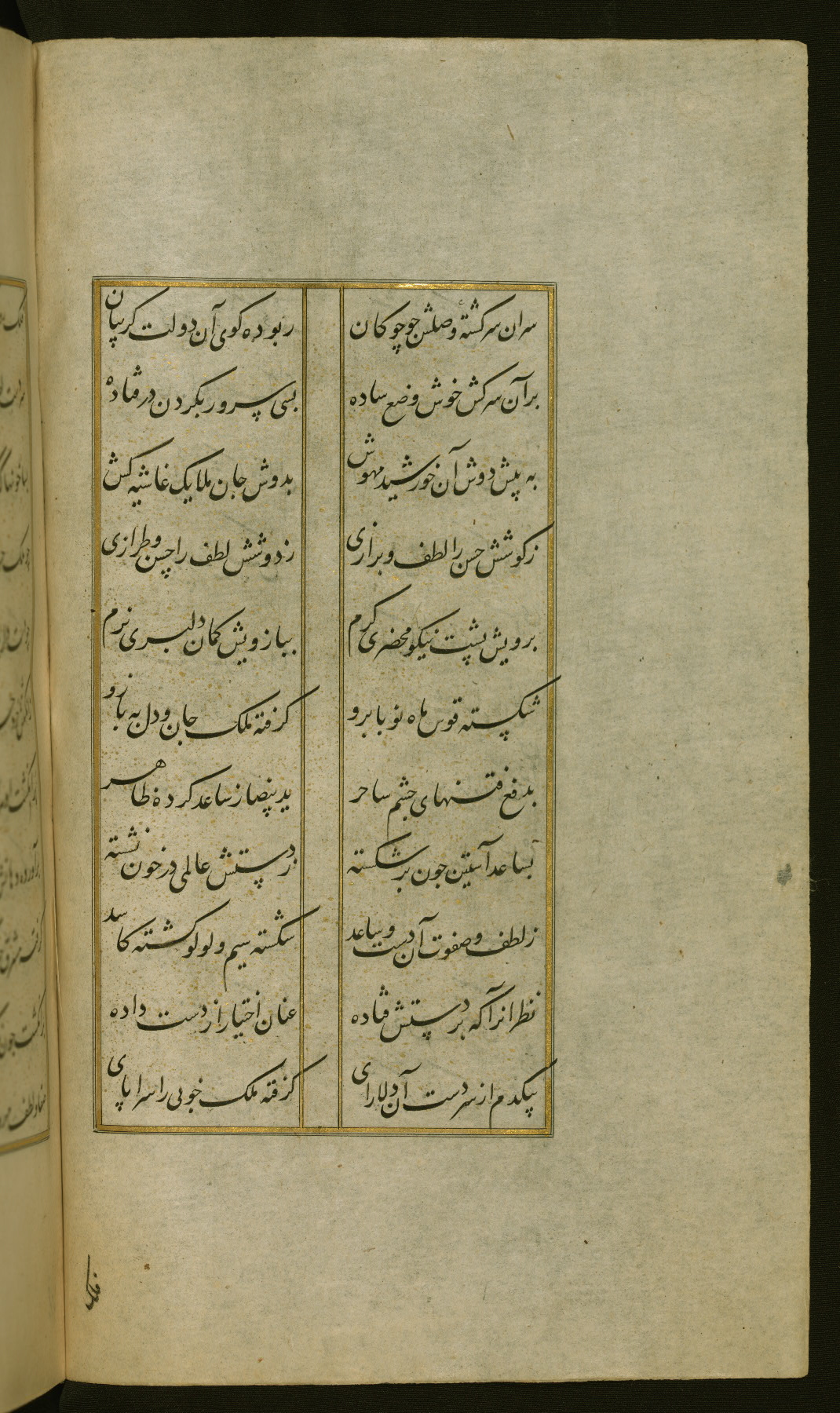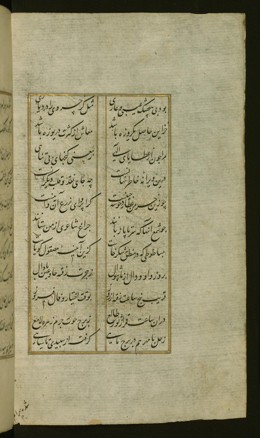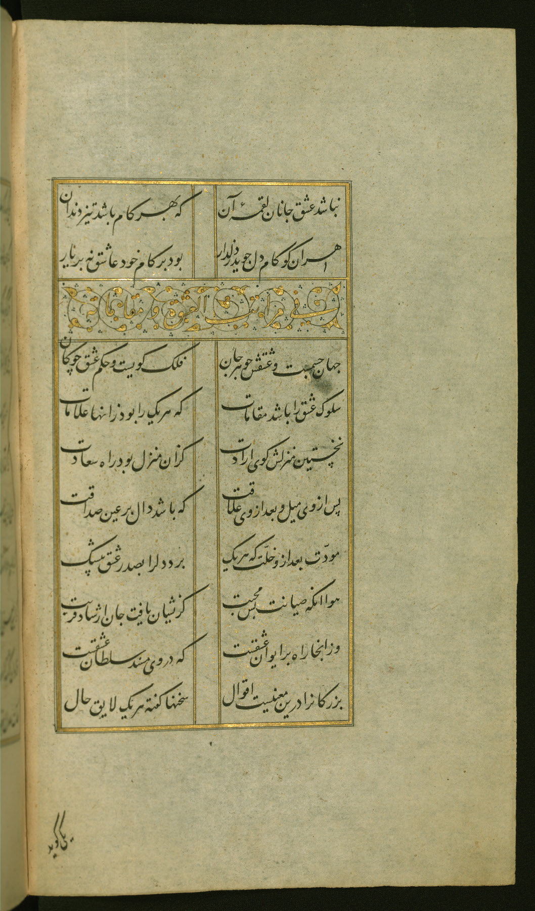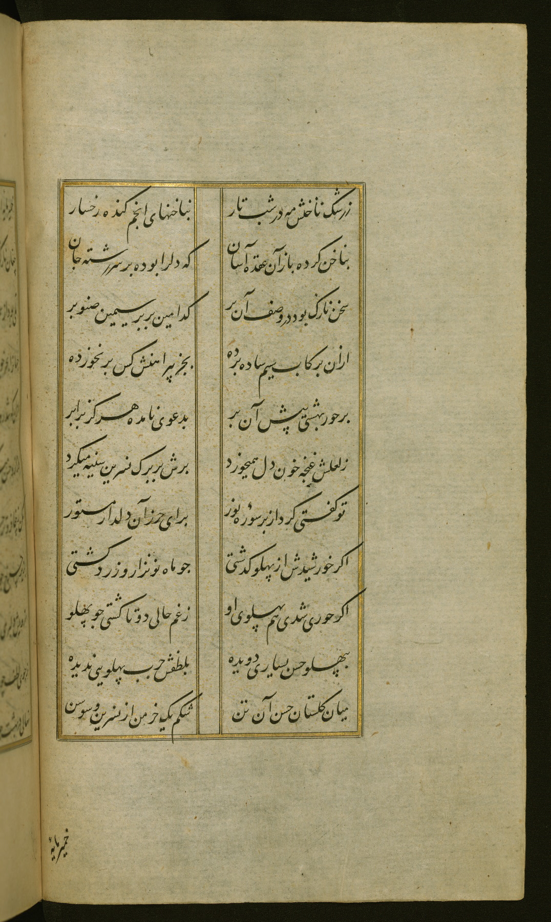 This manuscript is an illustrated copy of the well-known poem recounting the platonic love story between Mihr (the Sun), the son of Shāhpūr, and his vizier's son Mushtarī (Jupiter). The story of 90 chapters was composed by Muḥammad ibn Aḥmad ‘Aṣṣār Tabrīzī (d. 784 AH / 1382 CE). The present copy was written in nasta‘līq script by Murshid al-Kātib in 881 AH / 1476 CE. Considering the number of surviving manuscripts in which this calligrapher’s name is found, it seems he was particularly prolific. The present codex is illustrated with nine paintings. The gold-brushed leather binding with doublures of red leather decorated with filigree work is original to the manuscript.