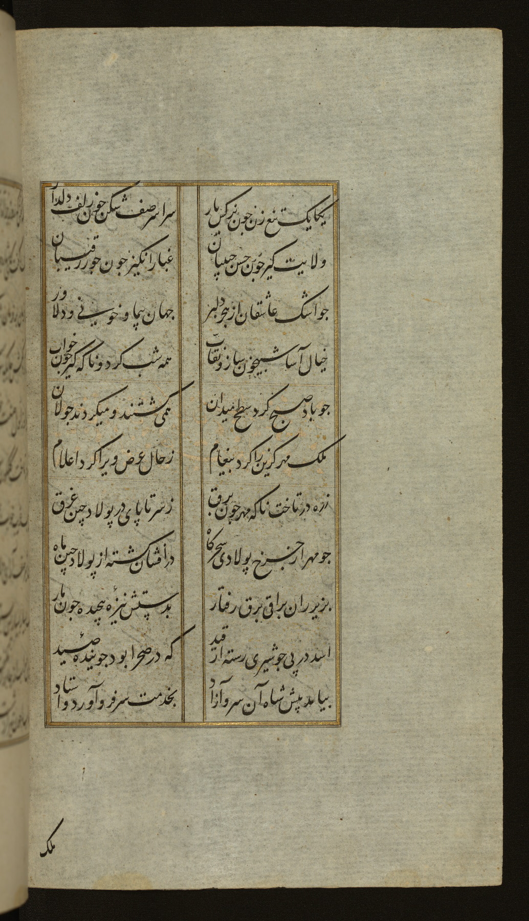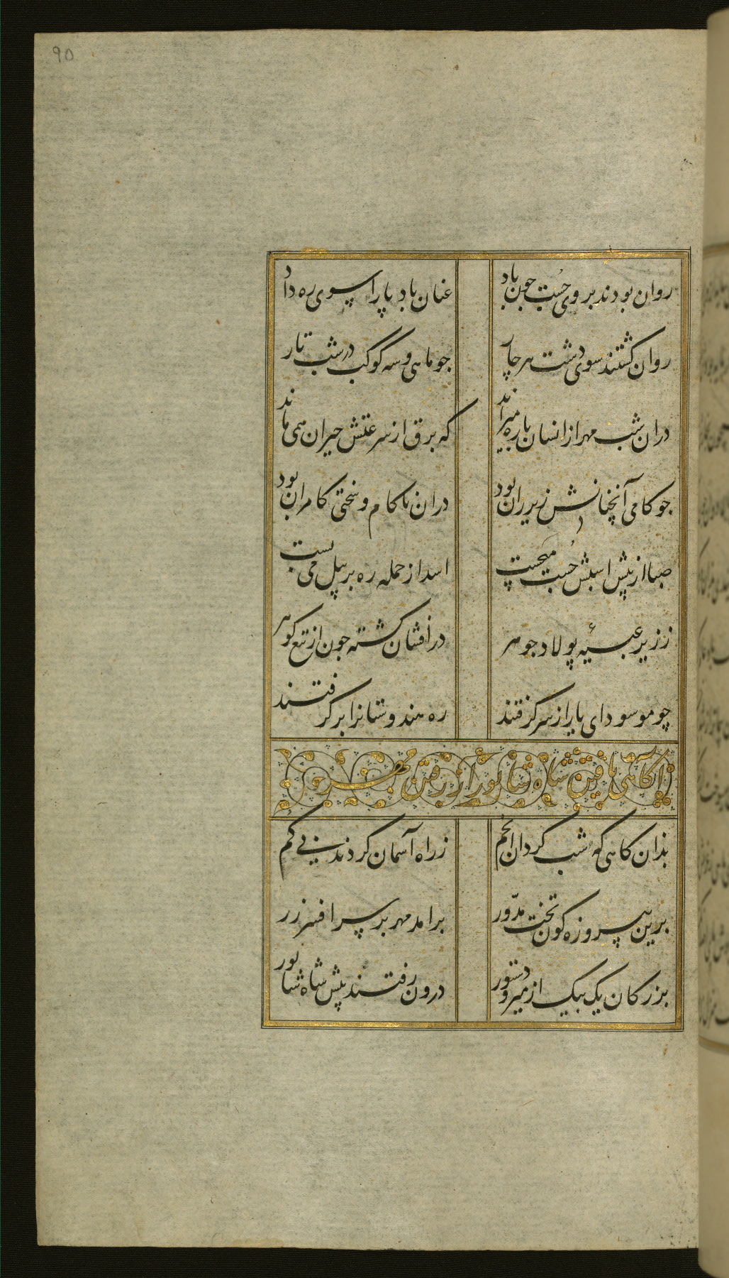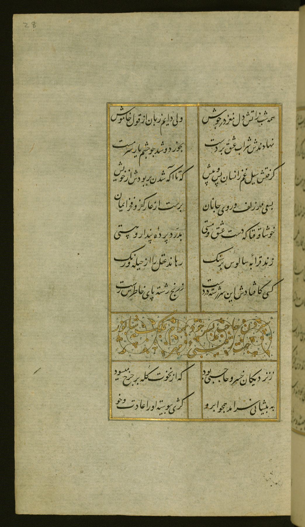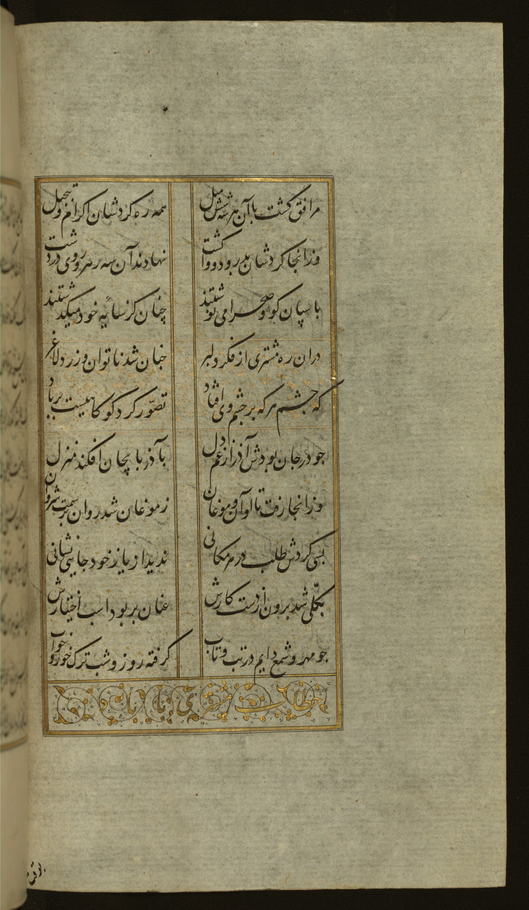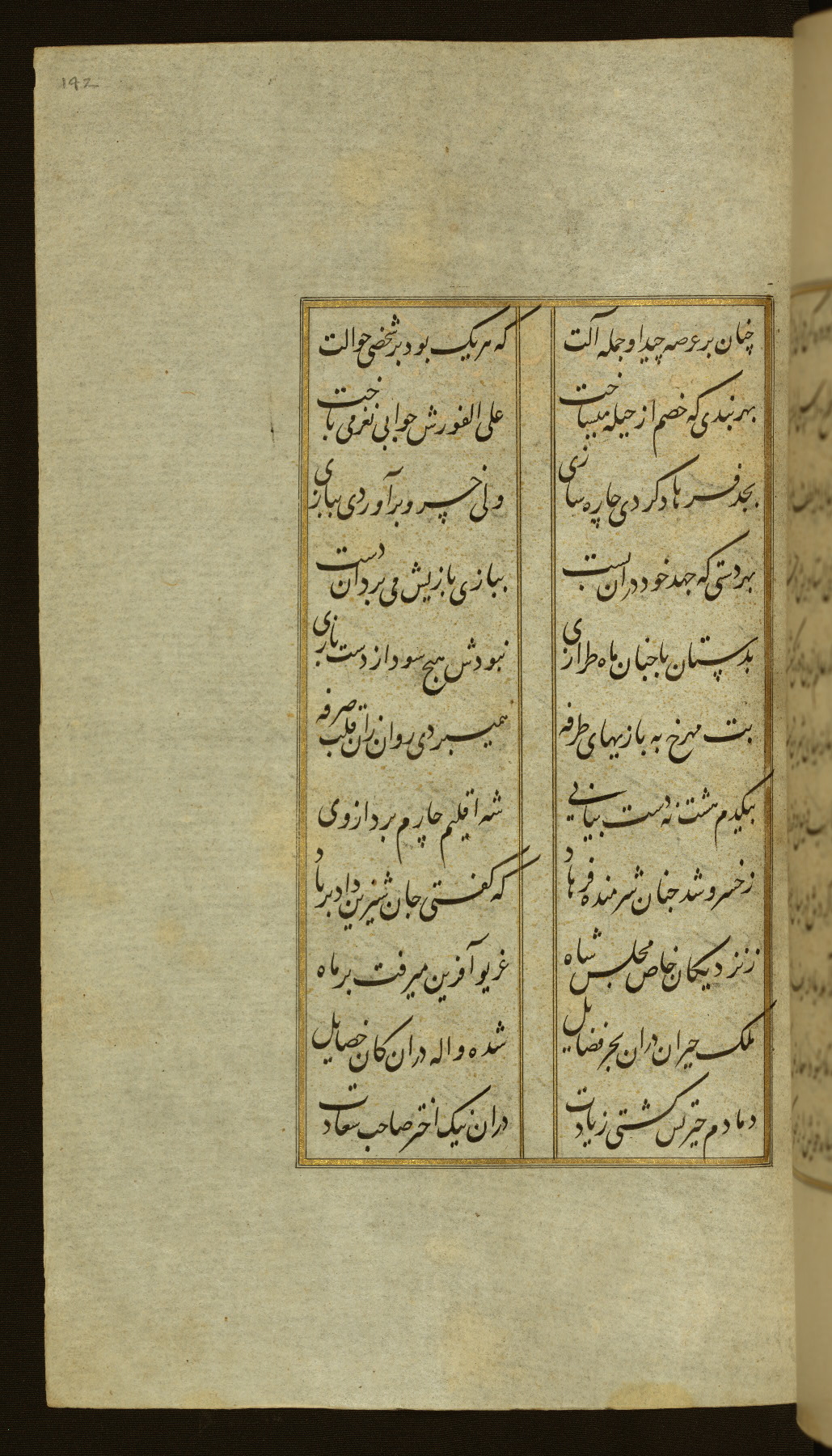 This manuscript is an illustrated copy of the well-known poem recounting the platonic love story between Mihr (the Sun), the son of Shāhpūr, and his vizier's son Mushtarī (Jupiter). The story of 90 chapters was composed by Muḥammad ibn Aḥmad ‘Aṣṣār Tabrīzī (d. 784 AH / 1382 CE). The present copy was written in nasta‘līq script by Murshid al-Kātib in 881 AH / 1476 CE. Considering the number of surviving manuscripts in which this calligrapher’s name is found, it seems he was particularly prolific. The present codex is illustrated with nine paintings. The gold-brushed leather binding with doublures of red leather decorated with filigree work is original to the manuscript.
