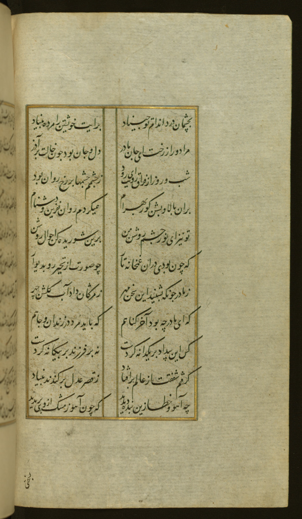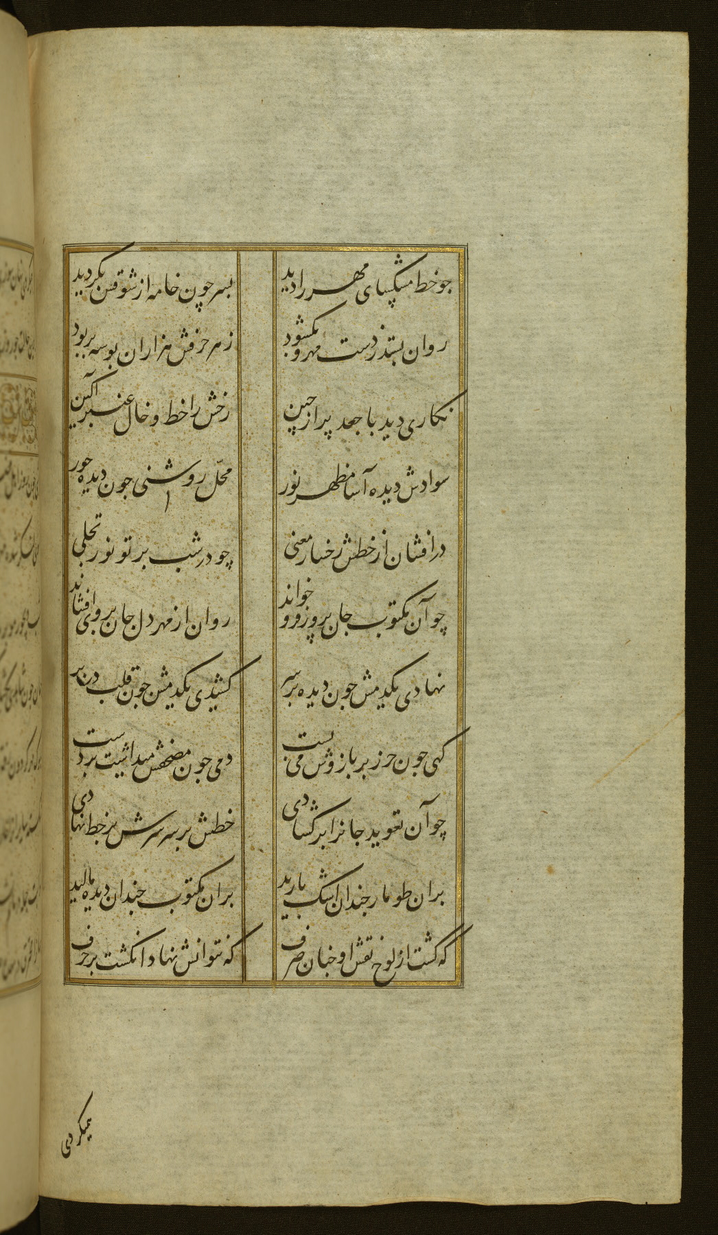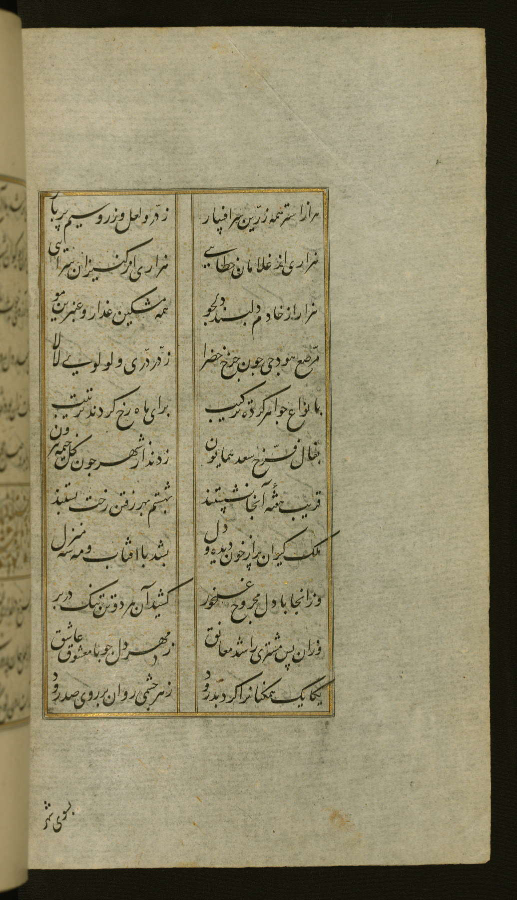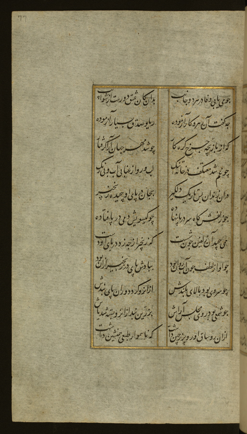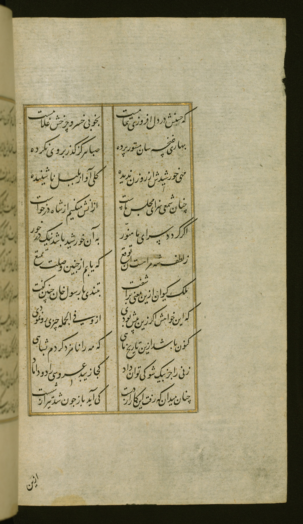 This manuscript is an illustrated copy of the well-known poem recounting the platonic love story between Mihr (the Sun), the son of Shāhpūr, and his vizier's son Mushtarī (Jupiter). The story of 90 chapters was composed by Muḥammad ibn Aḥmad ‘Aṣṣār Tabrīzī (d. 784 AH / 1382 CE). The present copy was written in nasta‘līq script by Murshid al-Kātib in 881 AH / 1476 CE. Considering the number of surviving manuscripts in which this calligrapher’s name is found, it seems he was particularly prolific. The present codex is illustrated with nine paintings. The gold-brushed leather binding with doublures of red leather decorated with filigree work is original to the manuscript.