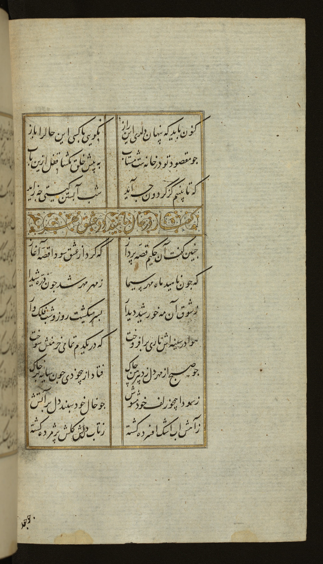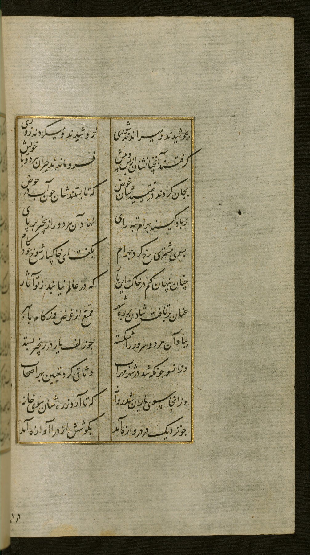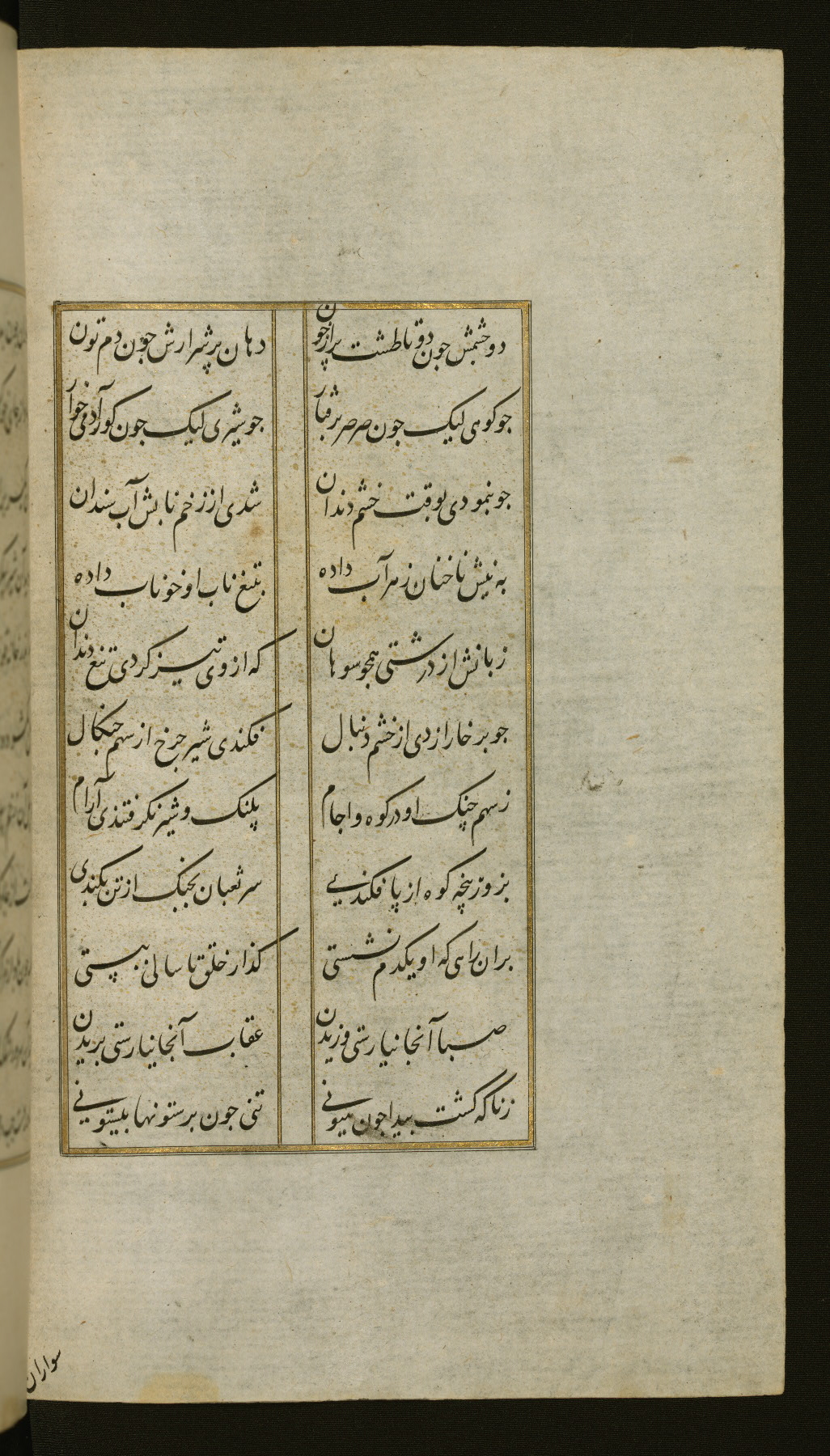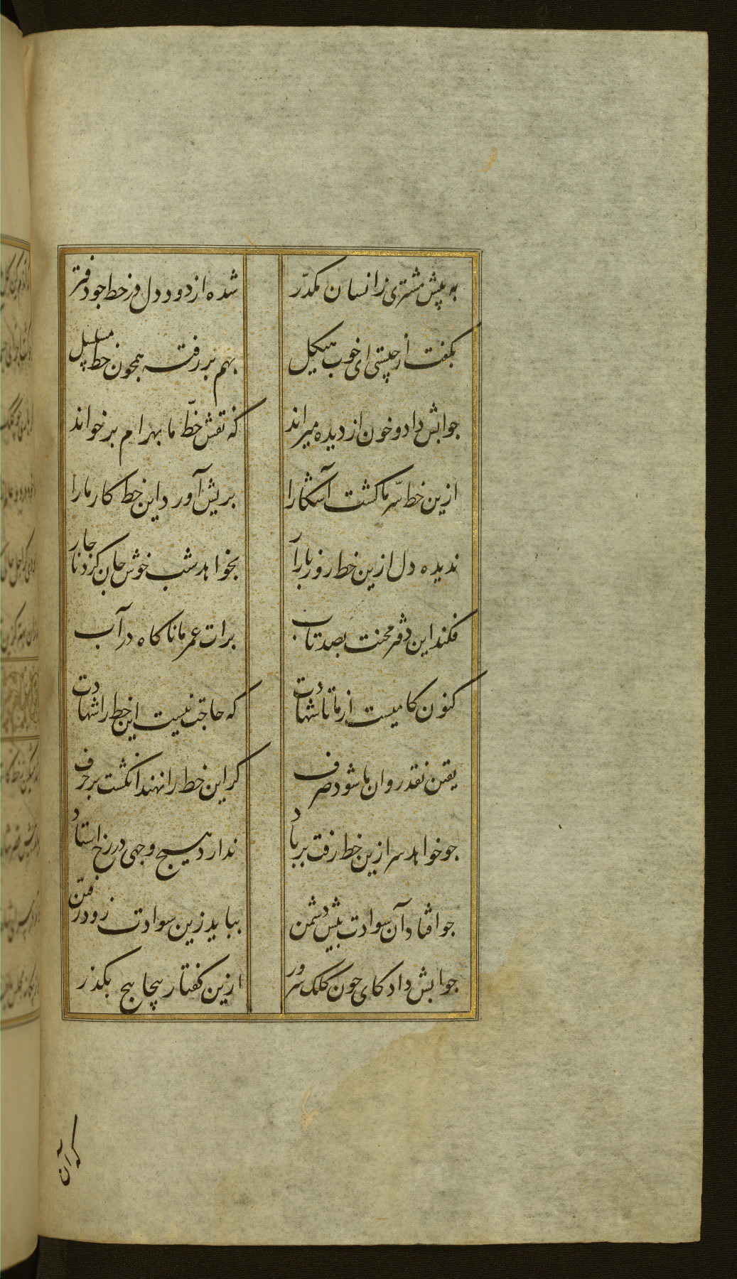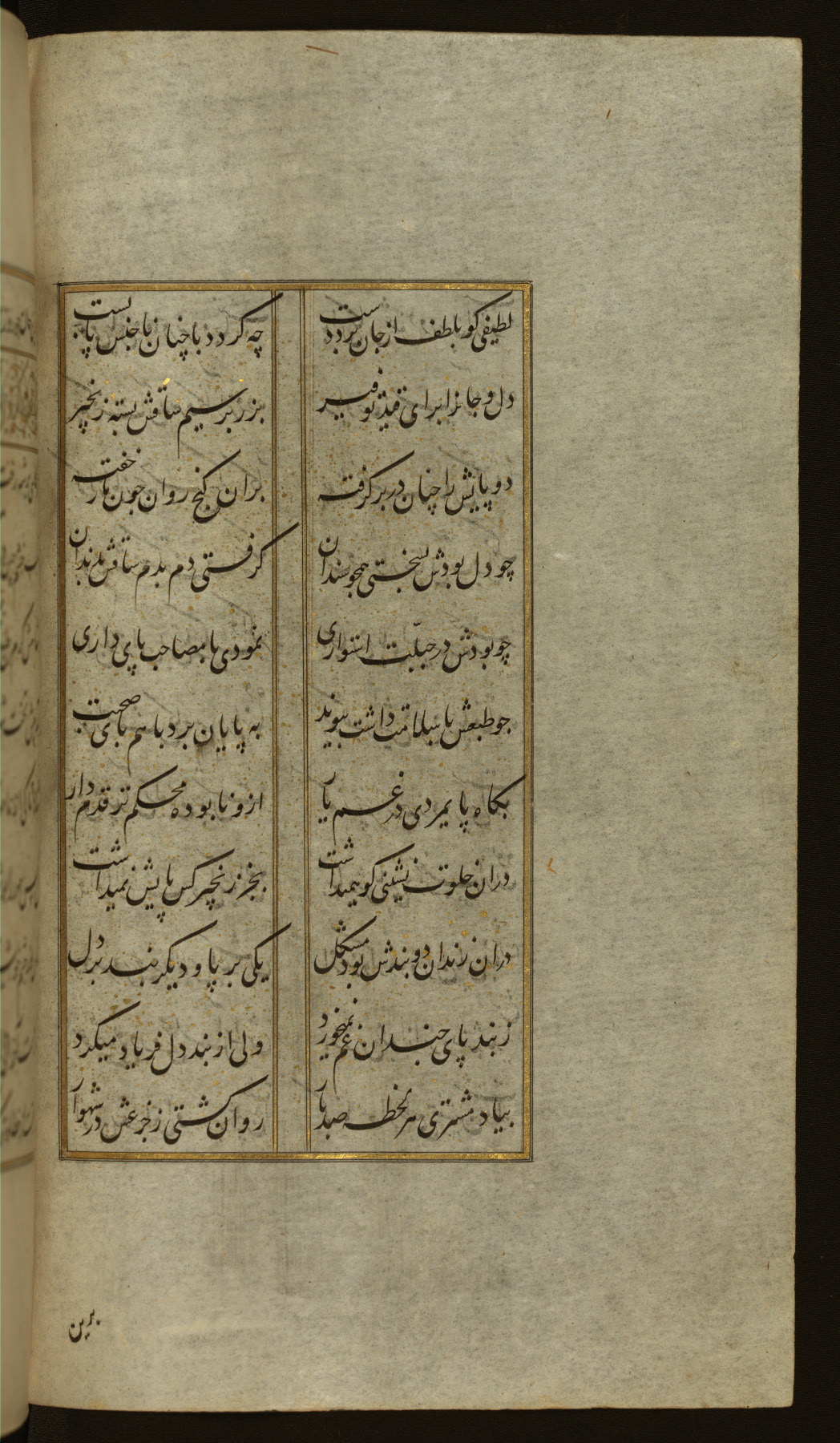 This manuscript is an illustrated copy of the well-known poem recounting the platonic love story between Mihr (the Sun), the son of Shāhpūr, and his vizier's son Mushtarī (Jupiter). The story of 90 chapters was composed by Muḥammad ibn Aḥmad ‘Aṣṣār Tabrīzī (d. 784 AH / 1382 CE). The present copy was written in nasta‘līq script by Murshid al-Kātib in 881 AH / 1476 CE. Considering the number of surviving manuscripts in which this calligrapher’s name is found, it seems he was particularly prolific. The present codex is illustrated with nine paintings. The gold-brushed leather binding with doublures of red leather decorated with filigree work is original to the manuscript.