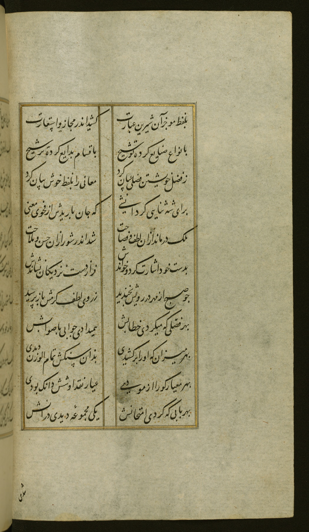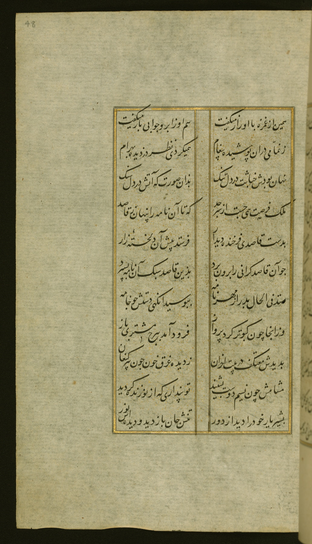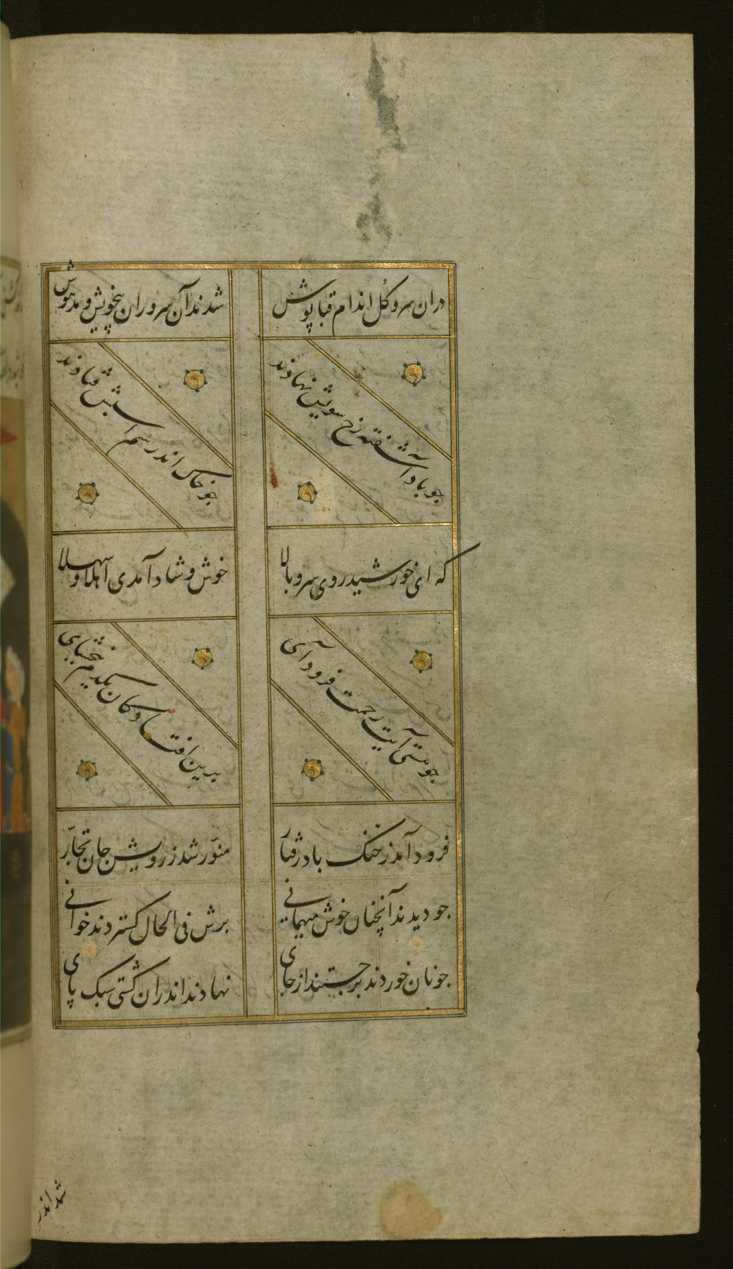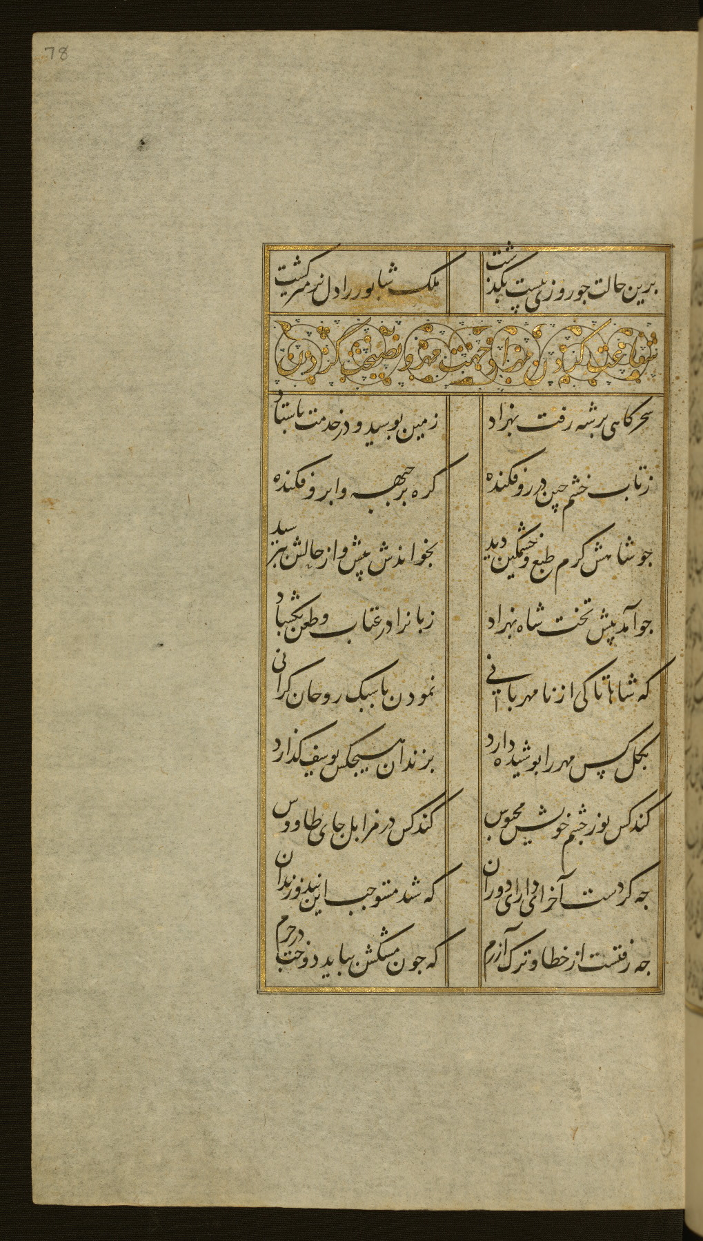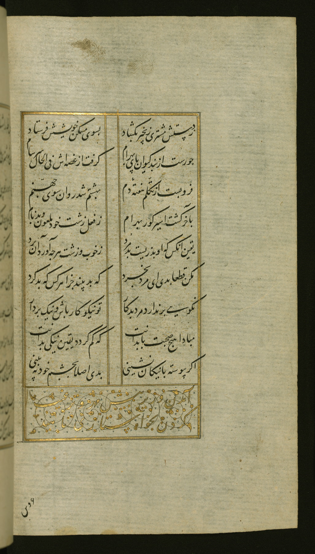 This manuscript is an illustrated copy of the well-known poem recounting the platonic love story between Mihr (the Sun), the son of Shāhpūr, and his vizier's son Mushtarī (Jupiter). The story of 90 chapters was composed by Muḥammad ibn Aḥmad ‘Aṣṣār Tabrīzī (d. 784 AH / 1382 CE). The present copy was written in nasta‘līq script by Murshid al-Kātib in 881 AH / 1476 CE. Considering the number of surviving manuscripts in which this calligrapher’s name is found, it seems he was particularly prolific. The present codex is illustrated with nine paintings. The gold-brushed leather binding with doublures of red leather decorated with filigree work is original to the manuscript.