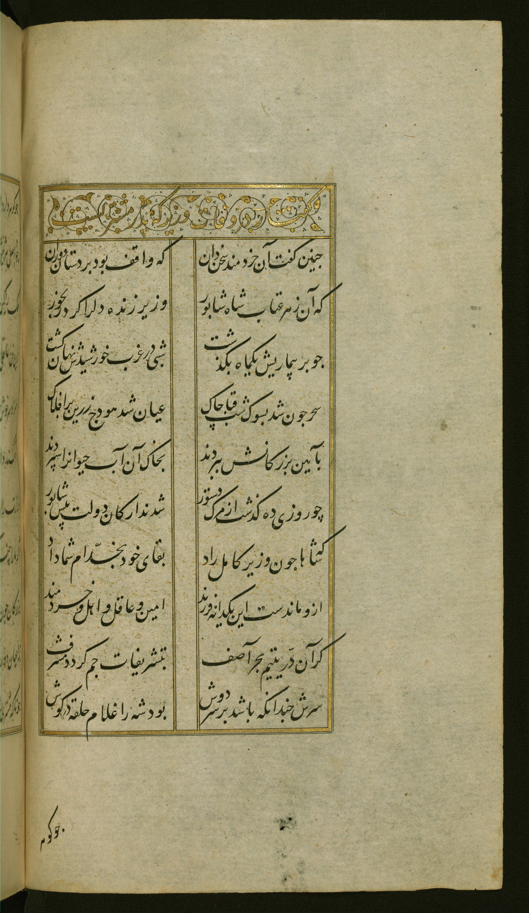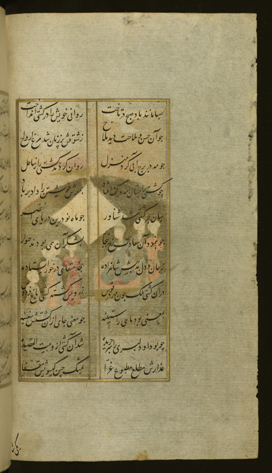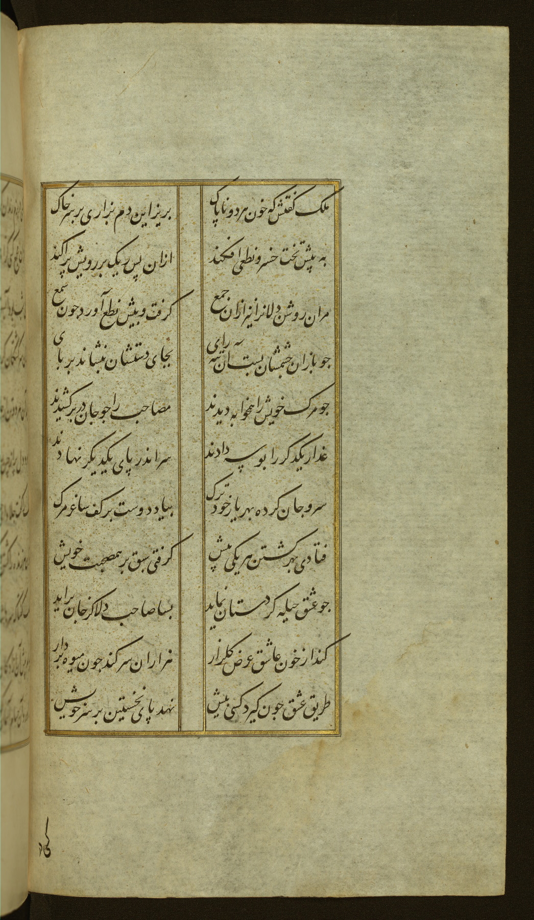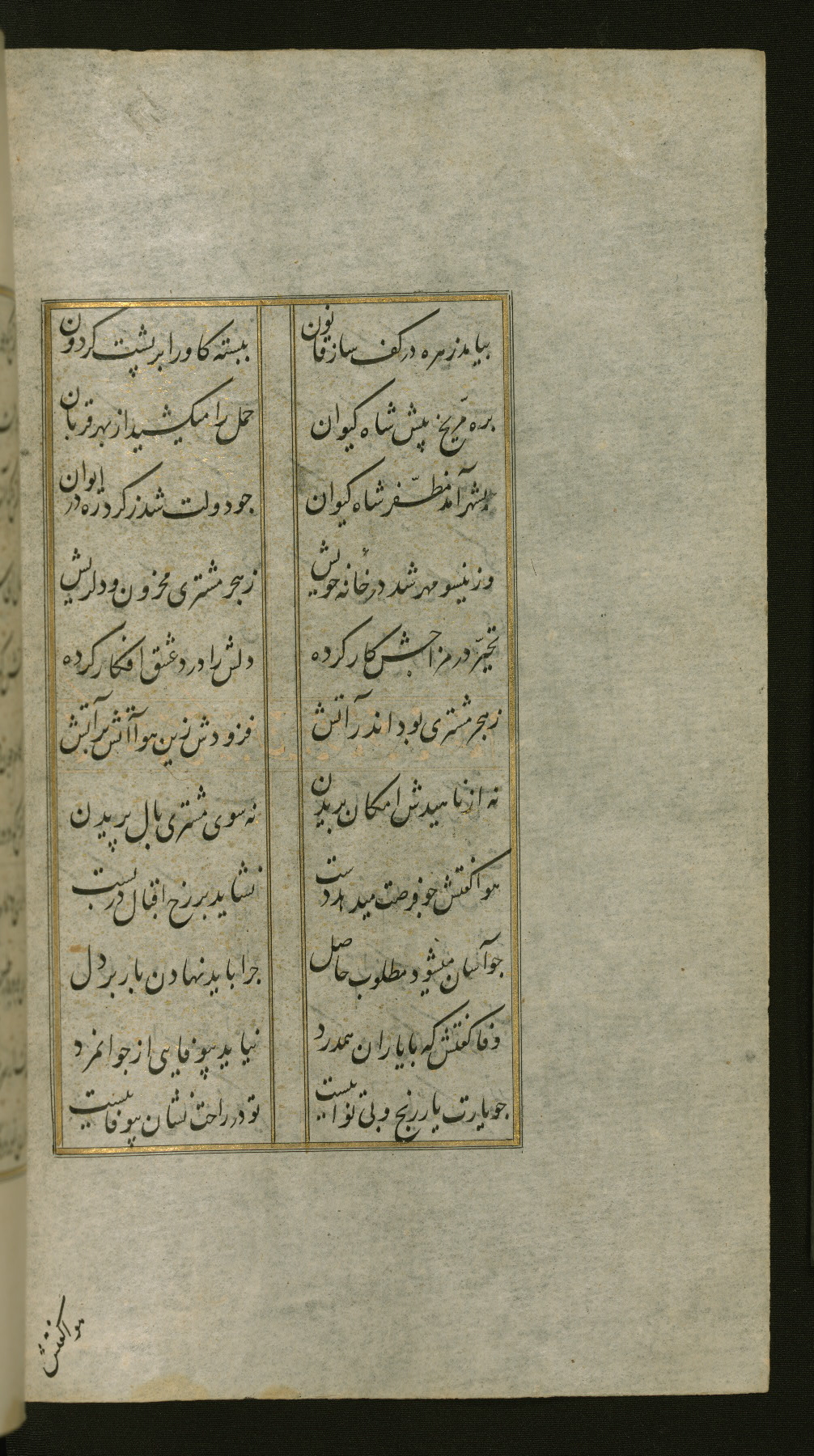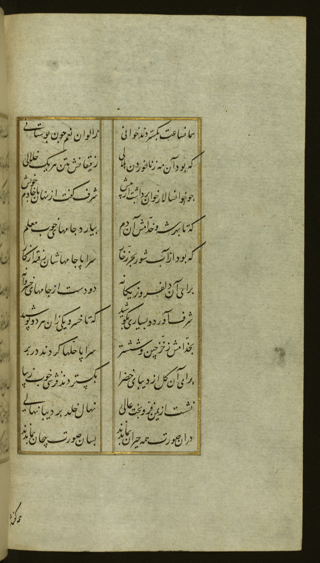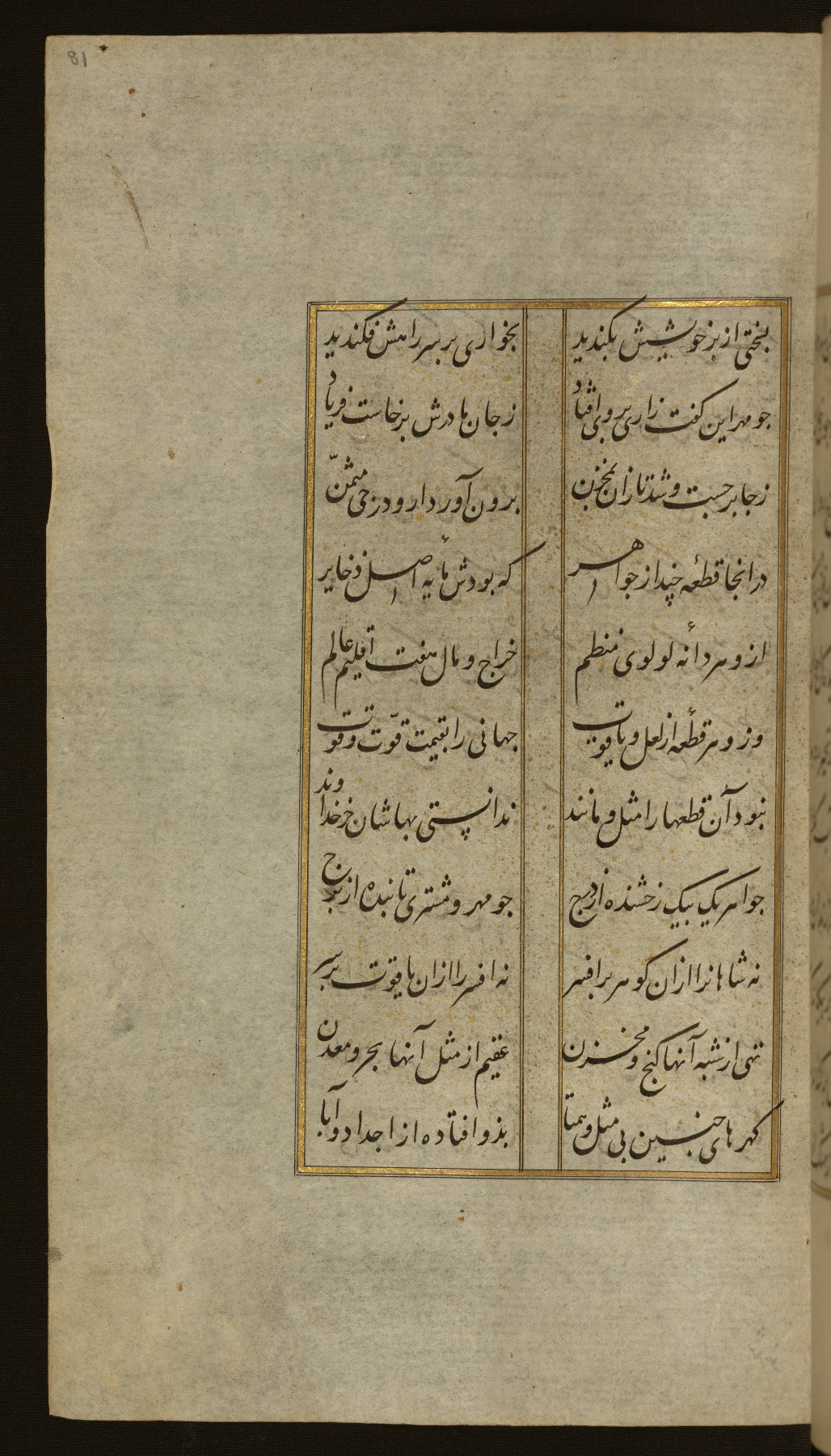 This manuscript is an illustrated copy of the well-known poem recounting the platonic love story between Mihr (the Sun), the son of Shāhpūr, and his vizier's son Mushtarī (Jupiter). The story of 90 chapters was composed by Muḥammad ibn Aḥmad ‘Aṣṣār Tabrīzī (d. 784 AH / 1382 CE). The present copy was written in nasta‘līq script by Murshid al-Kātib in 881 AH / 1476 CE. Considering the number of surviving manuscripts in which this calligrapher’s name is found, it seems he was particularly prolific. The present codex is illustrated with nine paintings. The gold-brushed leather binding with doublures of red leather decorated with filigree work is original to the manuscript.