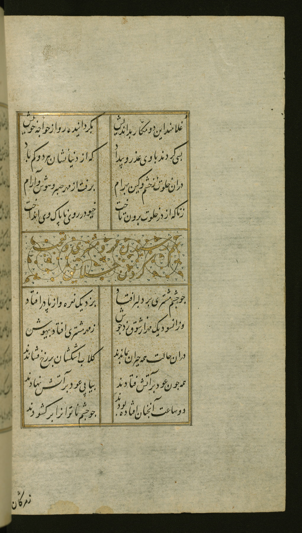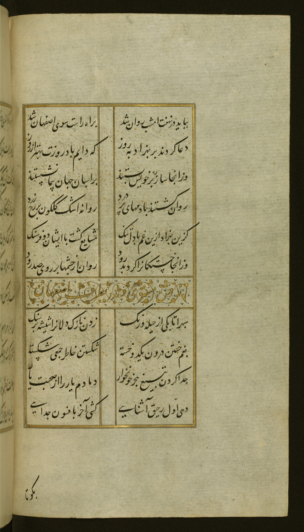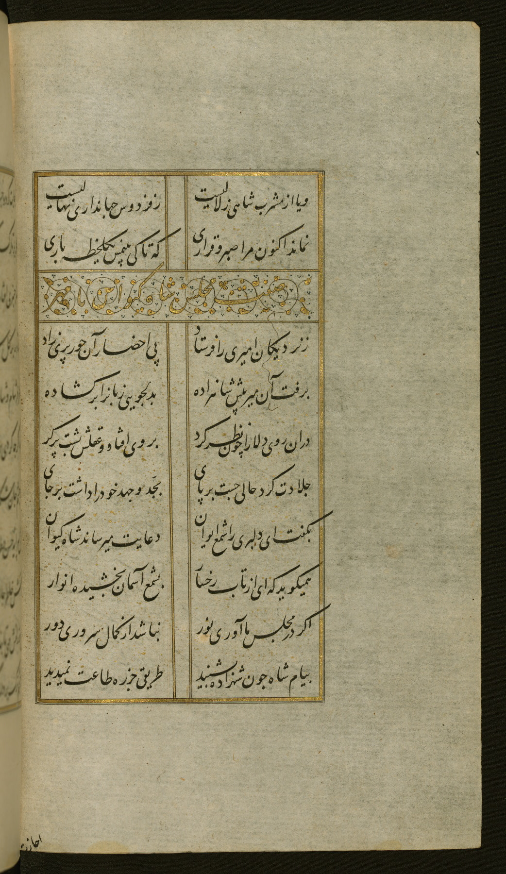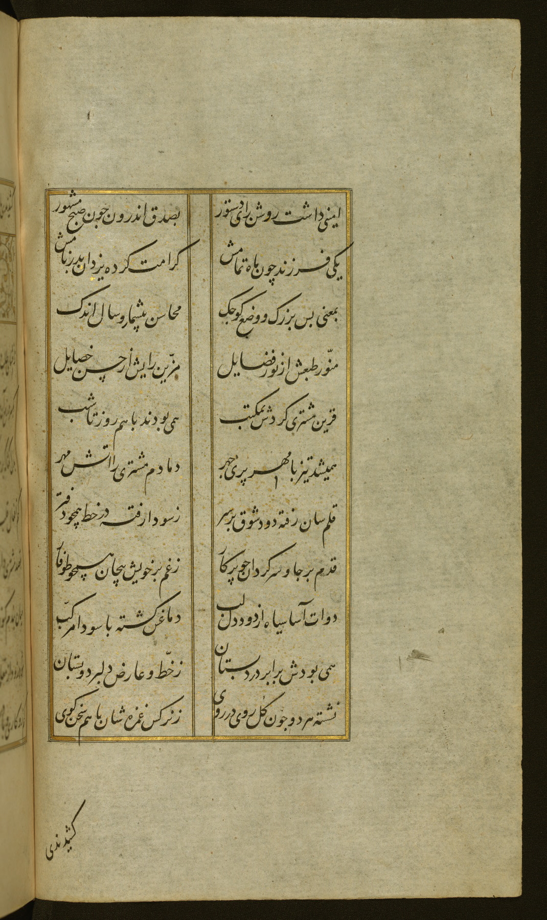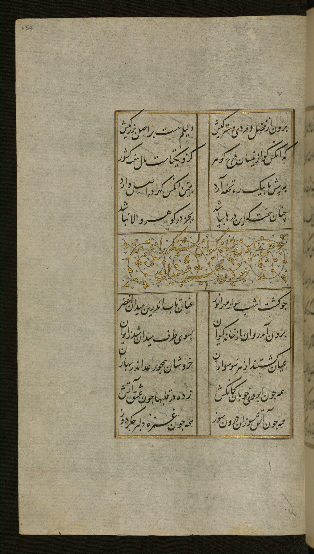 This manuscript is an illustrated copy of the well-known poem recounting the platonic love story between Mihr (the Sun), the son of Shāhpūr, and his vizier's son Mushtarī (Jupiter). The story of 90 chapters was composed by Muḥammad ibn Aḥmad ‘Aṣṣār Tabrīzī (d. 784 AH / 1382 CE). The present copy was written in nasta‘līq script by Murshid al-Kātib in 881 AH / 1476 CE. Considering the number of surviving manuscripts in which this calligrapher’s name is found, it seems he was particularly prolific. The present codex is illustrated with nine paintings. The gold-brushed leather binding with doublures of red leather decorated with filigree work is original to the manuscript.