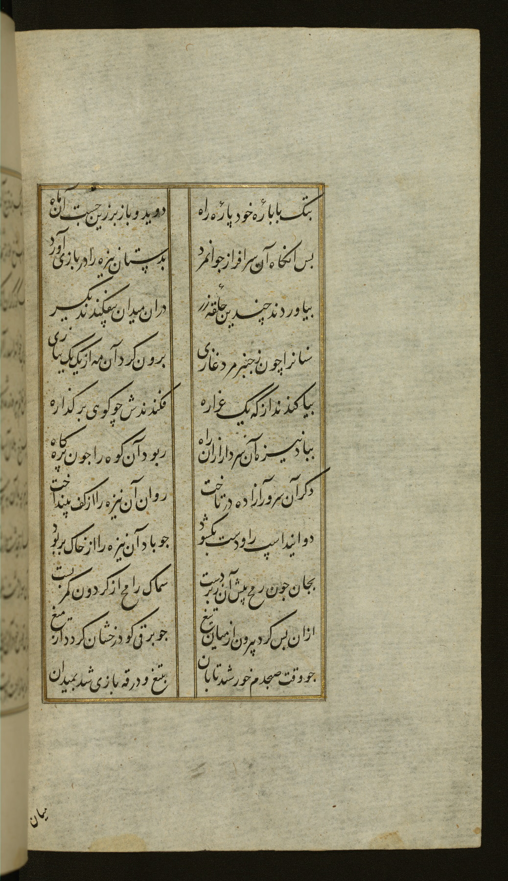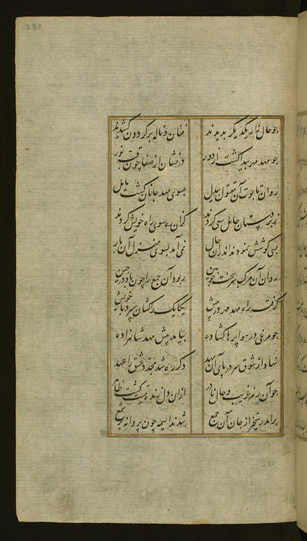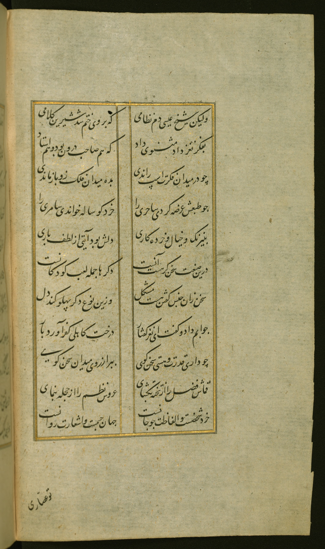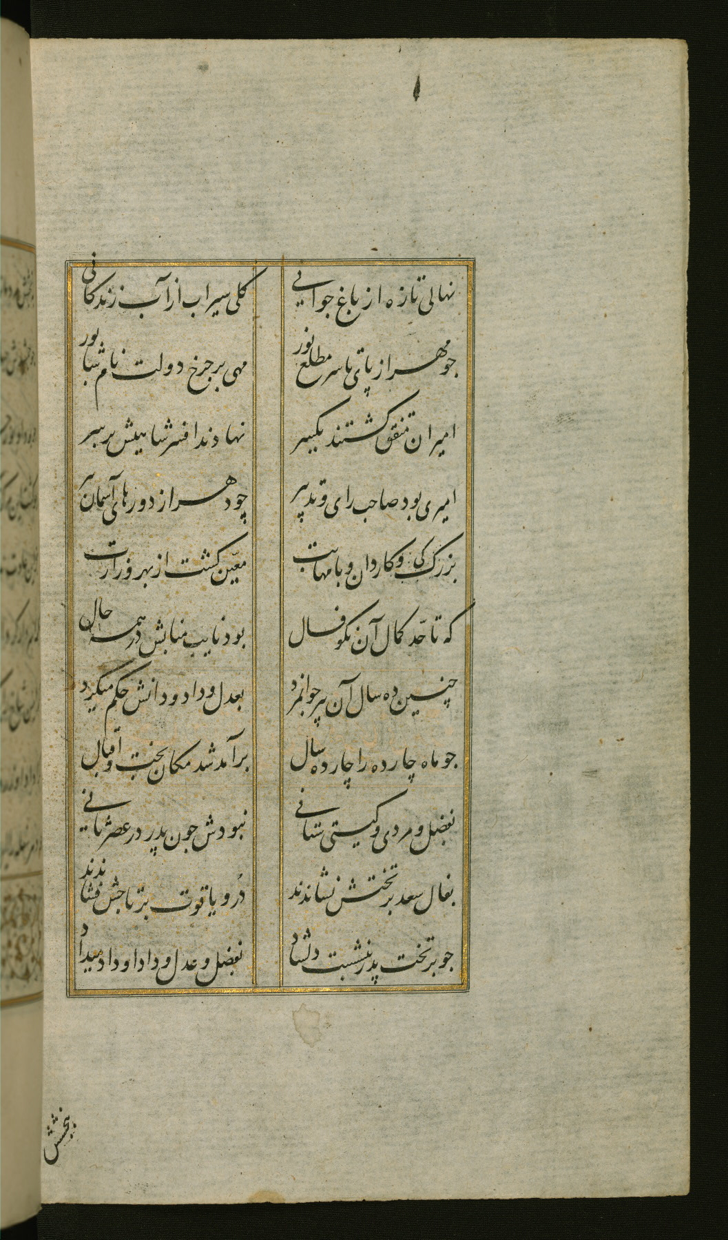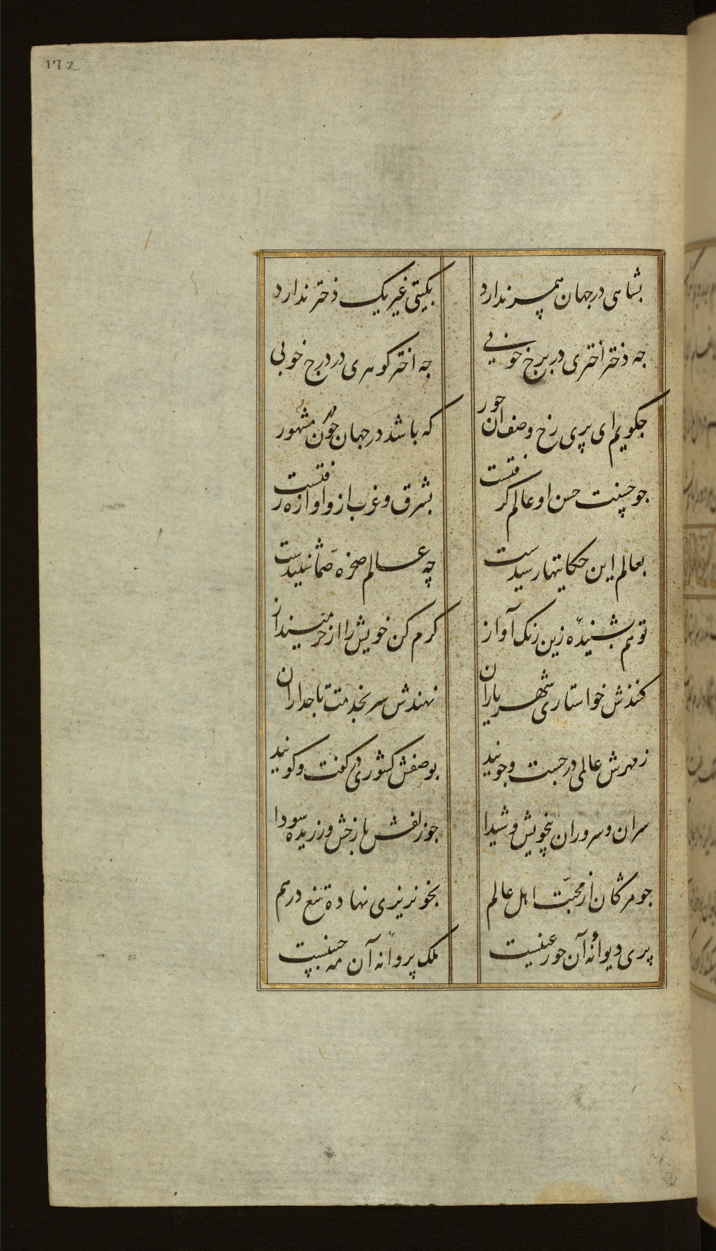 This manuscript is an illustrated copy of the well-known poem recounting the platonic love story between Mihr (the Sun), the son of Shāhpūr, and his vizier's son Mushtarī (Jupiter). The story of 90 chapters was composed by Muḥammad ibn Aḥmad ‘Aṣṣār Tabrīzī (d. 784 AH / 1382 CE). The present copy was written in nasta‘līq script by Murshid al-Kātib in 881 AH / 1476 CE. Considering the number of surviving manuscripts in which this calligrapher’s name is found, it seems he was particularly prolific. The present codex is illustrated with nine paintings. The gold-brushed leather binding with doublures of red leather decorated with filigree work is original to the manuscript.