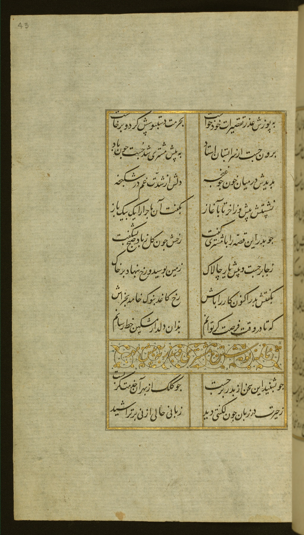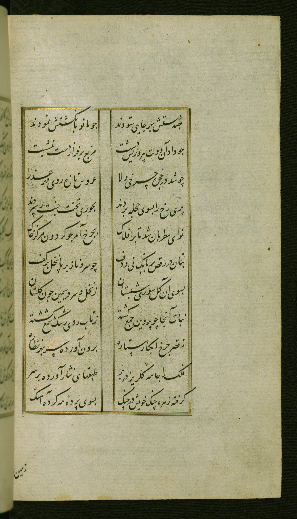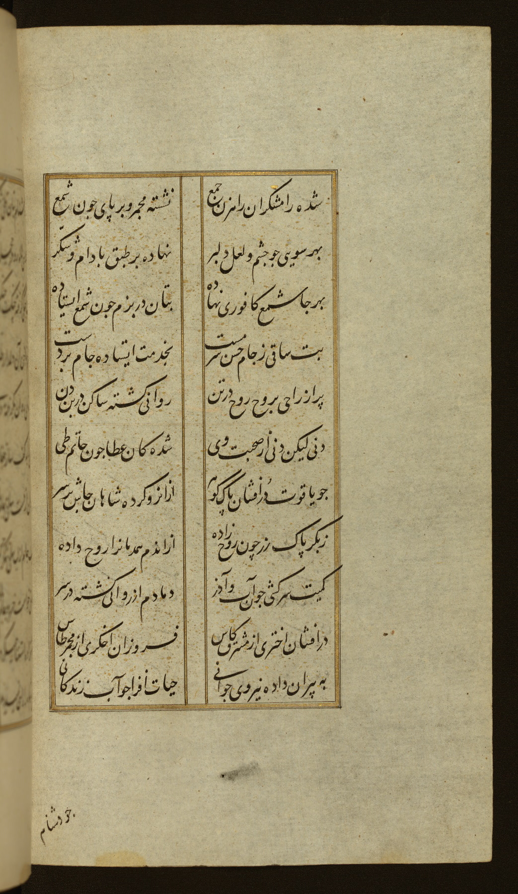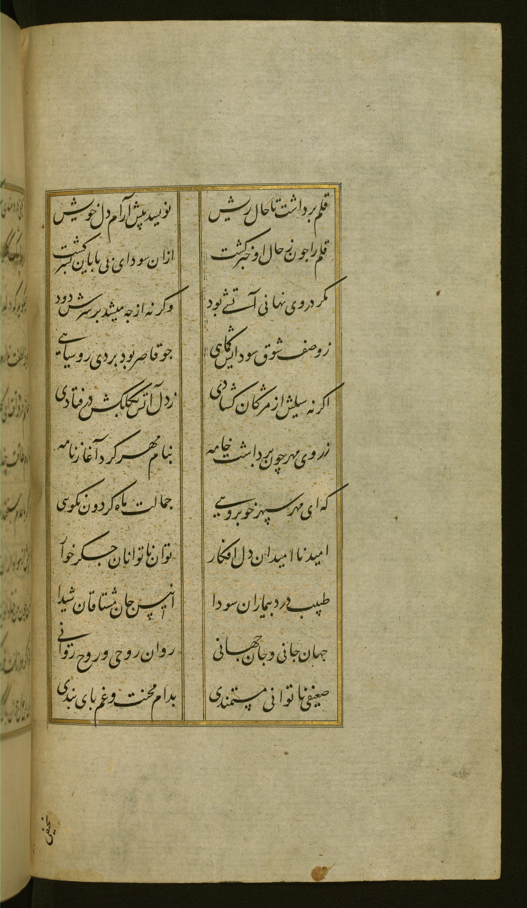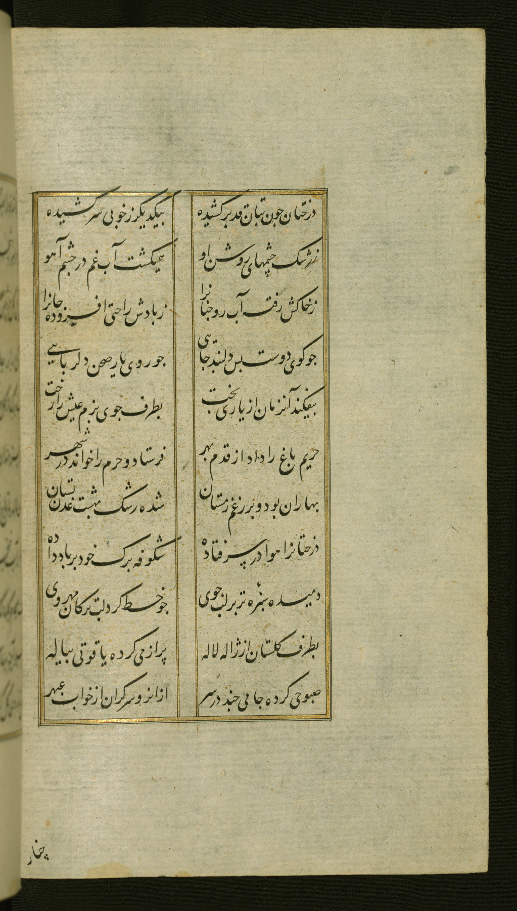 This manuscript is an illustrated copy of the well-known poem recounting the platonic love story between Mihr (the Sun), the son of Shāhpūr, and his vizier's son Mushtarī (Jupiter). The story of 90 chapters was composed by Muḥammad ibn Aḥmad ‘Aṣṣār Tabrīzī (d. 784 AH / 1382 CE). The present copy was written in nasta‘līq script by Murshid al-Kātib in 881 AH / 1476 CE. Considering the number of surviving manuscripts in which this calligrapher’s name is found, it seems he was particularly prolific. The present codex is illustrated with nine paintings. The gold-brushed leather binding with doublures of red leather decorated with filigree work is original to the manuscript.