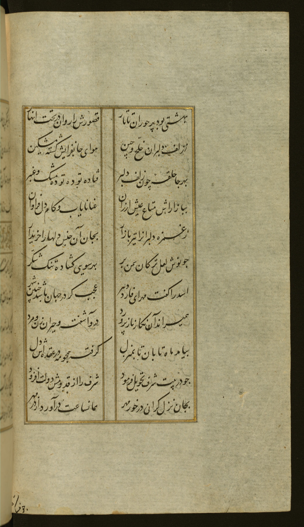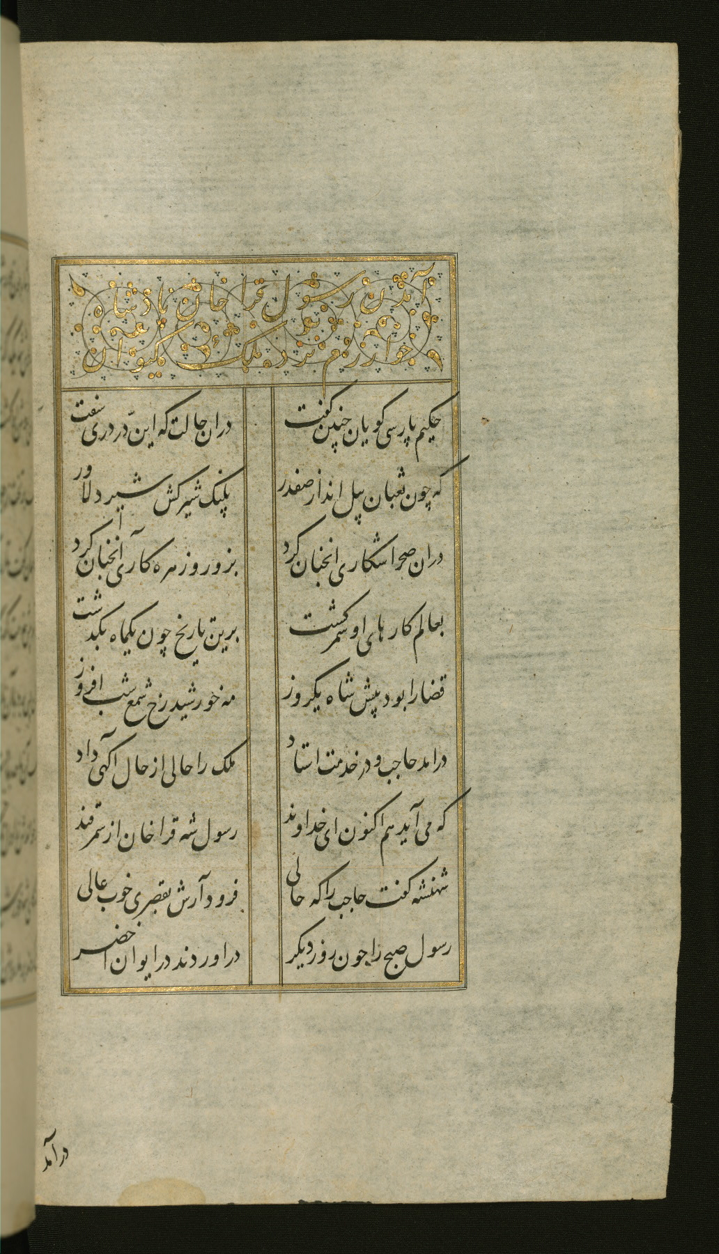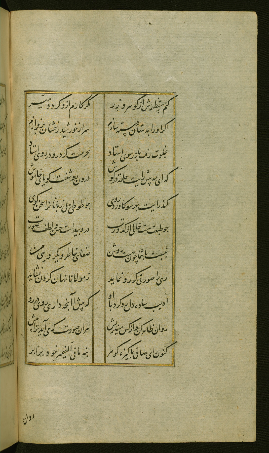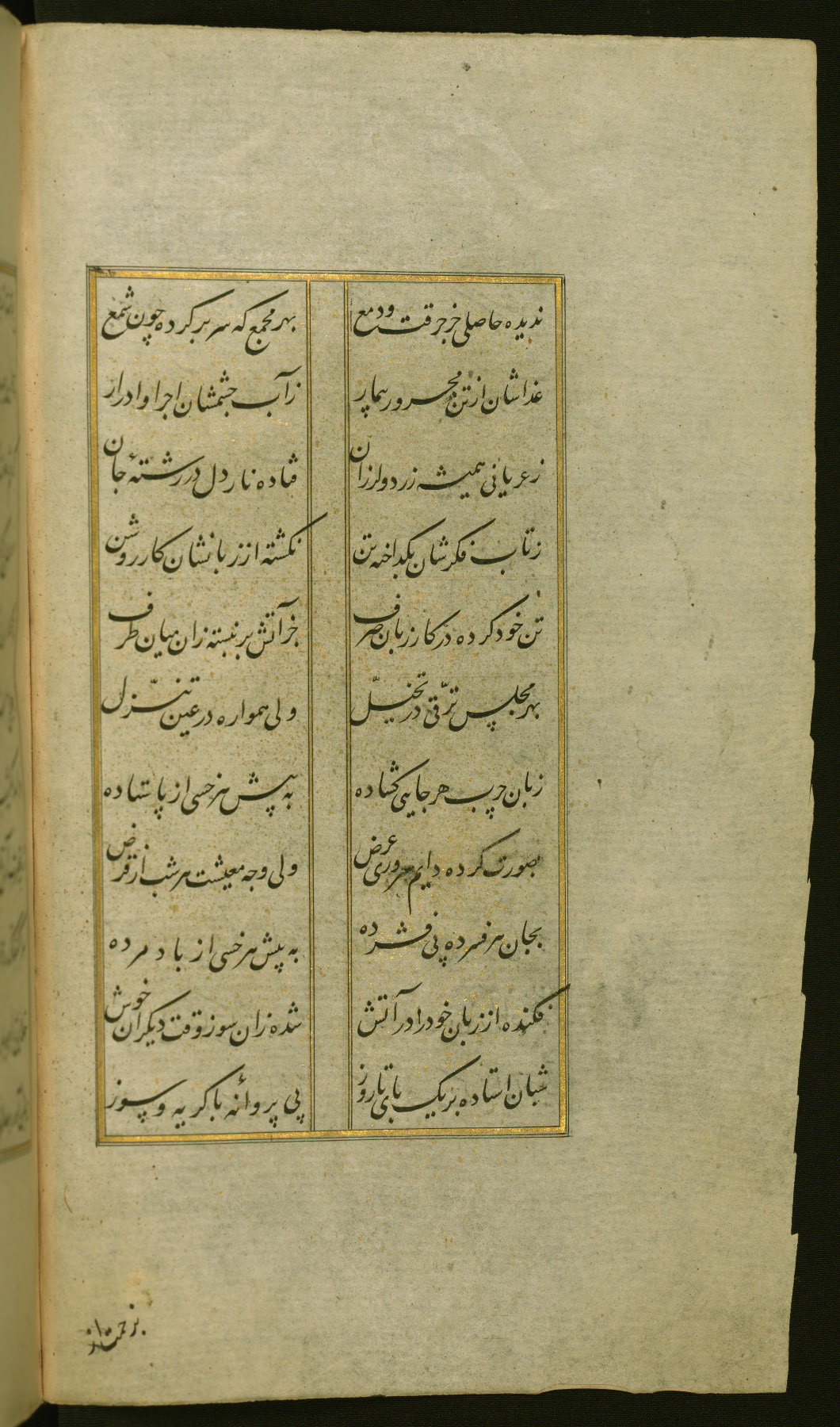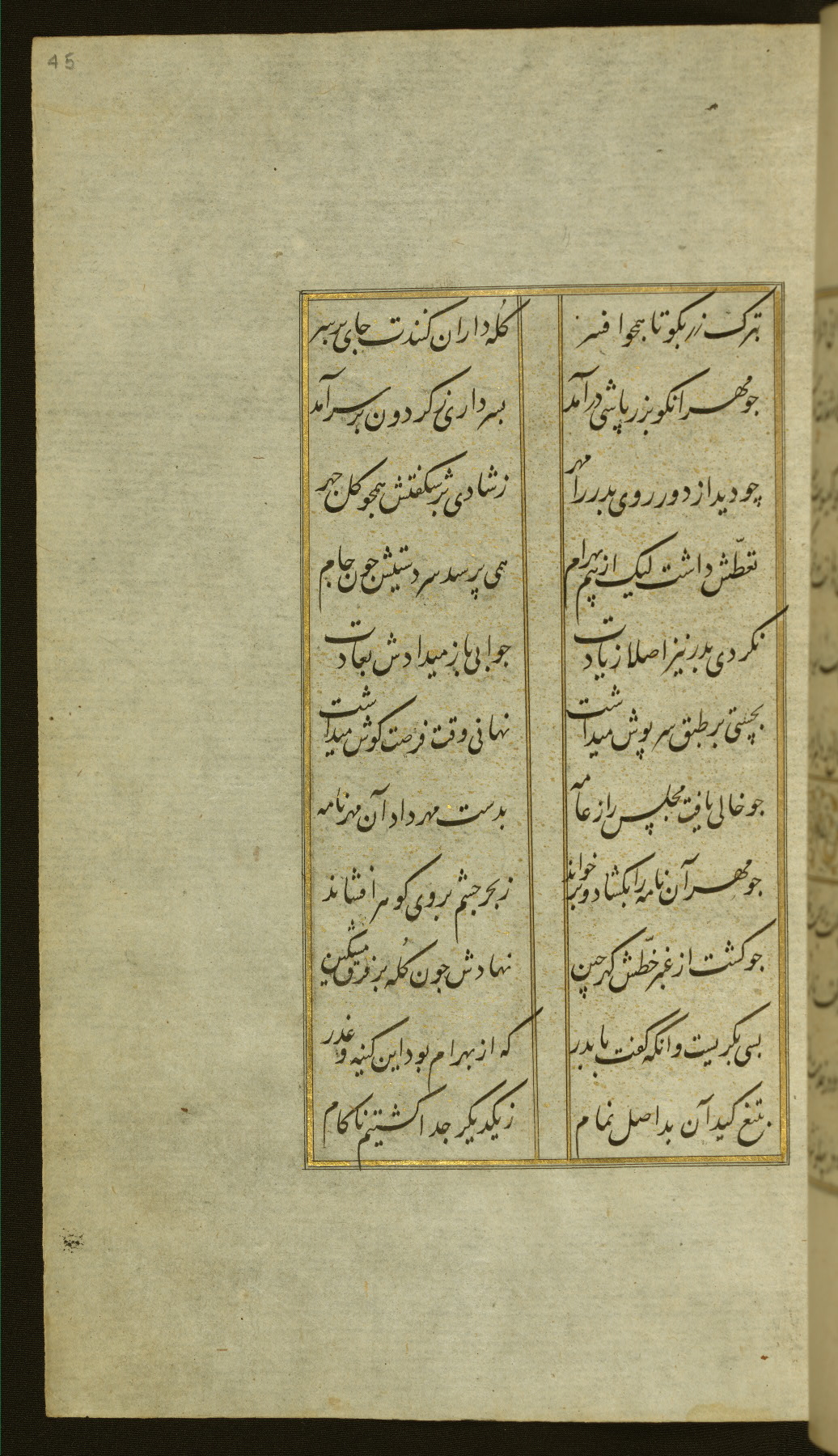 This manuscript is an illustrated copy of the well-known poem recounting the platonic love story between Mihr (the Sun), the son of Shāhpūr, and his vizier's son Mushtarī (Jupiter). The story of 90 chapters was composed by Muḥammad ibn Aḥmad ‘Aṣṣār Tabrīzī (d. 784 AH / 1382 CE). The present copy was written in nasta‘līq script by Murshid al-Kātib in 881 AH / 1476 CE. Considering the number of surviving manuscripts in which this calligrapher’s name is found, it seems he was particularly prolific. The present codex is illustrated with nine paintings. The gold-brushed leather binding with doublures of red leather decorated with filigree work is original to the manuscript.