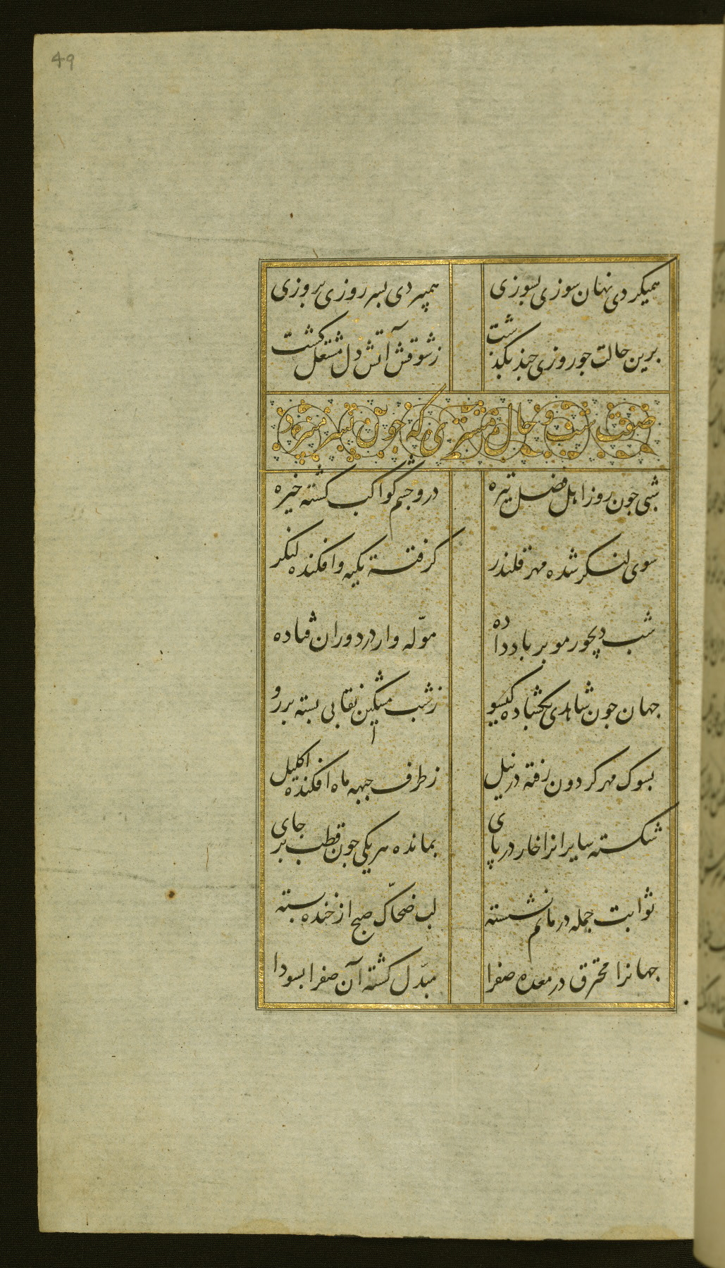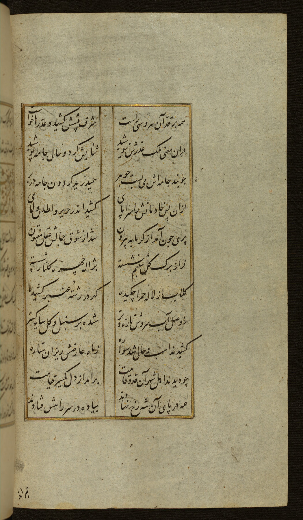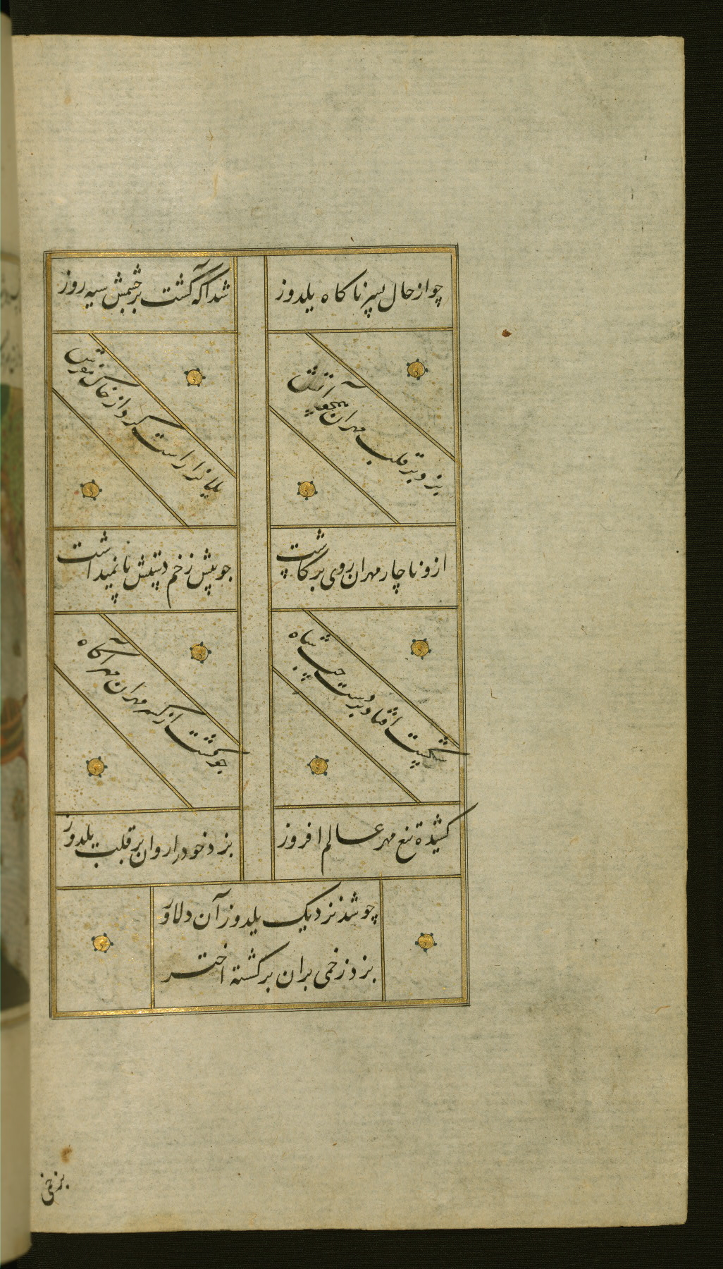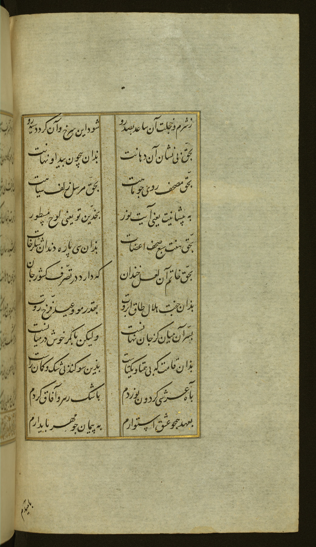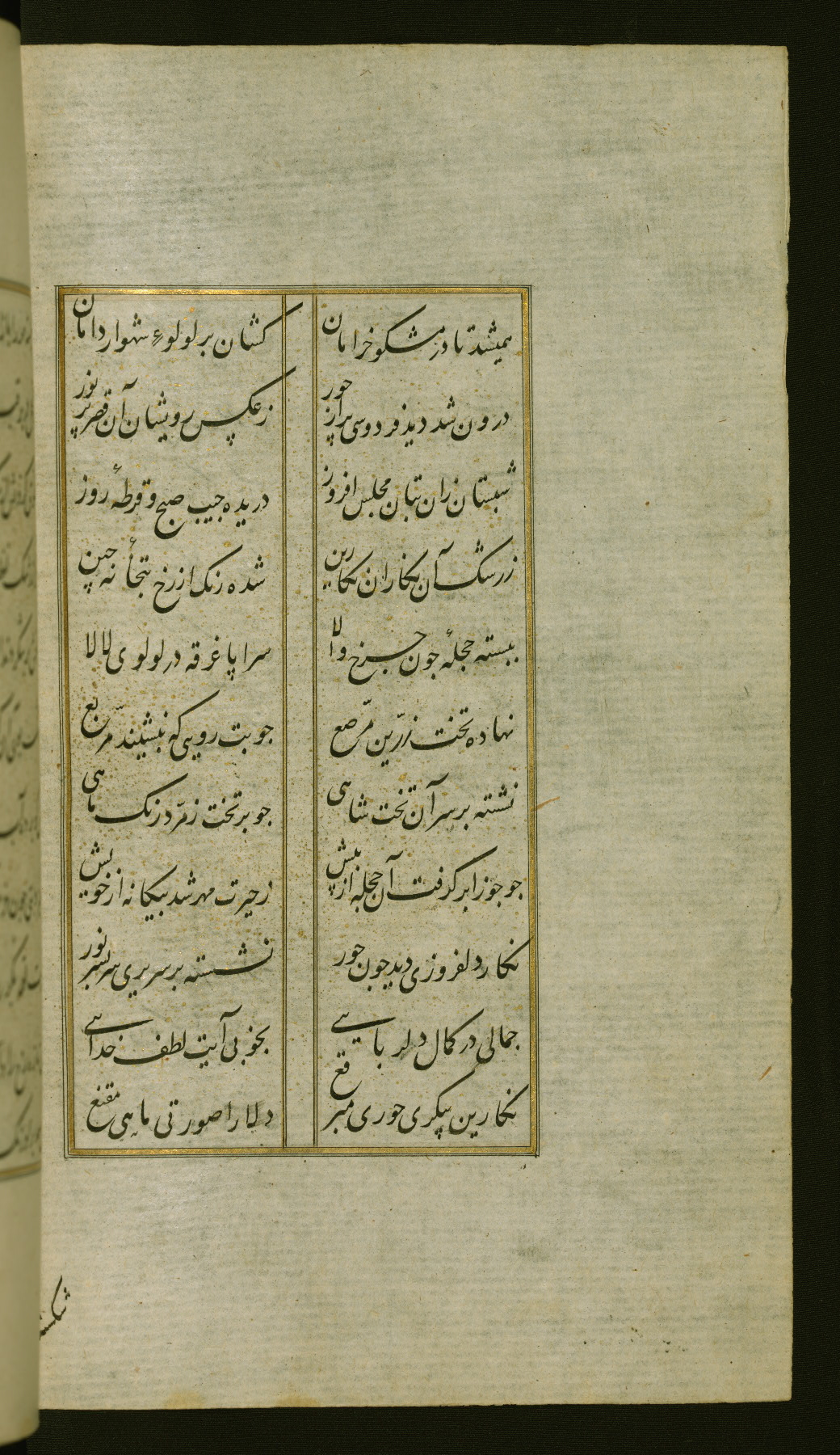 This manuscript is an illustrated copy of the well-known poem recounting the platonic love story between Mihr (the Sun), the son of Shāhpūr, and his vizier's son Mushtarī (Jupiter). The story of 90 chapters was composed by Muḥammad ibn Aḥmad ‘Aṣṣār Tabrīzī (d. 784 AH / 1382 CE). The present copy was written in nasta‘līq script by Murshid al-Kātib in 881 AH / 1476 CE. Considering the number of surviving manuscripts in which this calligrapher’s name is found, it seems he was particularly prolific. The present codex is illustrated with nine paintings. The gold-brushed leather binding with doublures of red leather decorated with filigree work is original to the manuscript.
