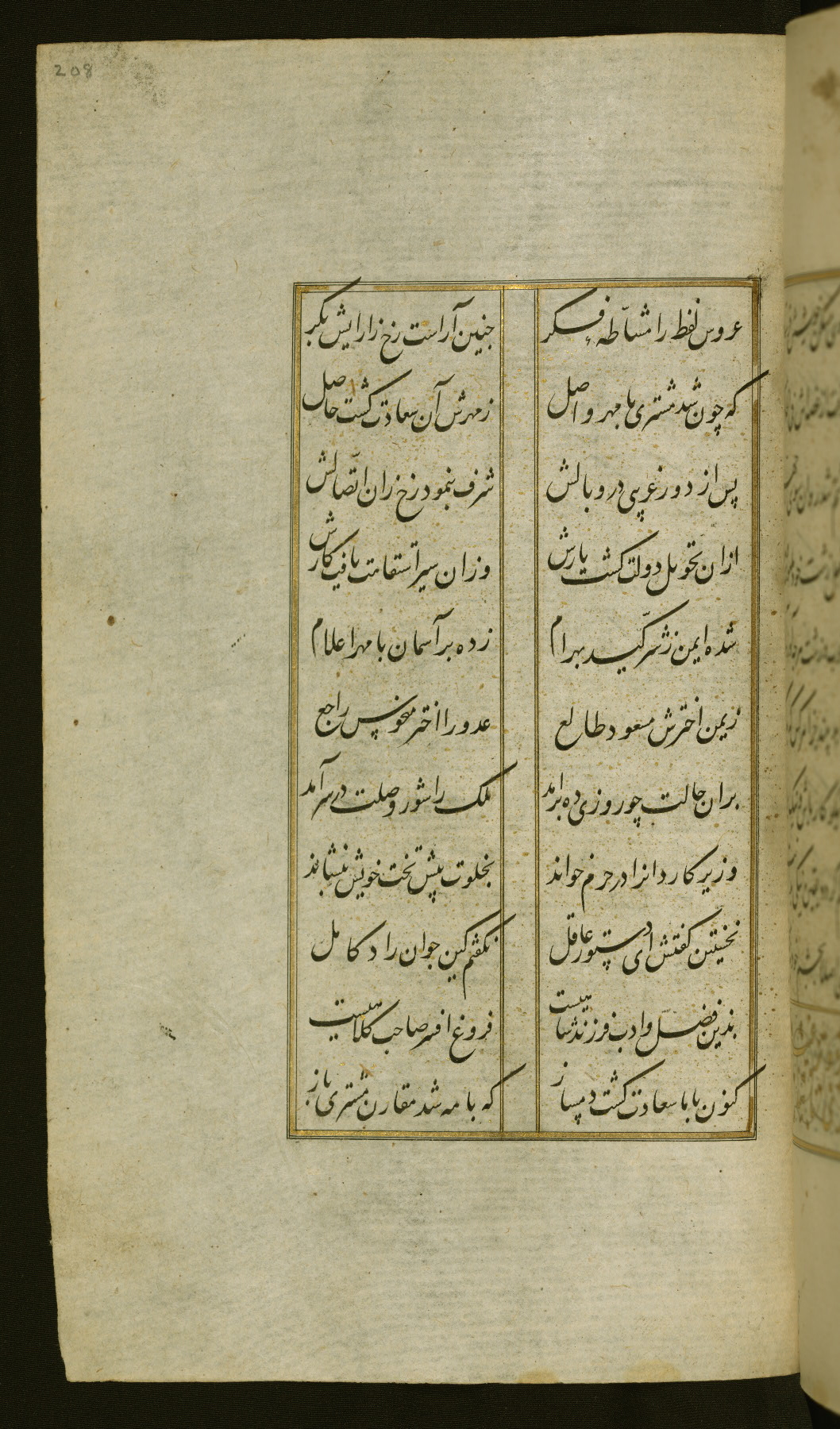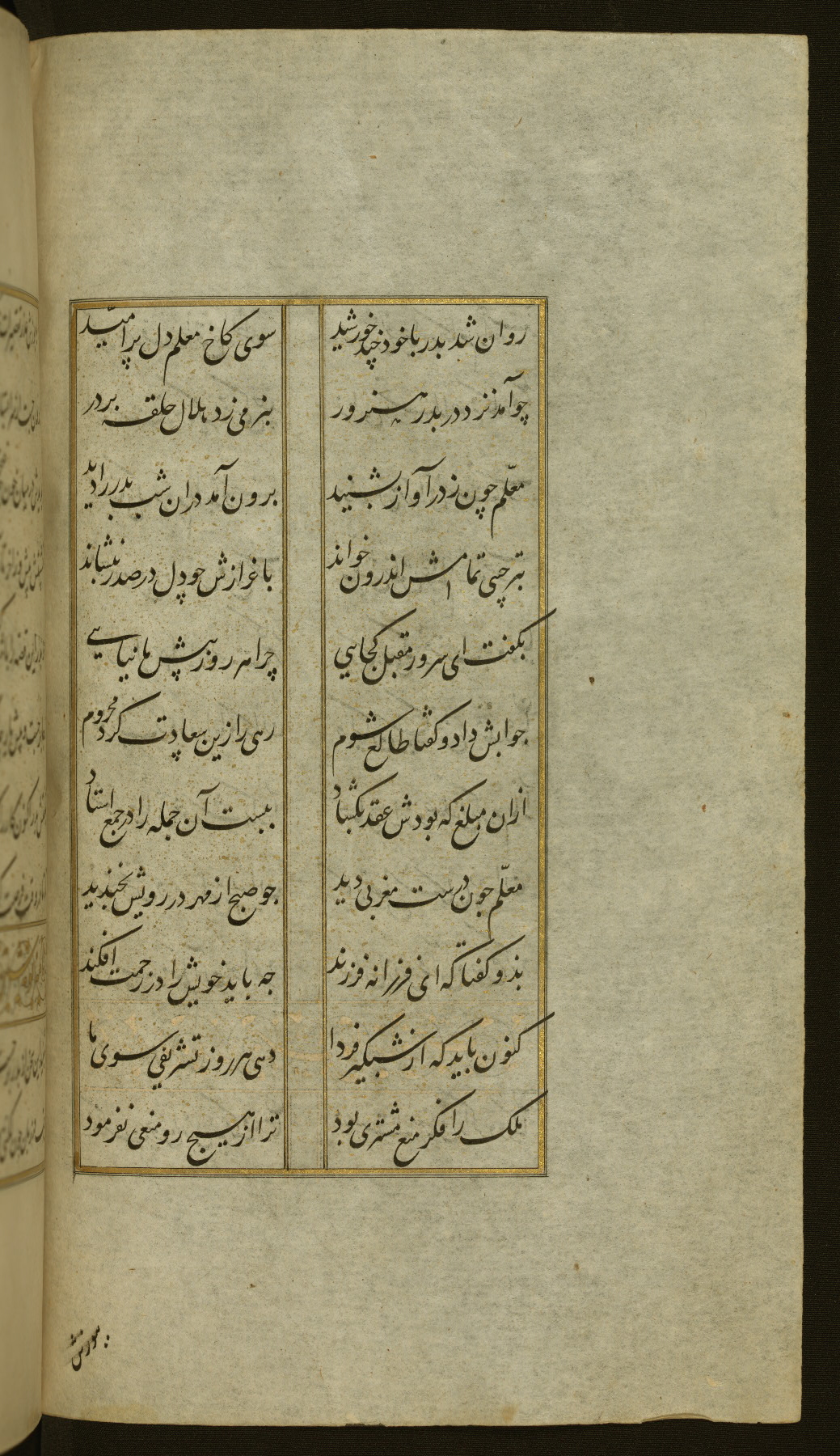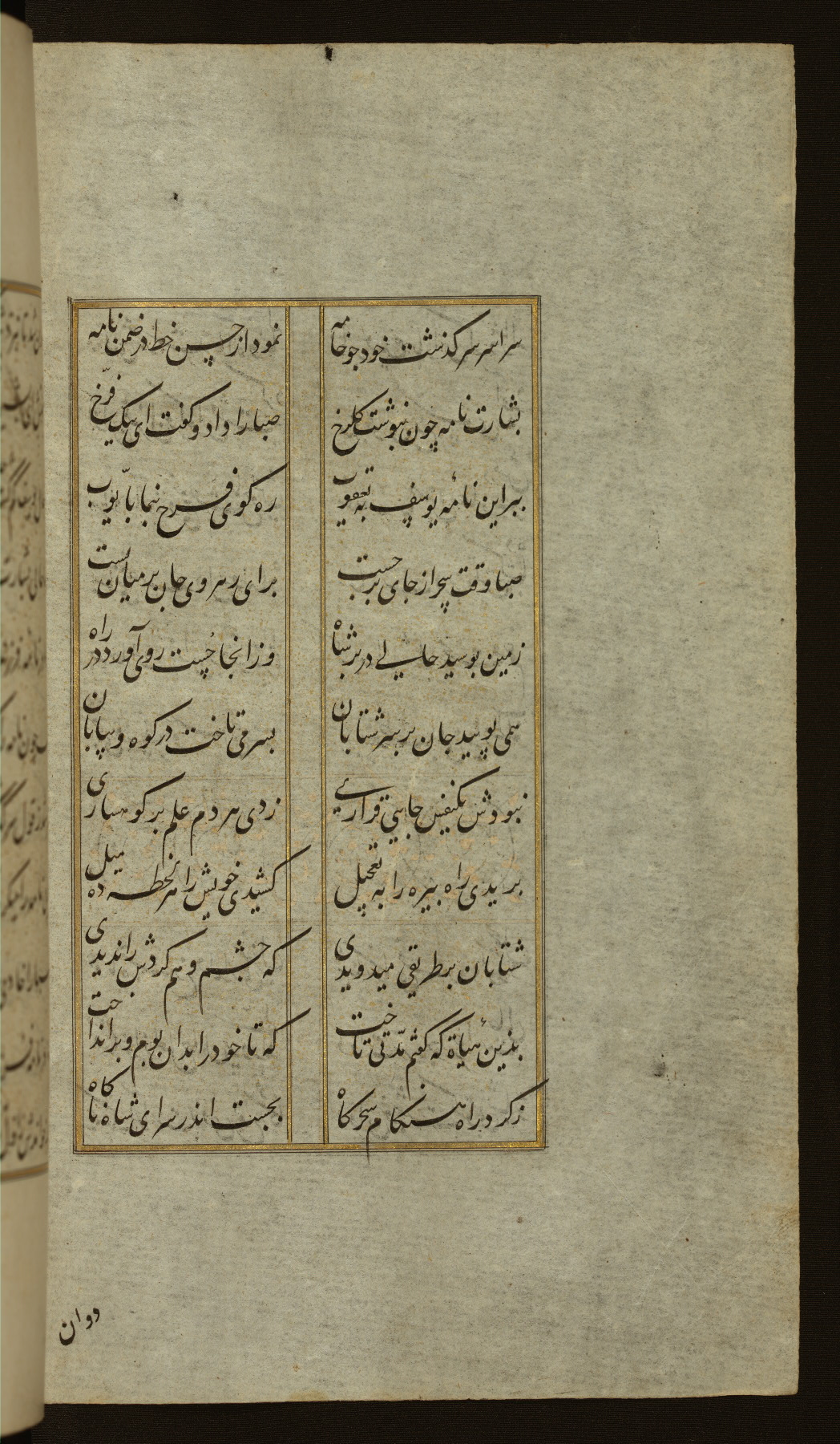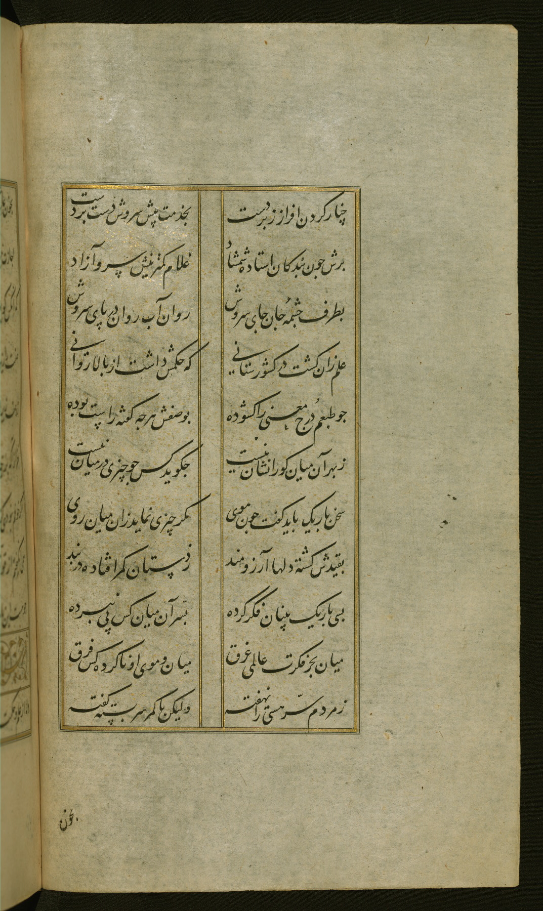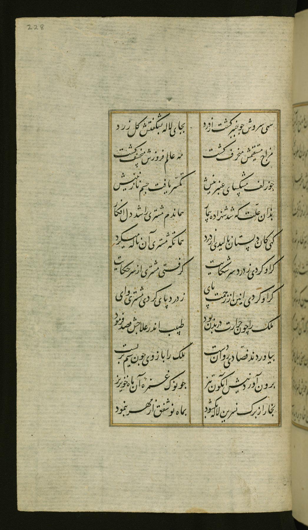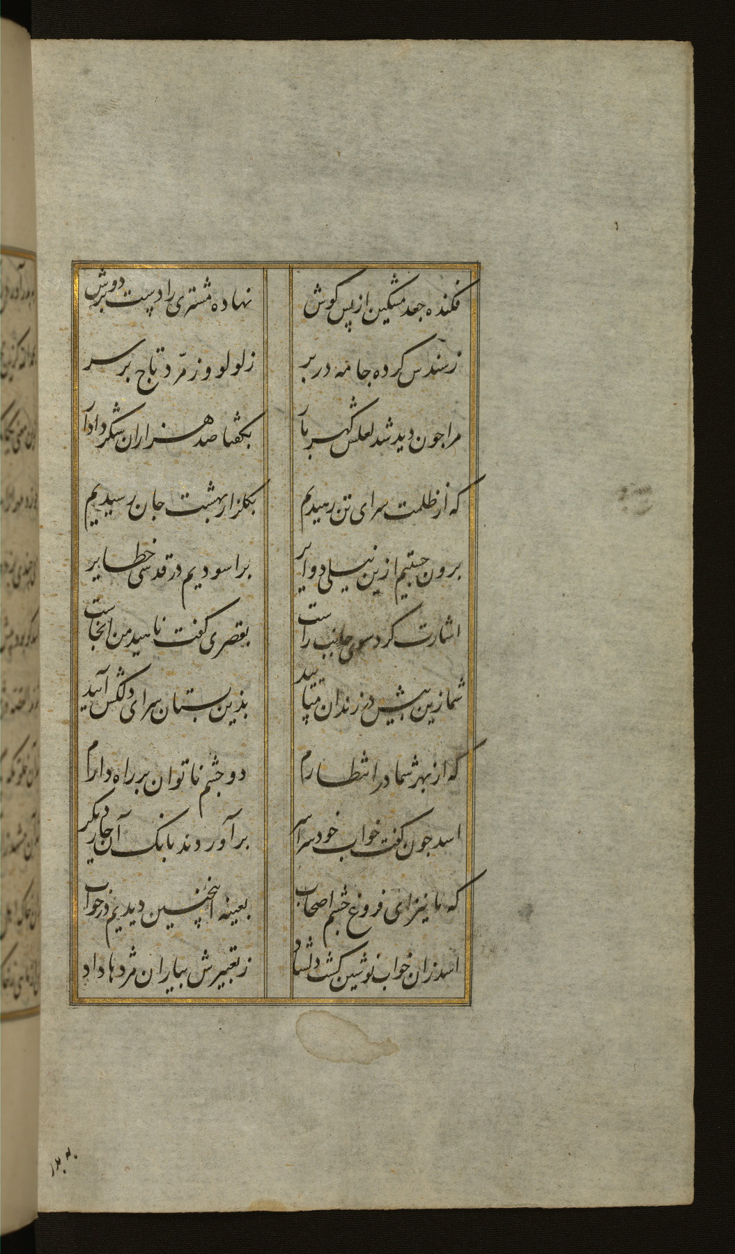 This manuscript is an illustrated copy of the well-known poem recounting the platonic love story between Mihr (the Sun), the son of Shāhpūr, and his vizier's son Mushtarī (Jupiter). The story of 90 chapters was composed by Muḥammad ibn Aḥmad ‘Aṣṣār Tabrīzī (d. 784 AH / 1382 CE). The present copy was written in nasta‘līq script by Murshid al-Kātib in 881 AH / 1476 CE. Considering the number of surviving manuscripts in which this calligrapher’s name is found, it seems he was particularly prolific. The present codex is illustrated with nine paintings. The gold-brushed leather binding with doublures of red leather decorated with filigree work is original to the manuscript.