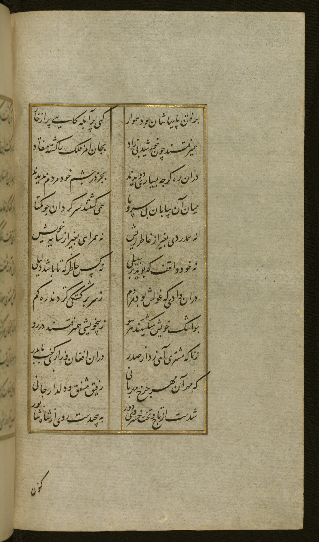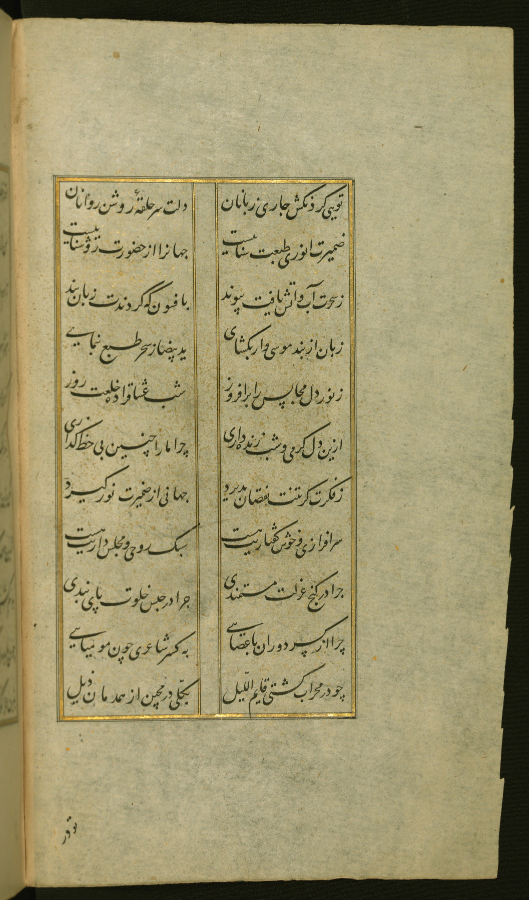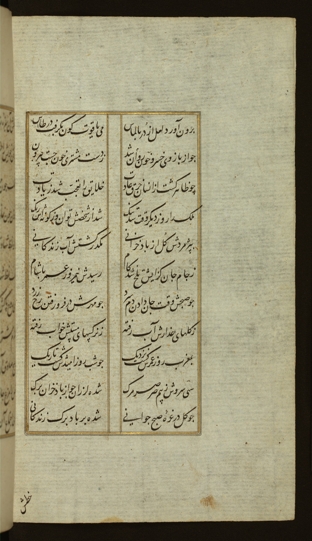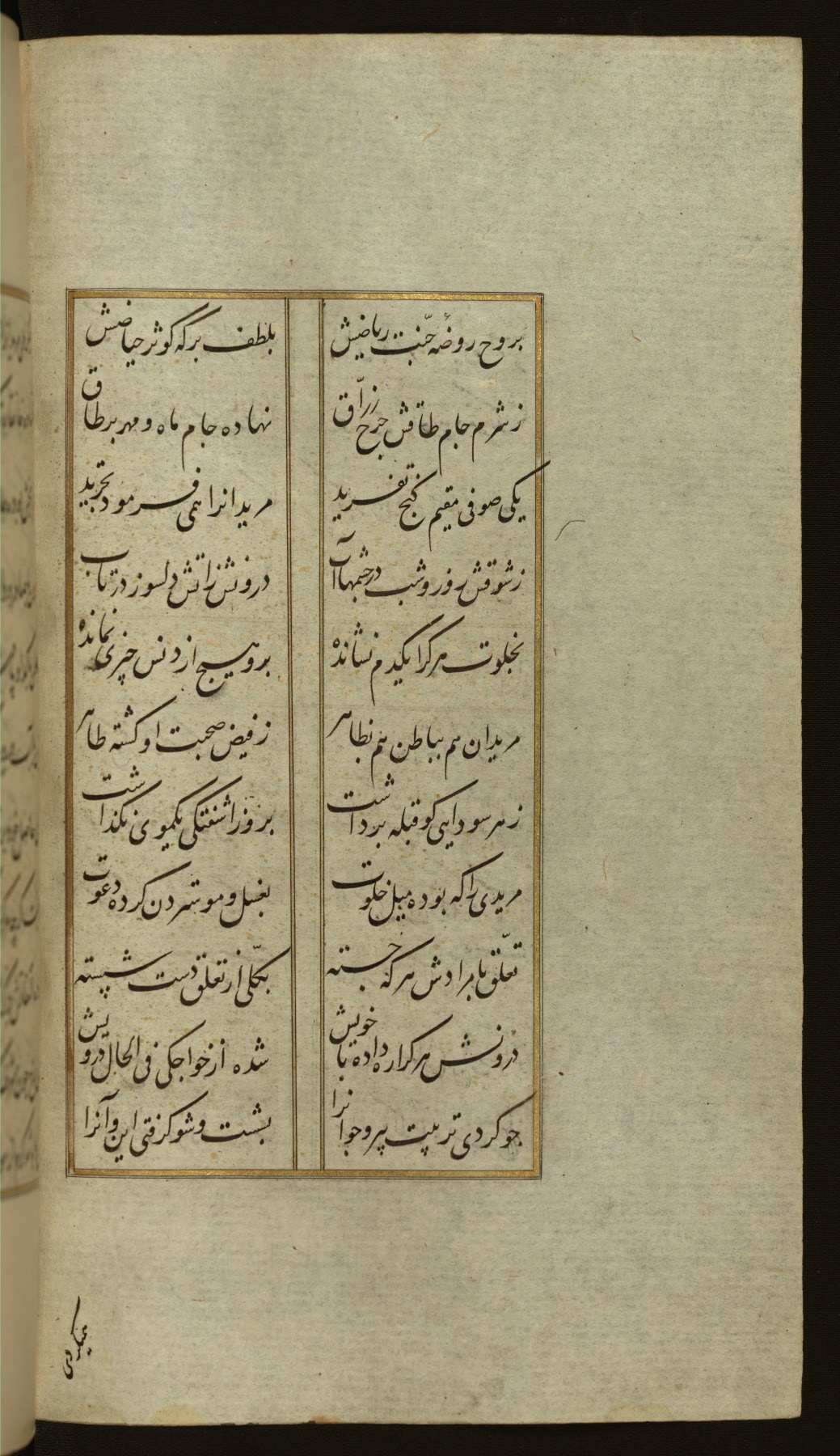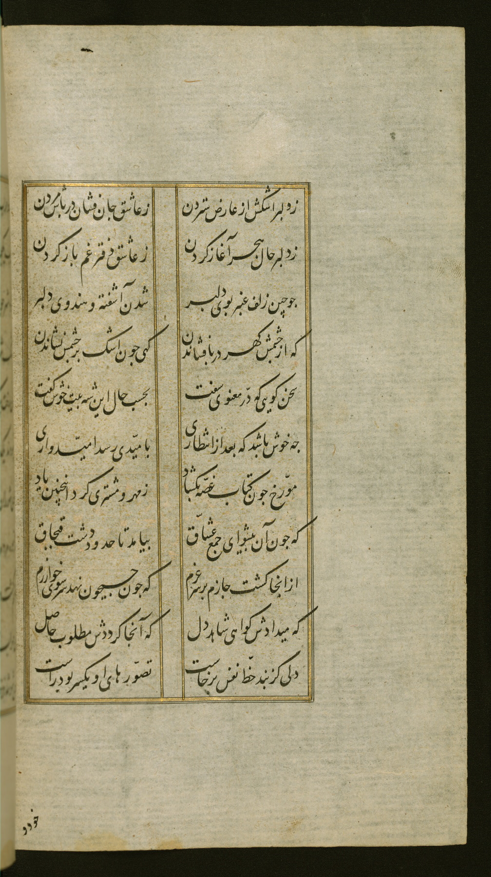 This manuscript is an illustrated copy of the well-known poem recounting the platonic love story between Mihr (the Sun), the son of Shāhpūr, and his vizier's son Mushtarī (Jupiter). The story of 90 chapters was composed by Muḥammad ibn Aḥmad ‘Aṣṣār Tabrīzī (d. 784 AH / 1382 CE). The present copy was written in nasta‘līq script by Murshid al-Kātib in 881 AH / 1476 CE. Considering the number of surviving manuscripts in which this calligrapher’s name is found, it seems he was particularly prolific. The present codex is illustrated with nine paintings. The gold-brushed leather binding with doublures of red leather decorated with filigree work is original to the manuscript.