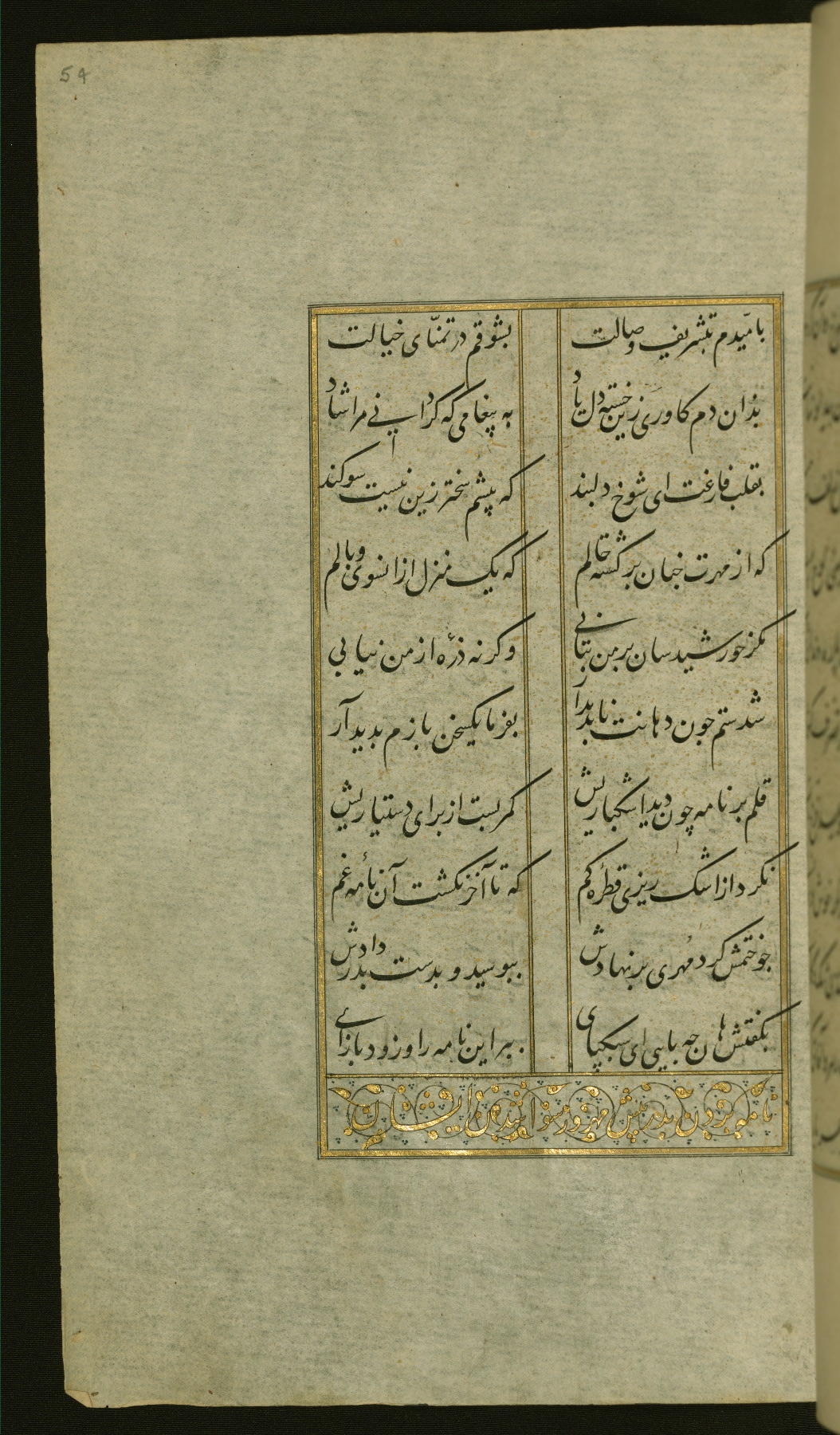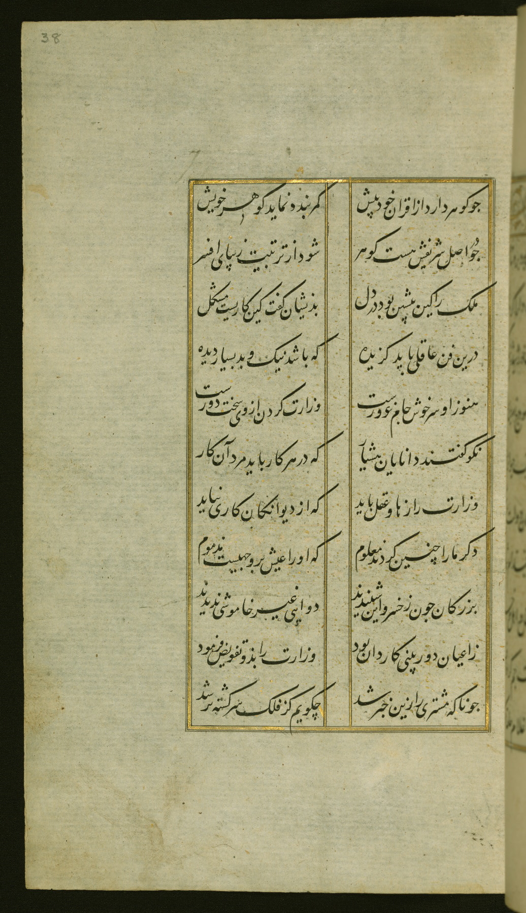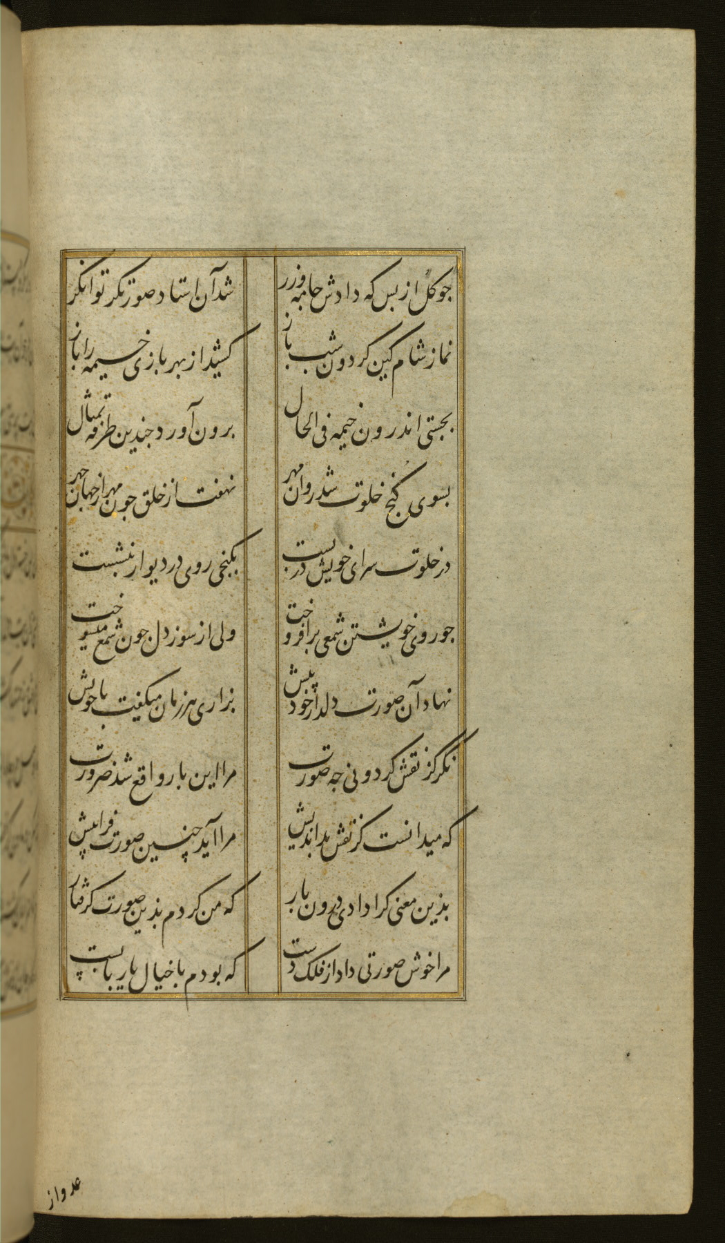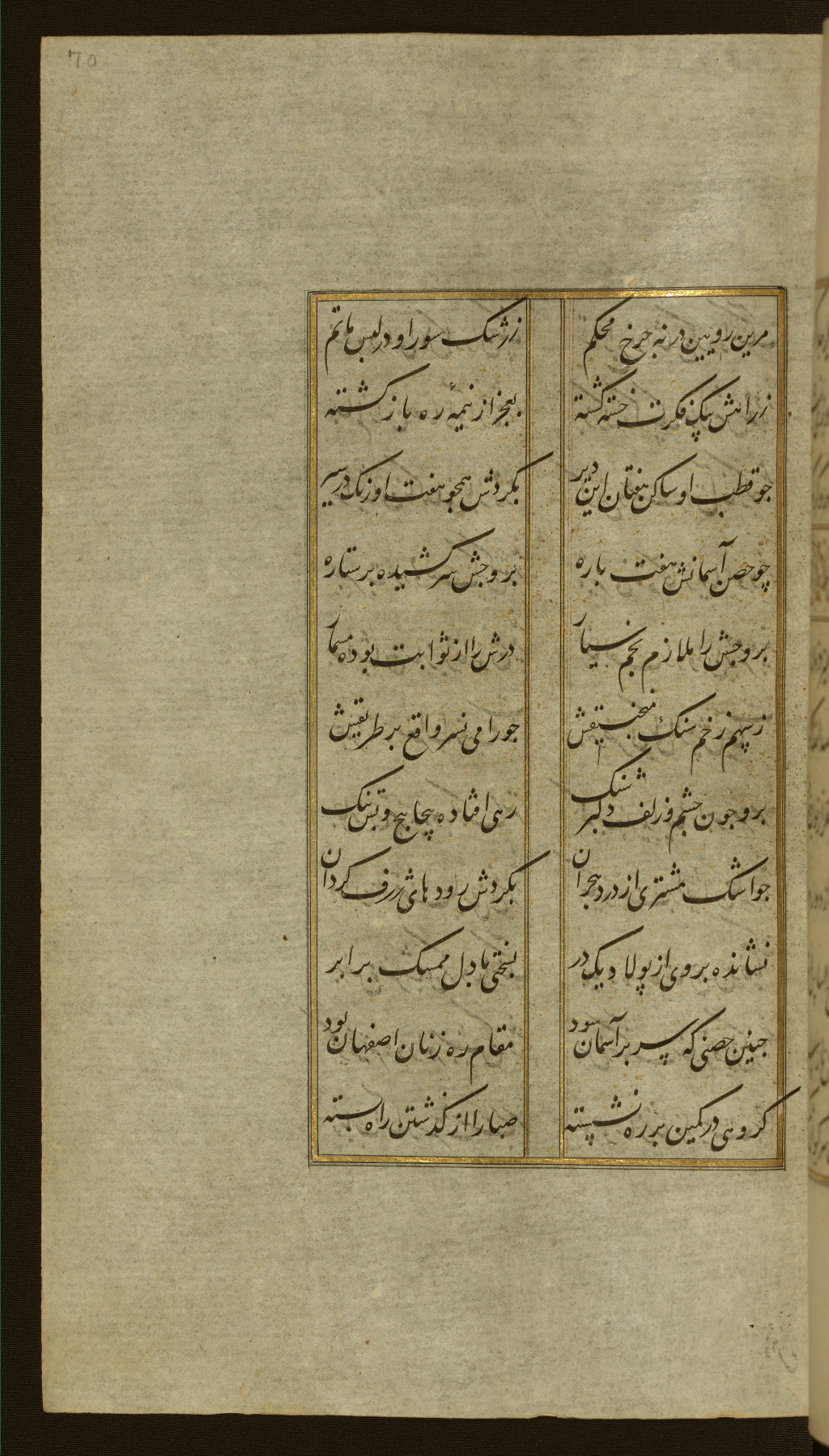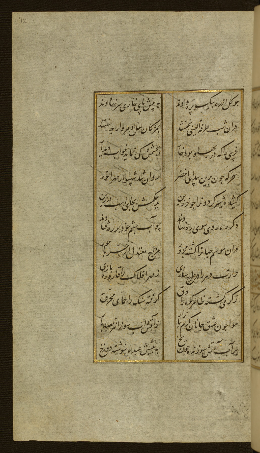 This manuscript is an illustrated copy of the well-known poem recounting the platonic love story between Mihr (the Sun), the son of Shāhpūr, and his vizier's son Mushtarī (Jupiter). The story of 90 chapters was composed by Muḥammad ibn Aḥmad ‘Aṣṣār Tabrīzī (d. 784 AH / 1382 CE). The present copy was written in nasta‘līq script by Murshid al-Kātib in 881 AH / 1476 CE. Considering the number of surviving manuscripts in which this calligrapher’s name is found, it seems he was particularly prolific. The present codex is illustrated with nine paintings. The gold-brushed leather binding with doublures of red leather decorated with filigree work is original to the manuscript.