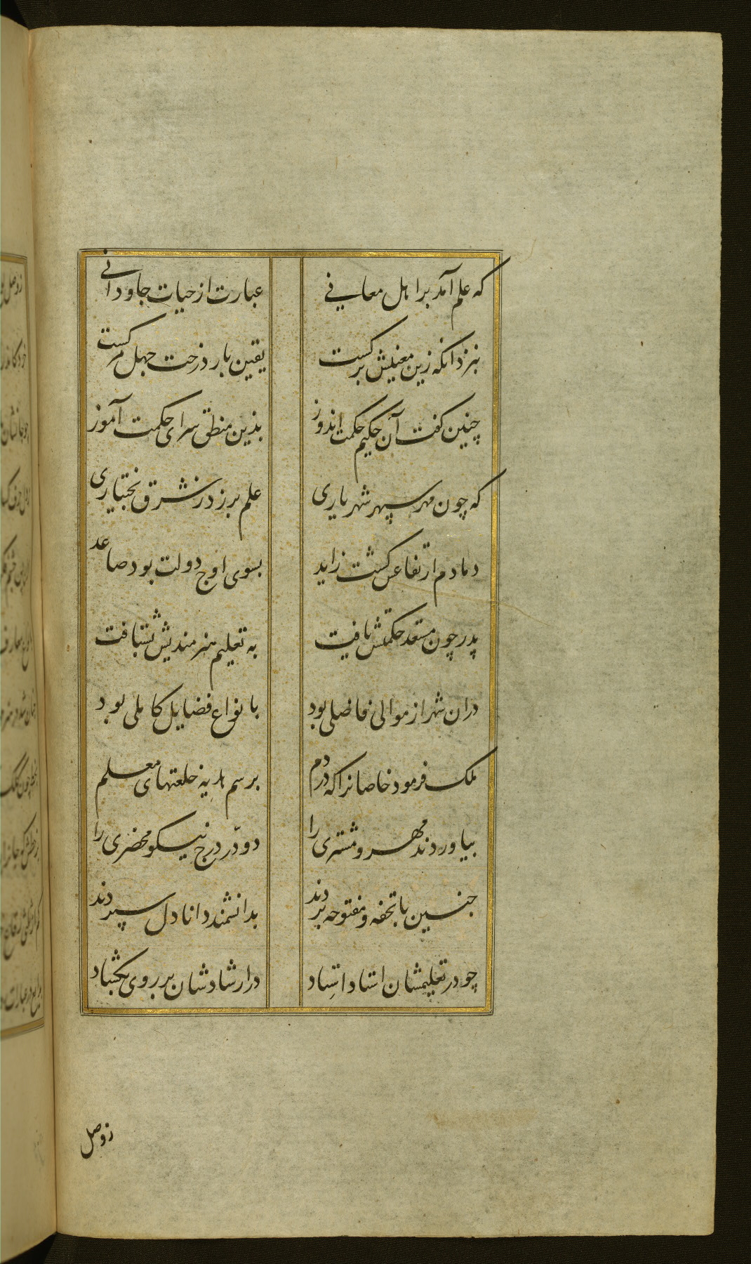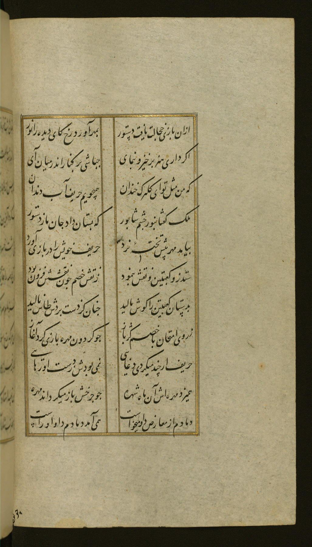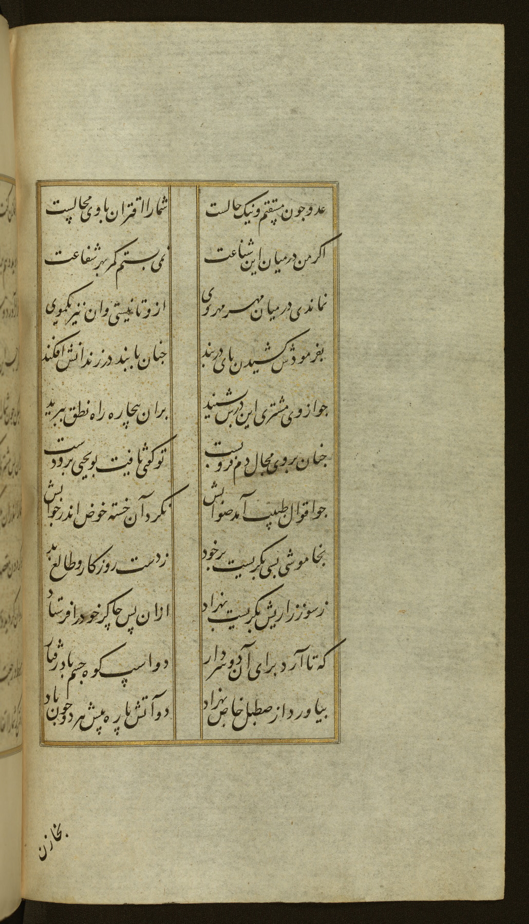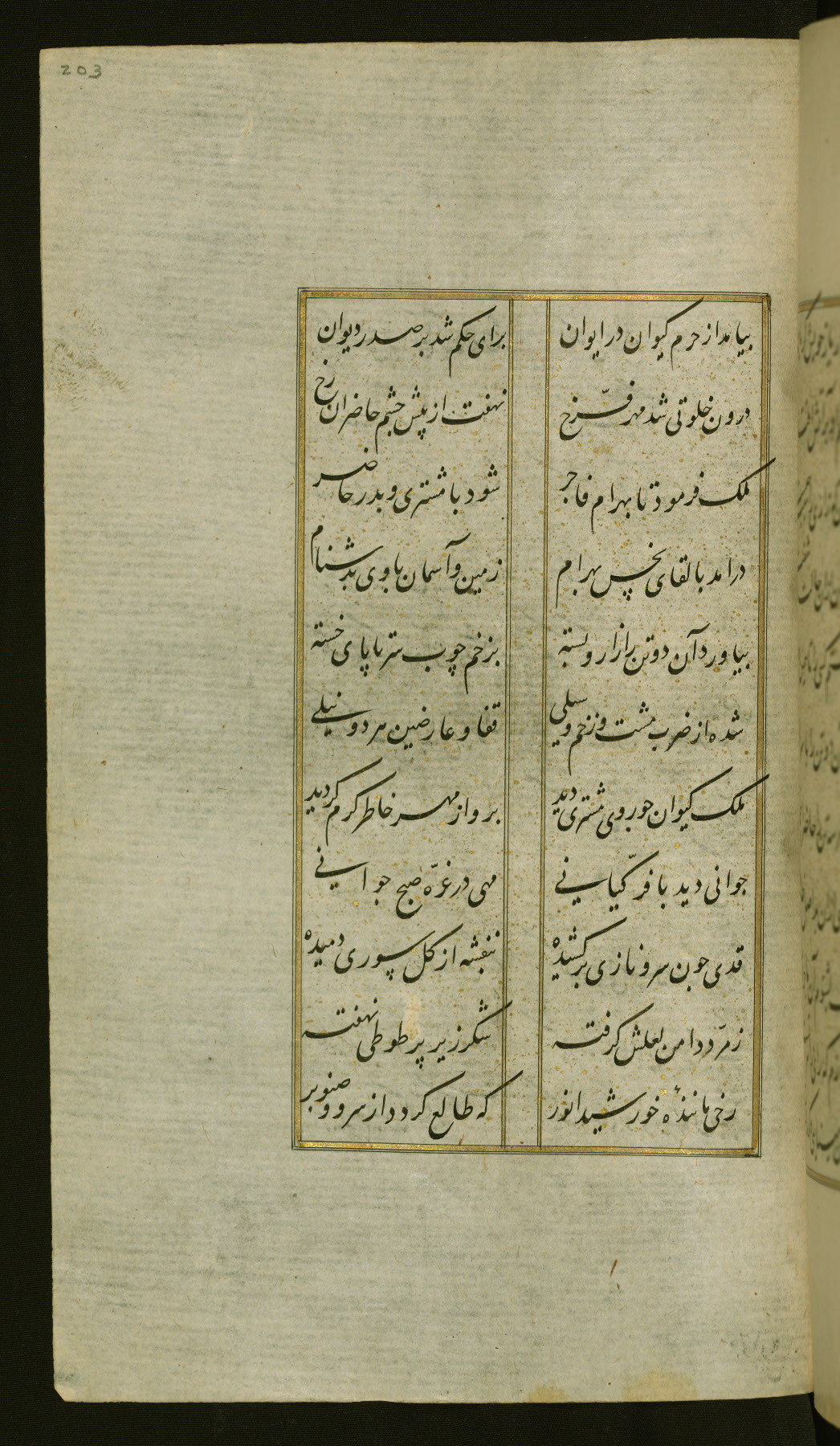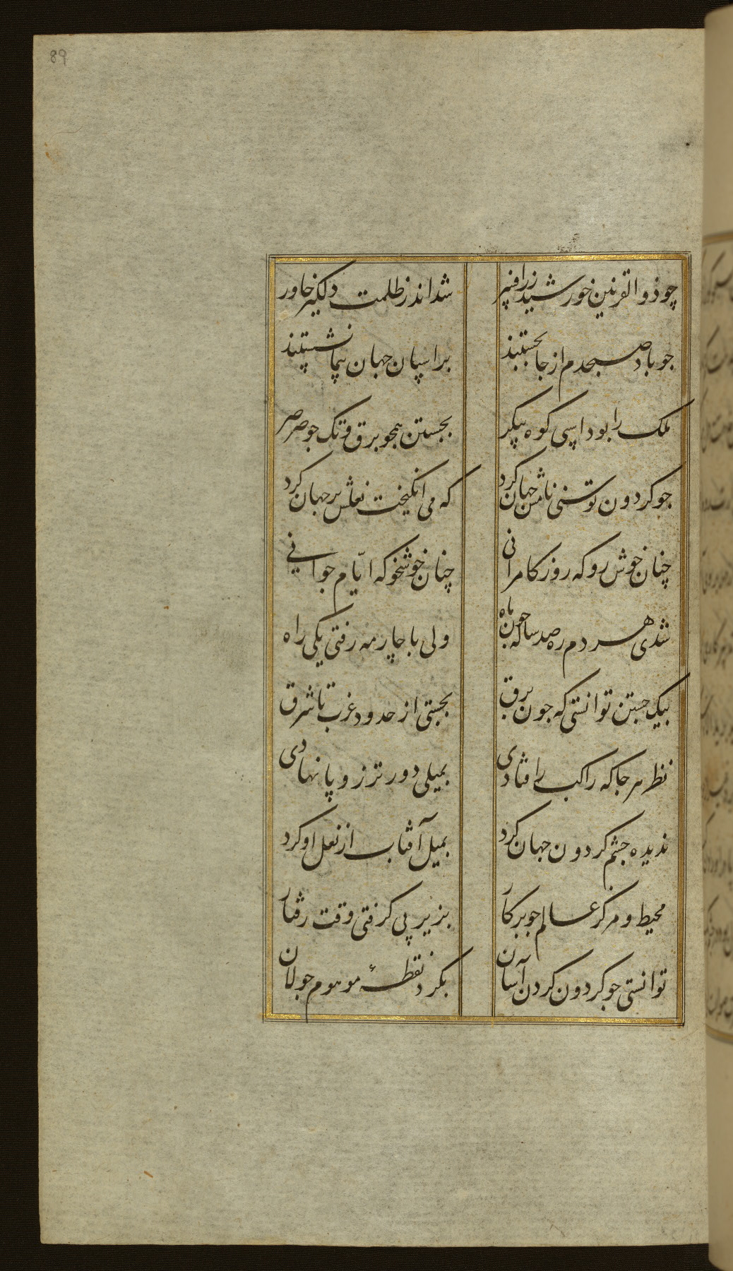 This manuscript is an illustrated copy of the well-known poem recounting the platonic love story between Mihr (the Sun), the son of Shāhpūr, and his vizier's son Mushtarī (Jupiter). The story of 90 chapters was composed by Muḥammad ibn Aḥmad ‘Aṣṣār Tabrīzī (d. 784 AH / 1382 CE). The present copy was written in nasta‘līq script by Murshid al-Kātib in 881 AH / 1476 CE. Considering the number of surviving manuscripts in which this calligrapher’s name is found, it seems he was particularly prolific. The present codex is illustrated with nine paintings. The gold-brushed leather binding with doublures of red leather decorated with filigree work is original to the manuscript.