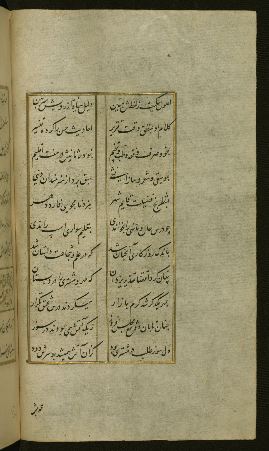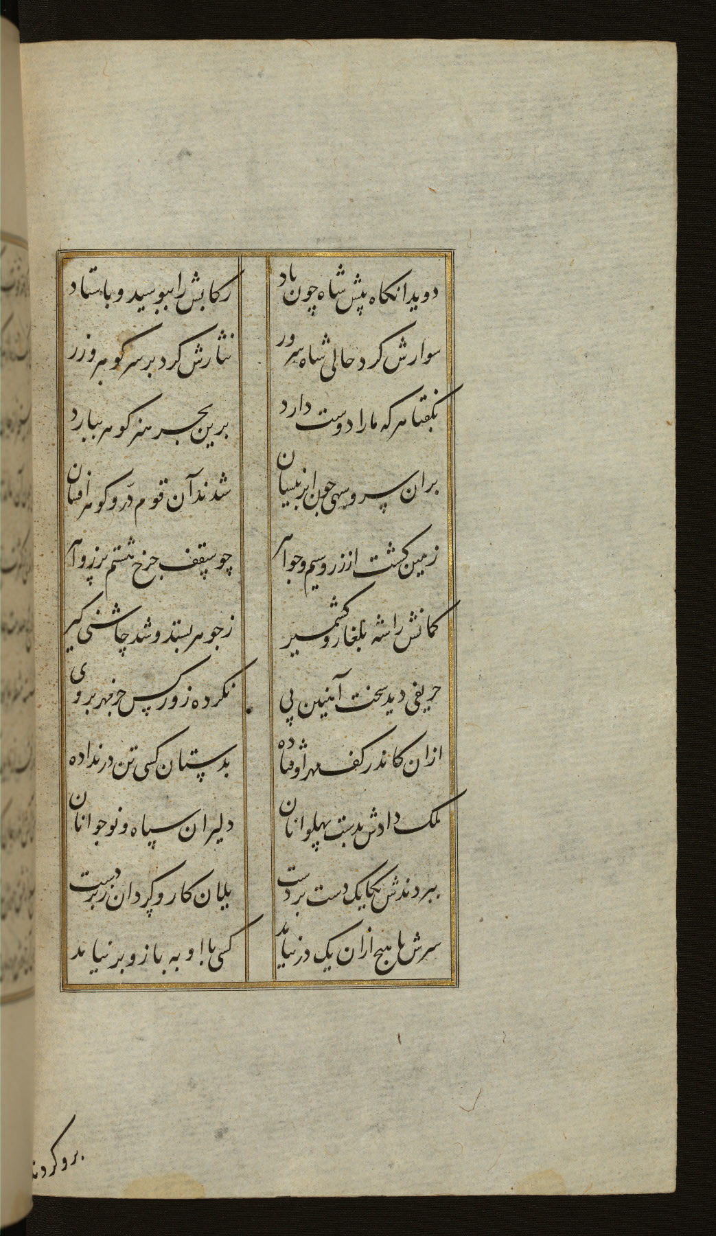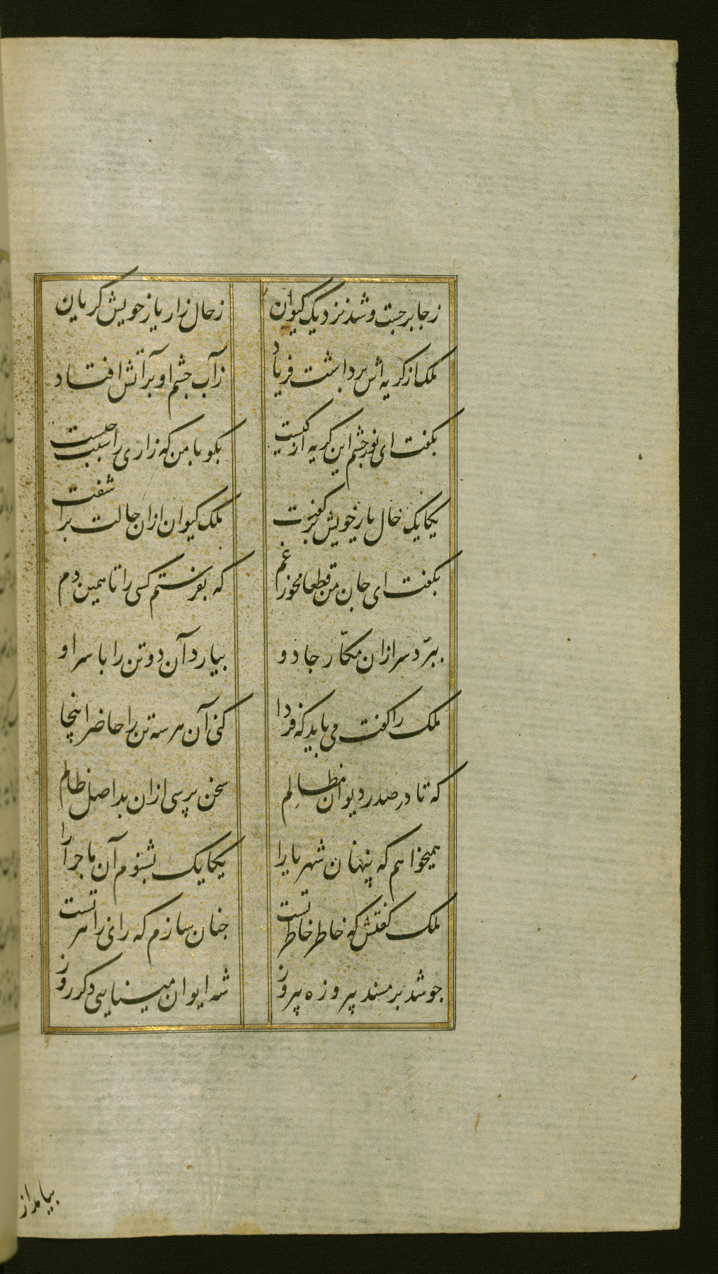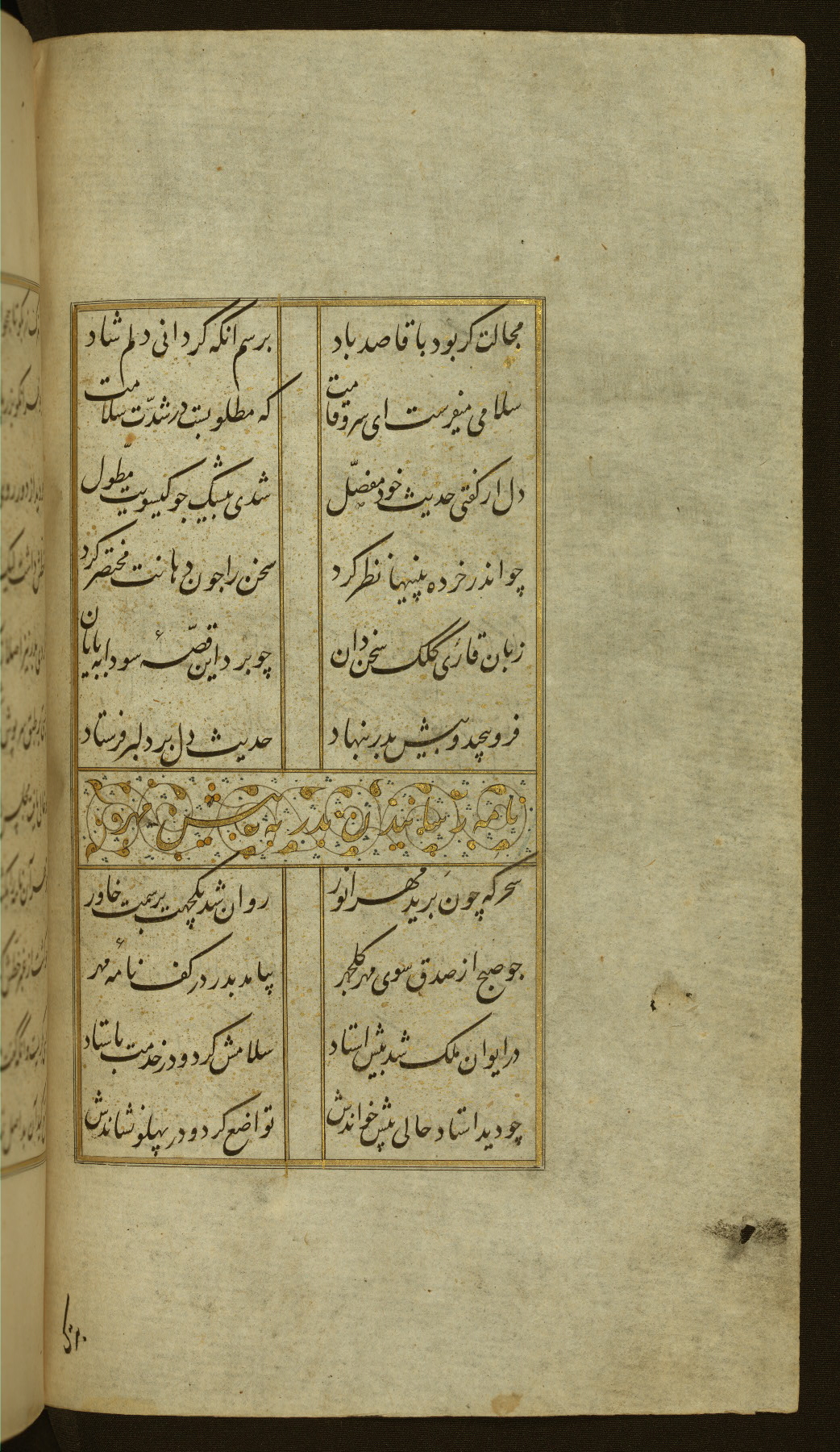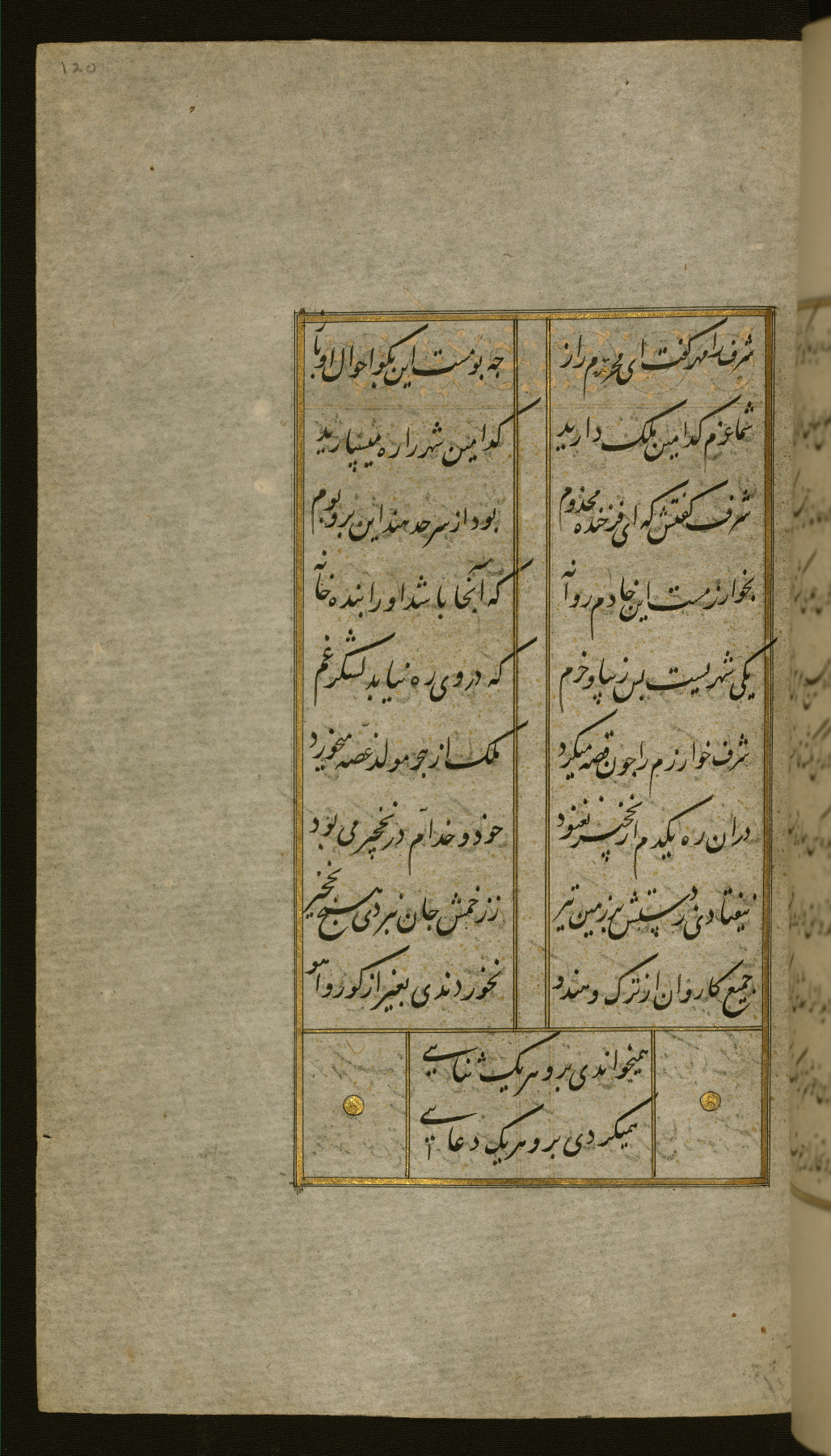 This manuscript is an illustrated copy of the well-known poem recounting the platonic love story between Mihr (the Sun), the son of Shāhpūr, and his vizier's son Mushtarī (Jupiter). The story of 90 chapters was composed by Muḥammad ibn Aḥmad ‘Aṣṣār Tabrīzī (d. 784 AH / 1382 CE). The present copy was written in nasta‘līq script by Murshid al-Kātib in 881 AH / 1476 CE. Considering the number of surviving manuscripts in which this calligrapher’s name is found, it seems he was particularly prolific. The present codex is illustrated with nine paintings. The gold-brushed leather binding with doublures of red leather decorated with filigree work is original to the manuscript.
