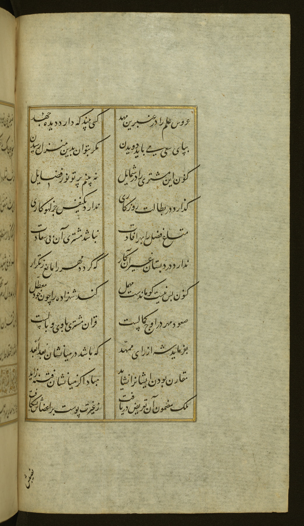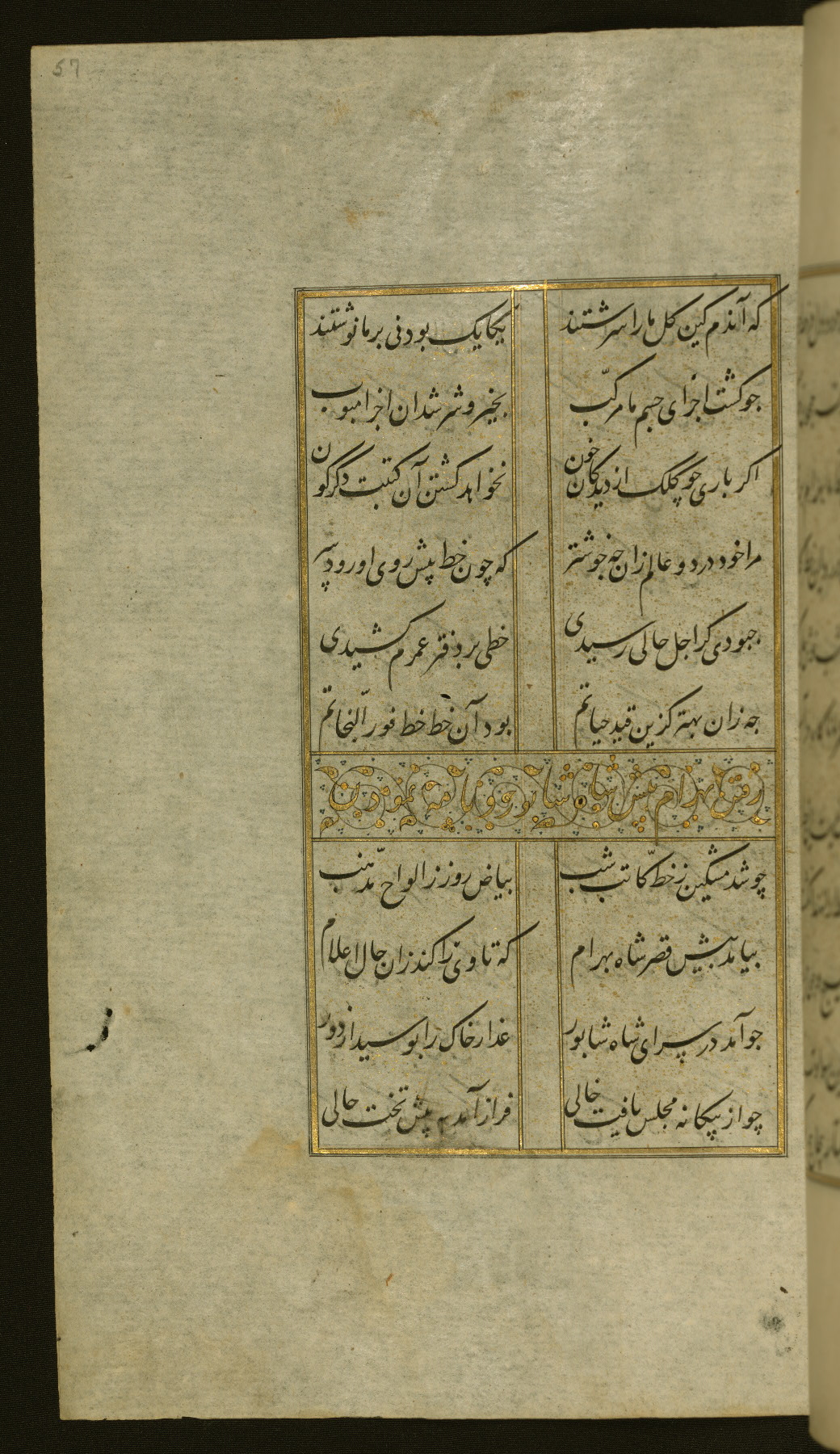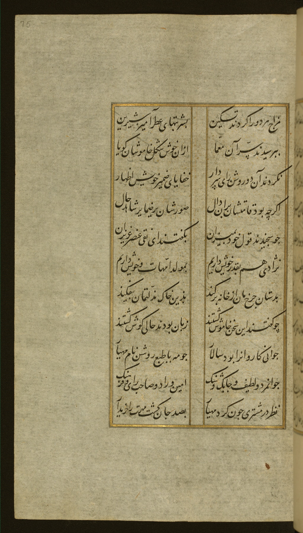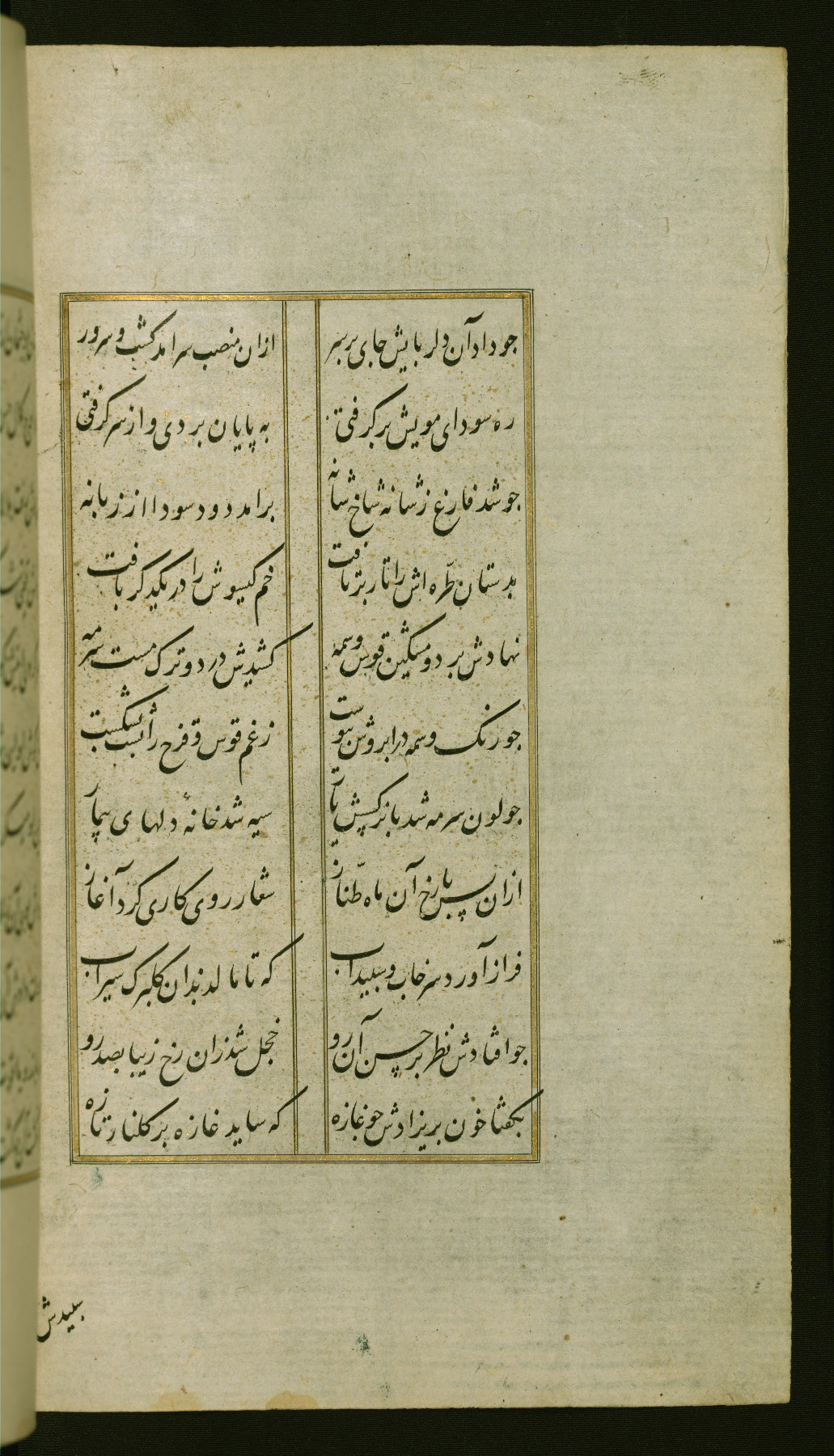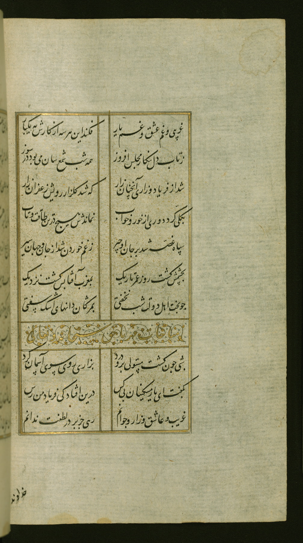 This manuscript is an illustrated copy of the well-known poem recounting the platonic love story between Mihr (the Sun), the son of Shāhpūr, and his vizier's son Mushtarī (Jupiter). The story of 90 chapters was composed by Muḥammad ibn Aḥmad ‘Aṣṣār Tabrīzī (d. 784 AH / 1382 CE). The present copy was written in nasta‘līq script by Murshid al-Kātib in 881 AH / 1476 CE. Considering the number of surviving manuscripts in which this calligrapher’s name is found, it seems he was particularly prolific. The present codex is illustrated with nine paintings. The gold-brushed leather binding with doublures of red leather decorated with filigree work is original to the manuscript.