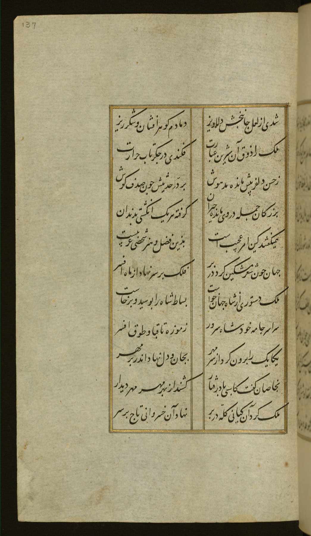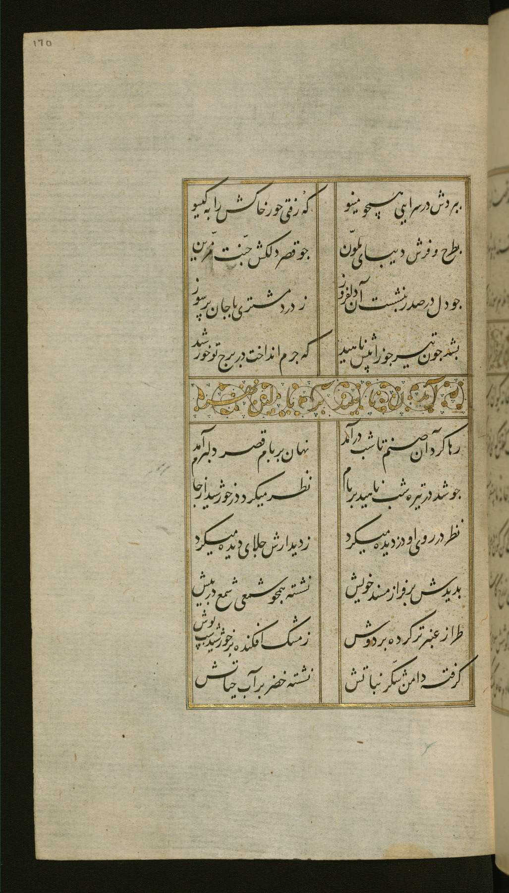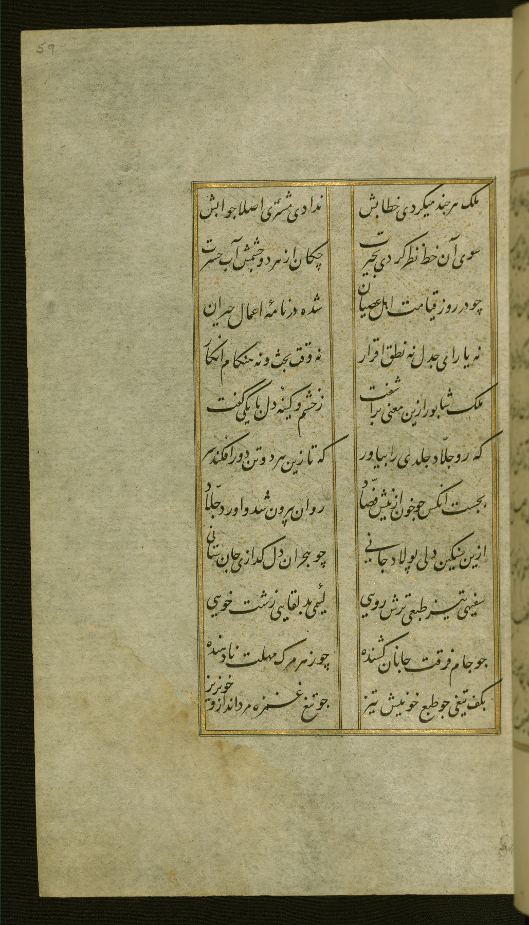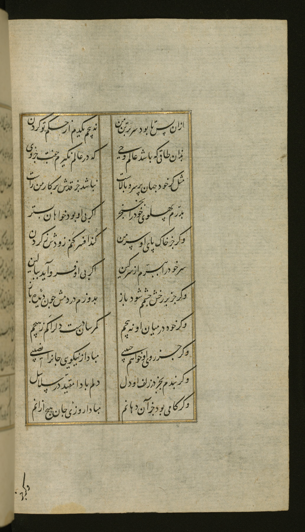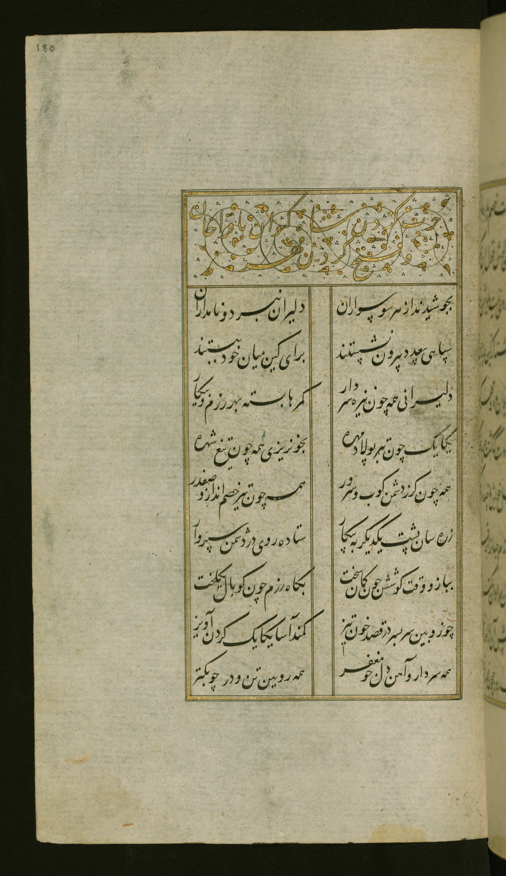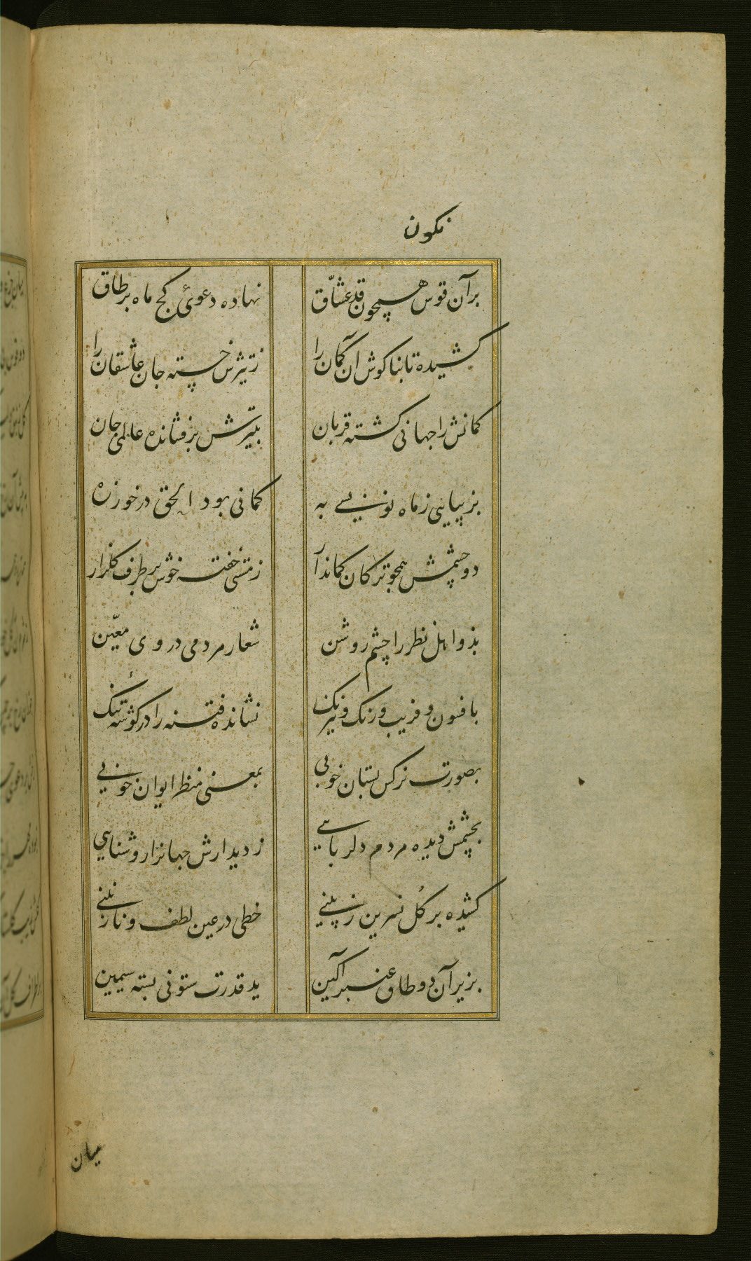 This manuscript is an illustrated copy of the well-known poem recounting the platonic love story between Mihr (the Sun), the son of Shāhpūr, and his vizier's son Mushtarī (Jupiter). The story of 90 chapters was composed by Muḥammad ibn Aḥmad ‘Aṣṣār Tabrīzī (d. 784 AH / 1382 CE). The present copy was written in nasta‘līq script by Murshid al-Kātib in 881 AH / 1476 CE. Considering the number of surviving manuscripts in which this calligrapher’s name is found, it seems he was particularly prolific. The present codex is illustrated with nine paintings. The gold-brushed leather binding with doublures of red leather decorated with filigree work is original to the manuscript.