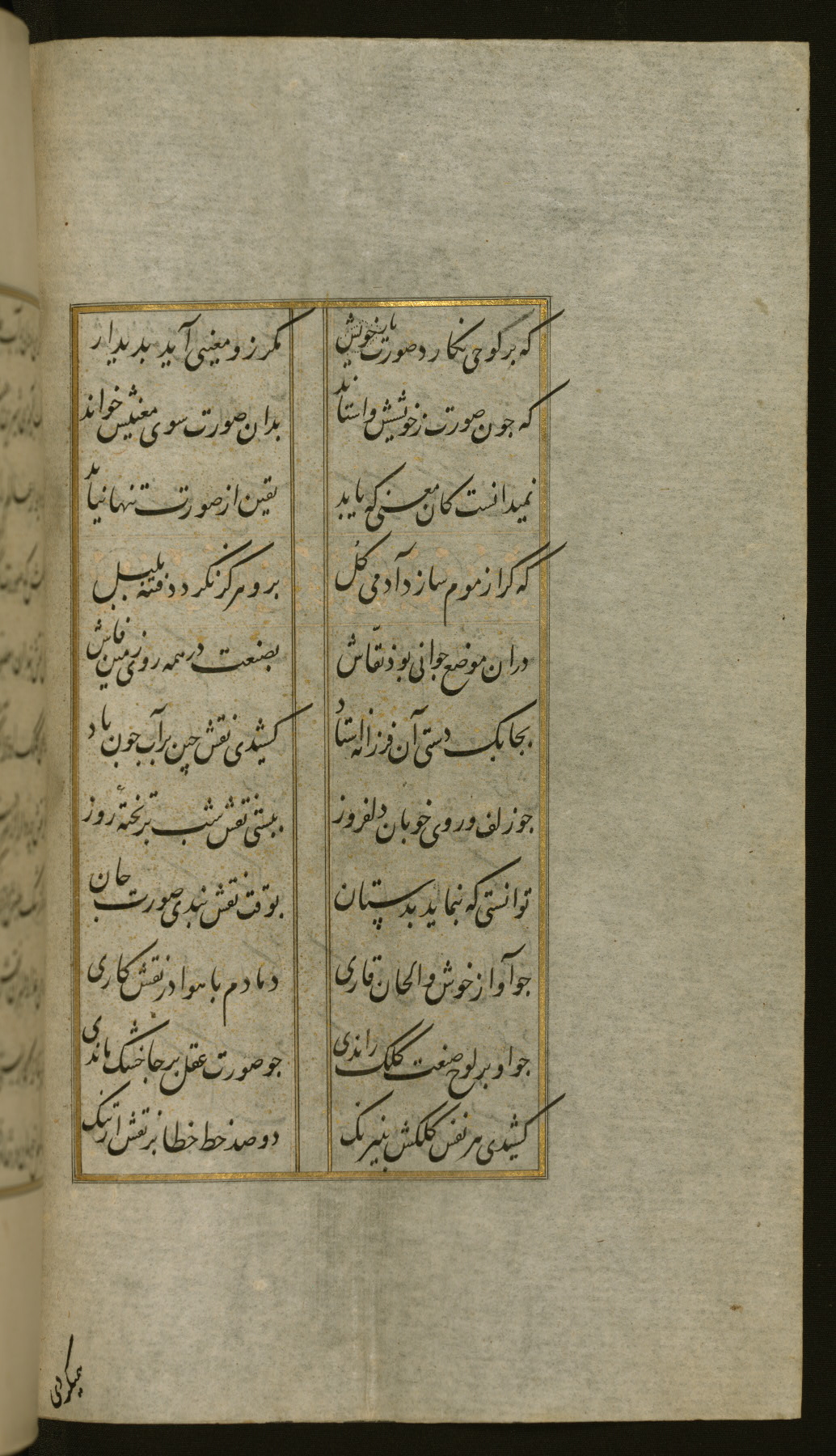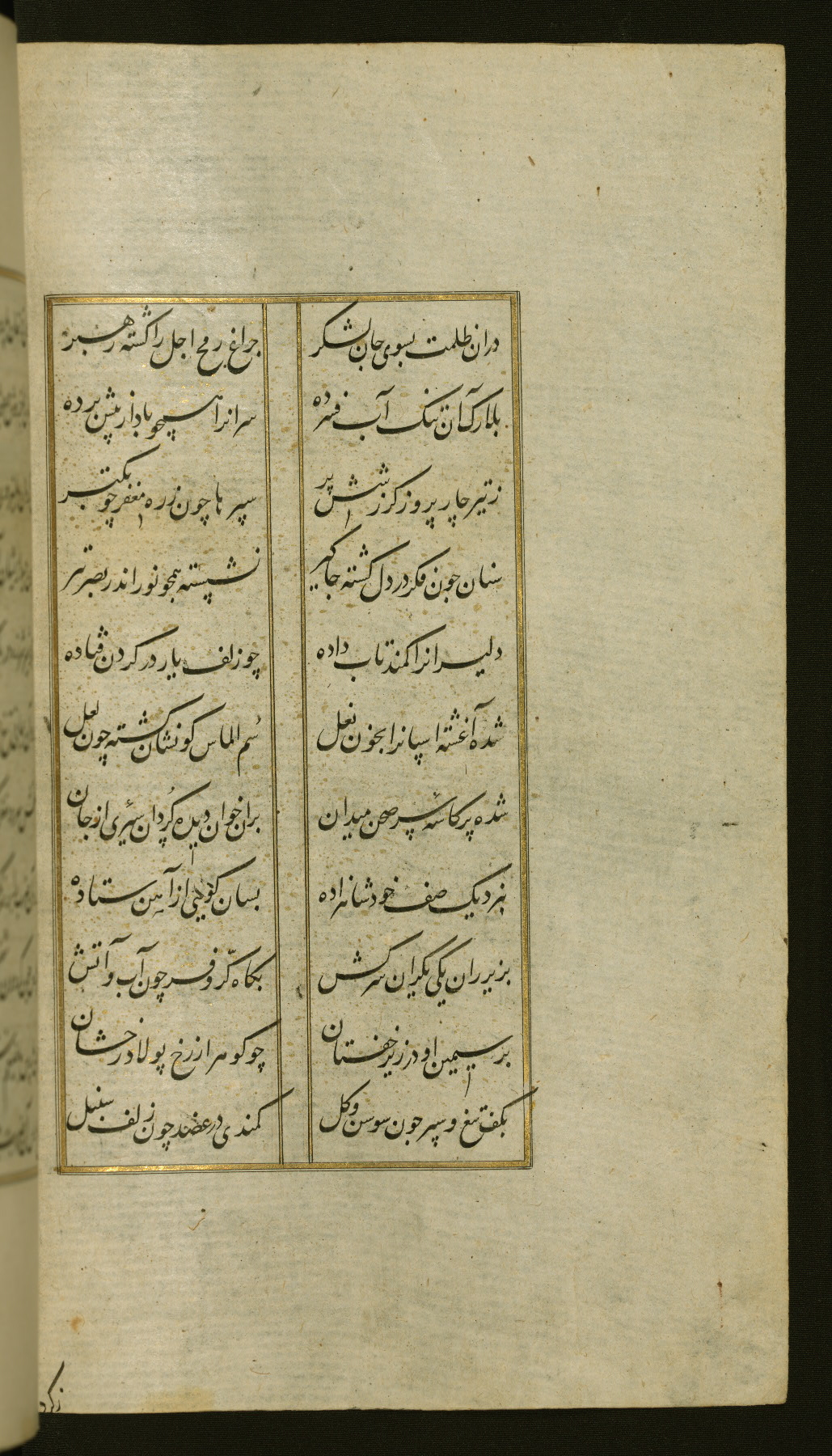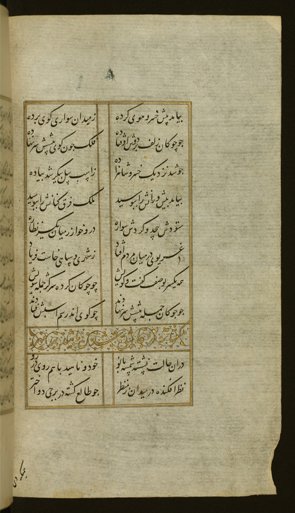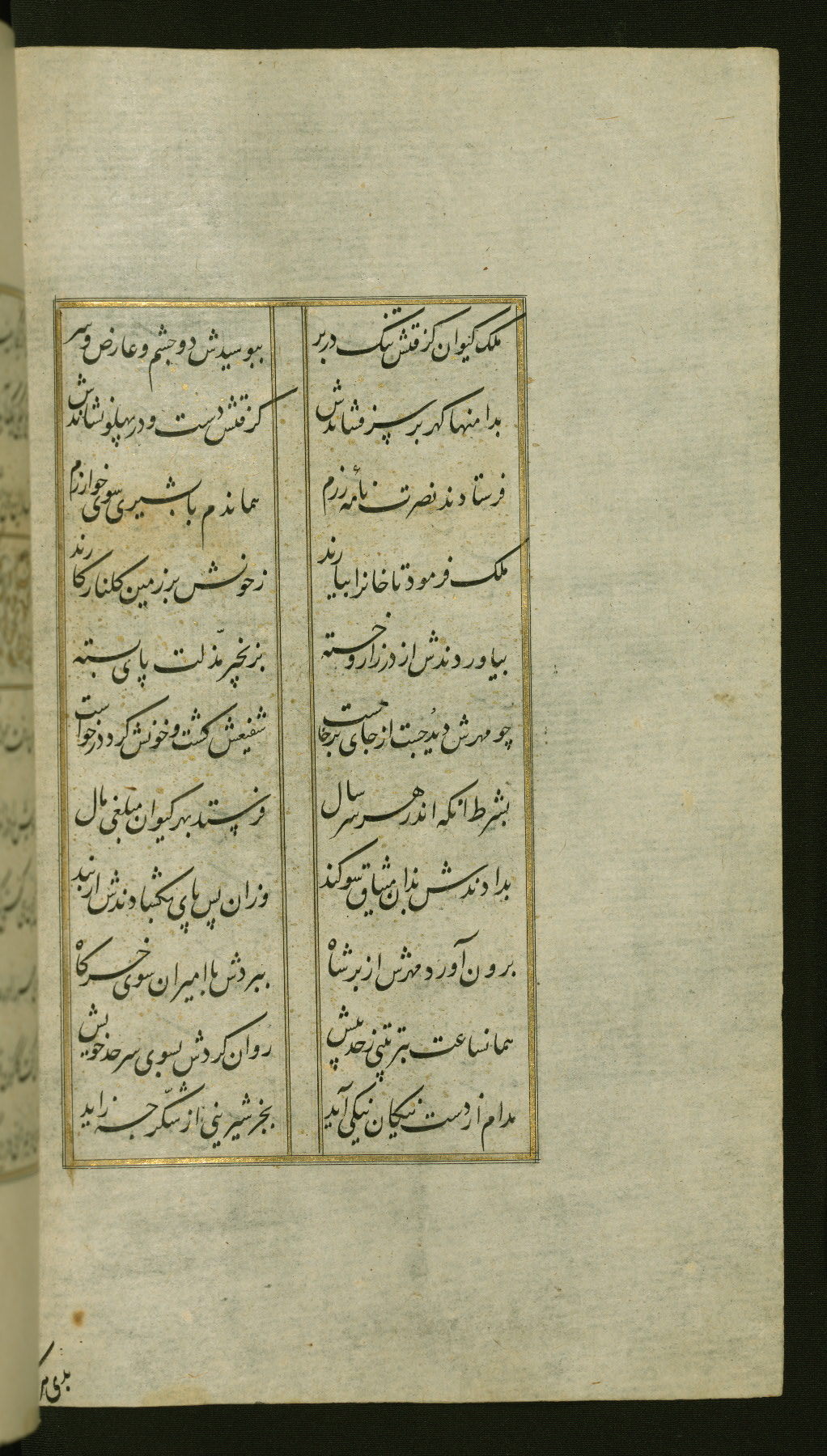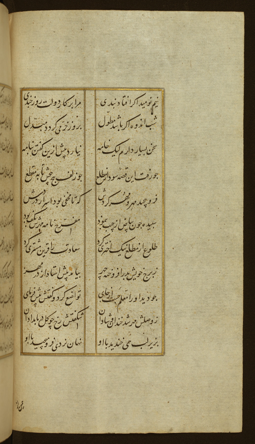 This manuscript is an illustrated copy of the well-known poem recounting the platonic love story between Mihr (the Sun), the son of Shāhpūr, and his vizier's son Mushtarī (Jupiter). The story of 90 chapters was composed by Muḥammad ibn Aḥmad ‘Aṣṣār Tabrīzī (d. 784 AH / 1382 CE). The present copy was written in nasta‘līq script by Murshid al-Kātib in 881 AH / 1476 CE. Considering the number of surviving manuscripts in which this calligrapher’s name is found, it seems he was particularly prolific. The present codex is illustrated with nine paintings. The gold-brushed leather binding with doublures of red leather decorated with filigree work is original to the manuscript.