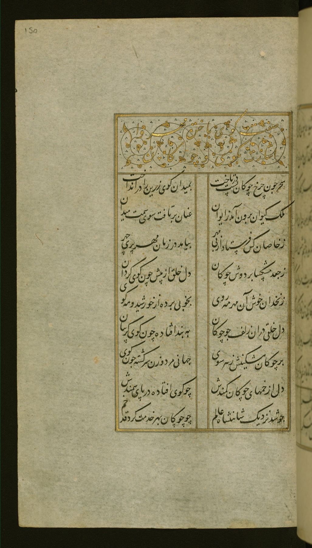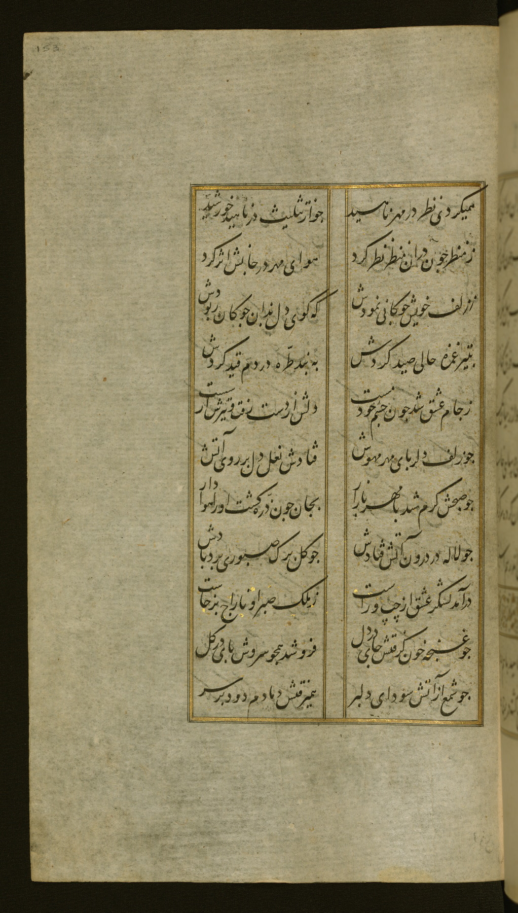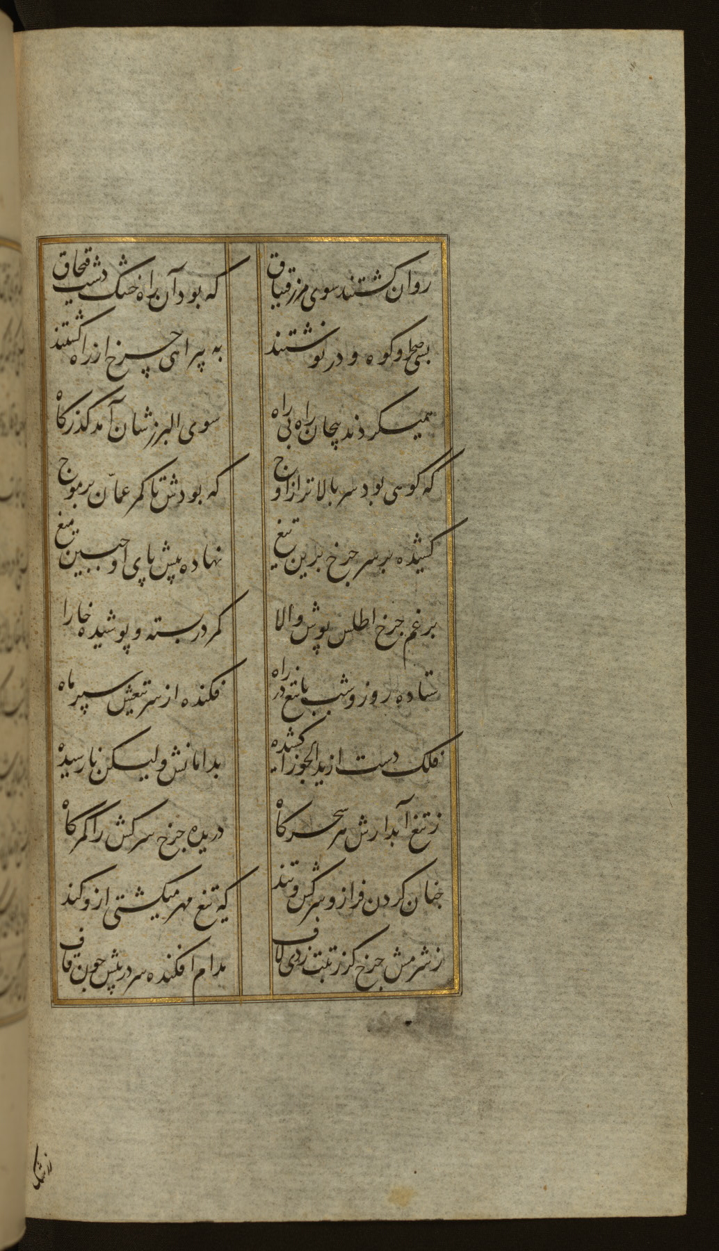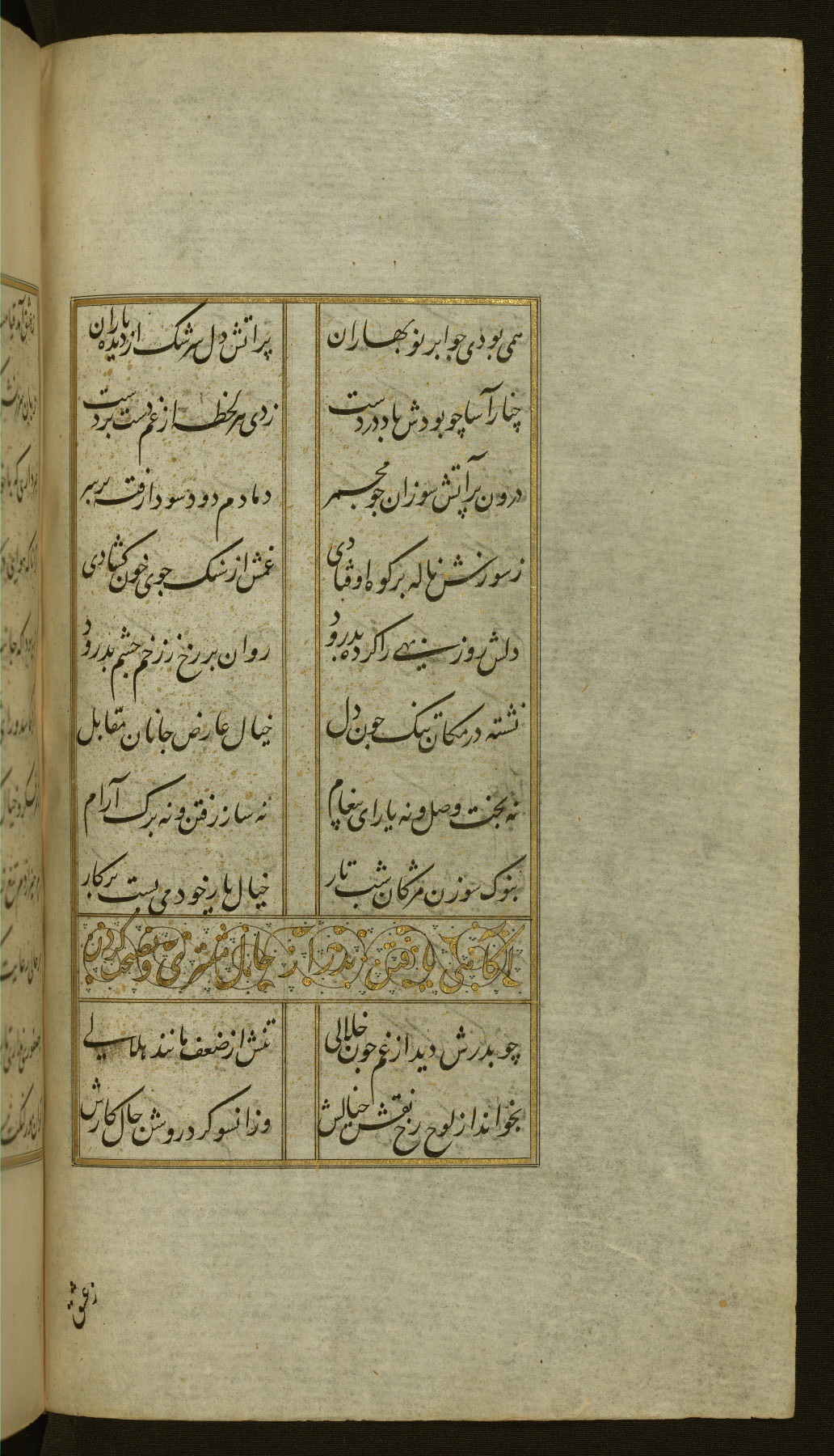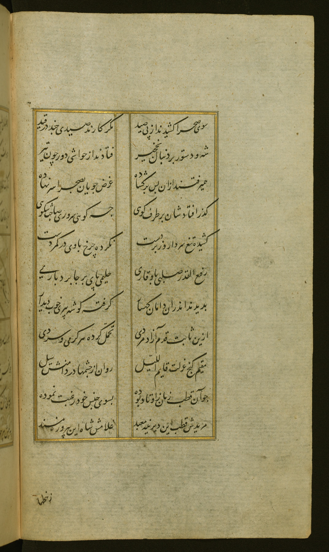 This manuscript is an illustrated copy of the well-known poem recounting the platonic love story between Mihr (the Sun), the son of Shāhpūr, and his vizier's son Mushtarī (Jupiter). The story of 90 chapters was composed by Muḥammad ibn Aḥmad ‘Aṣṣār Tabrīzī (d. 784 AH / 1382 CE). The present copy was written in nasta‘līq script by Murshid al-Kātib in 881 AH / 1476 CE. Considering the number of surviving manuscripts in which this calligrapher’s name is found, it seems he was particularly prolific. The present codex is illustrated with nine paintings. The gold-brushed leather binding with doublures of red leather decorated with filigree work is original to the manuscript.