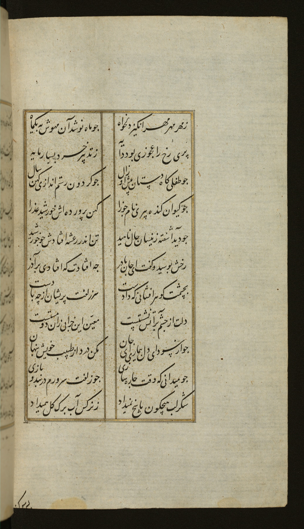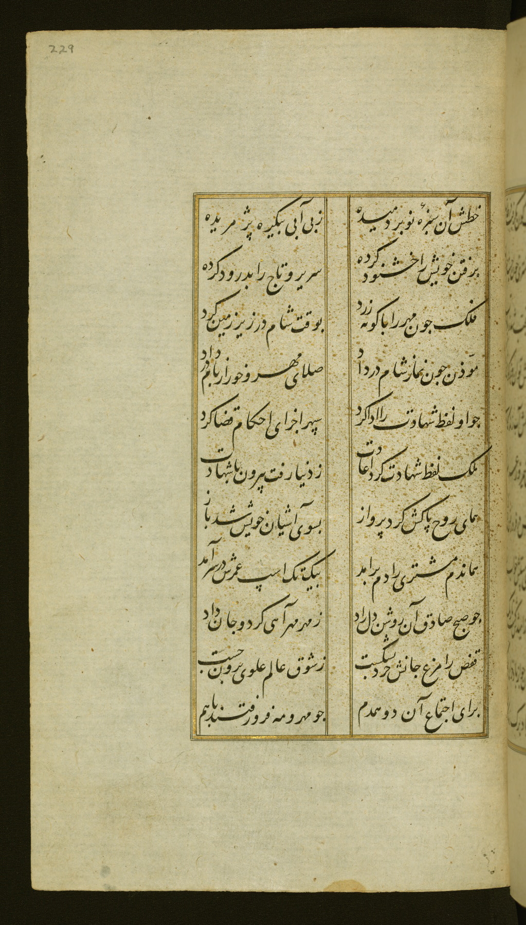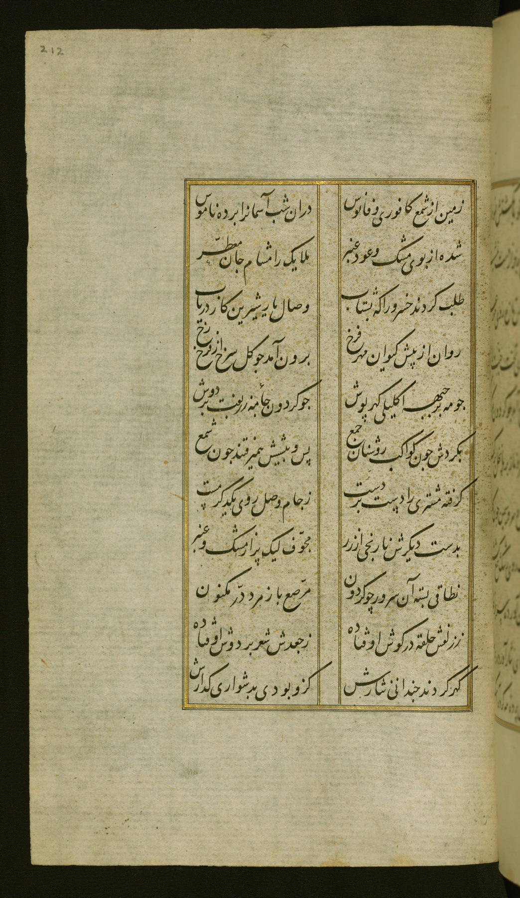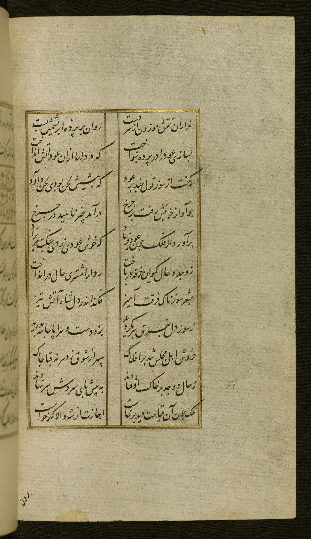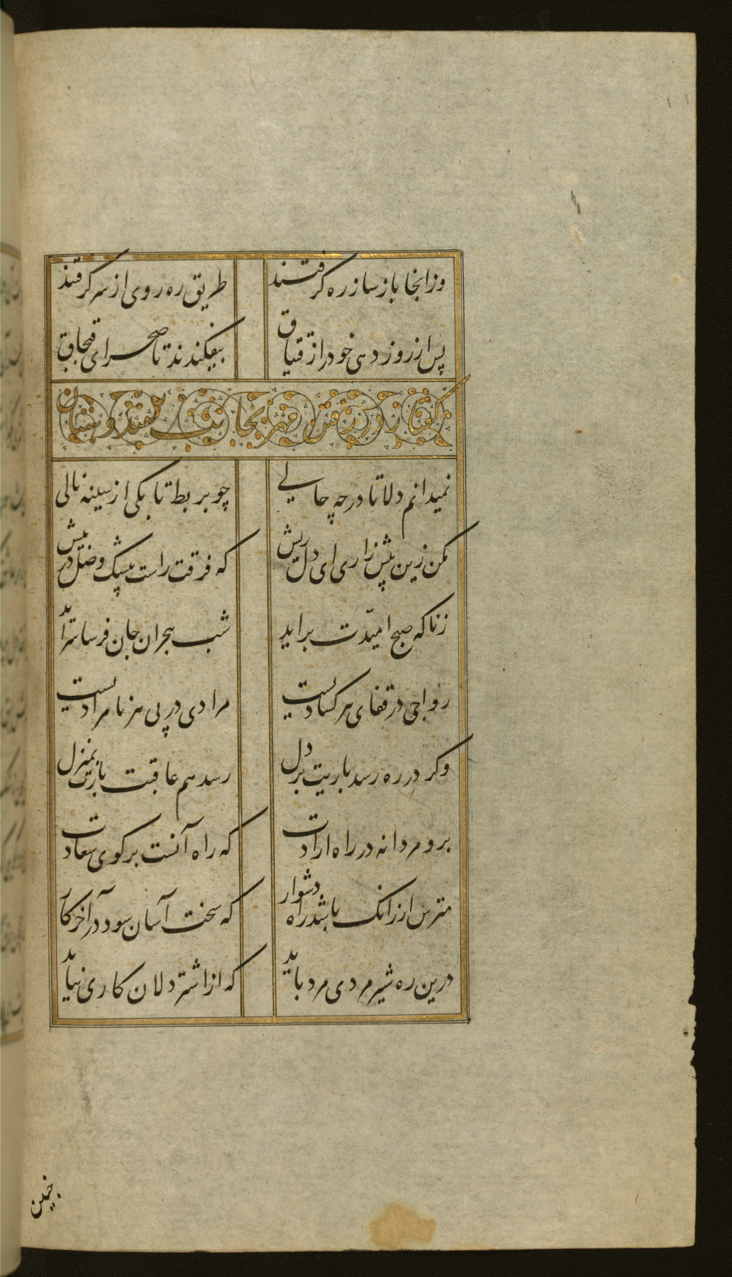 This manuscript is an illustrated copy of the well-known poem recounting the platonic love story between Mihr (the Sun), the son of Shāhpūr, and his vizier's son Mushtarī (Jupiter). The story of 90 chapters was composed by Muḥammad ibn Aḥmad ‘Aṣṣār Tabrīzī (d. 784 AH / 1382 CE). The present copy was written in nasta‘līq script by Murshid al-Kātib in 881 AH / 1476 CE. Considering the number of surviving manuscripts in which this calligrapher’s name is found, it seems he was particularly prolific. The present codex is illustrated with nine paintings. The gold-brushed leather binding with doublures of red leather decorated with filigree work is original to the manuscript.