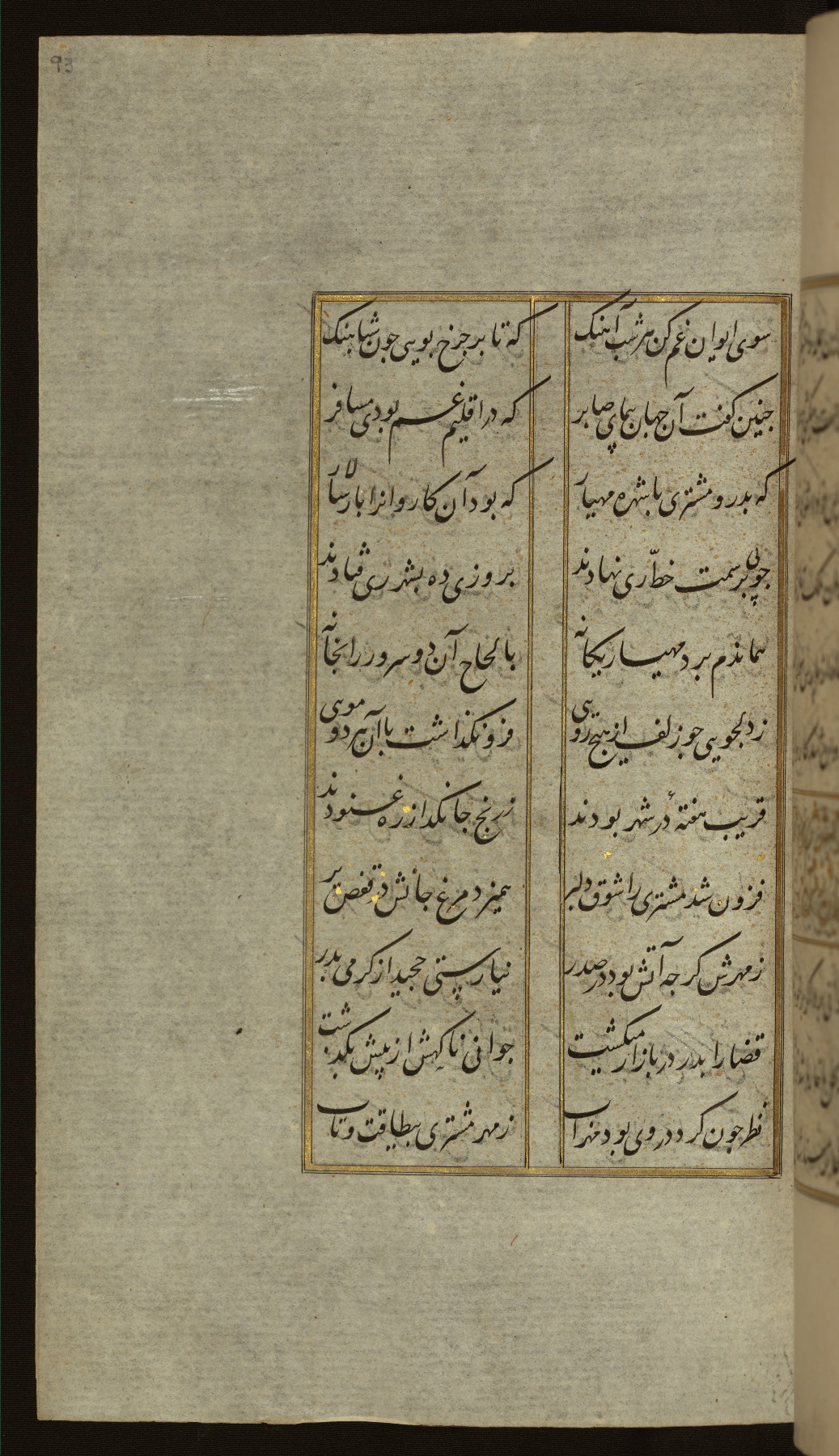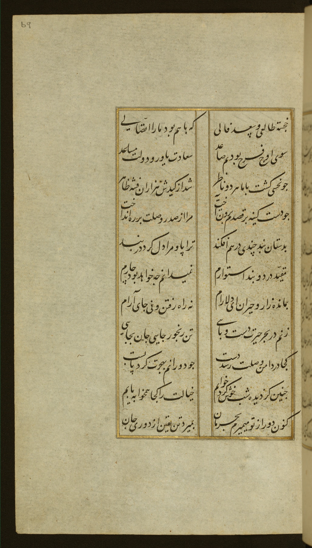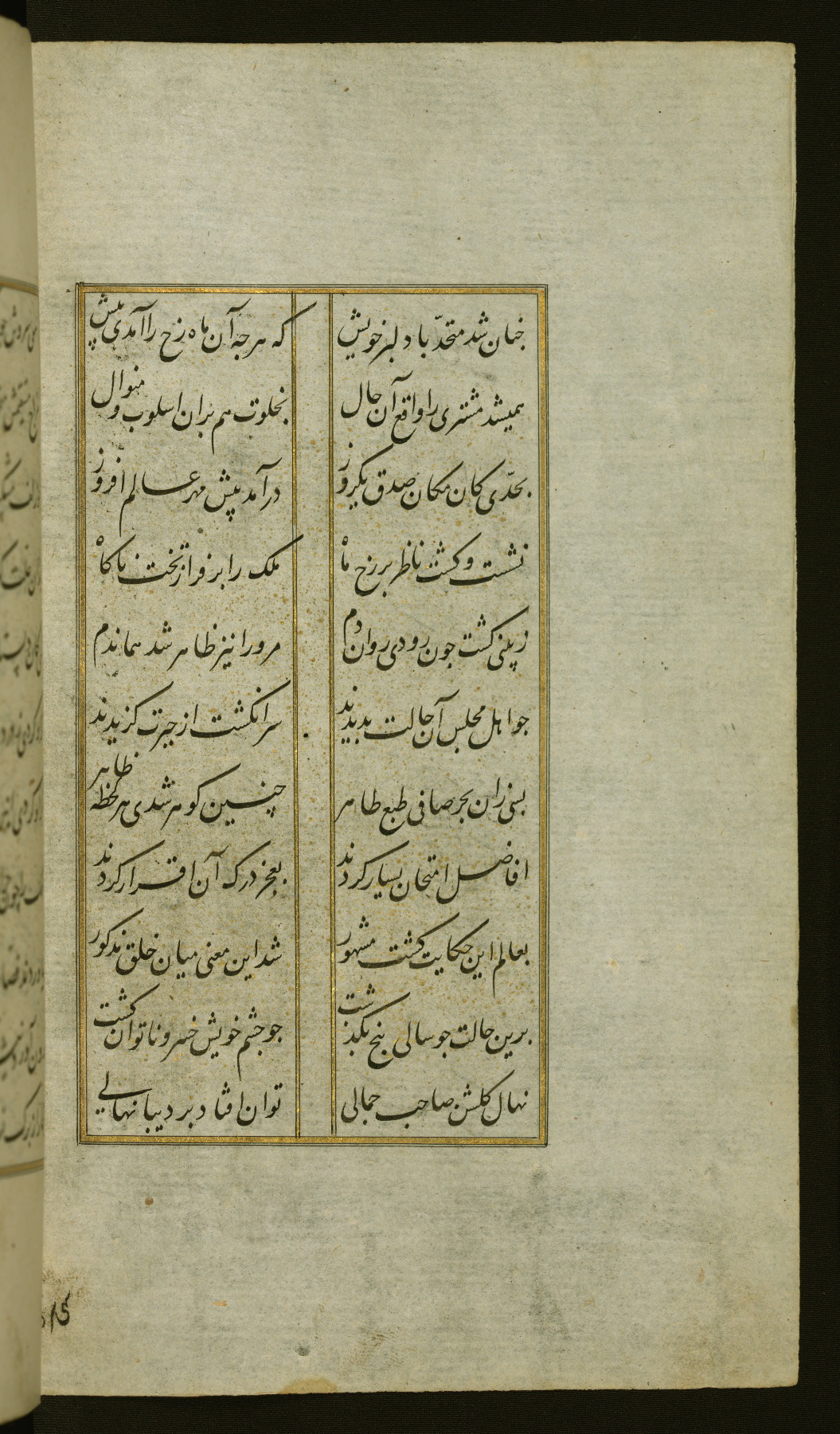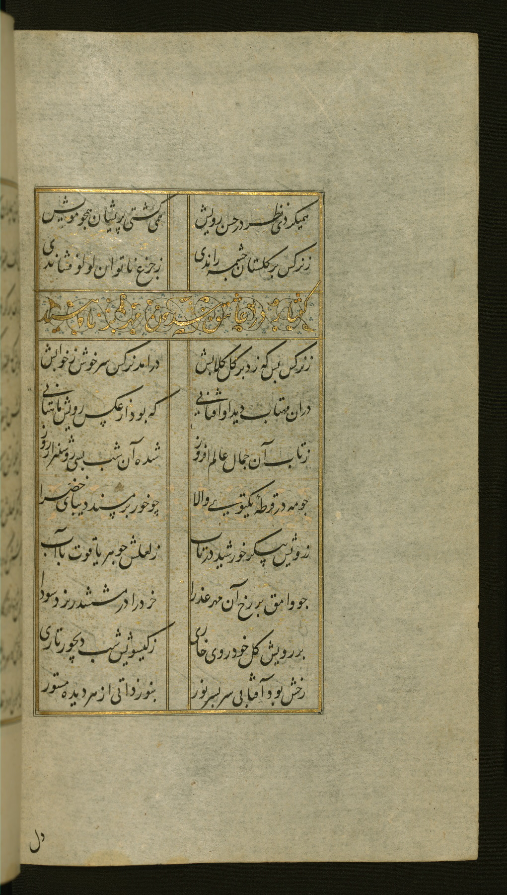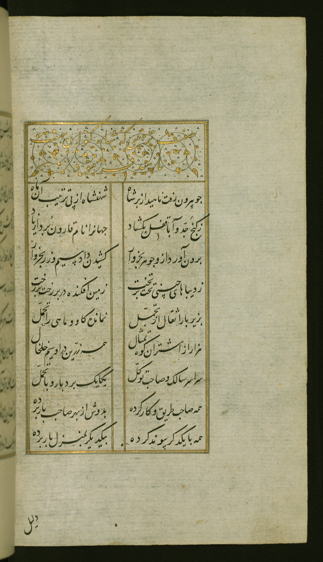 This manuscript is an illustrated copy of the well-known poem recounting the platonic love story between Mihr (the Sun), the son of Shāhpūr, and his vizier's son Mushtarī (Jupiter). The story of 90 chapters was composed by Muḥammad ibn Aḥmad ‘Aṣṣār Tabrīzī (d. 784 AH / 1382 CE). The present copy was written in nasta‘līq script by Murshid al-Kātib in 881 AH / 1476 CE. Considering the number of surviving manuscripts in which this calligrapher’s name is found, it seems he was particularly prolific. The present codex is illustrated with nine paintings. The gold-brushed leather binding with doublures of red leather decorated with filigree work is original to the manuscript.