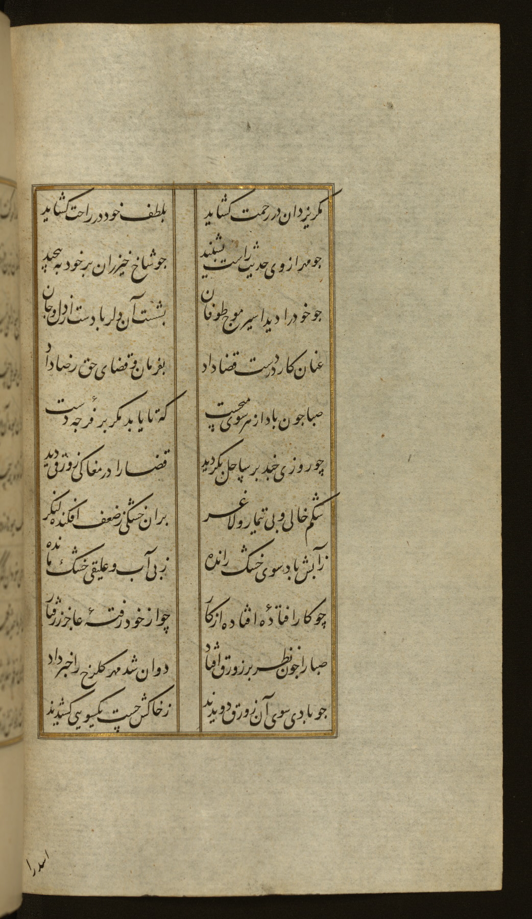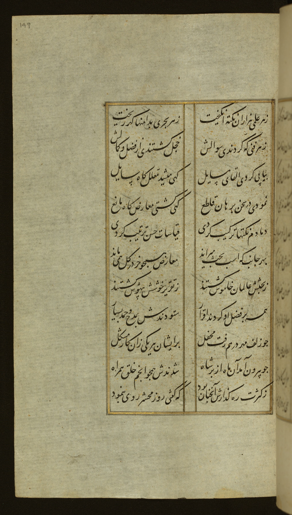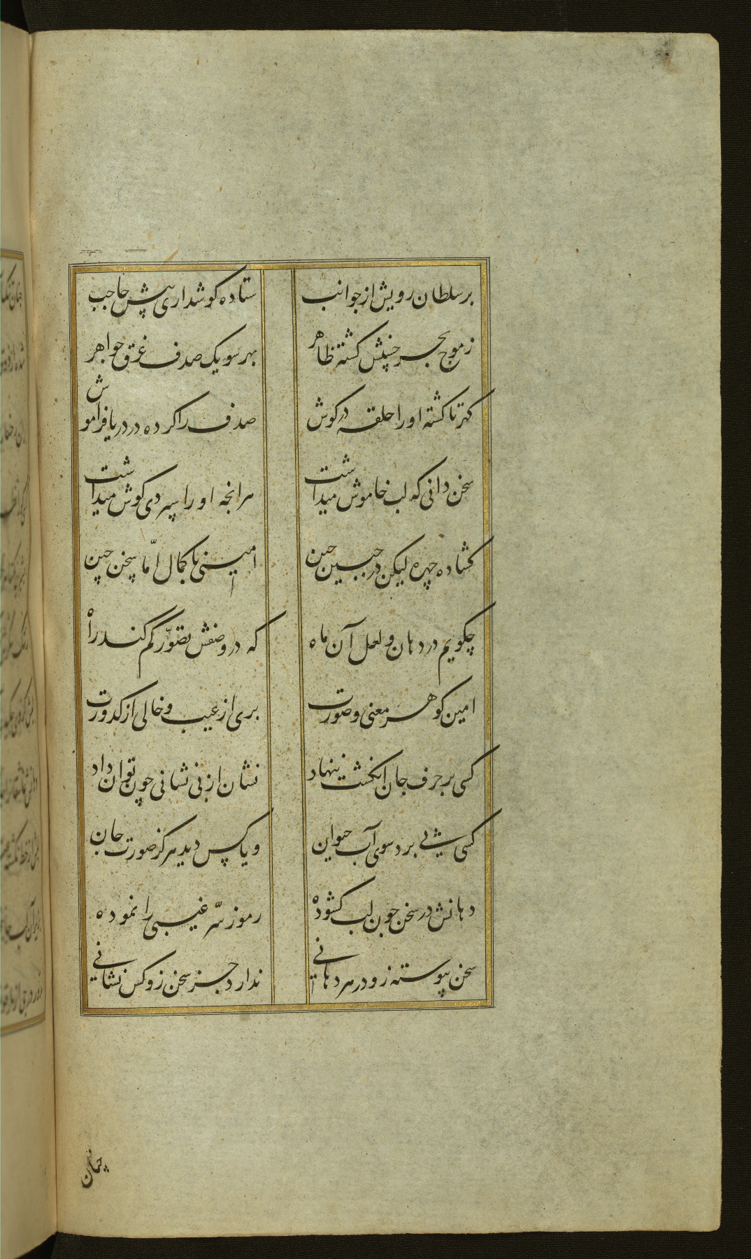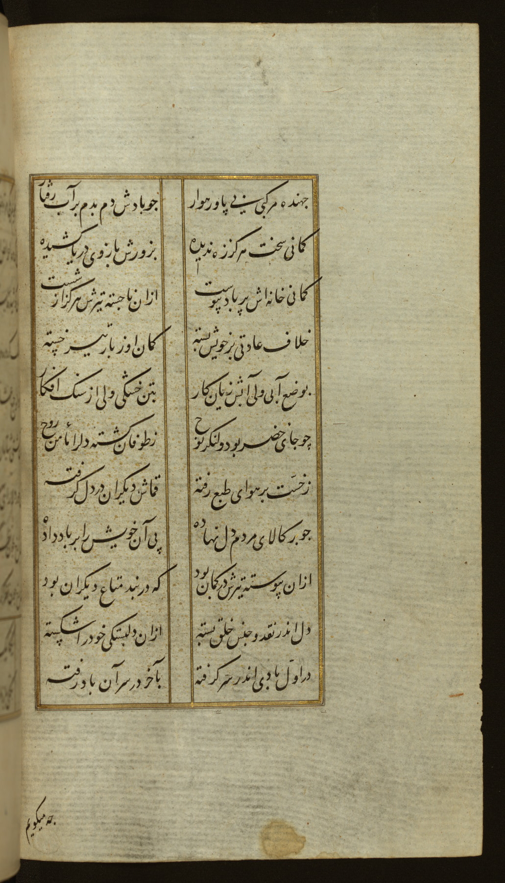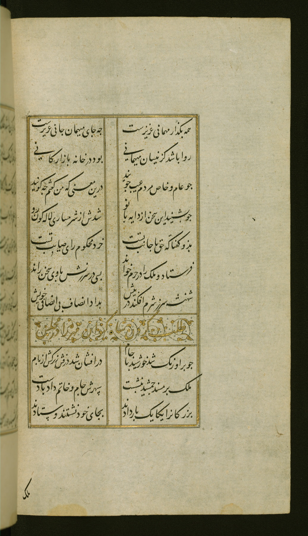 This manuscript is an illustrated copy of the well-known poem recounting the platonic love story between Mihr (the Sun), the son of Shāhpūr, and his vizier's son Mushtarī (Jupiter). The story of 90 chapters was composed by Muḥammad ibn Aḥmad ‘Aṣṣār Tabrīzī (d. 784 AH / 1382 CE). The present copy was written in nasta‘līq script by Murshid al-Kātib in 881 AH / 1476 CE. Considering the number of surviving manuscripts in which this calligrapher’s name is found, it seems he was particularly prolific. The present codex is illustrated with nine paintings. The gold-brushed leather binding with doublures of red leather decorated with filigree work is original to the manuscript.