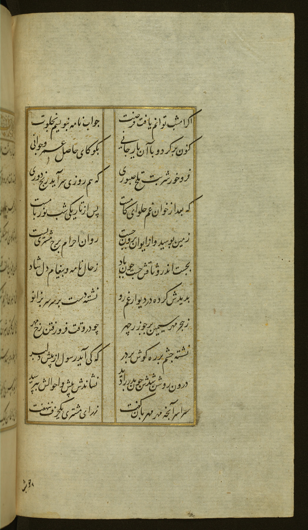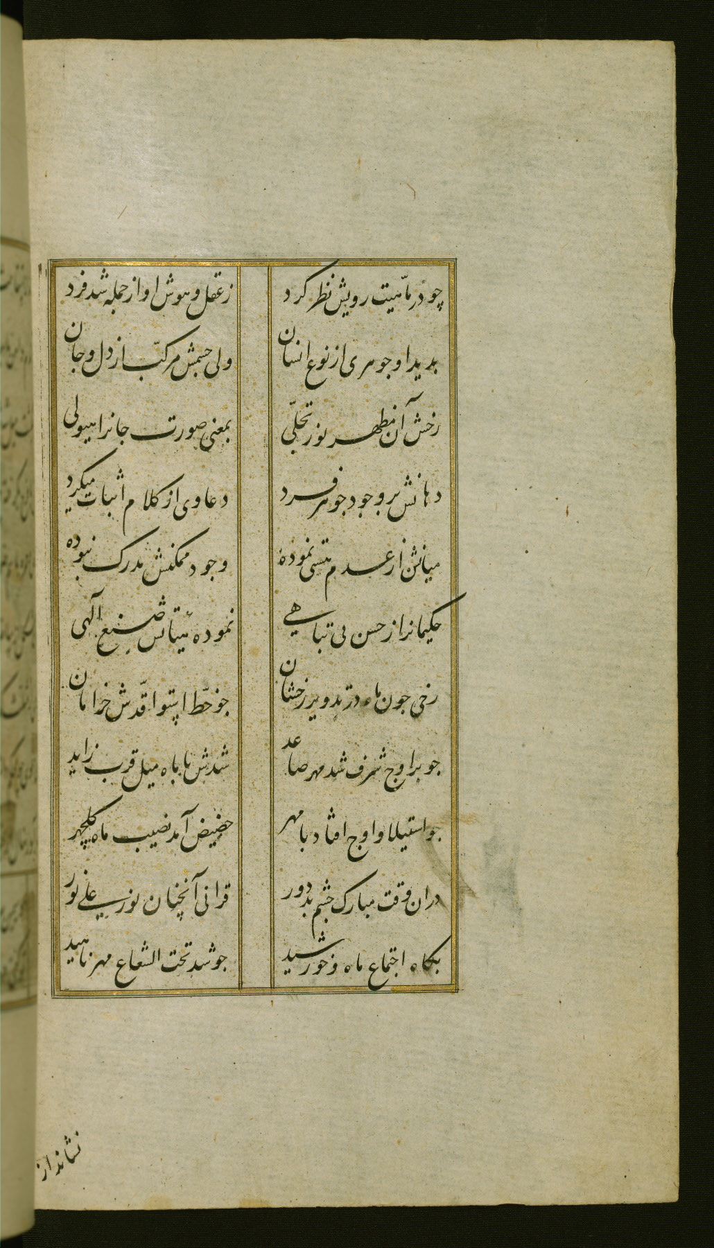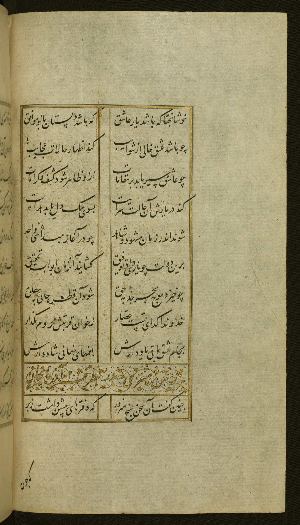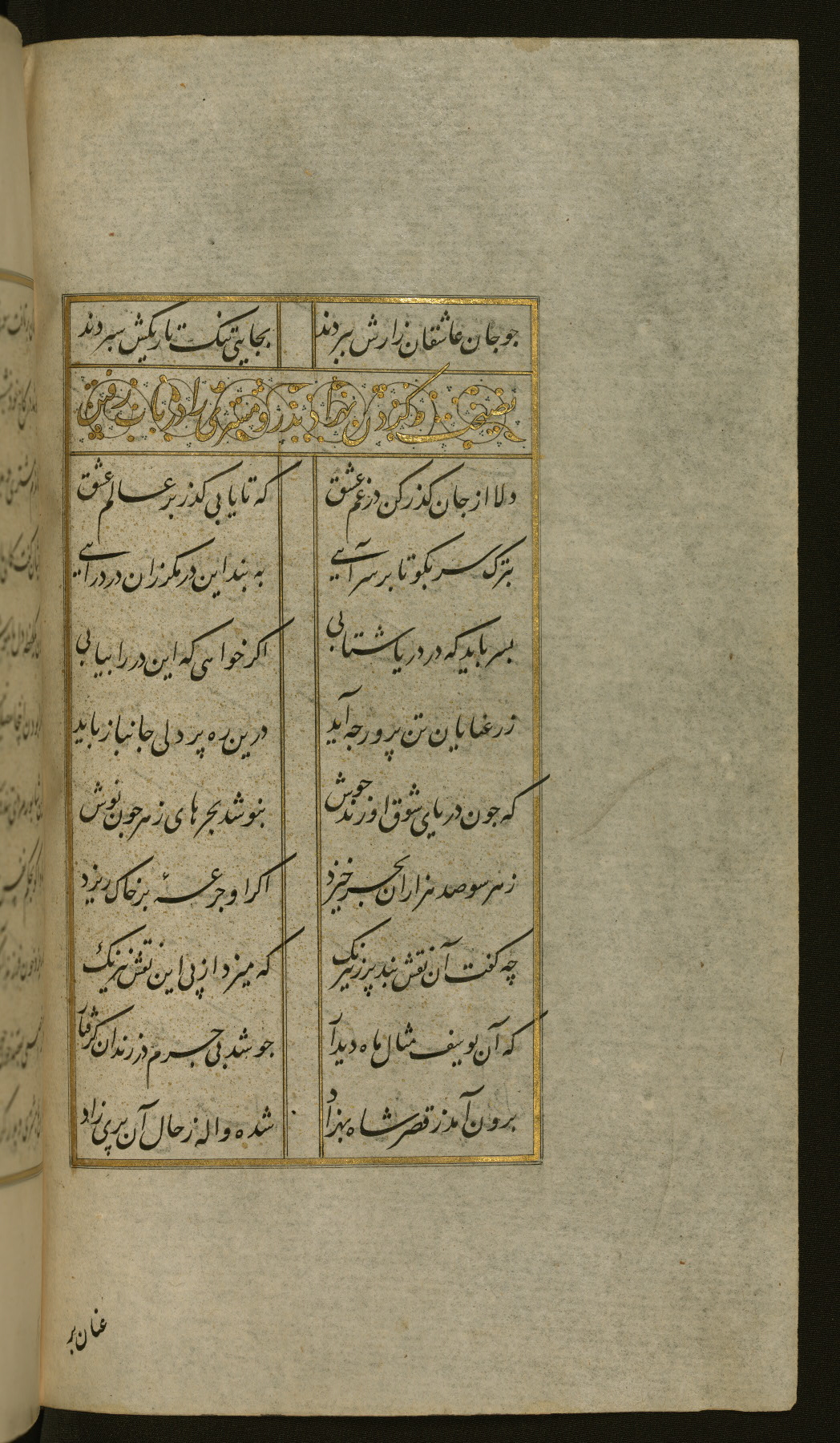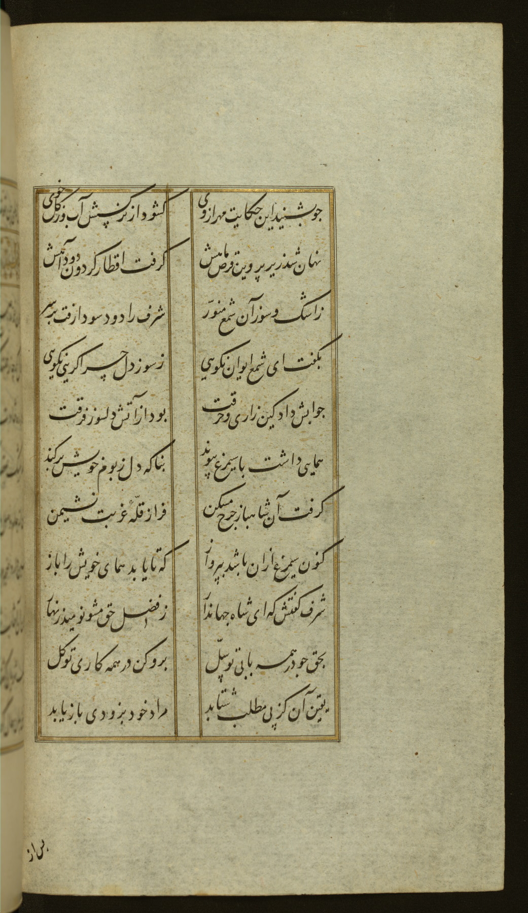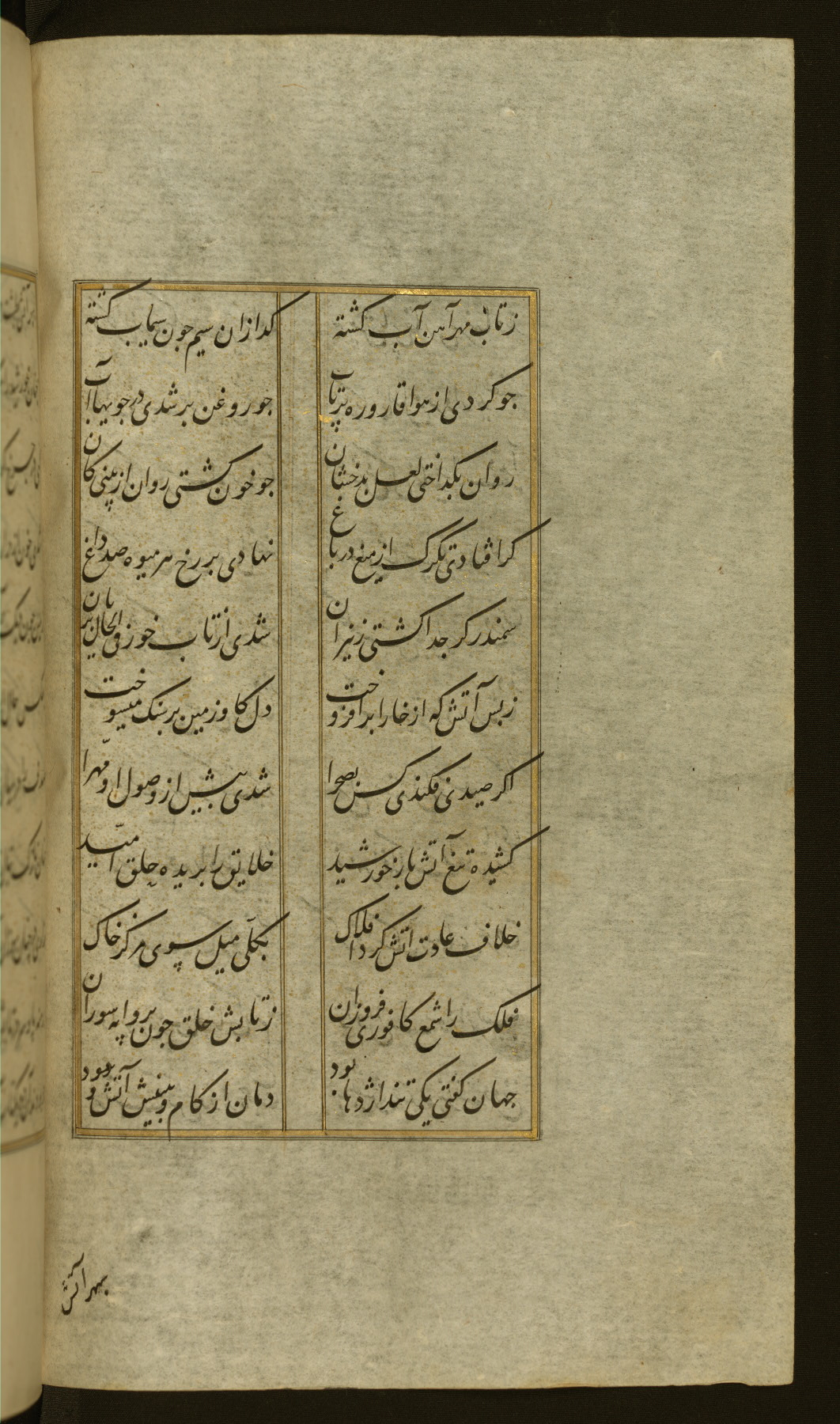 This manuscript is an illustrated copy of the well-known poem recounting the platonic love story between Mihr (the Sun), the son of Shāhpūr, and his vizier's son Mushtarī (Jupiter). The story of 90 chapters was composed by Muḥammad ibn Aḥmad ‘Aṣṣār Tabrīzī (d. 784 AH / 1382 CE). The present copy was written in nasta‘līq script by Murshid al-Kātib in 881 AH / 1476 CE. Considering the number of surviving manuscripts in which this calligrapher’s name is found, it seems he was particularly prolific. The present codex is illustrated with nine paintings. The gold-brushed leather binding with doublures of red leather decorated with filigree work is original to the manuscript.
