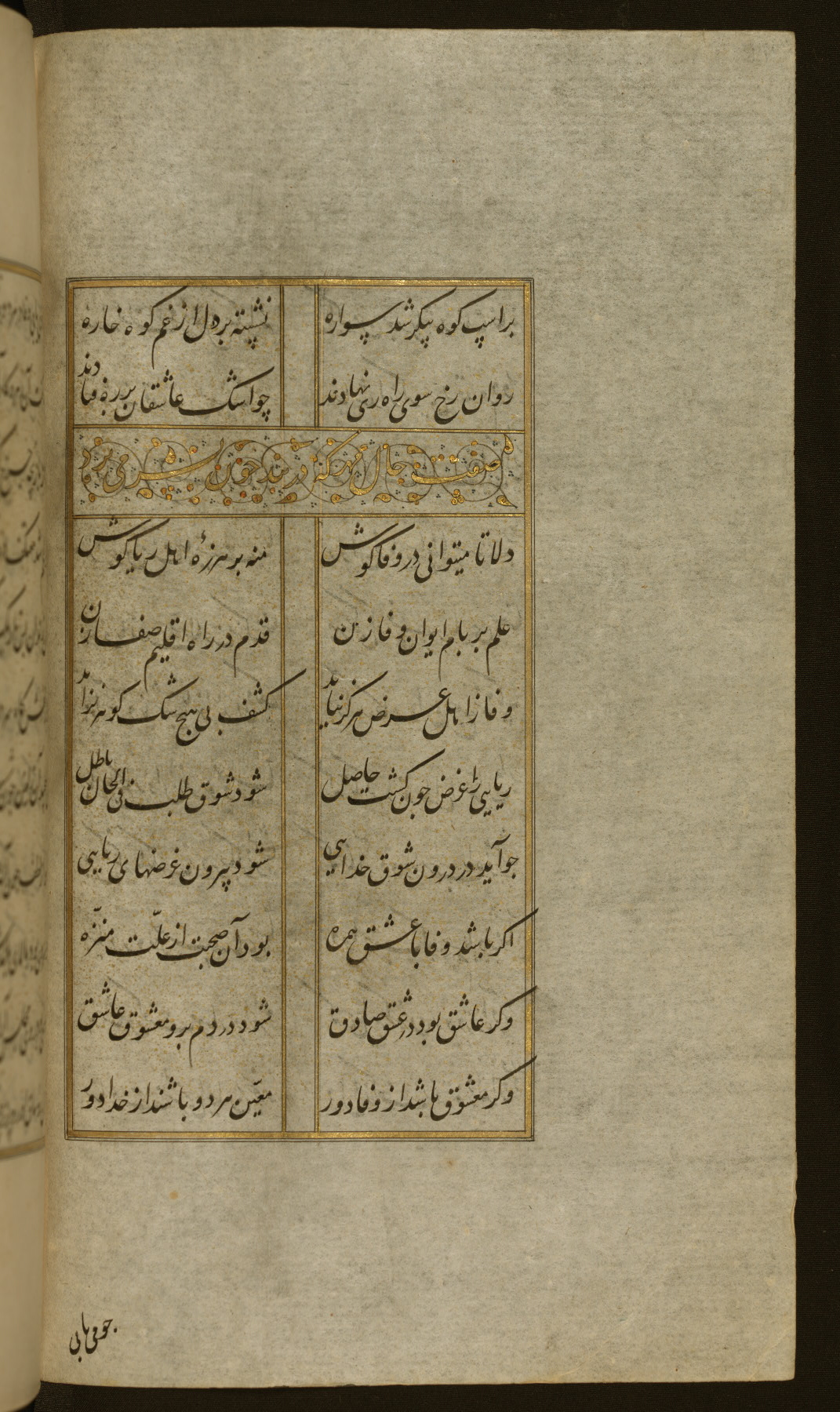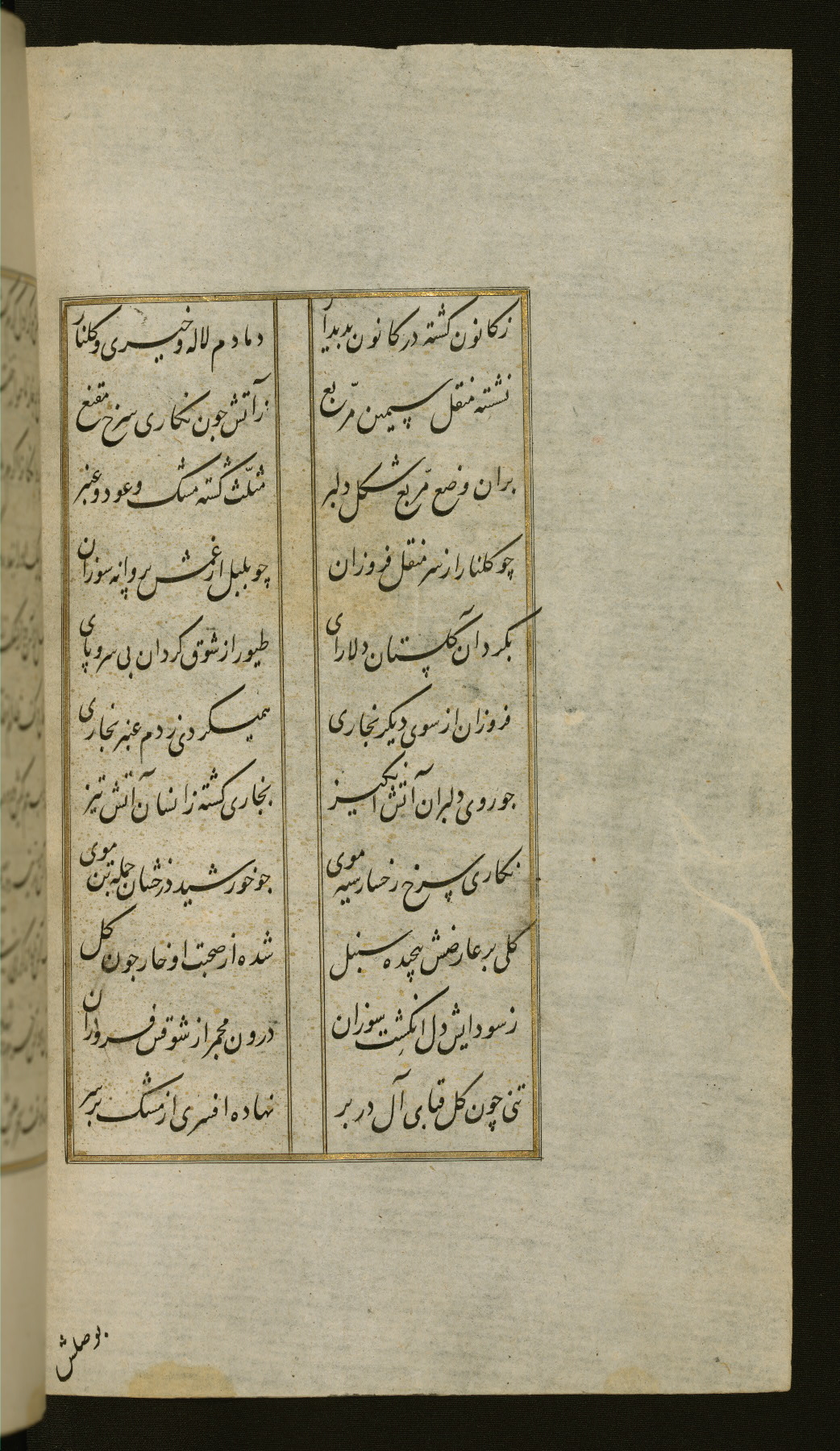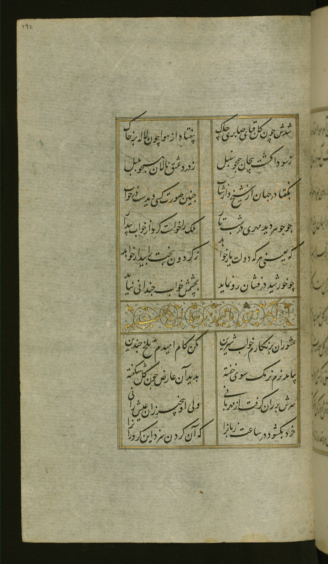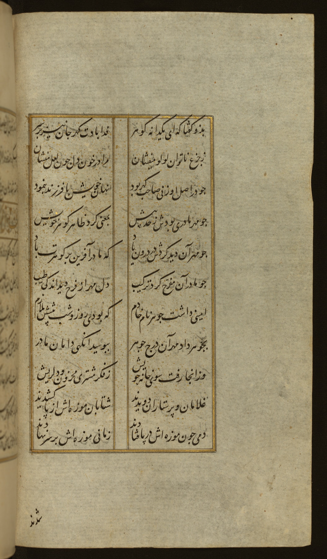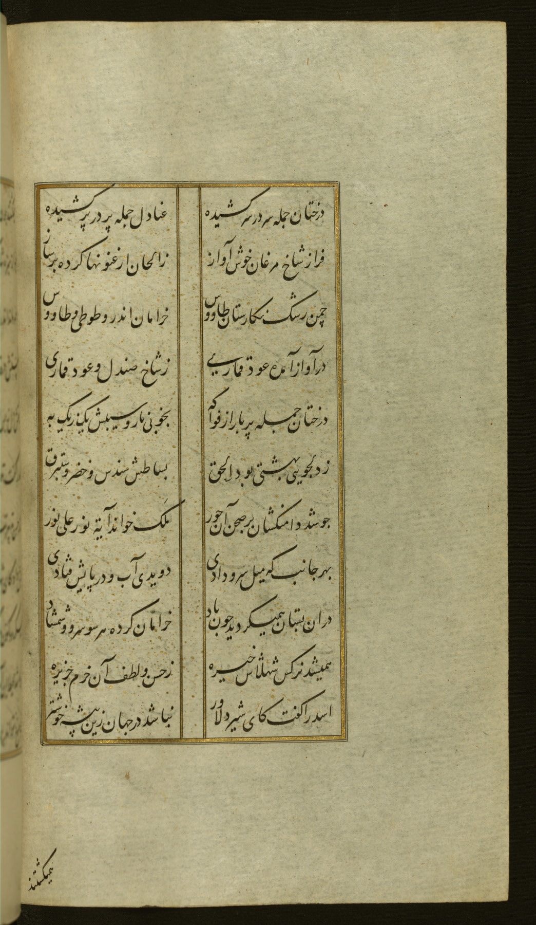 This manuscript is an illustrated copy of the well-known poem recounting the platonic love story between Mihr (the Sun), the son of Shāhpūr, and his vizier's son Mushtarī (Jupiter). The story of 90 chapters was composed by Muḥammad ibn Aḥmad ‘Aṣṣār Tabrīzī (d. 784 AH / 1382 CE). The present copy was written in nasta‘līq script by Murshid al-Kātib in 881 AH / 1476 CE. Considering the number of surviving manuscripts in which this calligrapher’s name is found, it seems he was particularly prolific. The present codex is illustrated with nine paintings. The gold-brushed leather binding with doublures of red leather decorated with filigree work is original to the manuscript.