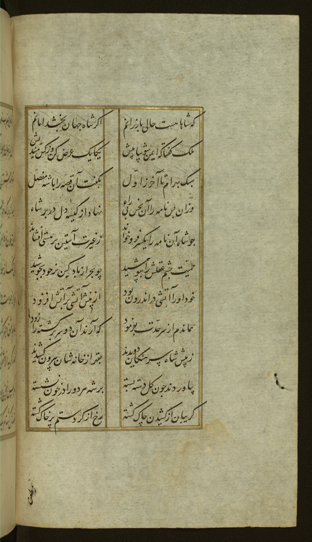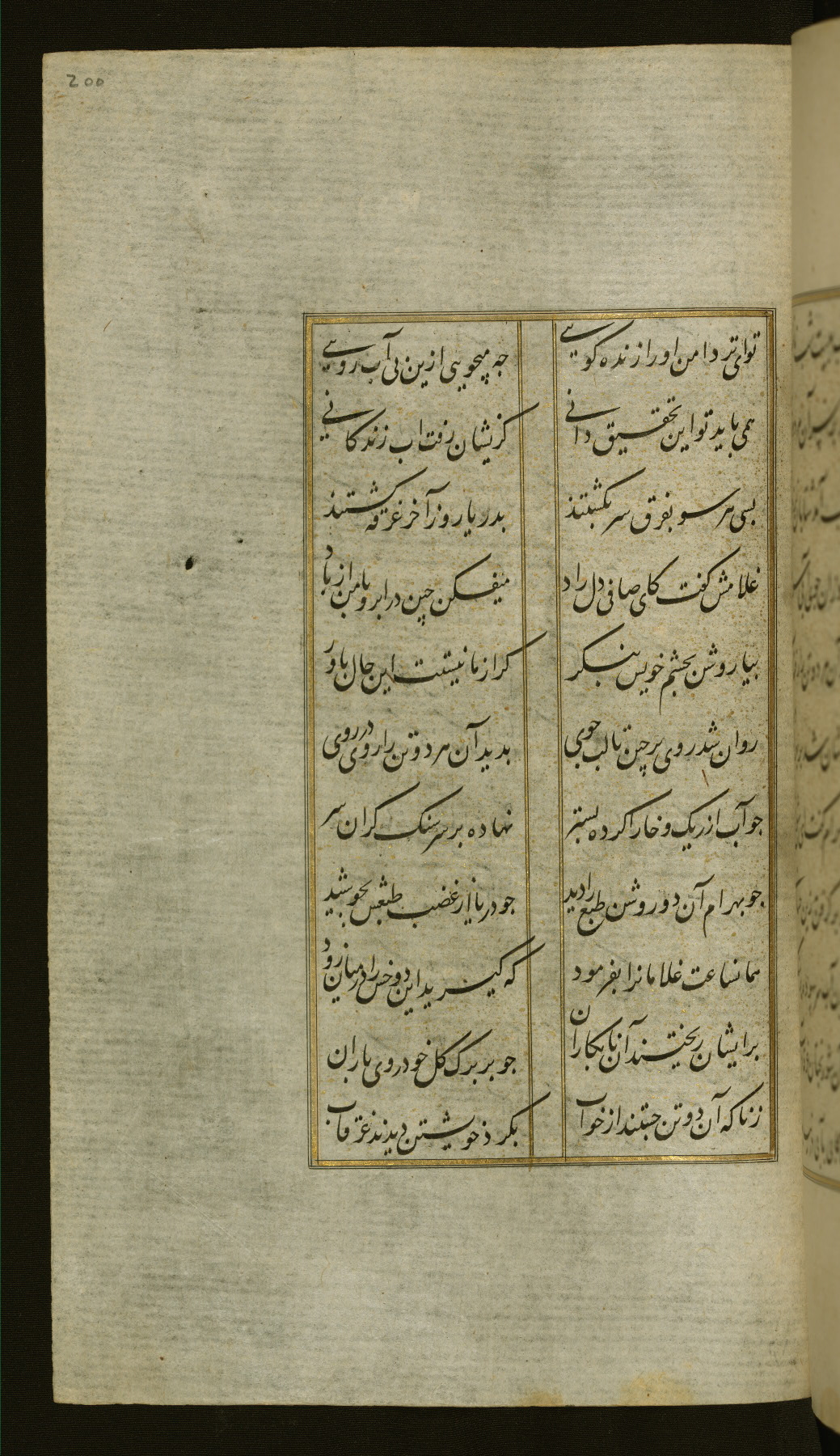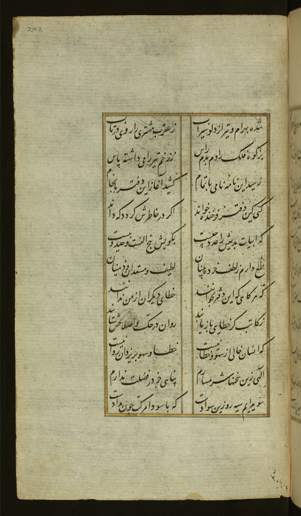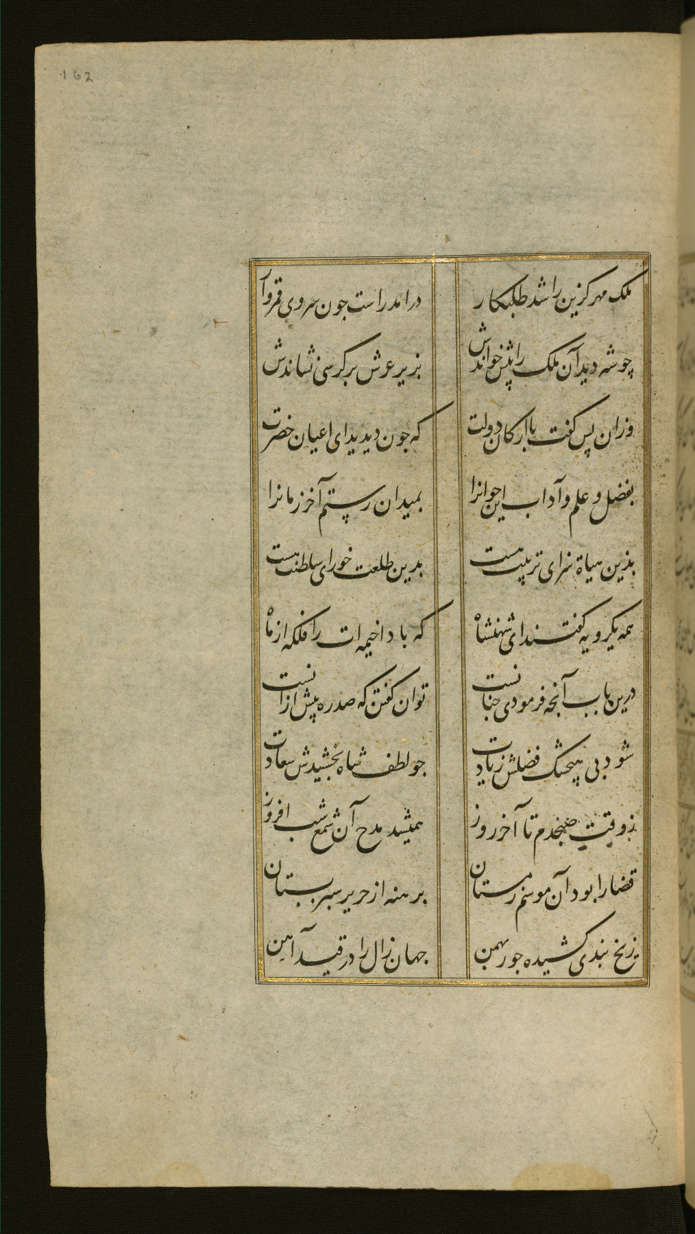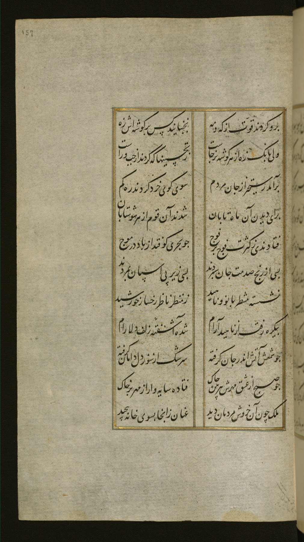 This manuscript is an illustrated copy of the well-known poem recounting the platonic love story between Mihr (the Sun), the son of Shāhpūr, and his vizier's son Mushtarī (Jupiter). The story of 90 chapters was composed by Muḥammad ibn Aḥmad ‘Aṣṣār Tabrīzī (d. 784 AH / 1382 CE). The present copy was written in nasta‘līq script by Murshid al-Kātib in 881 AH / 1476 CE. Considering the number of surviving manuscripts in which this calligrapher’s name is found, it seems he was particularly prolific. The present codex is illustrated with nine paintings. The gold-brushed leather binding with doublures of red leather decorated with filigree work is original to the manuscript.