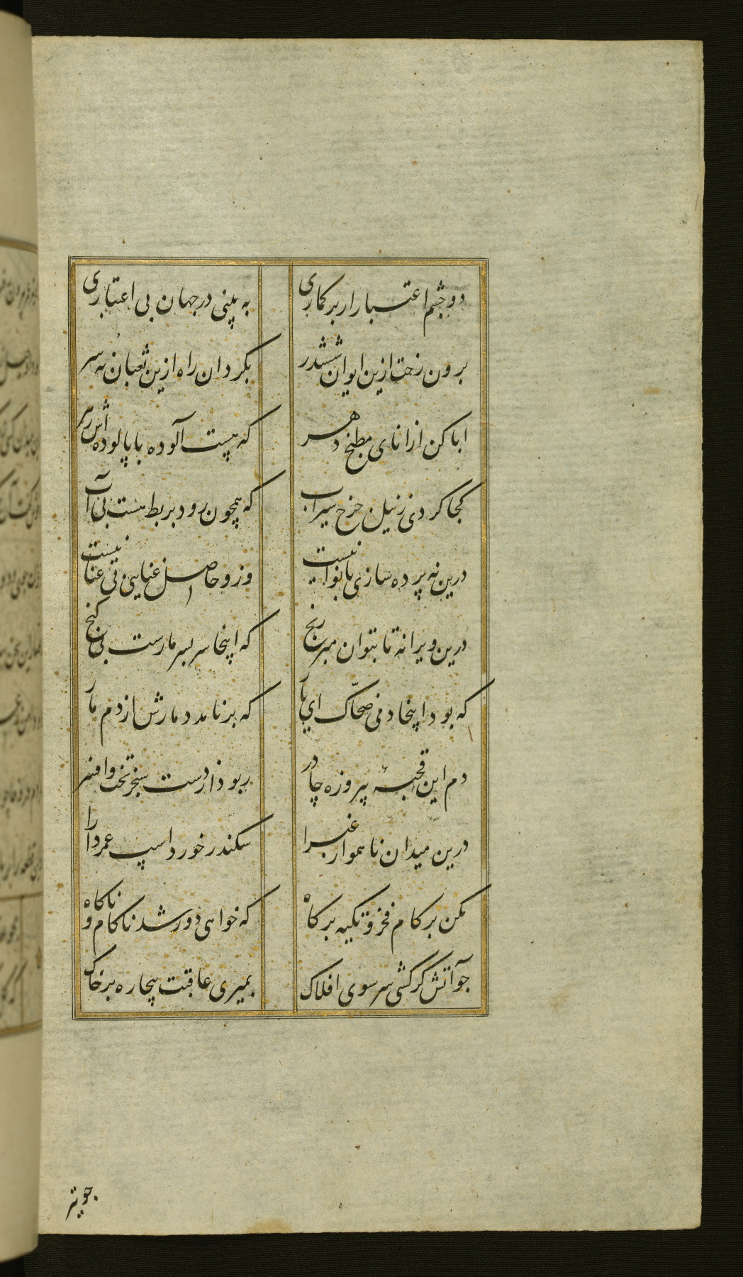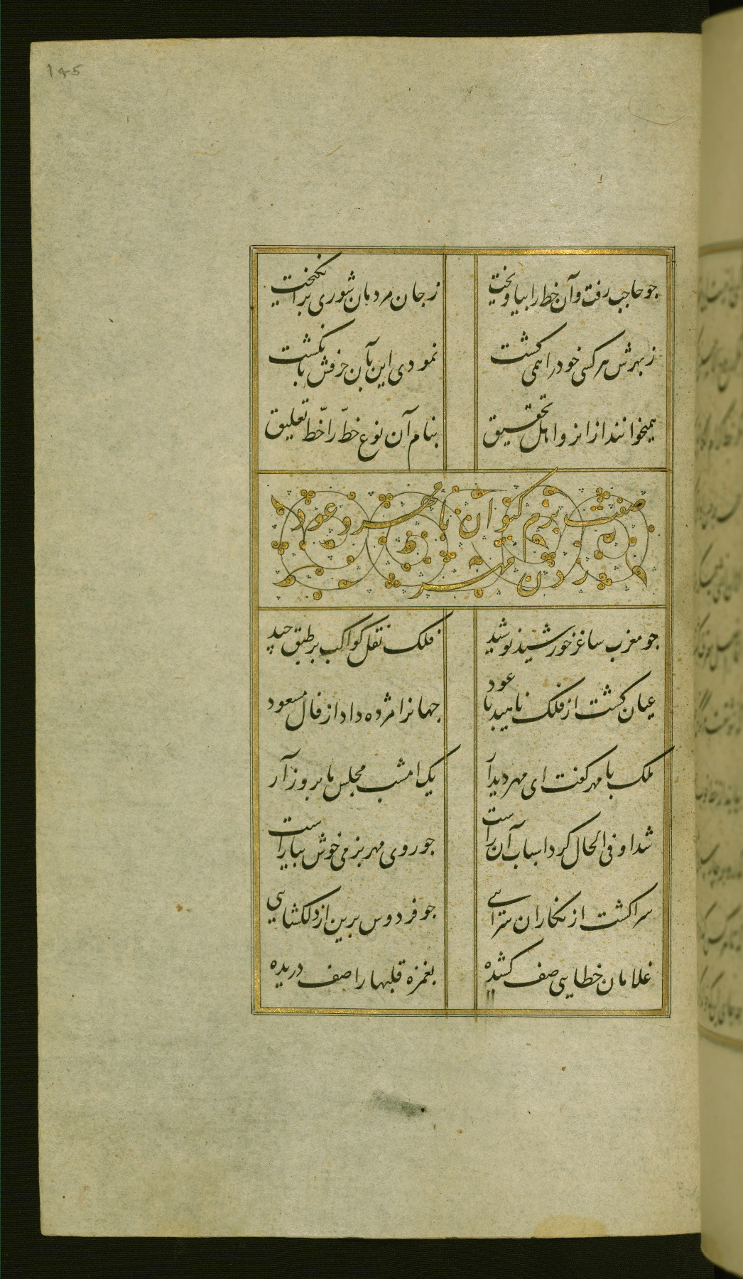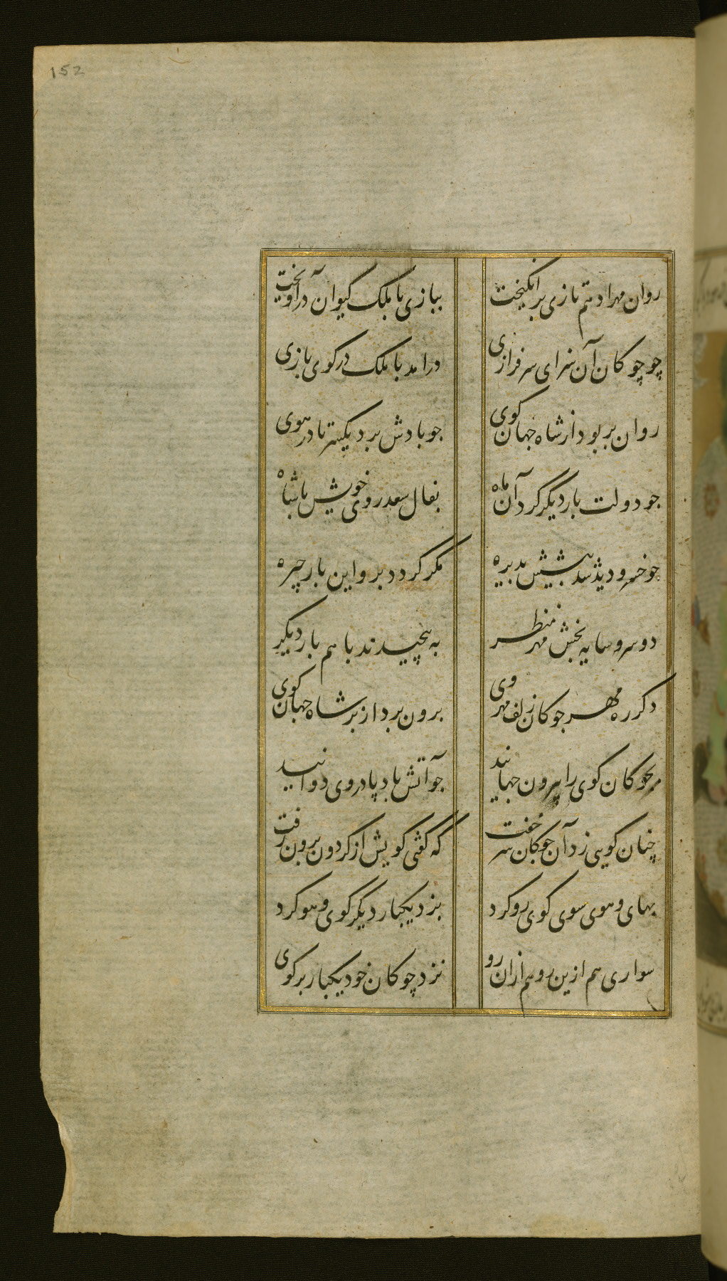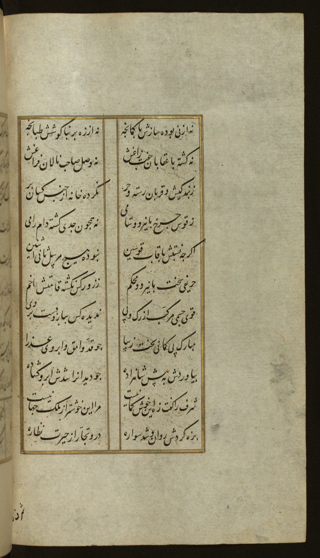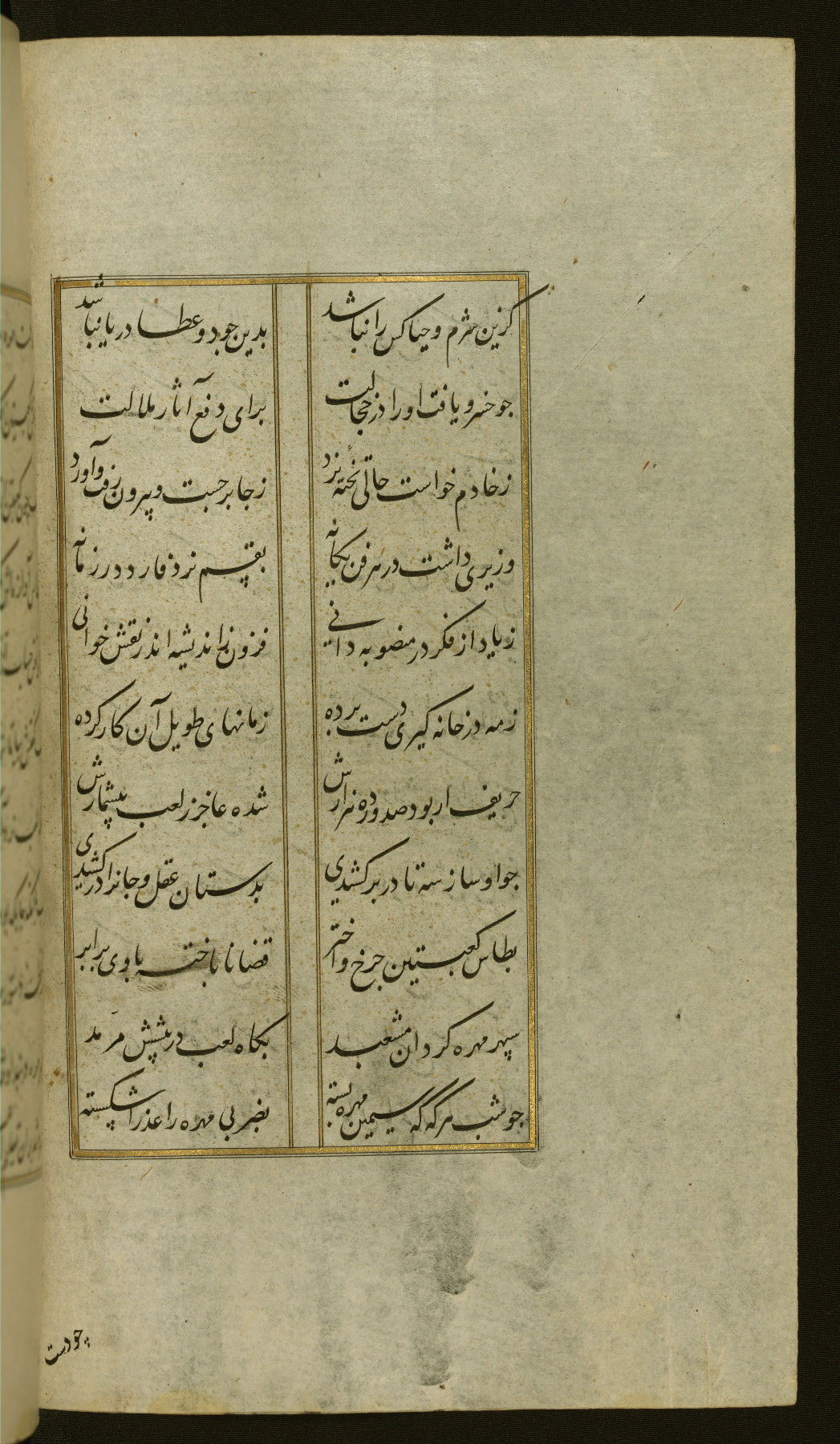 This manuscript is an illustrated copy of the well-known poem recounting the platonic love story between Mihr (the Sun), the son of Shāhpūr, and his vizier's son Mushtarī (Jupiter). The story of 90 chapters was composed by Muḥammad ibn Aḥmad ‘Aṣṣār Tabrīzī (d. 784 AH / 1382 CE). The present copy was written in nasta‘līq script by Murshid al-Kātib in 881 AH / 1476 CE. Considering the number of surviving manuscripts in which this calligrapher’s name is found, it seems he was particularly prolific. The present codex is illustrated with nine paintings. The gold-brushed leather binding with doublures of red leather decorated with filigree work is original to the manuscript.