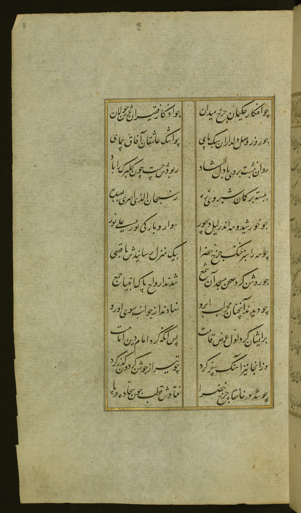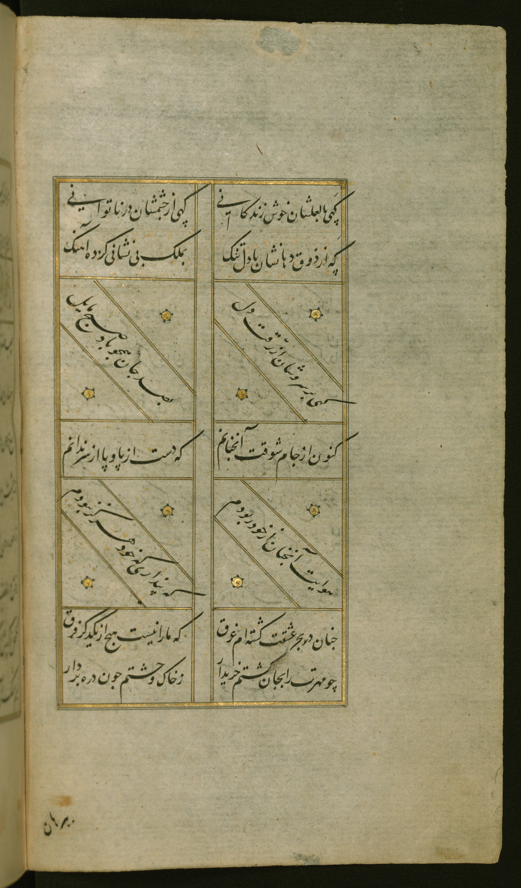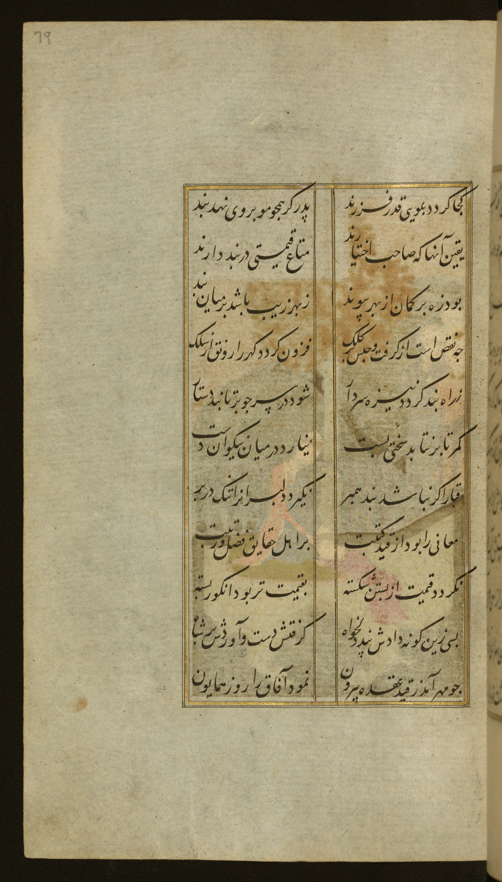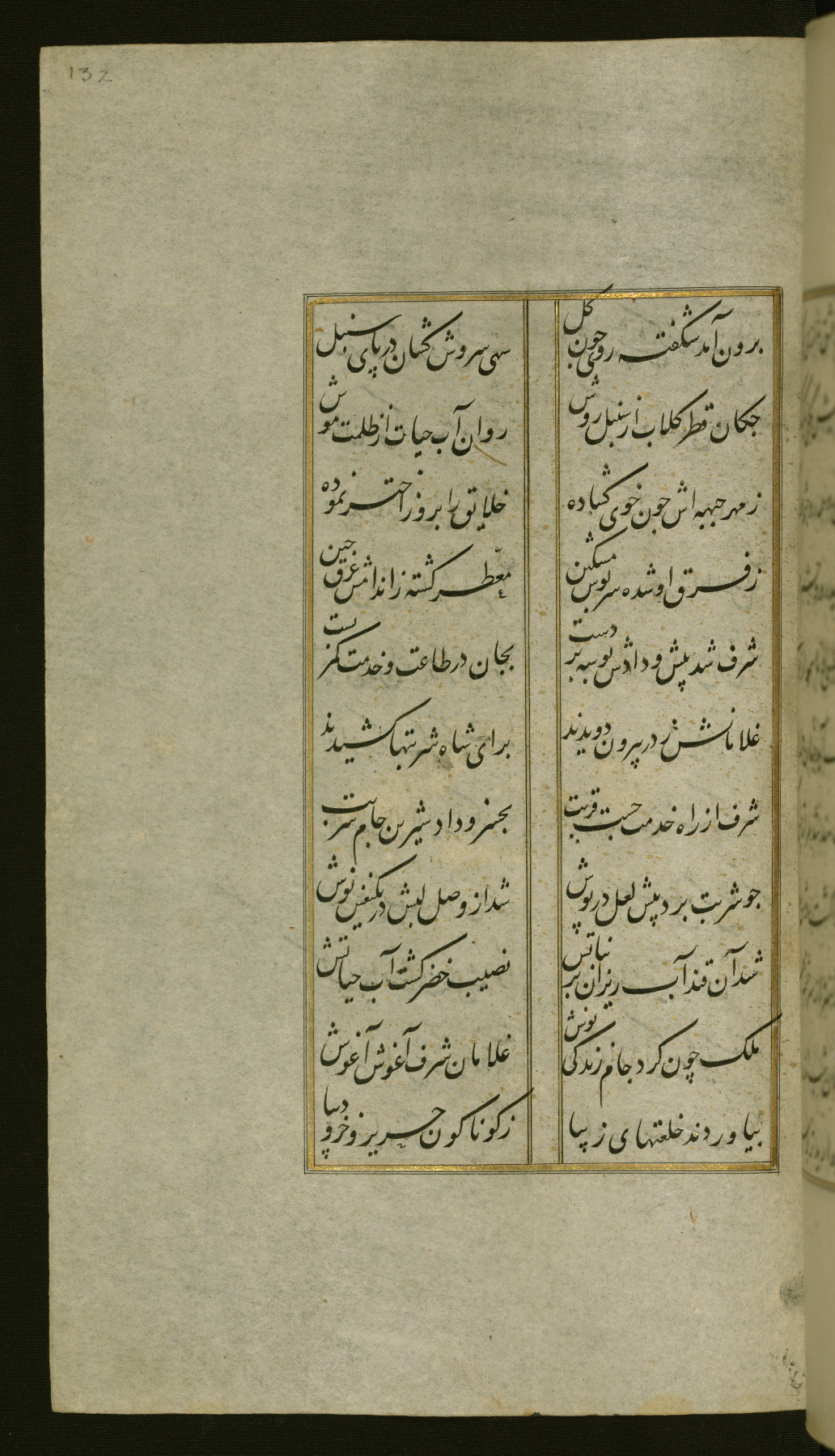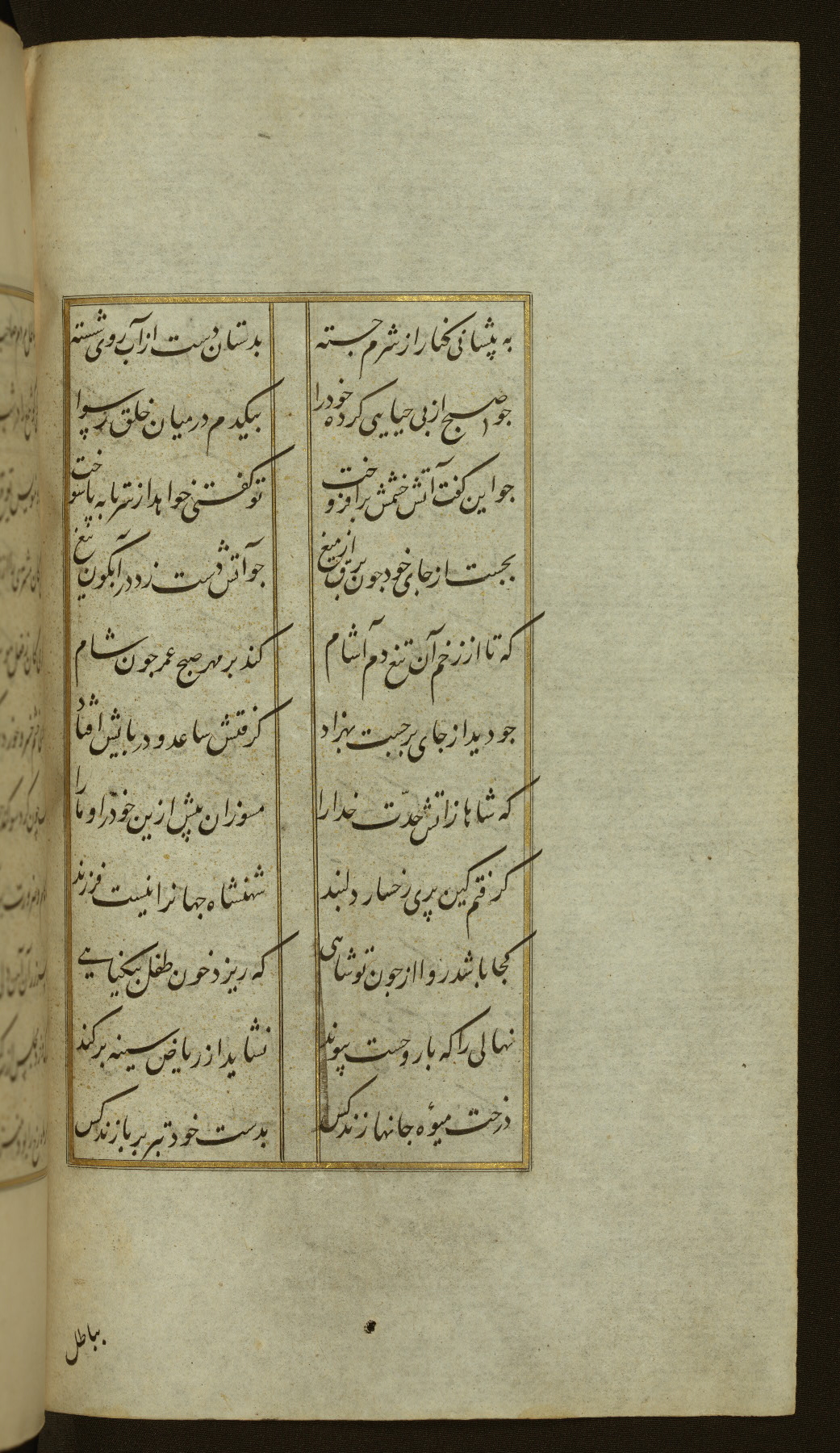 This manuscript is an illustrated copy of the well-known poem recounting the platonic love story between Mihr (the Sun), the son of Shāhpūr, and his vizier's son Mushtarī (Jupiter). The story of 90 chapters was composed by Muḥammad ibn Aḥmad ‘Aṣṣār Tabrīzī (d. 784 AH / 1382 CE). The present copy was written in nasta‘līq script by Murshid al-Kātib in 881 AH / 1476 CE. Considering the number of surviving manuscripts in which this calligrapher’s name is found, it seems he was particularly prolific. The present codex is illustrated with nine paintings. The gold-brushed leather binding with doublures of red leather decorated with filigree work is original to the manuscript.