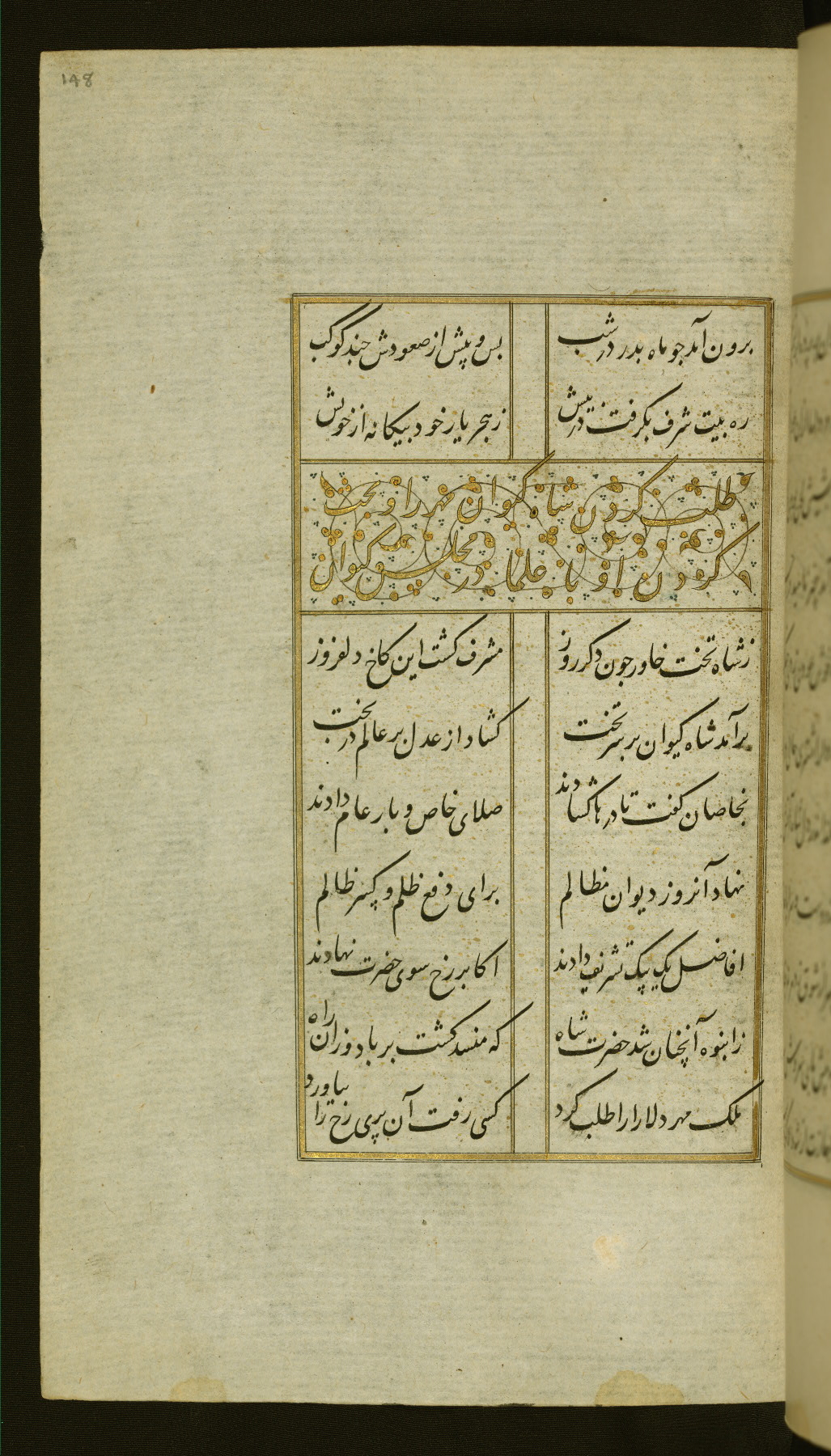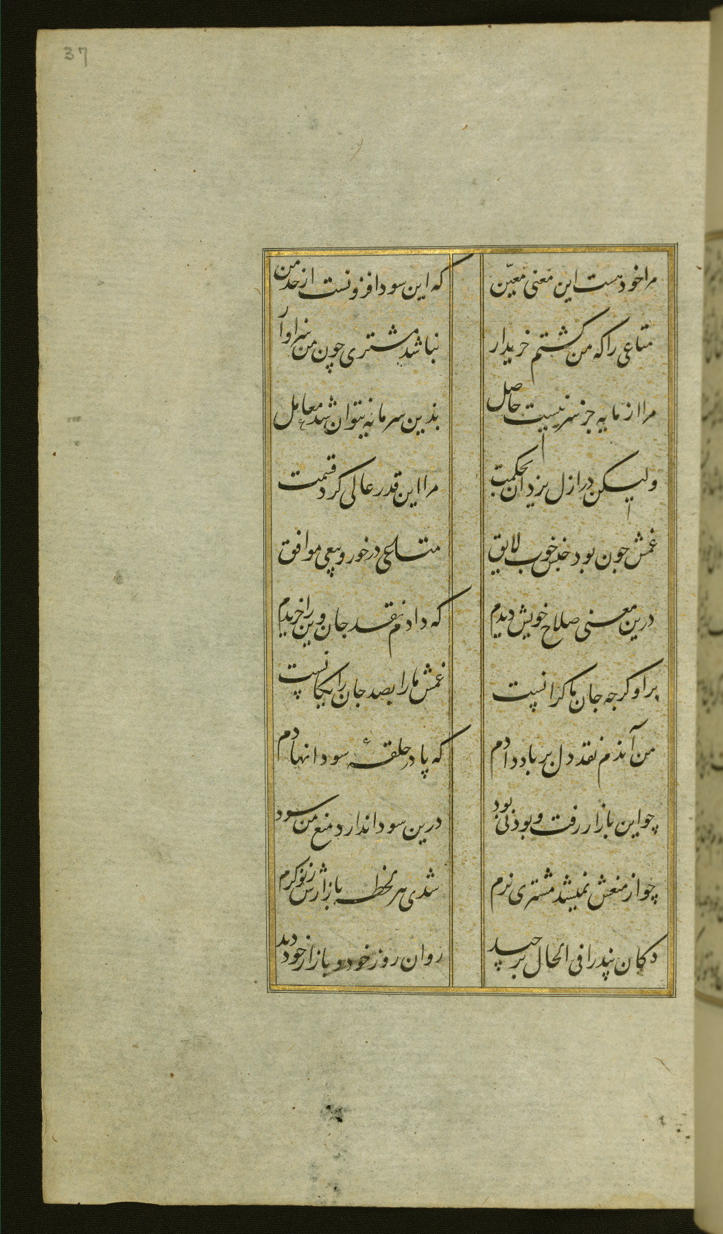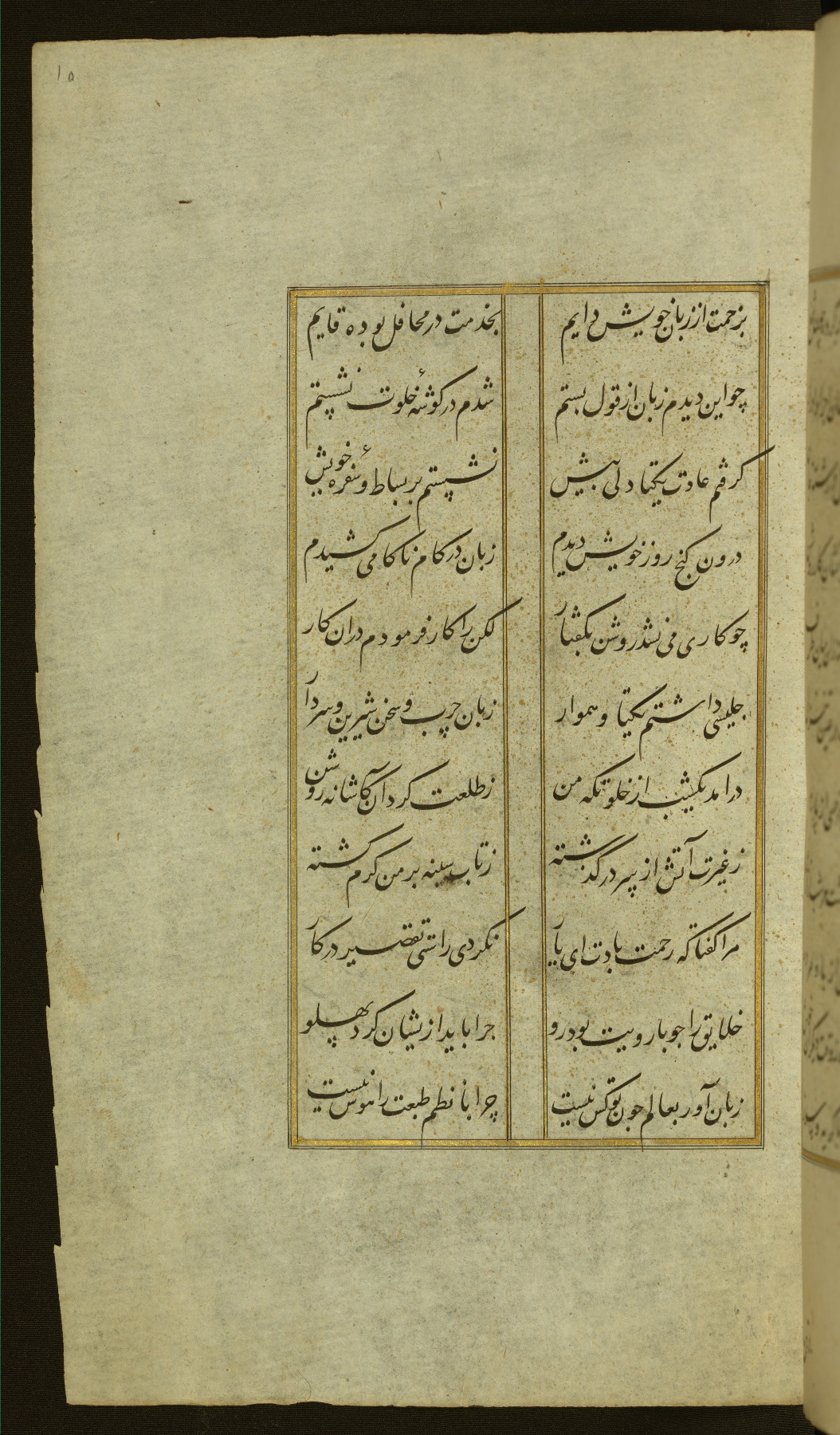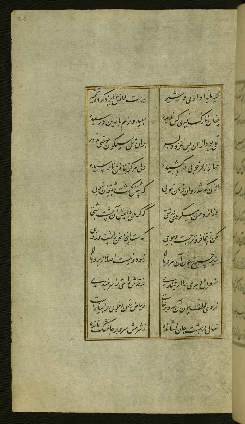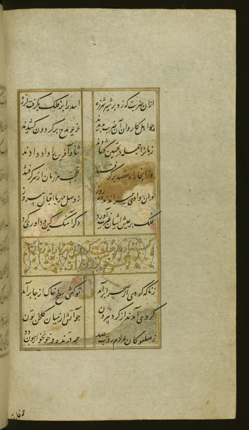 This manuscript is an illustrated copy of the well-known poem recounting the platonic love story between Mihr (the Sun), the son of Shāhpūr, and his vizier's son Mushtarī (Jupiter). The story of 90 chapters was composed by Muḥammad ibn Aḥmad ‘Aṣṣār Tabrīzī (d. 784 AH / 1382 CE). The present copy was written in nasta‘līq script by Murshid al-Kātib in 881 AH / 1476 CE. Considering the number of surviving manuscripts in which this calligrapher’s name is found, it seems he was particularly prolific. The present codex is illustrated with nine paintings. The gold-brushed leather binding with doublures of red leather decorated with filigree work is original to the manuscript.