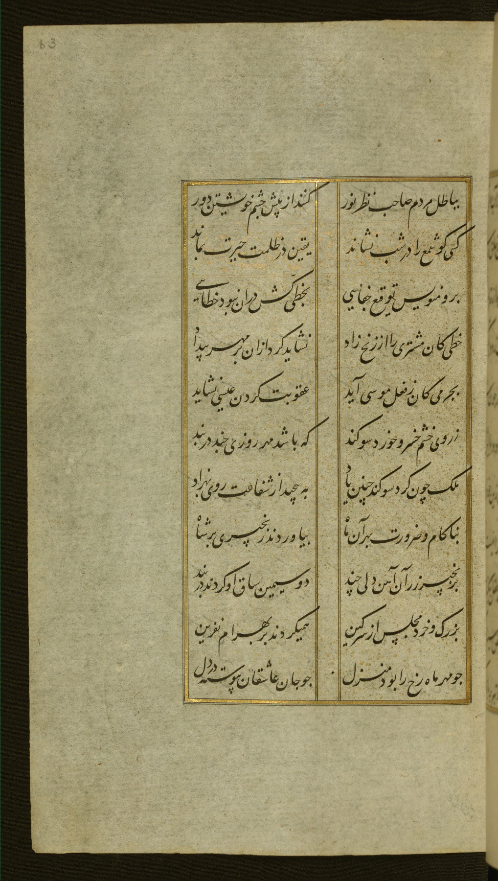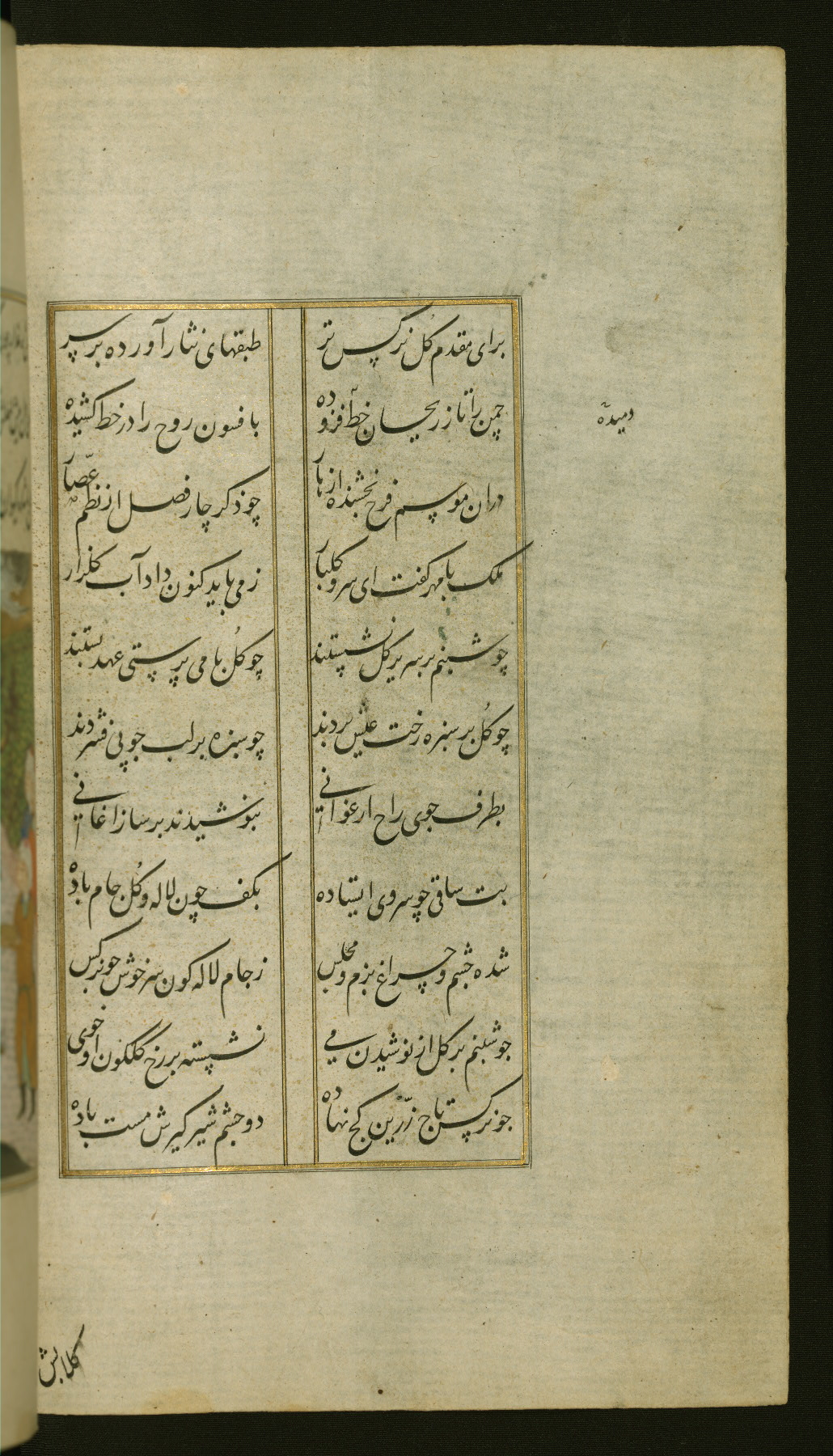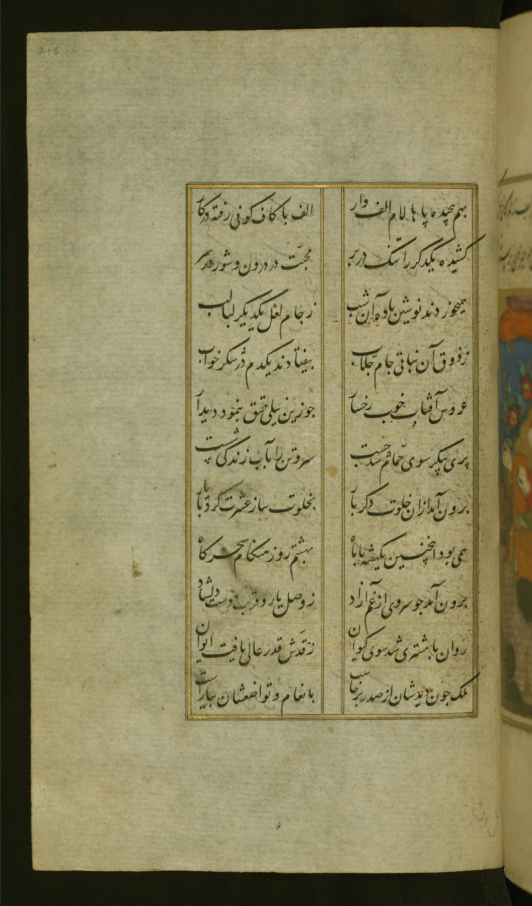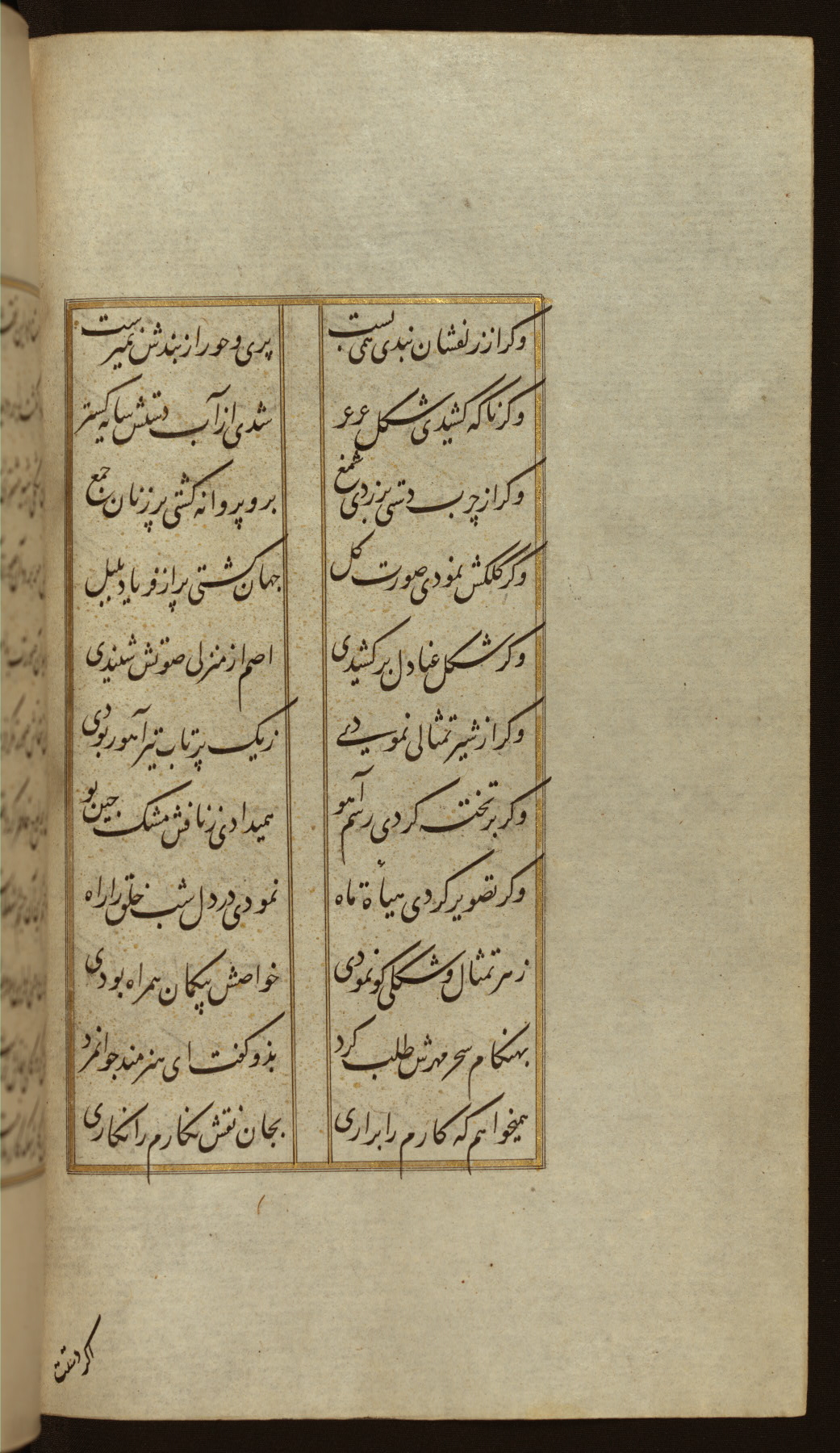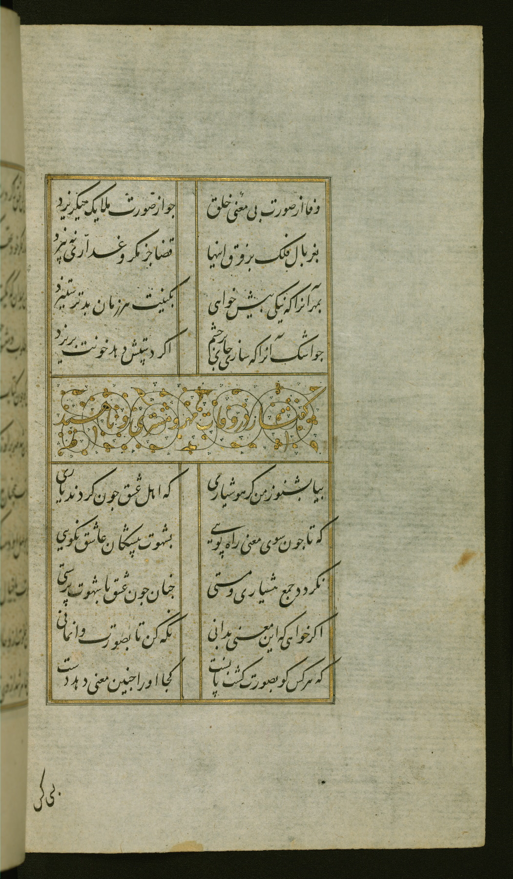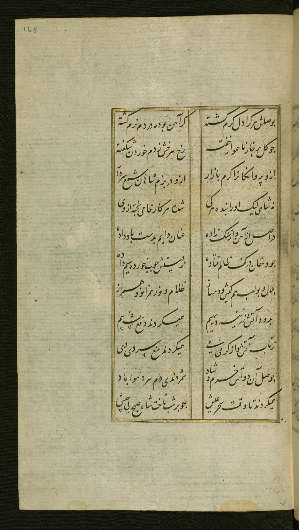 This manuscript is an illustrated copy of the well-known poem recounting the platonic love story between Mihr (the Sun), the son of Shāhpūr, and his vizier's son Mushtarī (Jupiter). The story of 90 chapters was composed by Muḥammad ibn Aḥmad ‘Aṣṣār Tabrīzī (d. 784 AH / 1382 CE). The present copy was written in nasta‘līq script by Murshid al-Kātib in 881 AH / 1476 CE. Considering the number of surviving manuscripts in which this calligrapher’s name is found, it seems he was particularly prolific. The present codex is illustrated with nine paintings. The gold-brushed leather binding with doublures of red leather decorated with filigree work is original to the manuscript.
